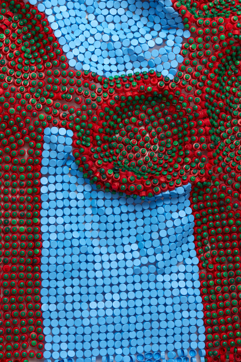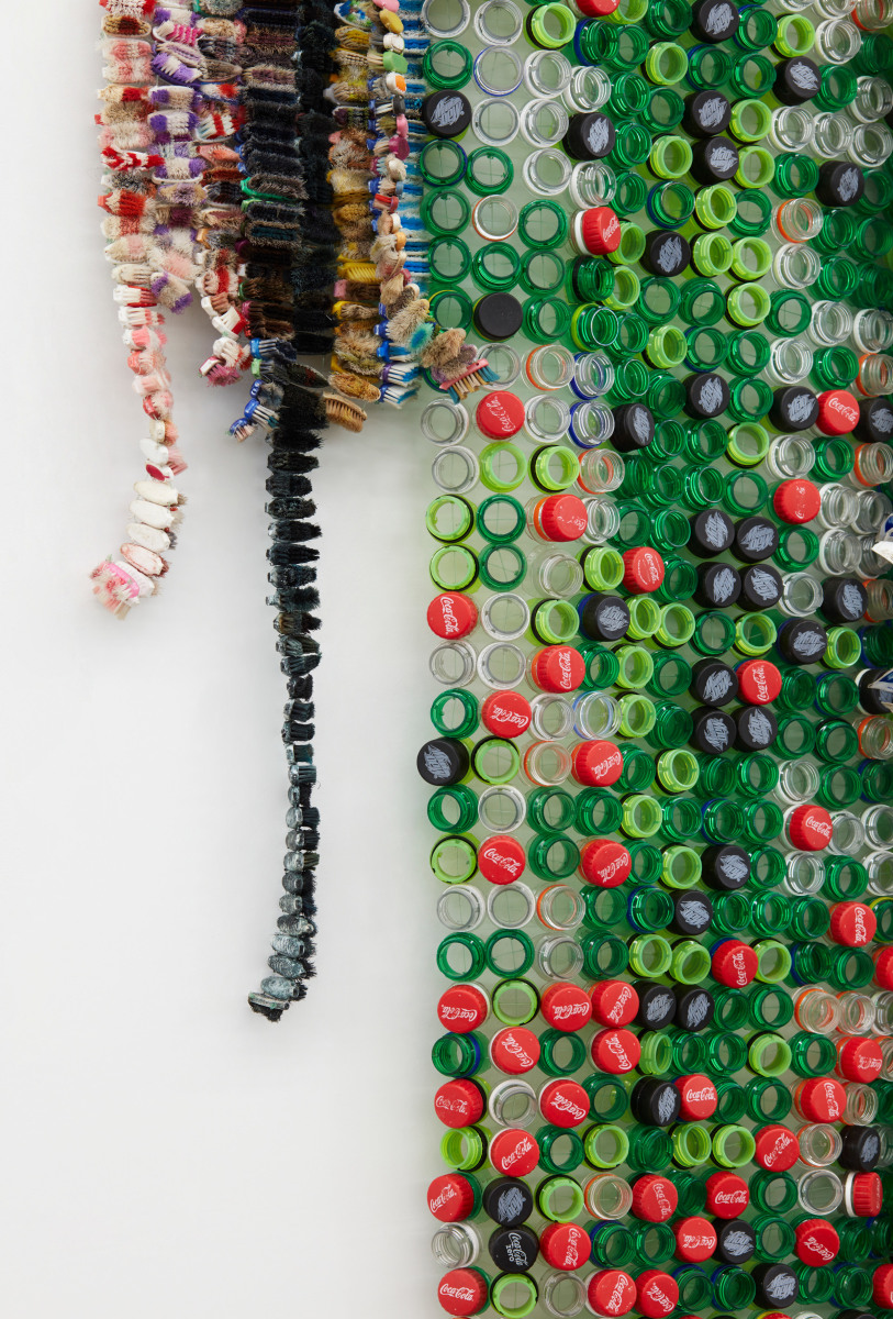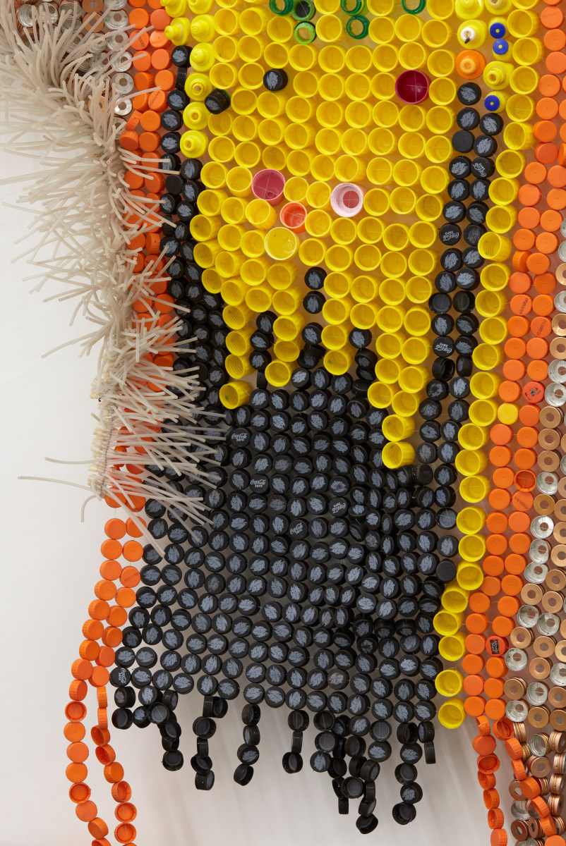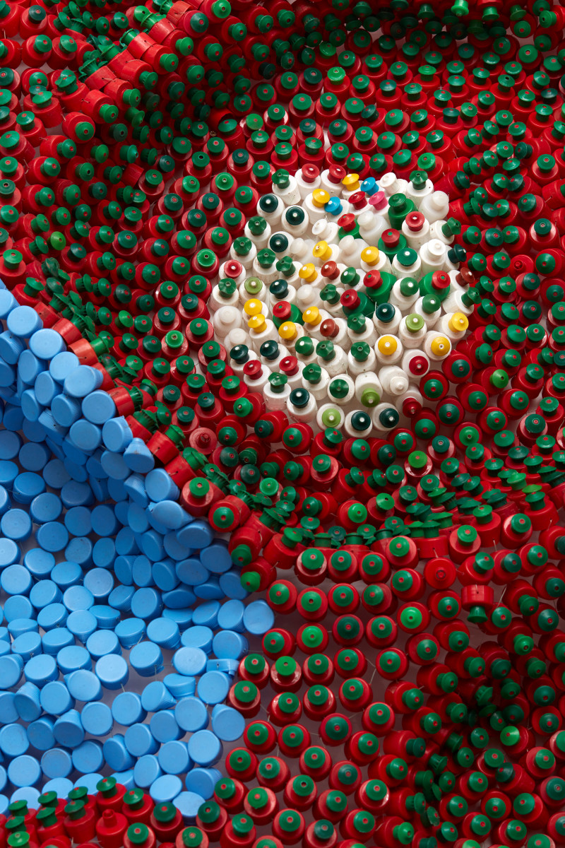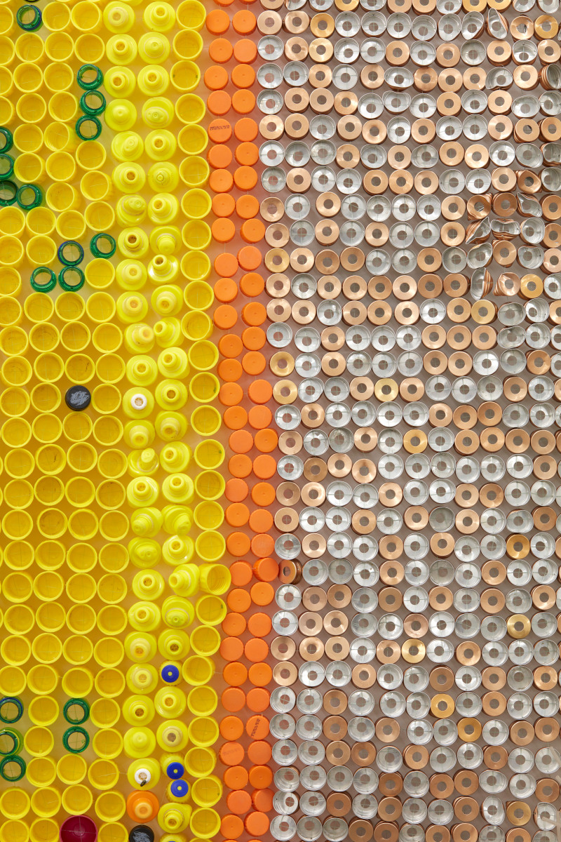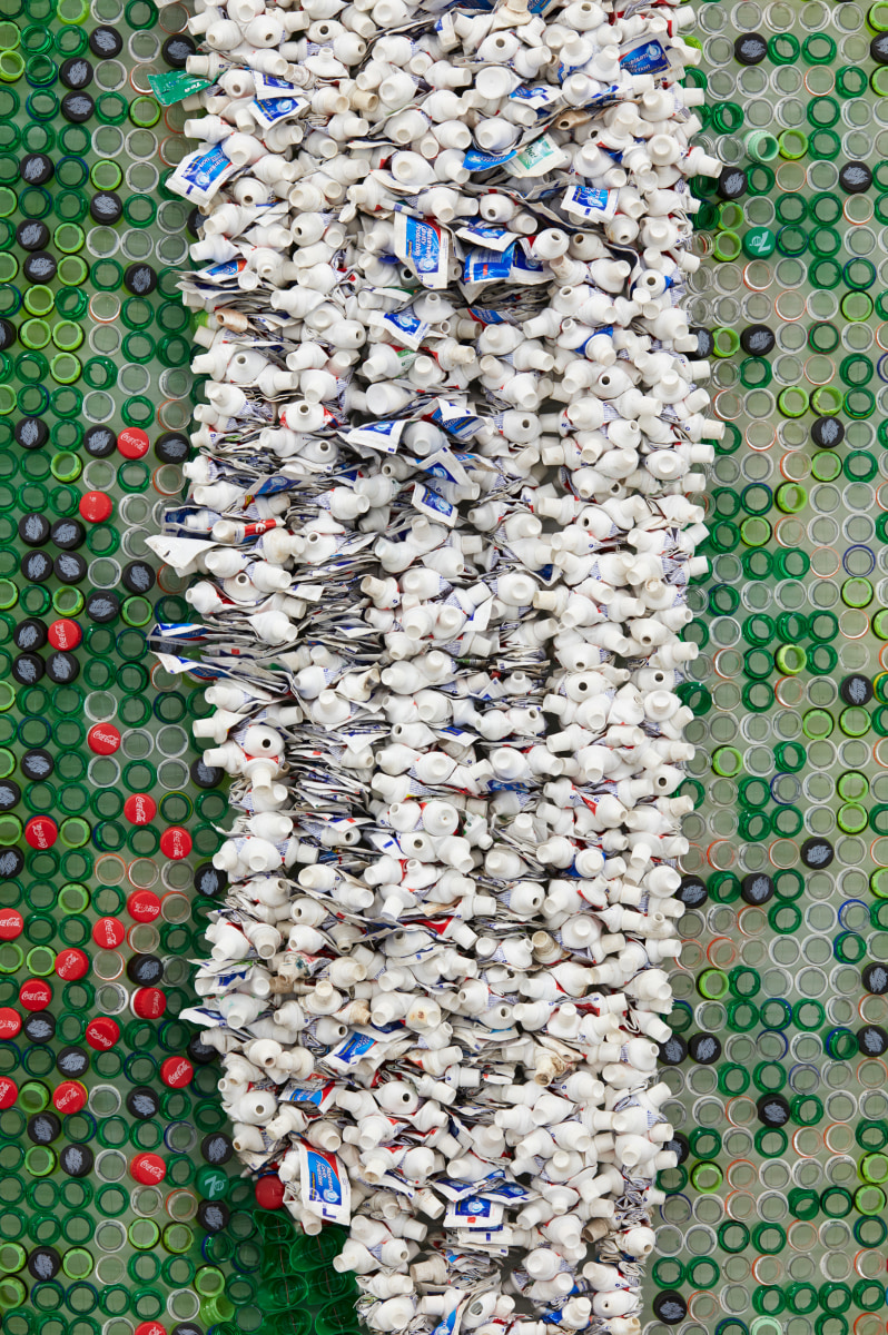 Caps, lids, toothpaste tubes, toothbrushes, rings and everyday objects with a more than ephemeral life - from a disposable perspective - become part of elaborate compositions that recall the artisan tradition. Every piece, every infinitesimal waste, recovered from immense mountains in landfills, is the bearer of a story, of a responsibility, often told by a printed name, by a brand, from a source. The theme of reuse and recovery, present in the production of numerous artists, in these works takes on particular value precisely because of the multiplicity of readings they offer and the extraordinary link with the origins, in a complex path that manages to bring out a profound dimension cultural.