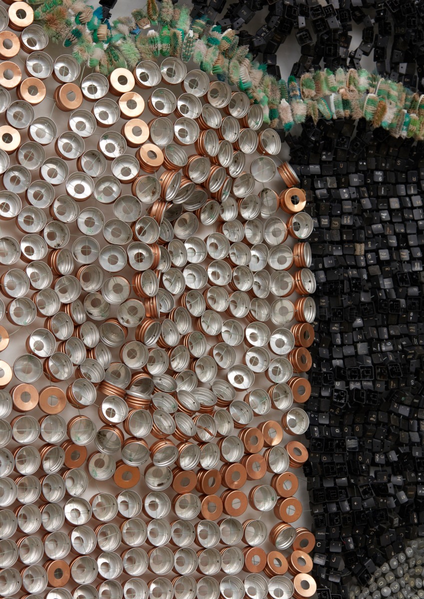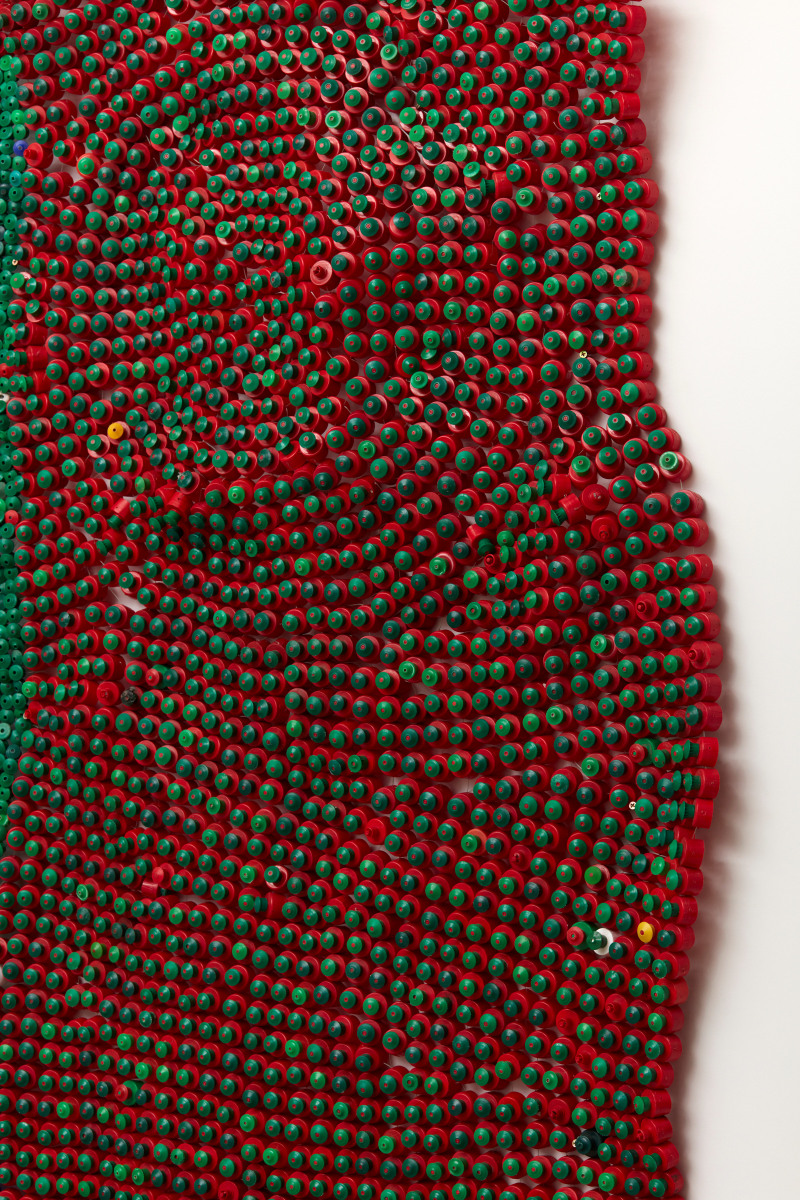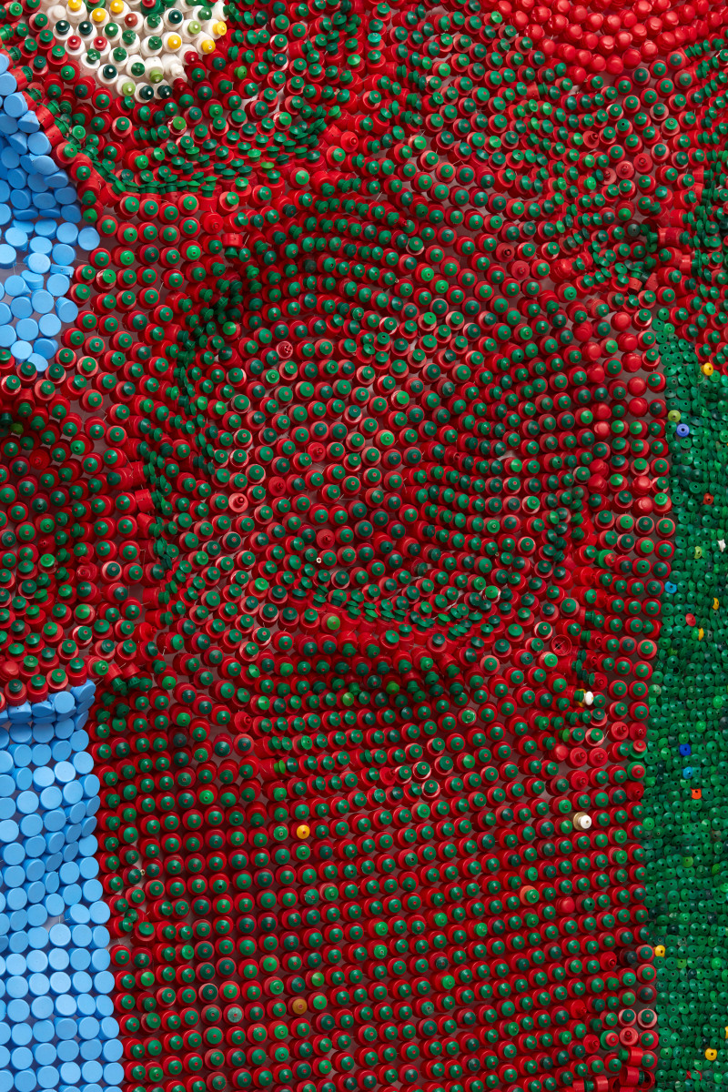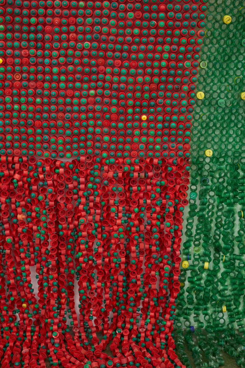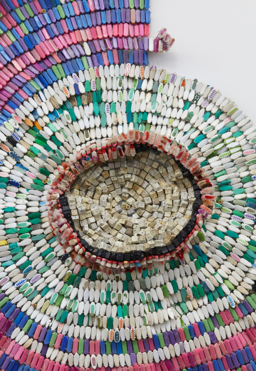 Caps, lids, toothpaste tubes, toothbrushes, rings and everyday objects with a more than ephemeral life - from a disposable perspective - become part of elaborate compositions that recall the artisan tradition. Every piece, every infinitesimal waste, recovered from immense mountains in landfills, is the bearer of a story, of a responsibility, often told by a printed name, by a brand, from a source. The theme of reuse and recovery, present in the production of numerous artists, in these works takes on particular value precisely because of the multiplicity of readings they offer and the extraordinary link with the origins, in a complex path that manages to bring out a profound dimension cultural.