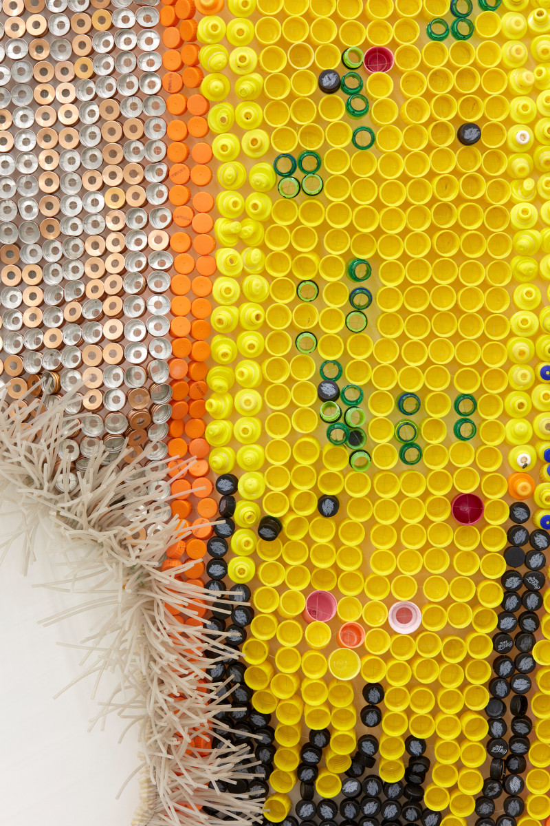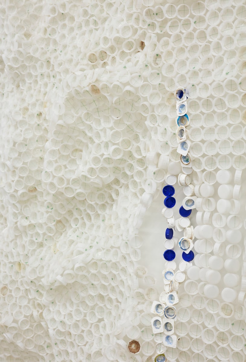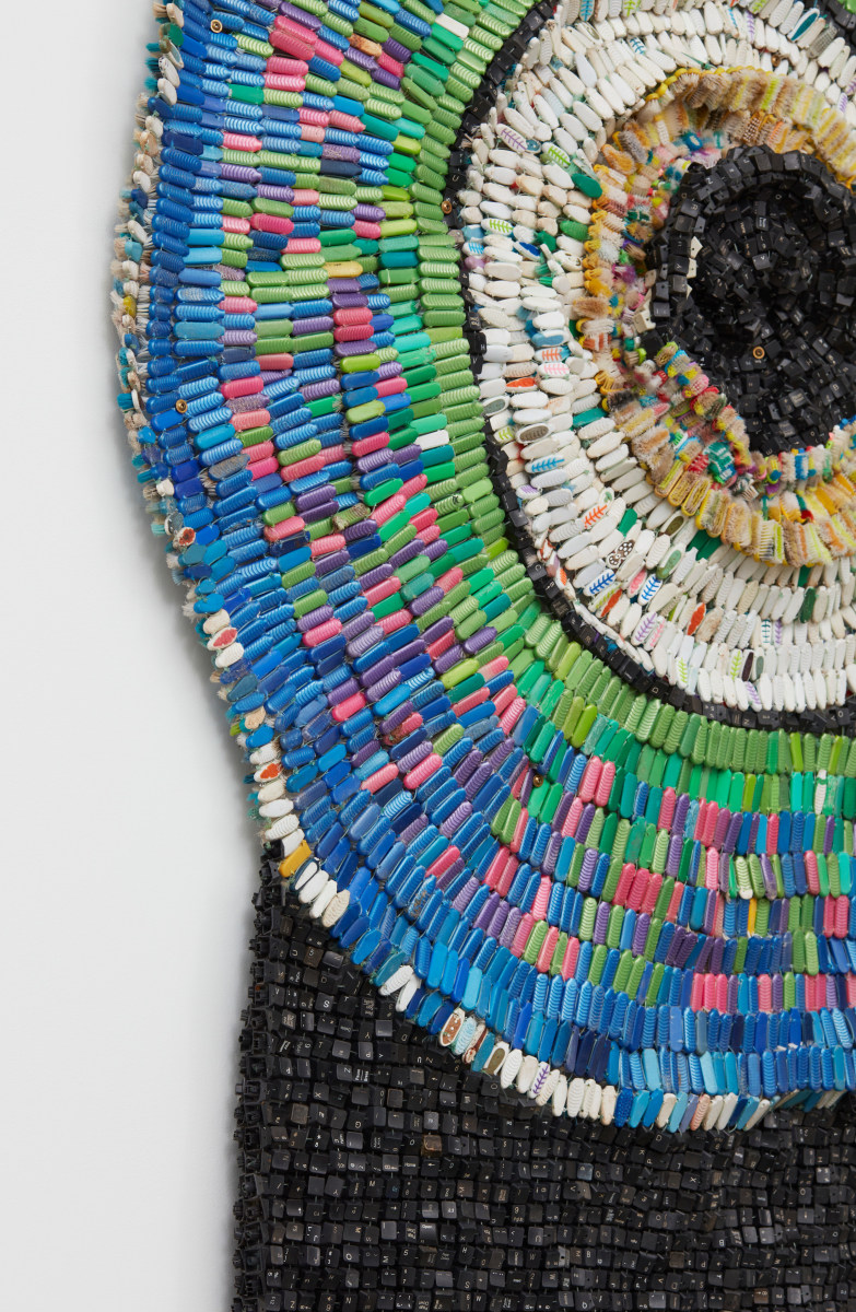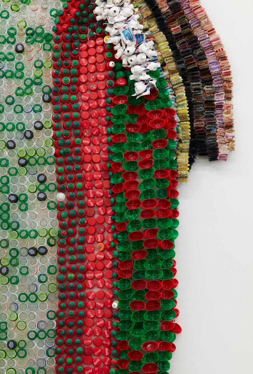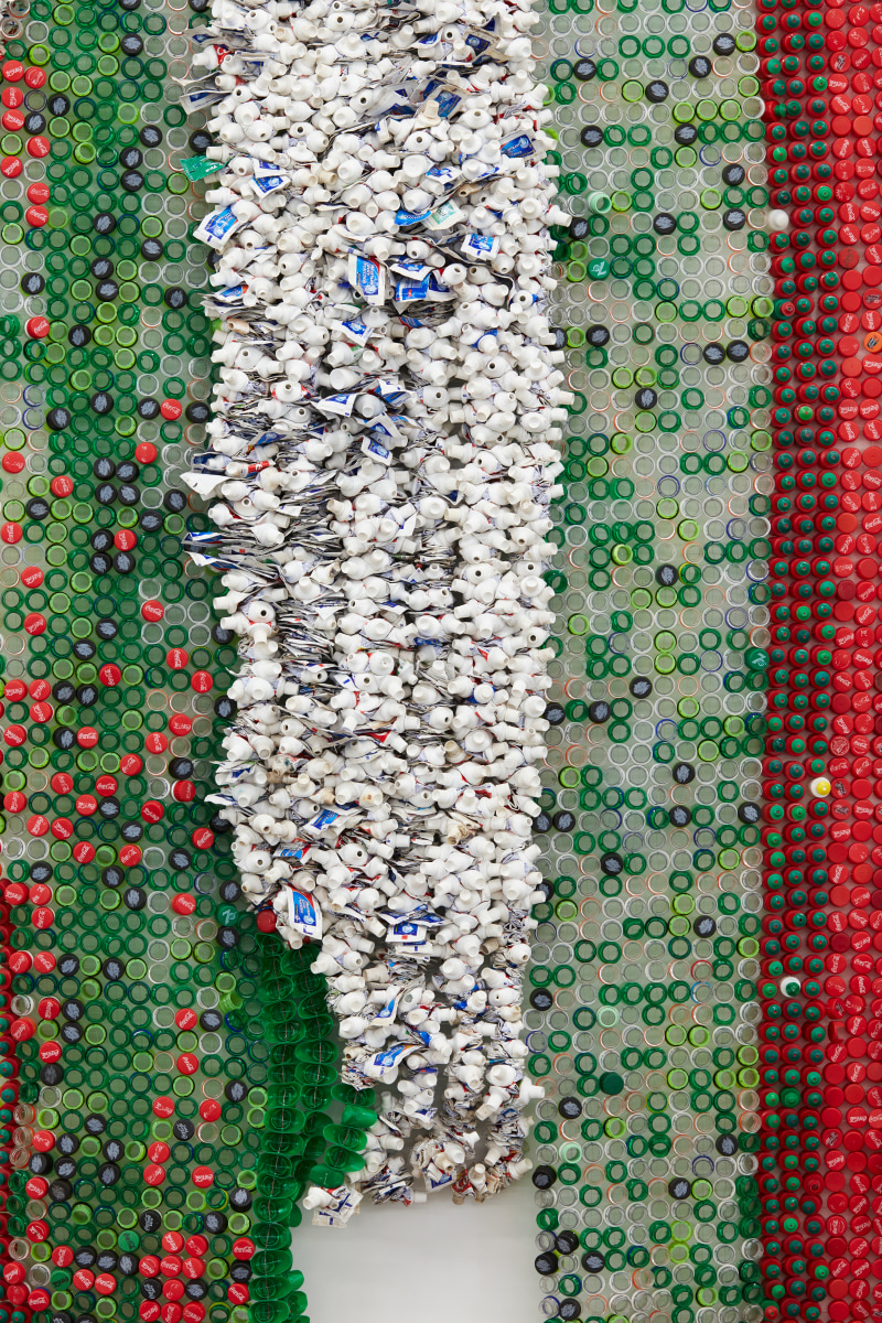 Caps, lids, toothpaste tubes, toothbrushes, rings and everyday objects with a more than ephemeral life - from a disposable perspective - become part of elaborate compositions that recall the artisan tradition. Every piece, every infinitesimal waste, recovered from immense mountains in landfills, is the bearer of a story, of a responsibility, often told by a printed name, by a brand, from a source. The theme of reuse and recovery, present in the production of numerous artists, in these works takes on particular value precisely because of the multiplicity of readings they offer and the extraordinary link with the origins, in a complex path that manages to bring out a profound dimension cultural.