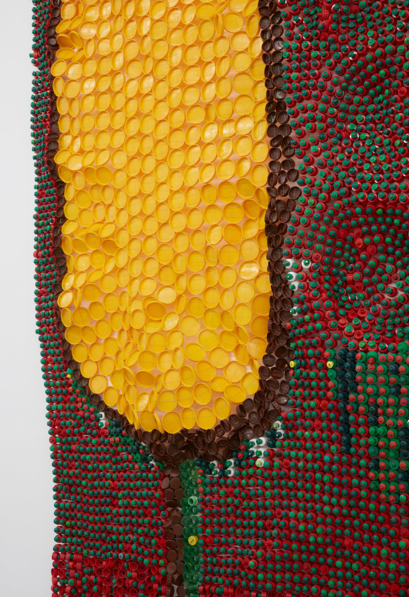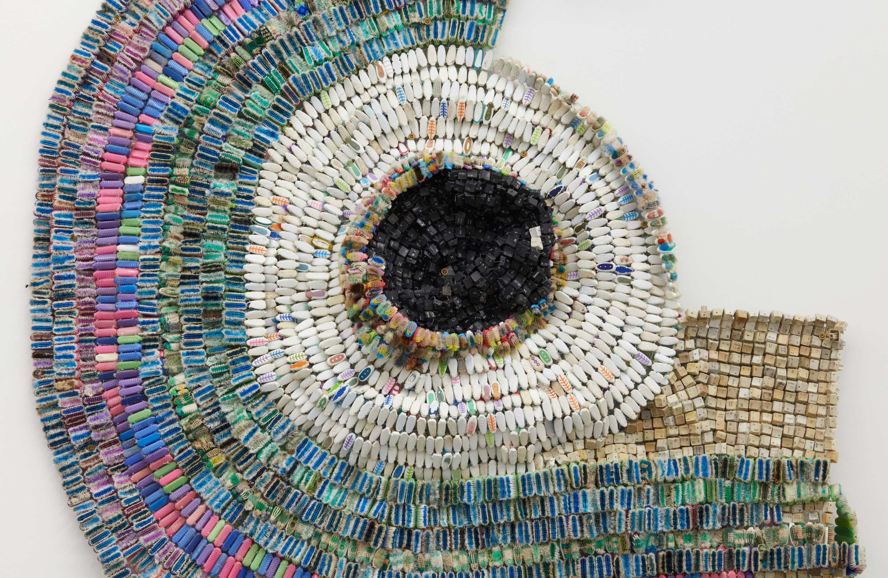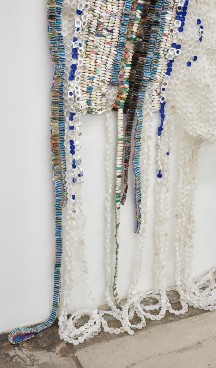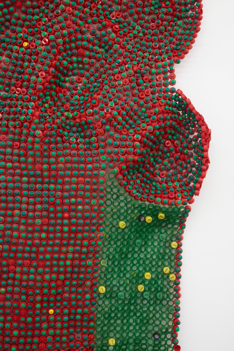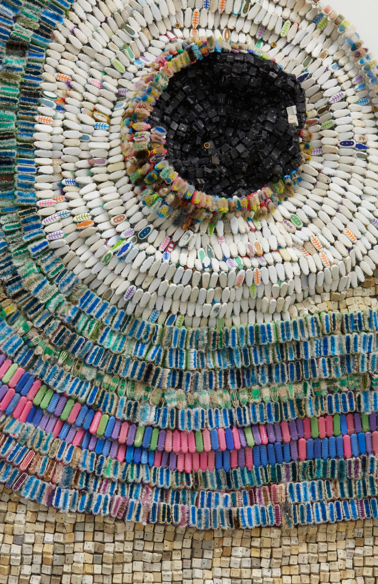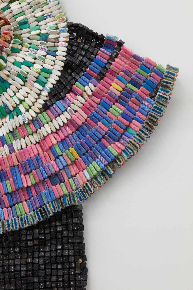 Caps, lids, toothpaste tubes, toothbrushes, rings and everyday objects with a more than ephemeral life - from a disposable perspective - become part of elaborate compositions that recall the artisan tradition. Every piece, every infinitesimal waste, recovered from immense mountains in landfills, is the bearer of a story, of a responsibility, often told by a printed name, by a brand, from a source. The theme of reuse and recovery, present in the production of numerous artists, in these works takes on particular value precisely because of the multiplicity of readings they offer and the extraordinary link with the origins, in a complex path that manages to bring out a profound dimension cultural.