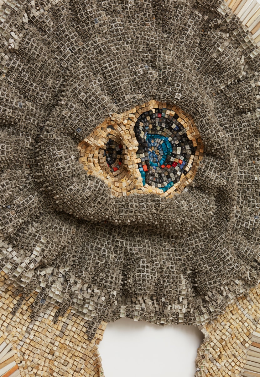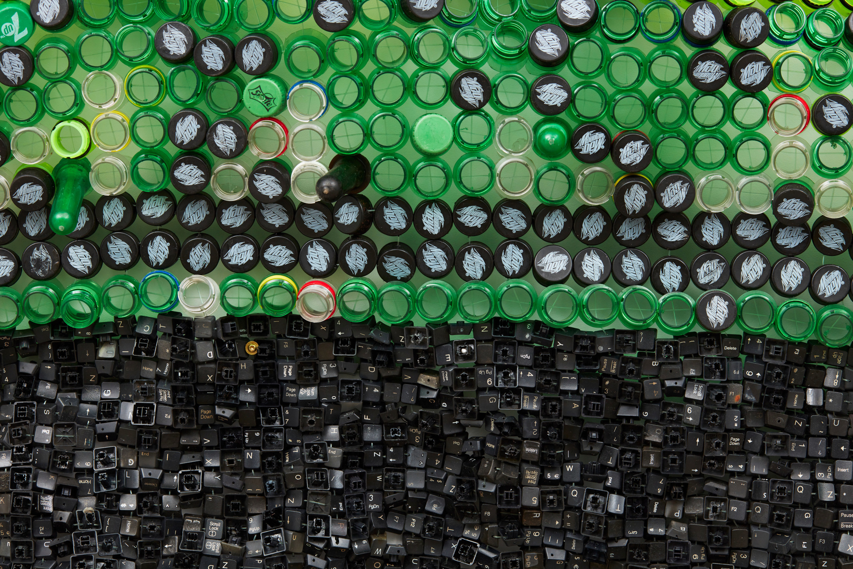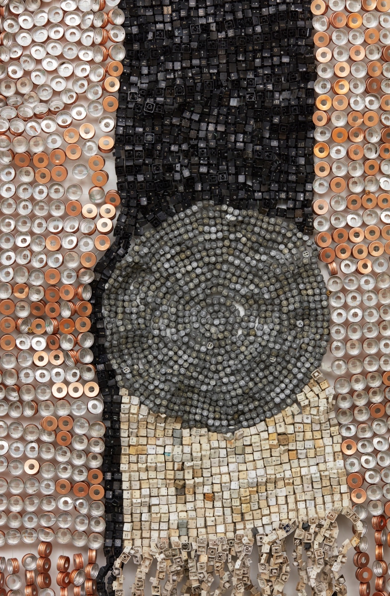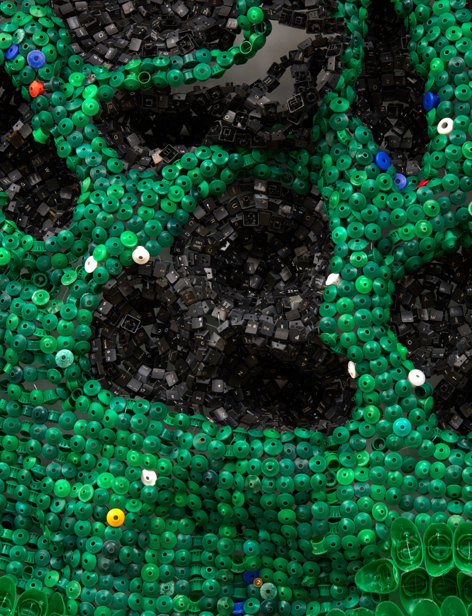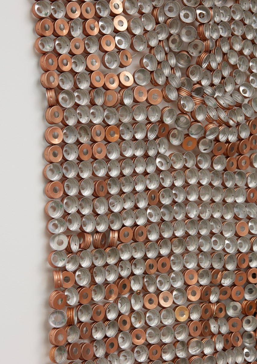 Caps, lids, toothpaste tubes, toothbrushes, rings and everyday objects with a more than ephemeral life - from a disposable perspective - become part of elaborate compositions that recall the artisan tradition. Every piece, every infinitesimal waste, recovered from immense mountains in landfills, is the bearer of a story, of a responsibility, often told by a printed name, by a brand, from a source. The theme of reuse and recovery, present in the production of numerous artists, in these works takes on particular value precisely because of the multiplicity of readings they offer and the extraordinary link with the origins, in a complex path that manages to bring out a profound dimension cultural.