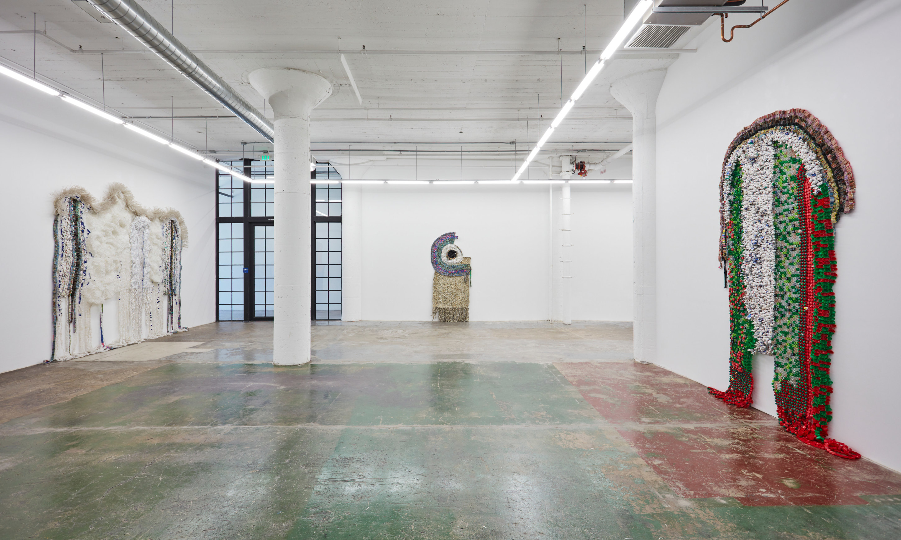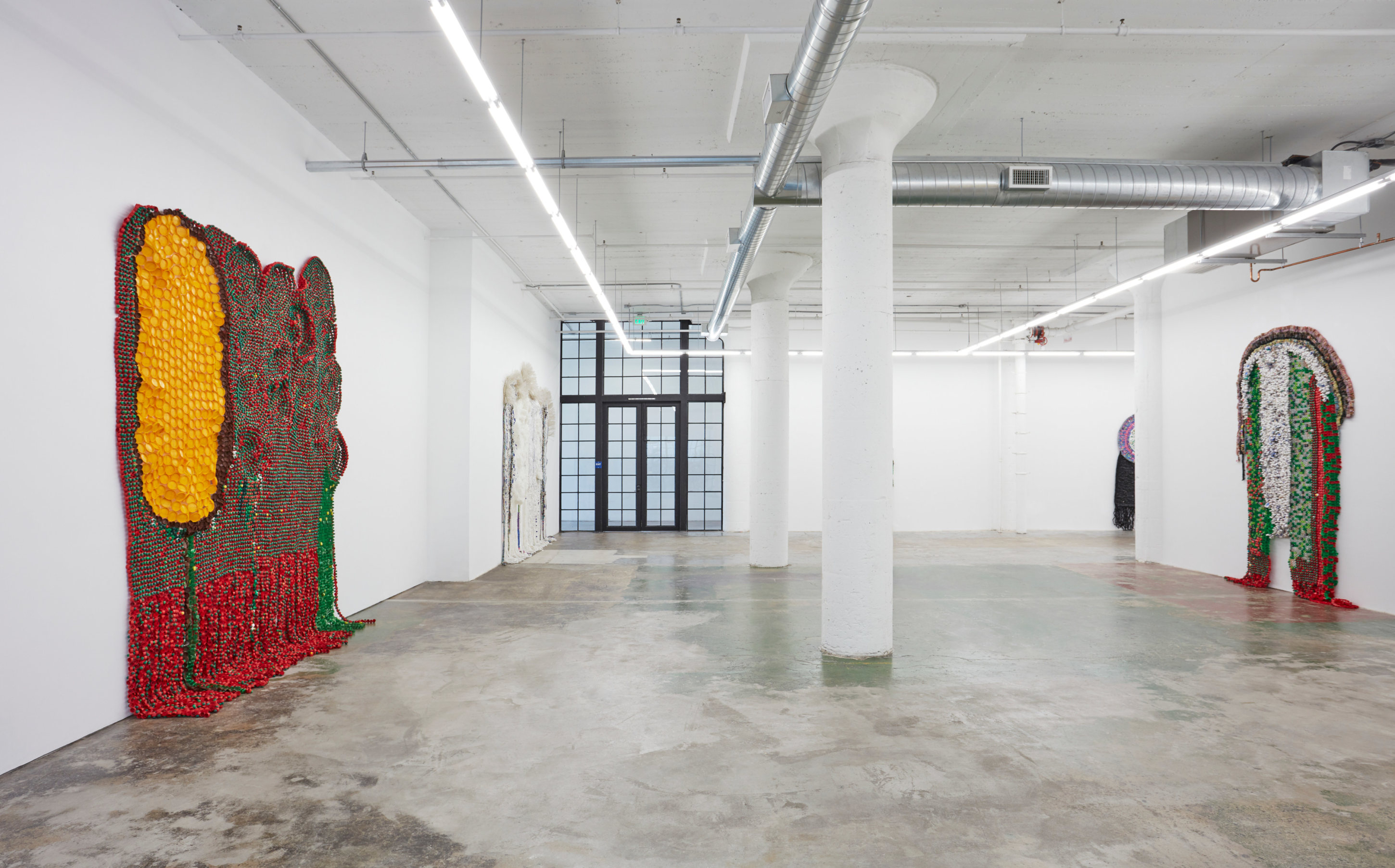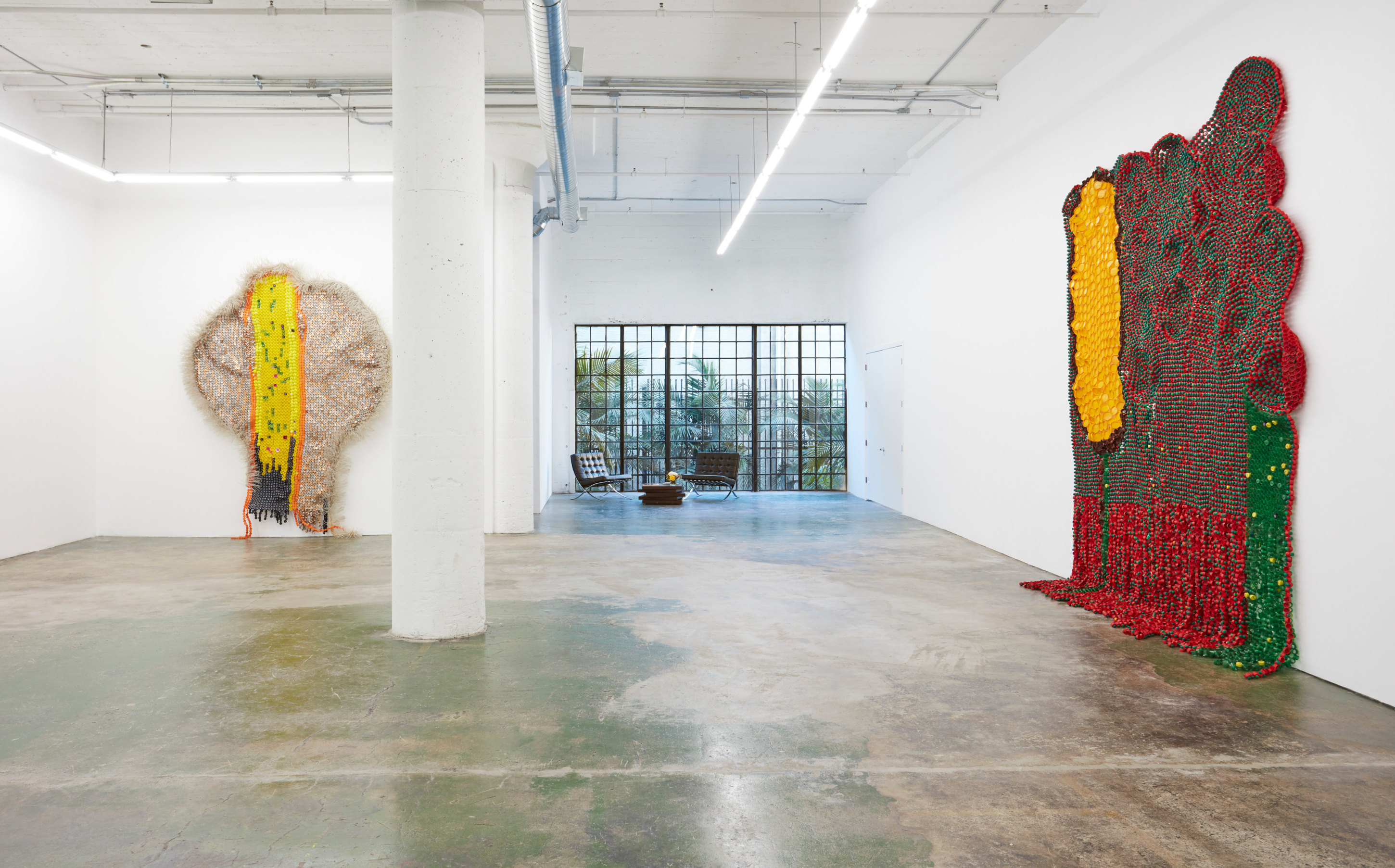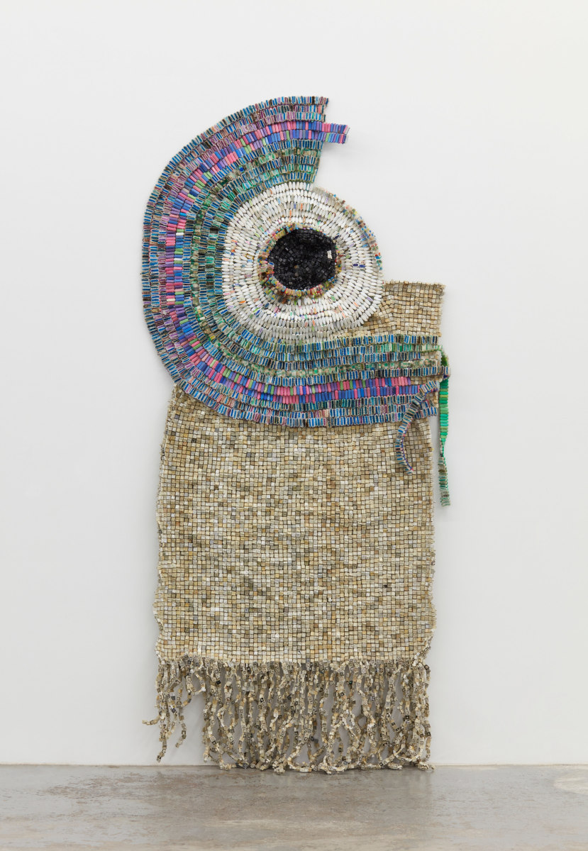 Making an auspicious start, Nicodim features Moffat Takadiwa for their first show in the new building. From afar, Takadiwa’s wall hangings might be confused for textiles, as glamorous and over the top as any Bob Mackie beaded gown. They are woven and drape under the weight of their components but instead of luxurious fabrics, they are like colorful chain mail for our modern times.