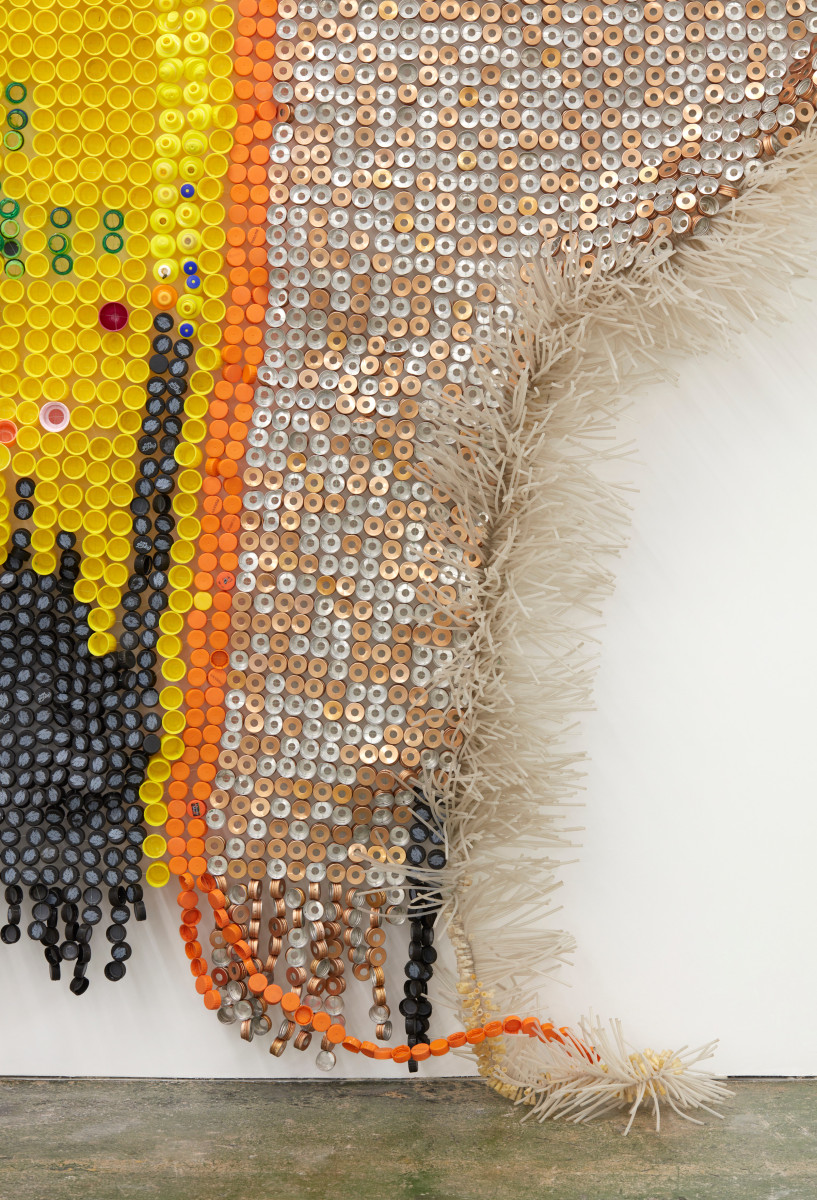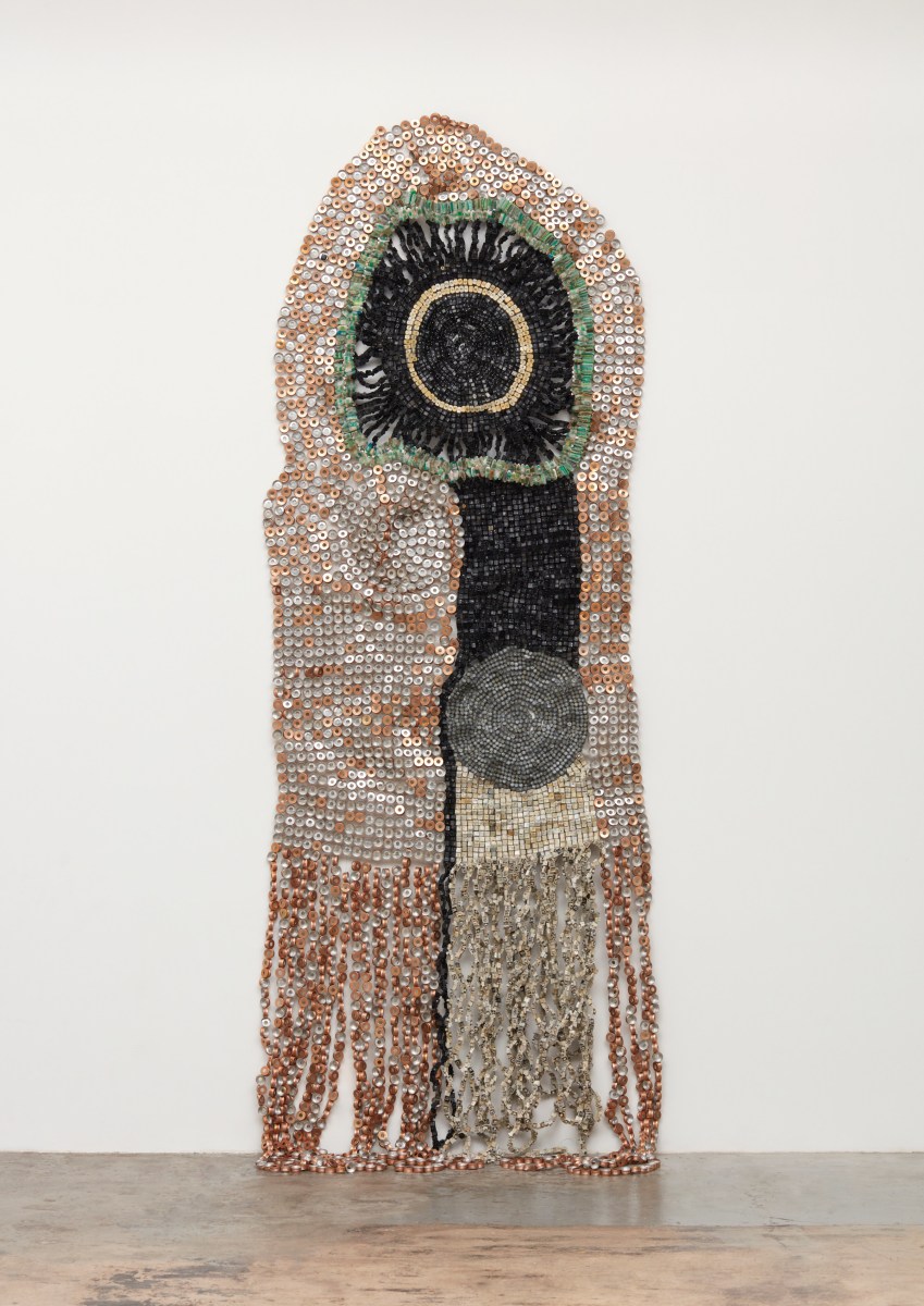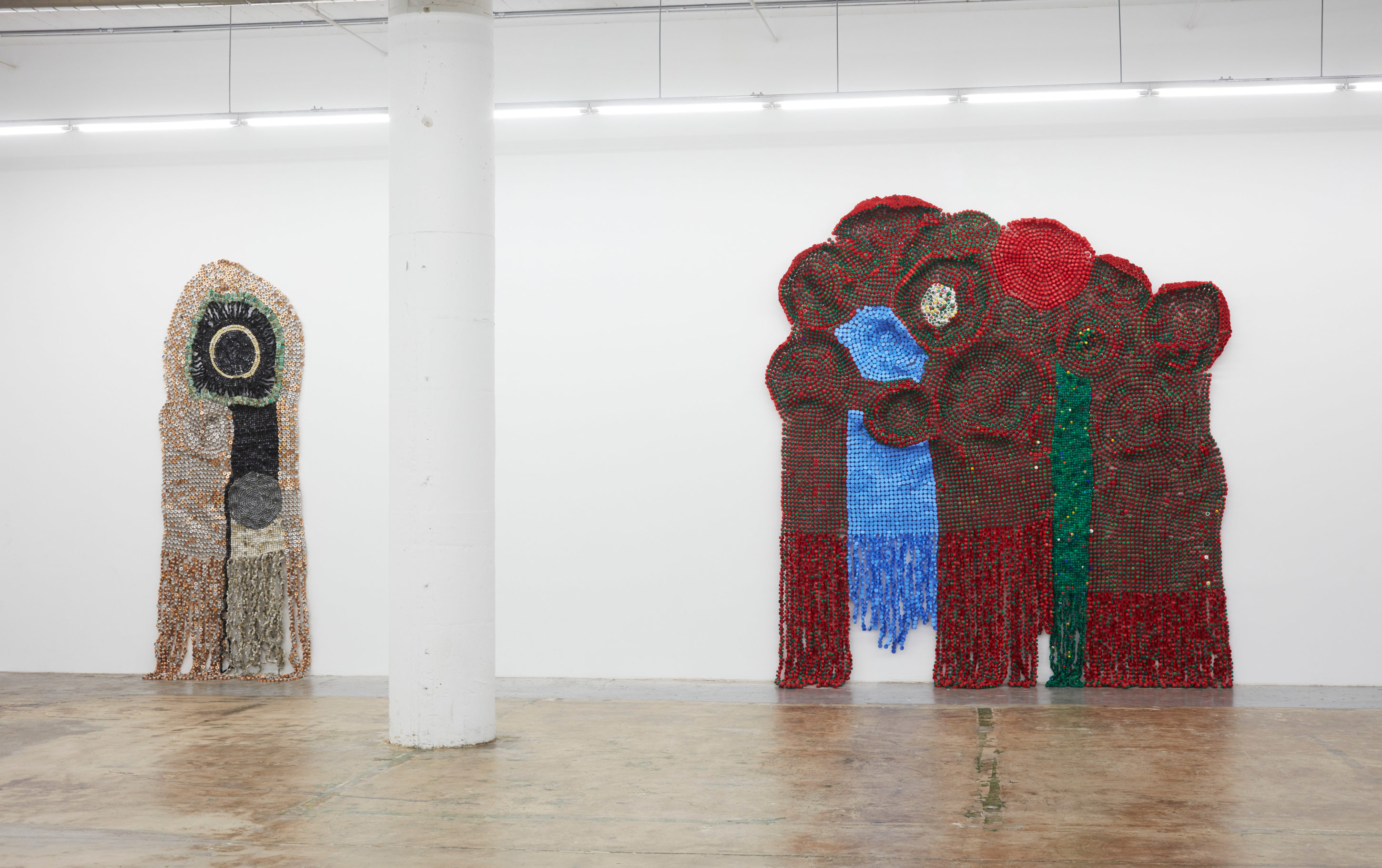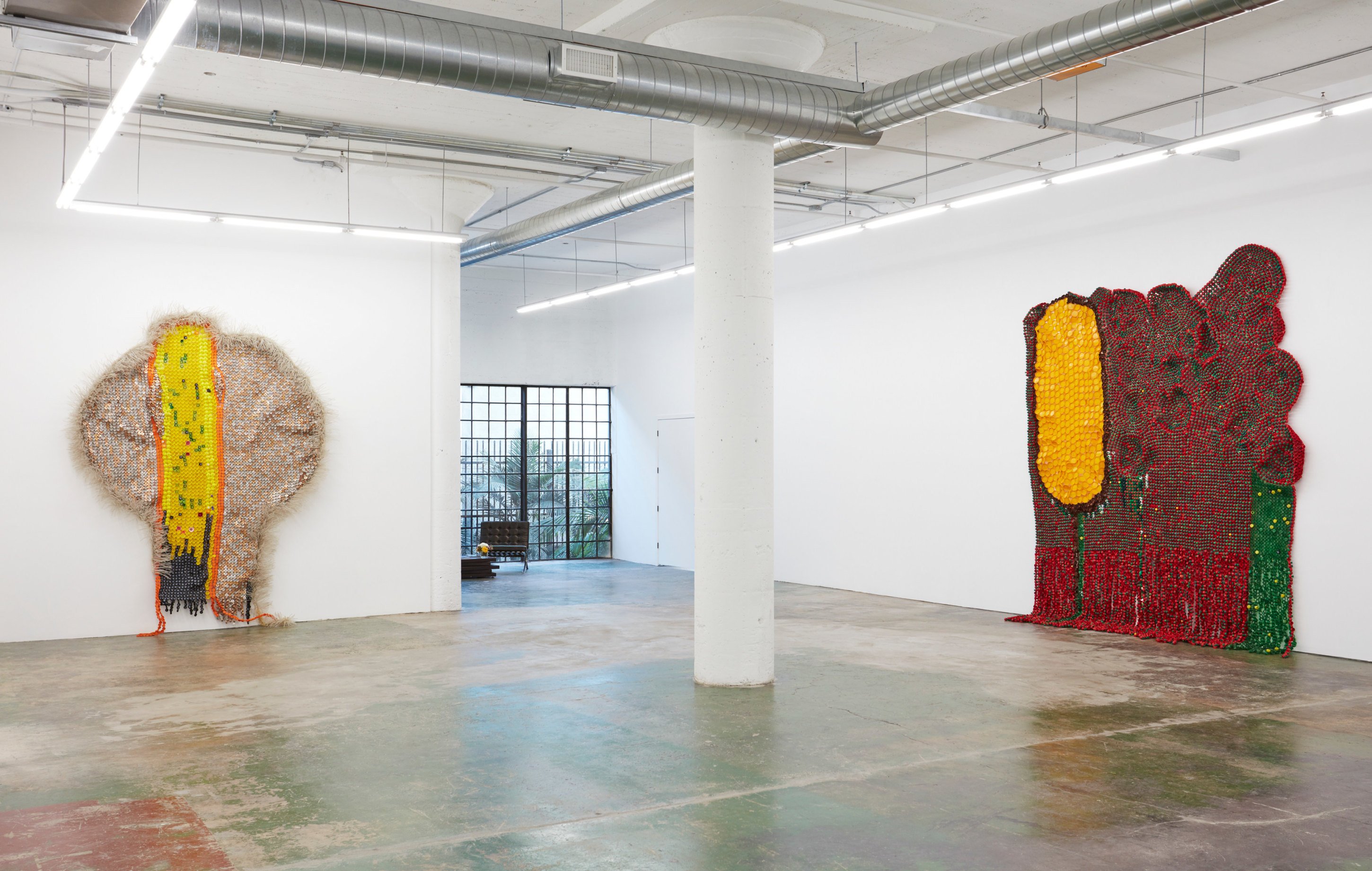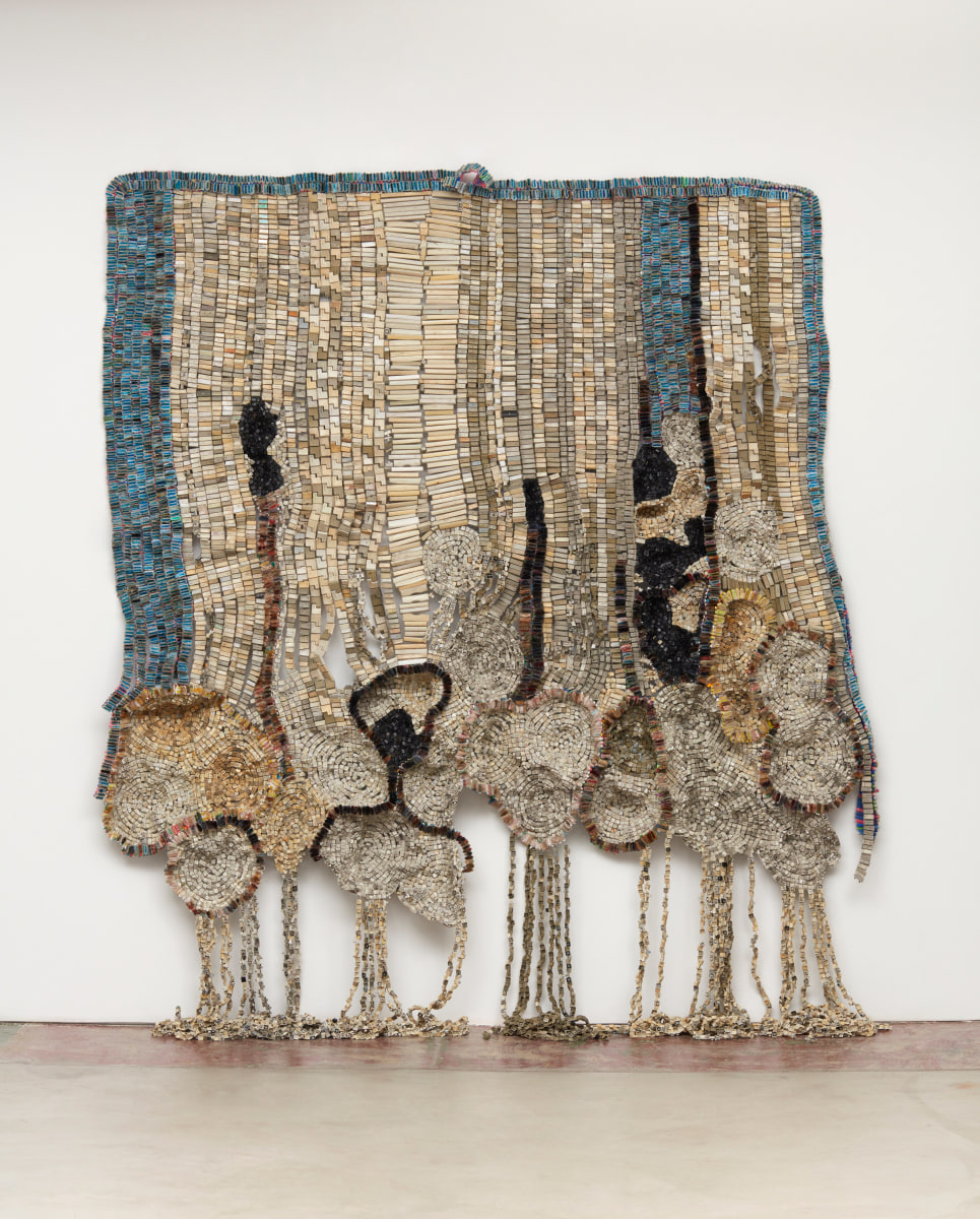 Making an auspicious start, Nicodim features Moffat Takadiwa for their first show in the new building. From afar, Takadiwa’s wall hangings might be confused for textiles, as glamorous and over the top as any Bob Mackie beaded gown. They are woven and drape under the weight of their components but instead of luxurious fabrics, they are like colorful chain mail for our modern times.