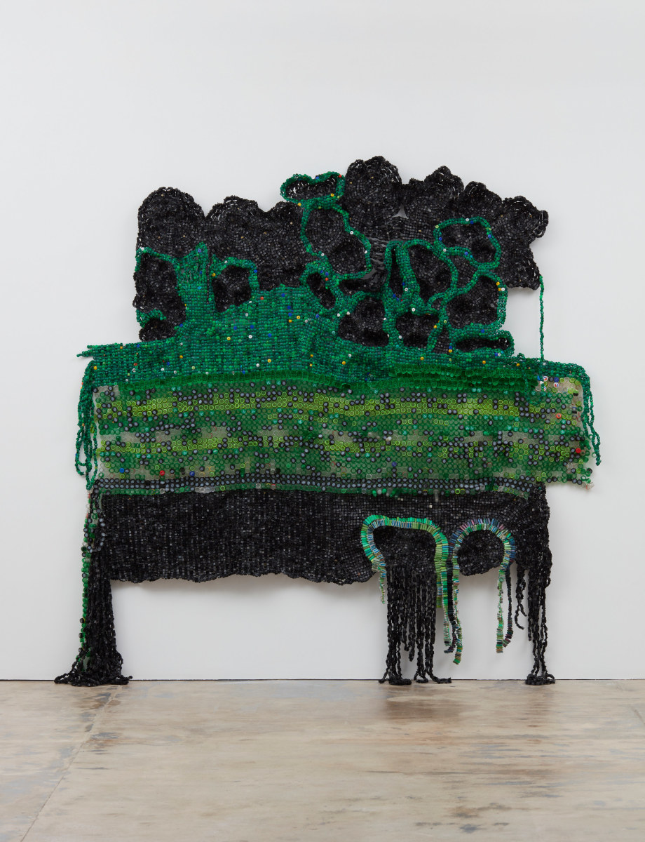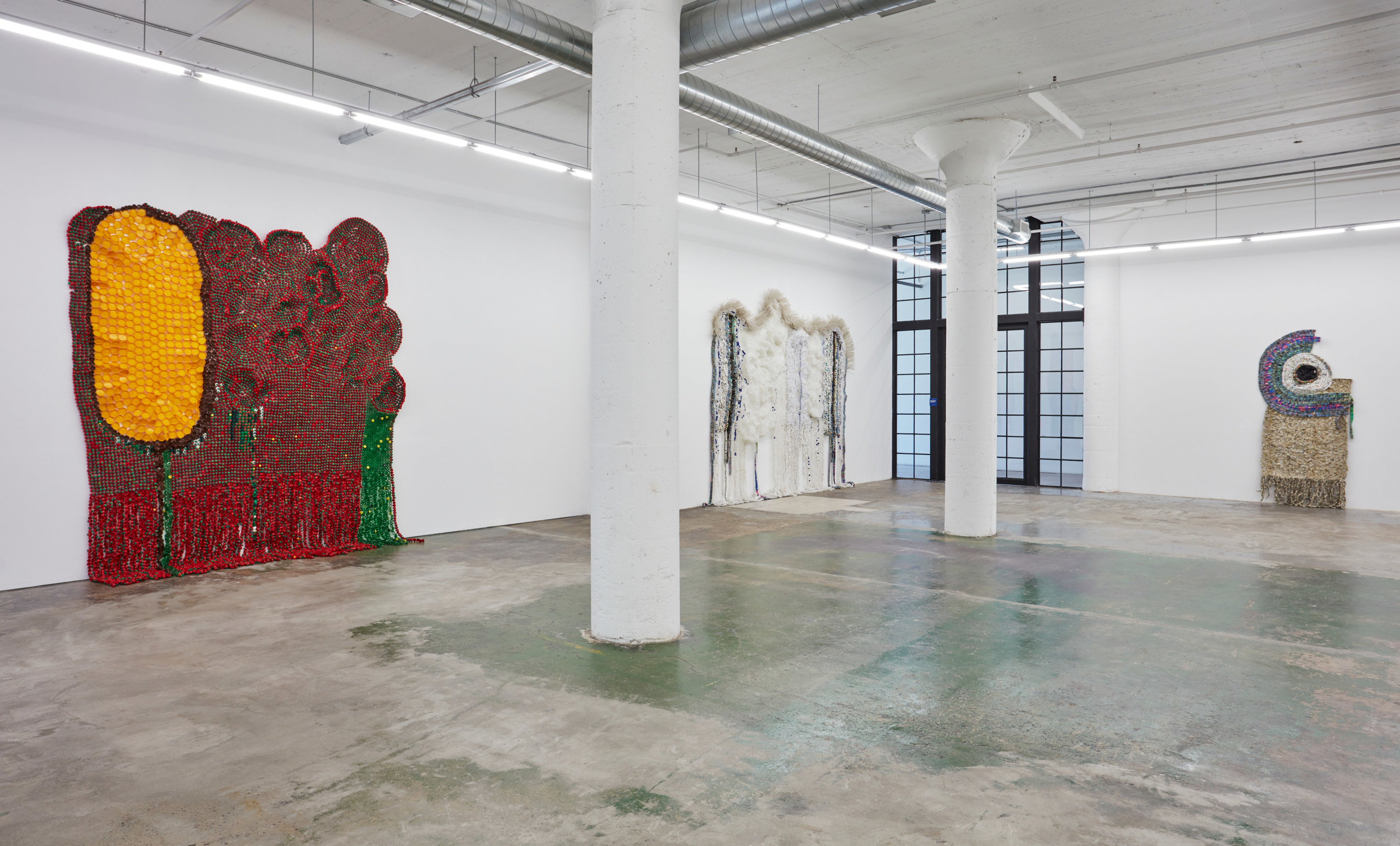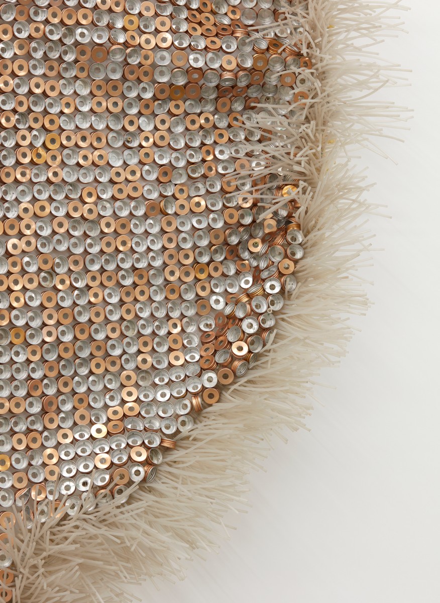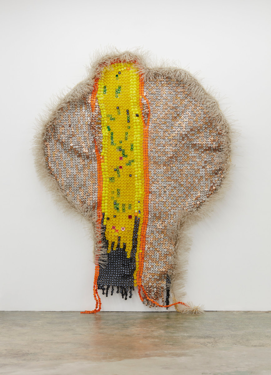 Making an auspicious start, Nicodim features Moffat Takadiwa for their first show in the new building. From afar, Takadiwa’s wall hangings might be confused for textiles, as glamorous and over the top as any Bob Mackie beaded gown. They are woven and drape under the weight of their components but instead of luxurious fabrics, they are like colorful chain mail for our modern times.