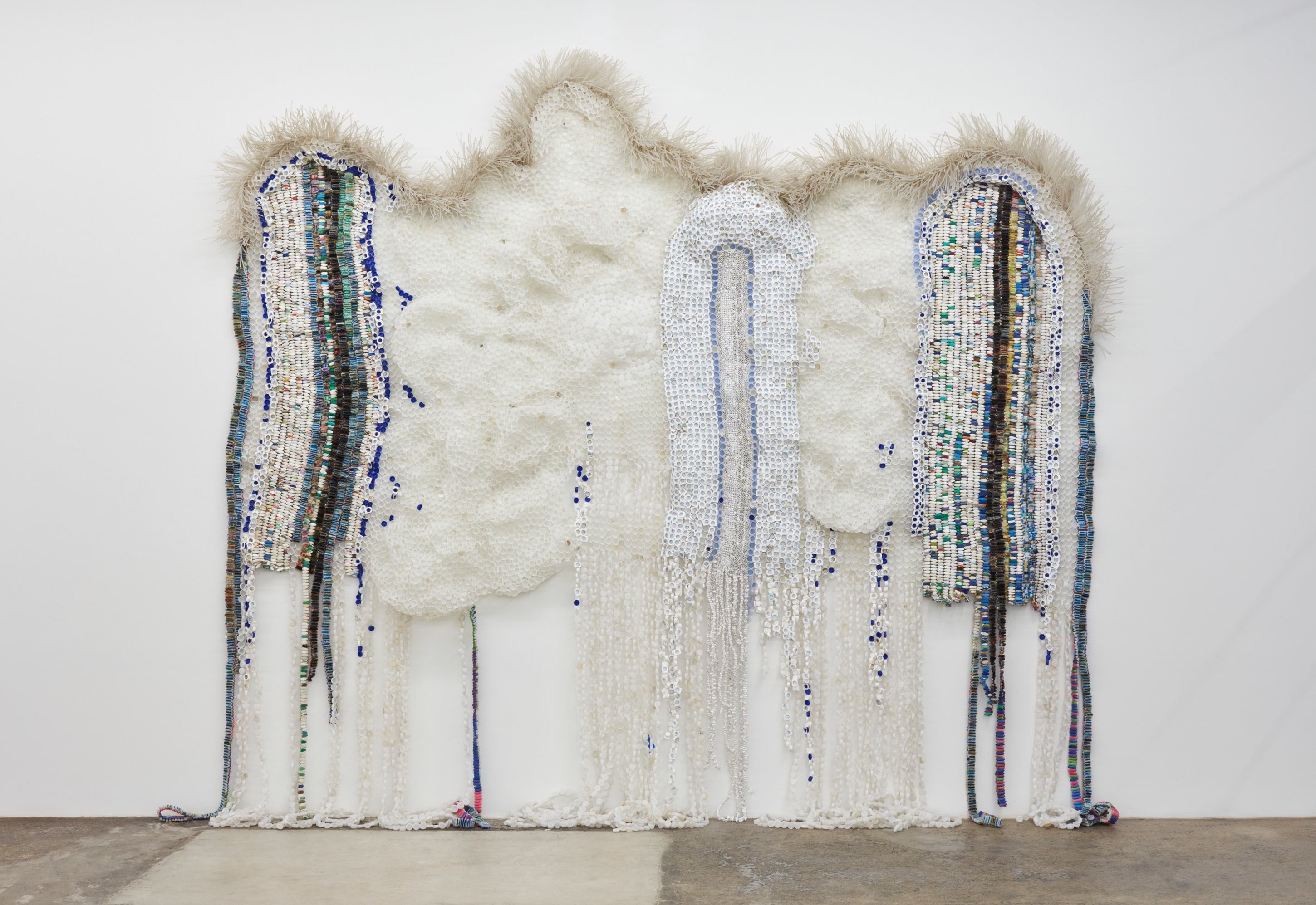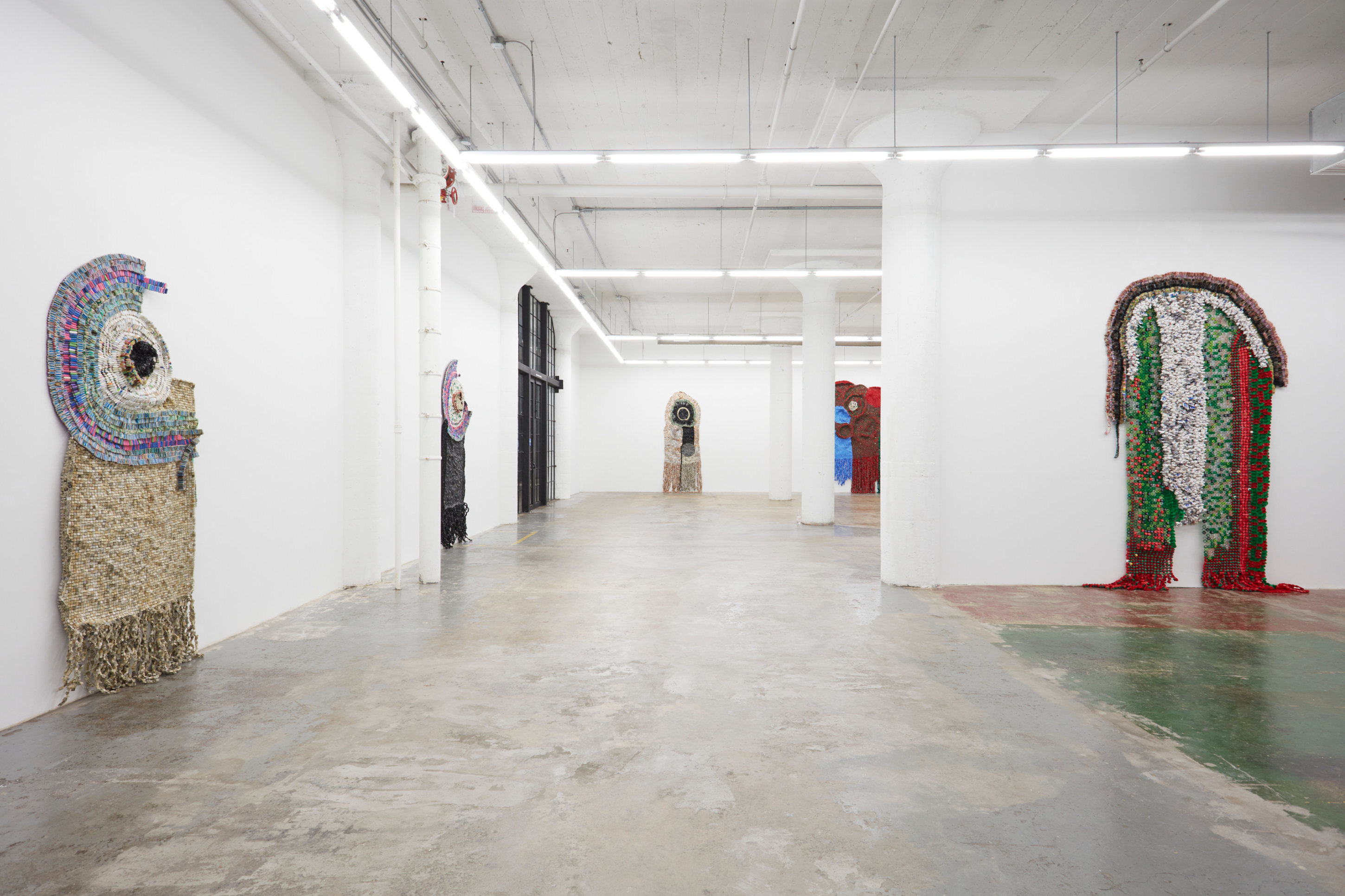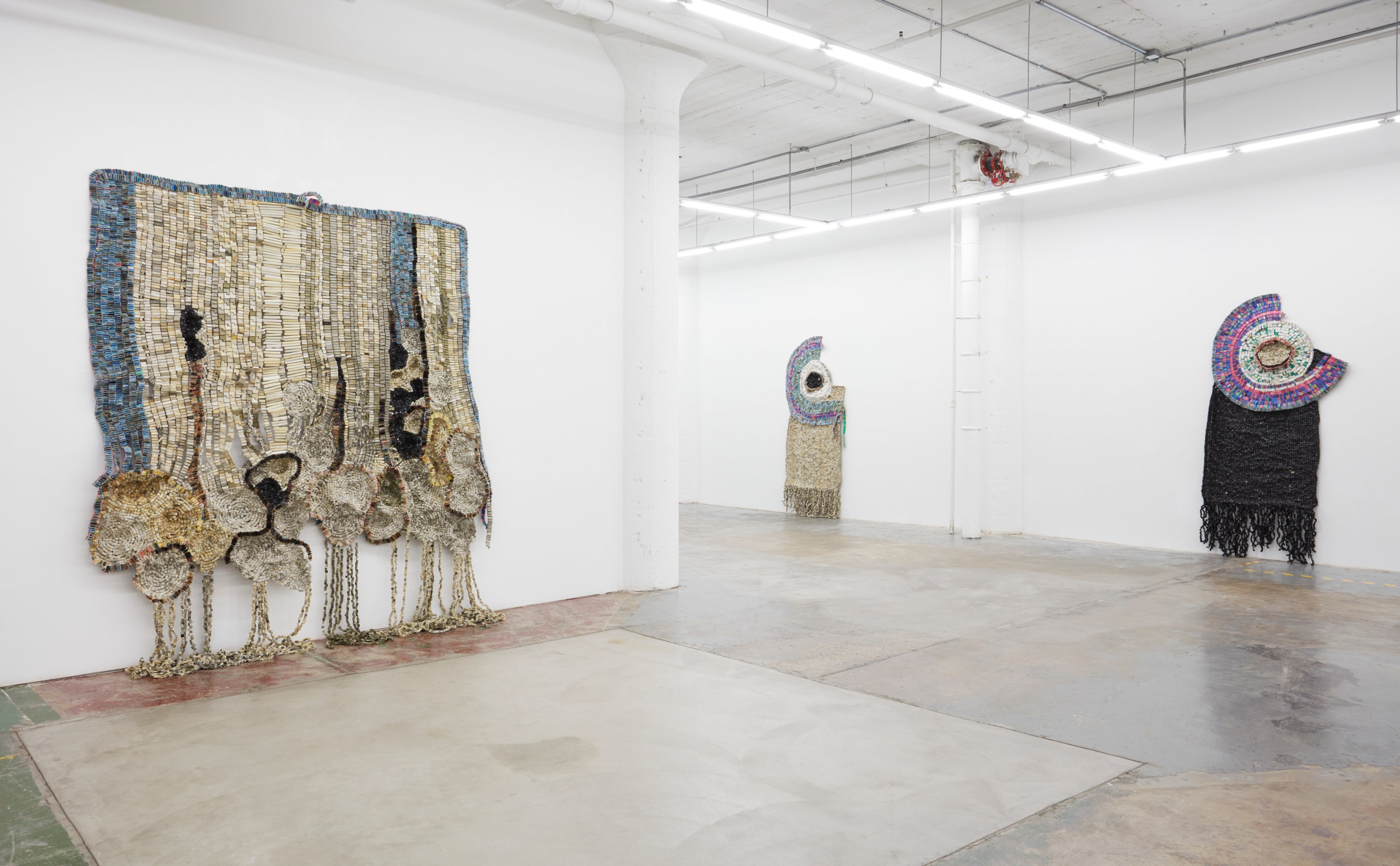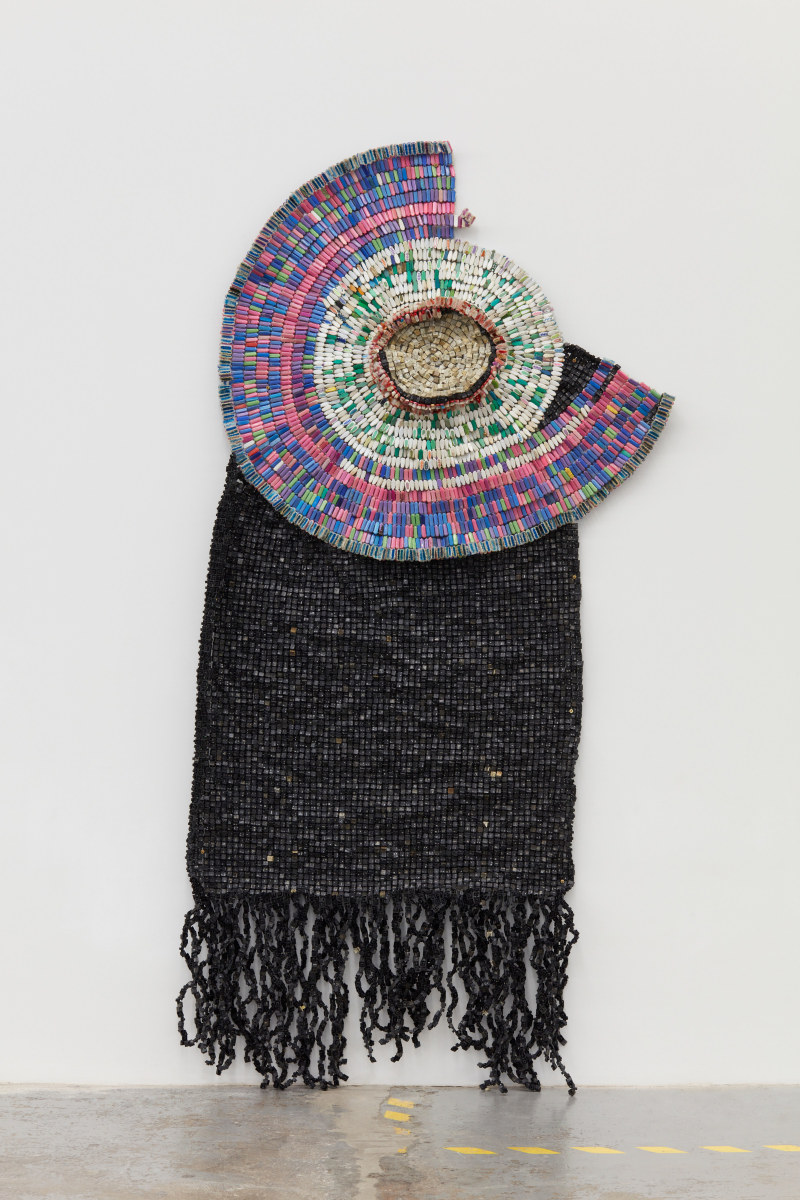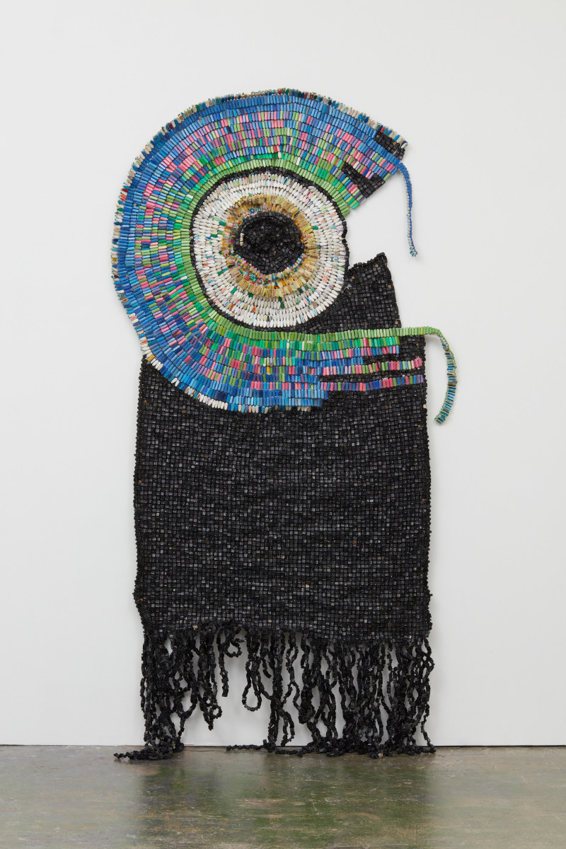 Nicodim Gallery is pleased to present Moffat Takadiwa’s (b. 1983, Karol, Zimbabwe) first solo exhibition in the United States. Takadiwa reassesses his own Korekore craft culture through the appropriation of garbage from the West, elevating found objects into sculptural forms that engage with issues of cultural identity, language, social practice, and the environment. All of his artworks are composed from the discarded remains of consumer waste, woven together in the language of traditional Zimbabwean textiles. Macrobiotic in his approach to material, his repurposed objects tell stories of each piece’s past lives to viewers brave enough to confront their own ecological and colonial legacies.