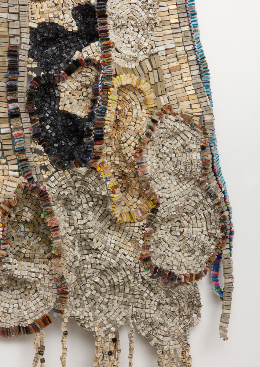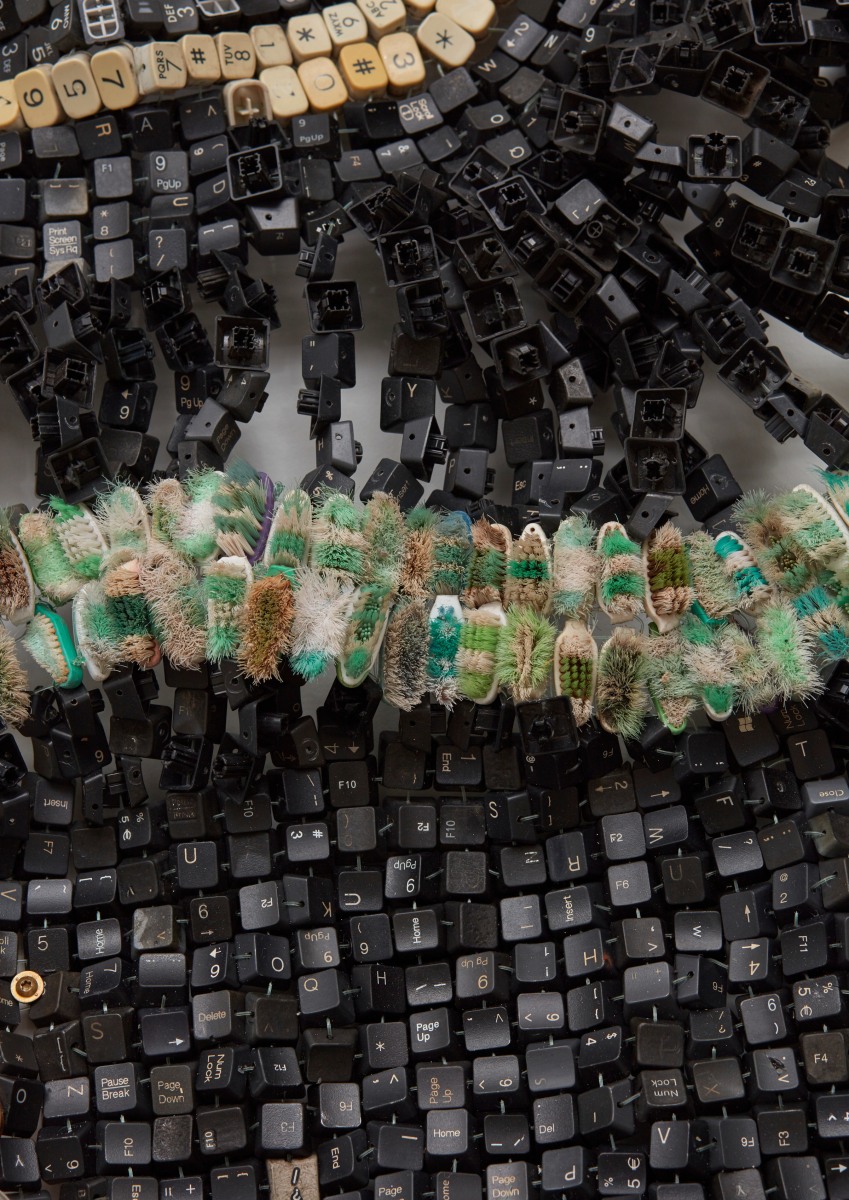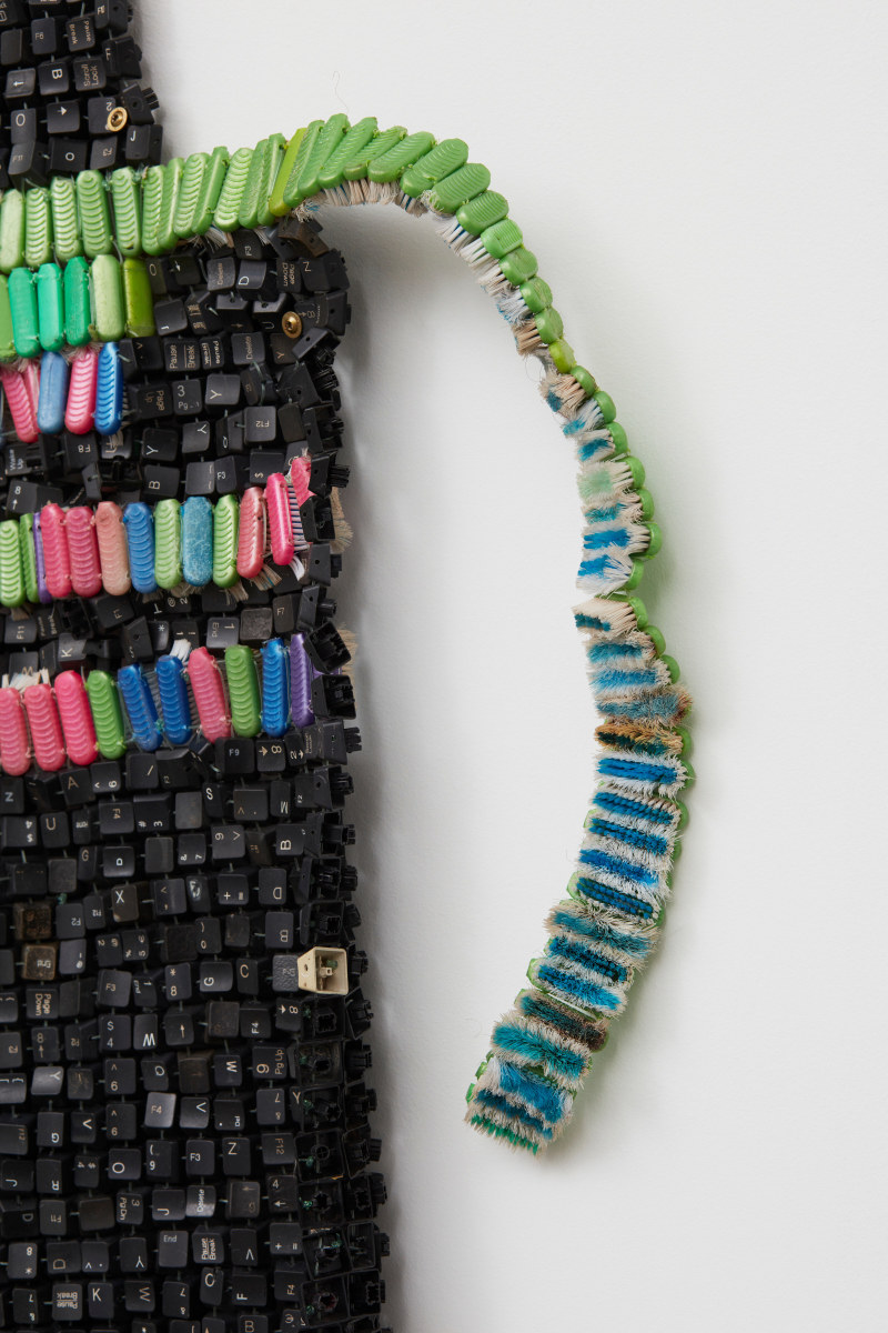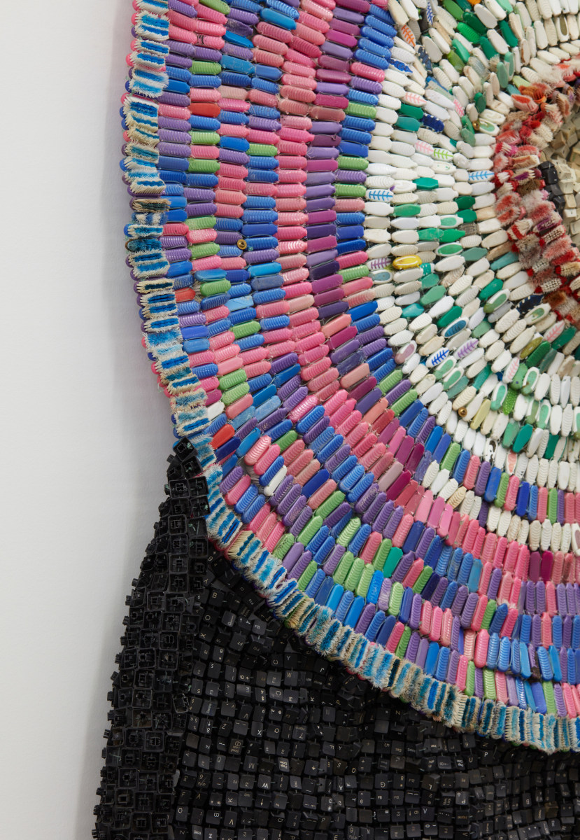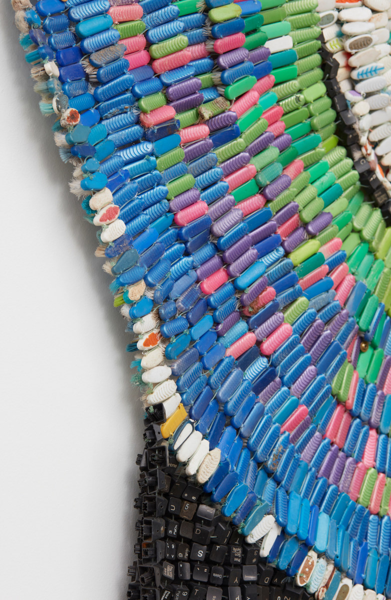 Takadiwa’s wall-mounted golems are brought to life from the discarded toothbrushes, keyboards, aerosol lids, and vaccine bottles of Los Angeles, New York, Chicago, and other industrialized cities reincarnate. He considers his impossible tapestries a sort of post-colonial African Dada; the strands of keyboard pads and plastic bits spiral in allegorical urinals within the work. The oft-romanticized abundance of natural resources in Africa remains a Eurocentric mythology. Western waste allows past colonizers to repopulate the lands of their former settlements with trash as a stand-in.