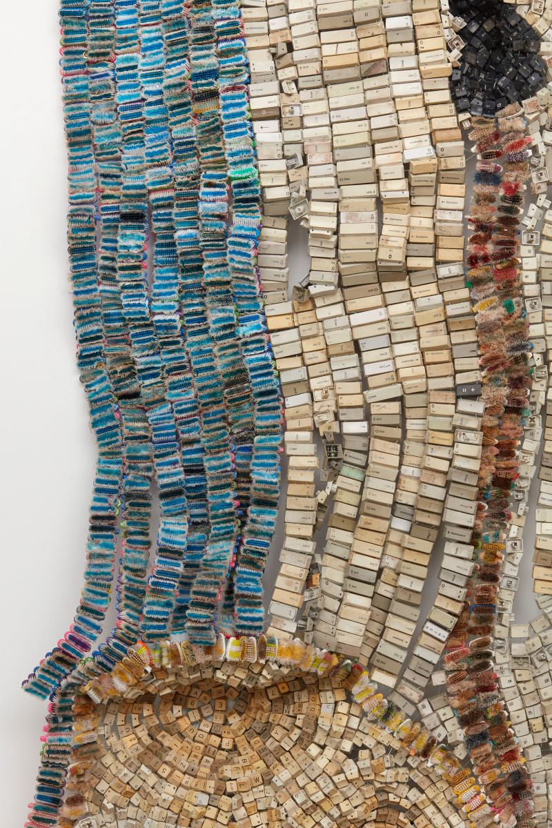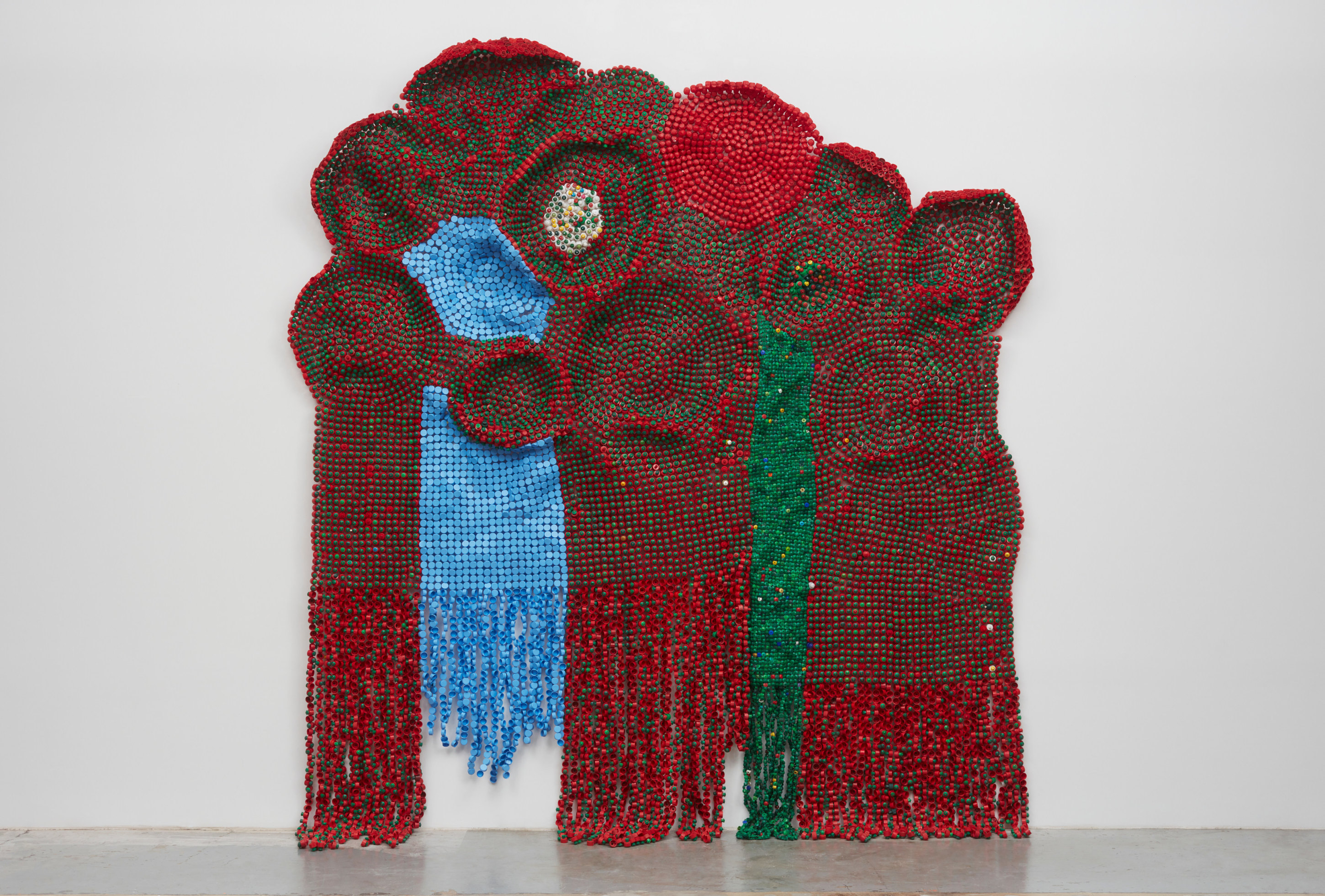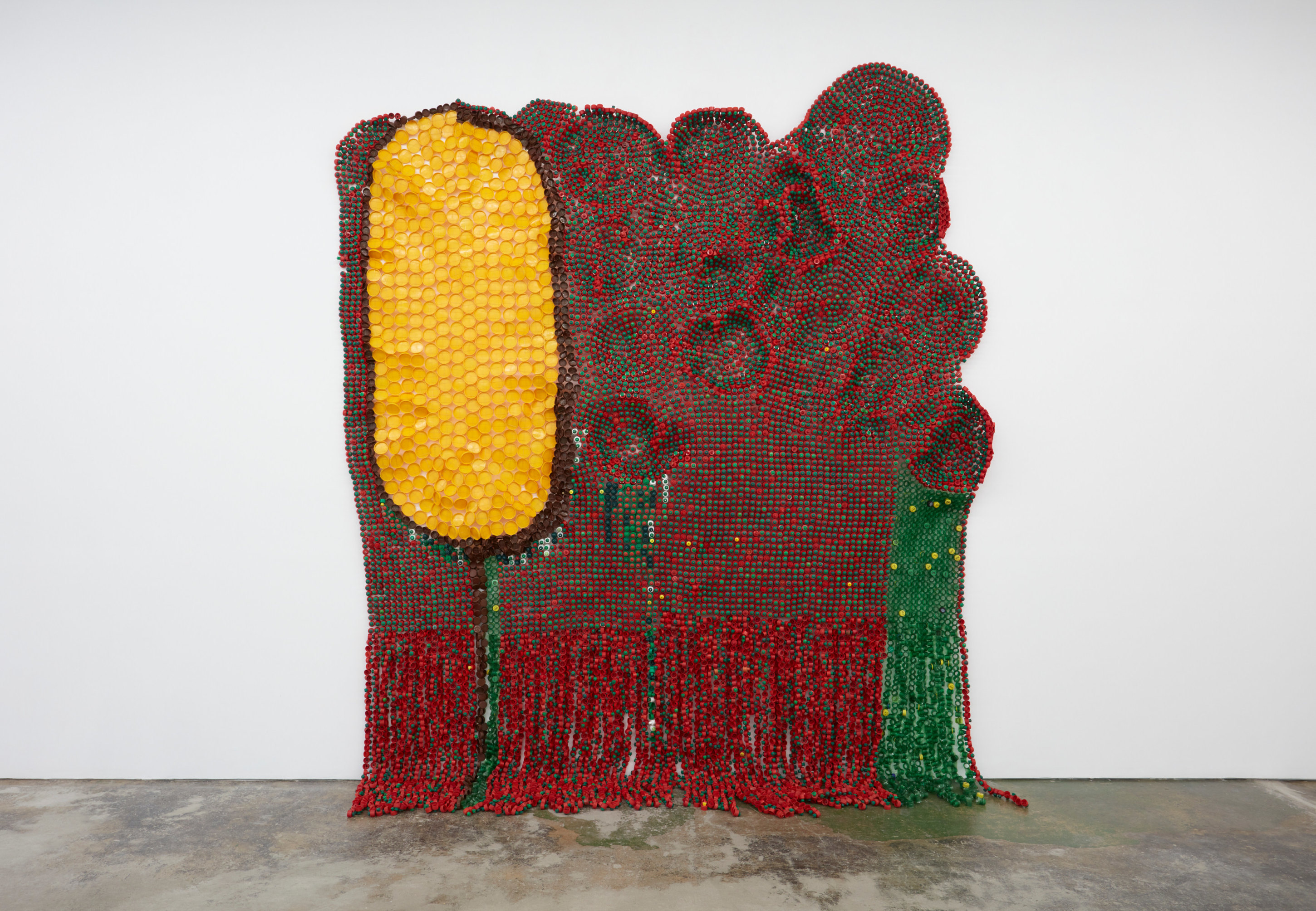 Artist Moffat Takadiwa, who lives in Harare, Zimbabwe—a city that houses one of the largest landfills in the country—mines landfills for plastic trash, much of which contains labels and logos of American brands. He then meticulously sorts and weaves together the found bottle caps, toothpaste tubes, toothbrushes, and keyboard keys into elaborate tapestries. Not only will you leave this show delighting in the stunning compositions and arrangements of these labor-intensive sculptural works, but you will also reconsider your own relationship to consumerism and plastic waste.