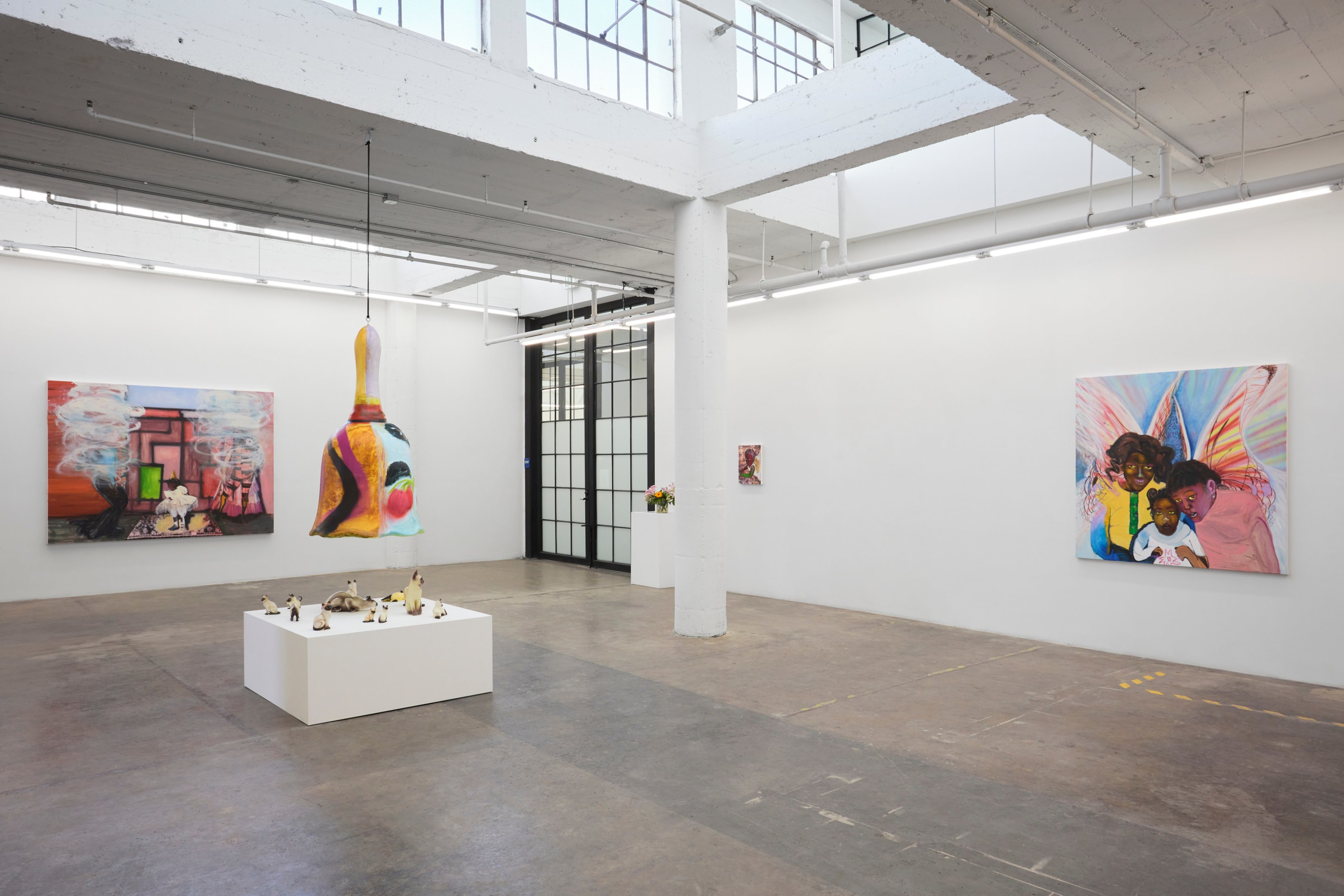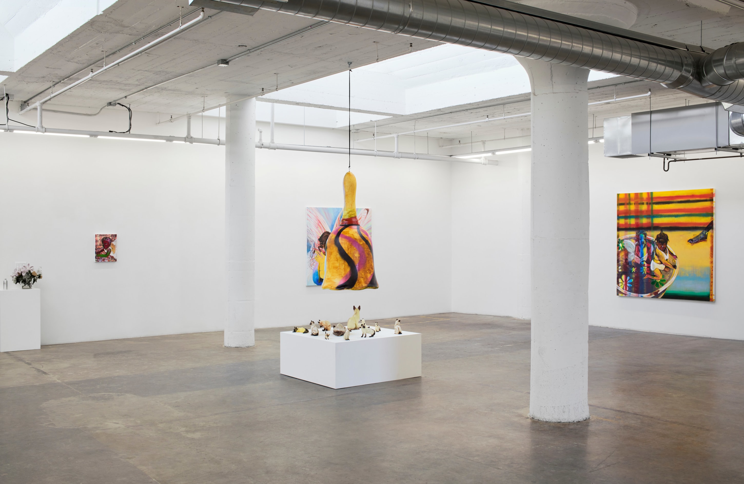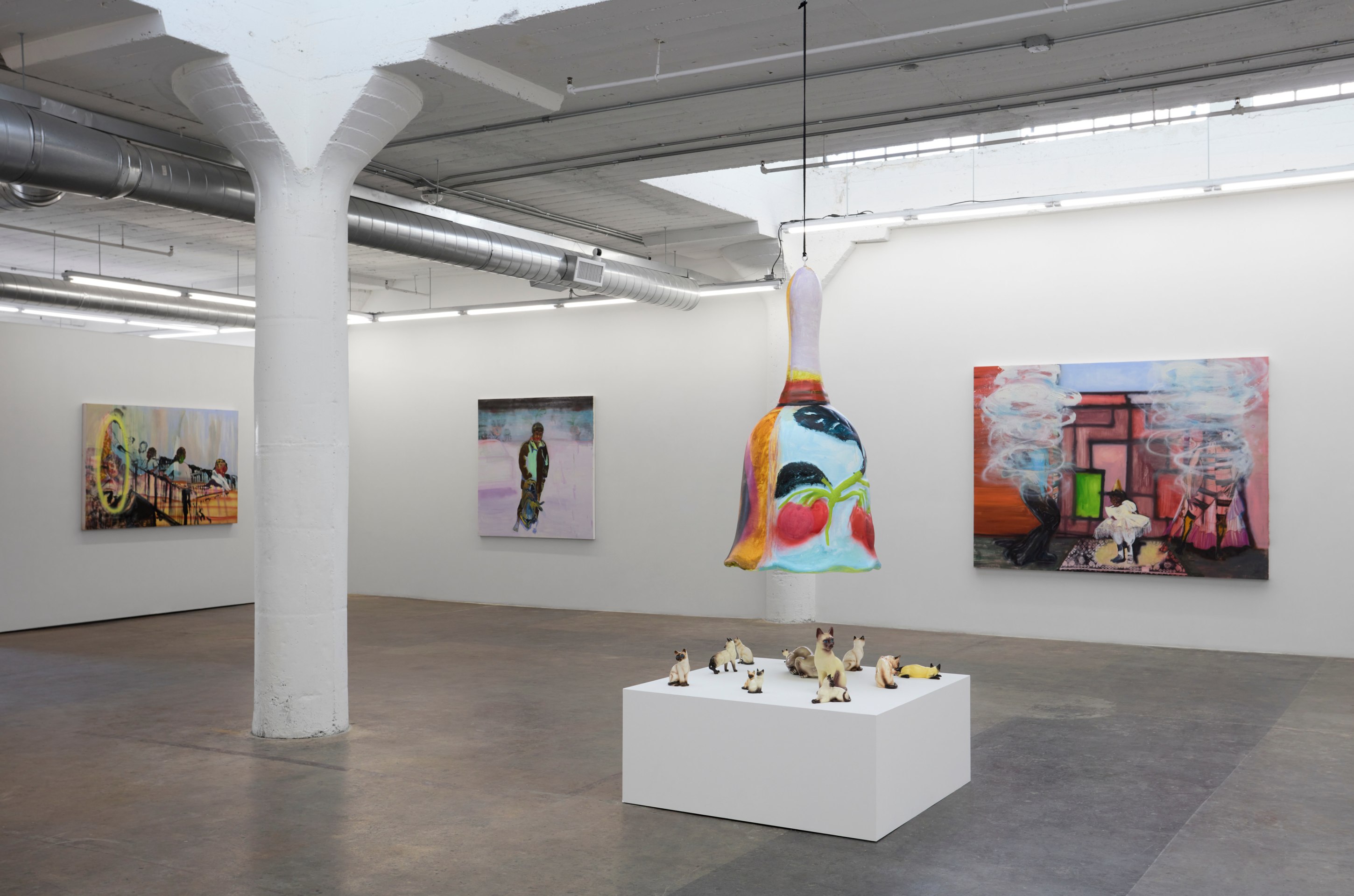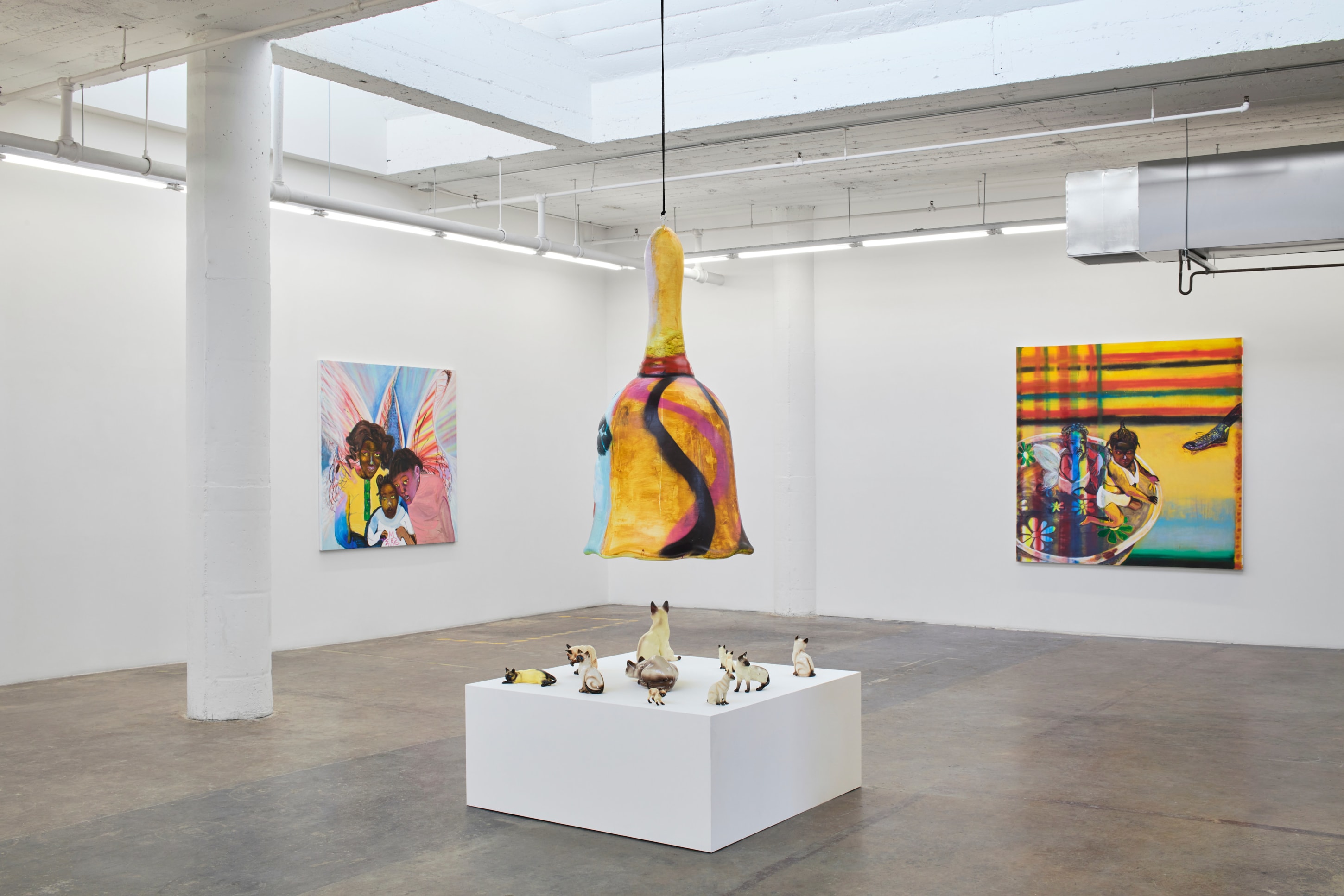At the center of the exhibition, a replica of a small bell from Romney’s personal collection is enlarged to monumental proportions and suspended from the ceiling with jute rope specific to Shibari. While the bell itself is in bondage, its voice rings free over a small herd of ceramic Siamese cats, and Nina Simone's voice enchants and expels the negative airspace. Romney’s paintings expand the walls outward, like portals into the subconscious. In ‘’The Dance,” 2021, a childlike figure is center stage as two phantasmic elders boogie and shuffle into a glittery oblivion. Gestures of evolution and devolution are highlighted amongst bold brush strokes, spray painted lace, and references to the photographic. With “Wiped Down (nite nite),” 2021, a burst of white paint circled in yellow confuses the layered figures’ relationships to their respective environments.