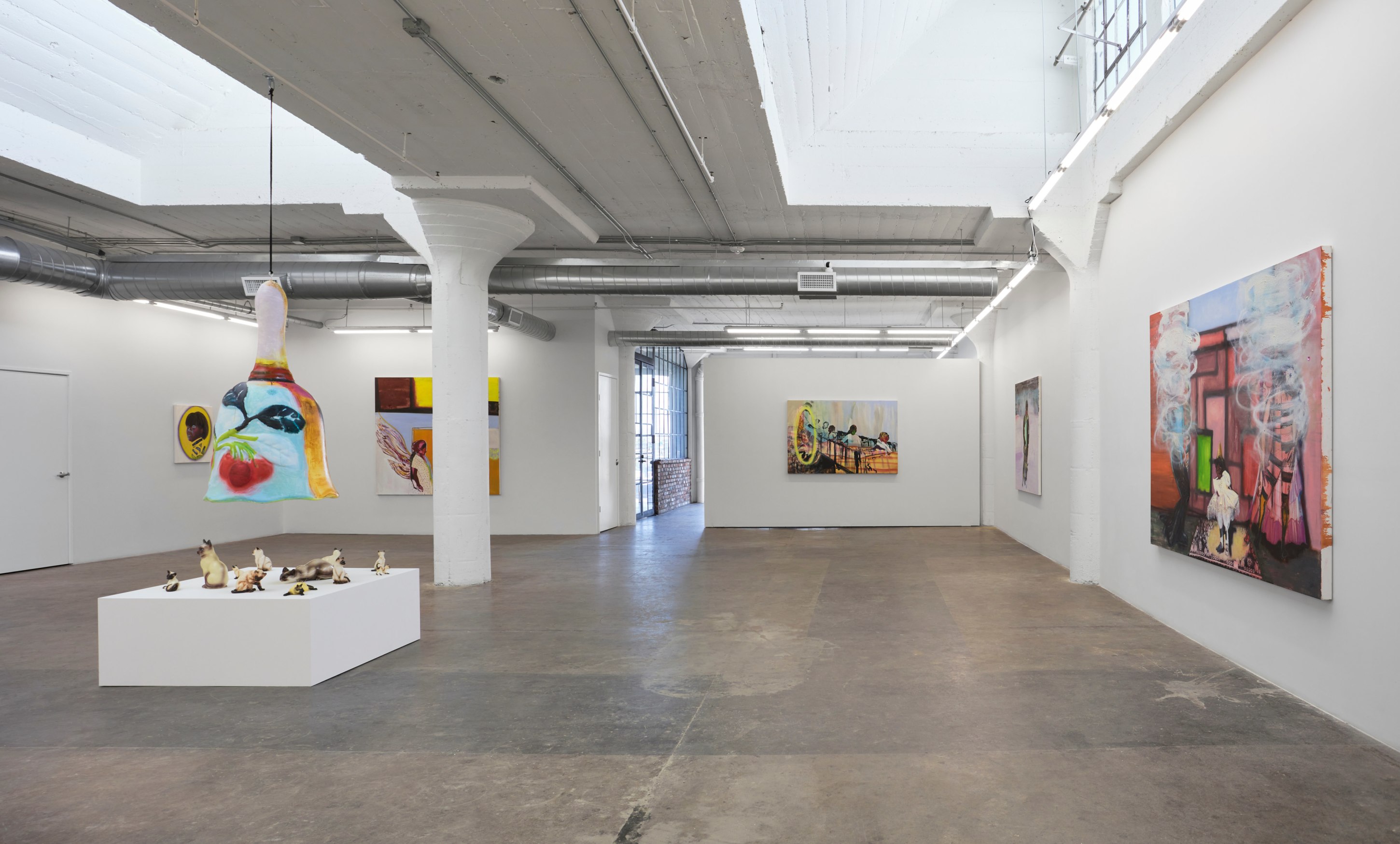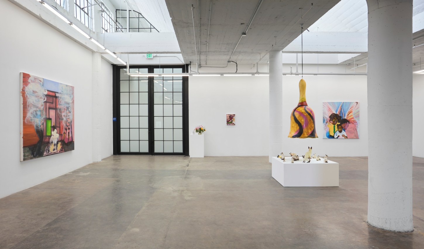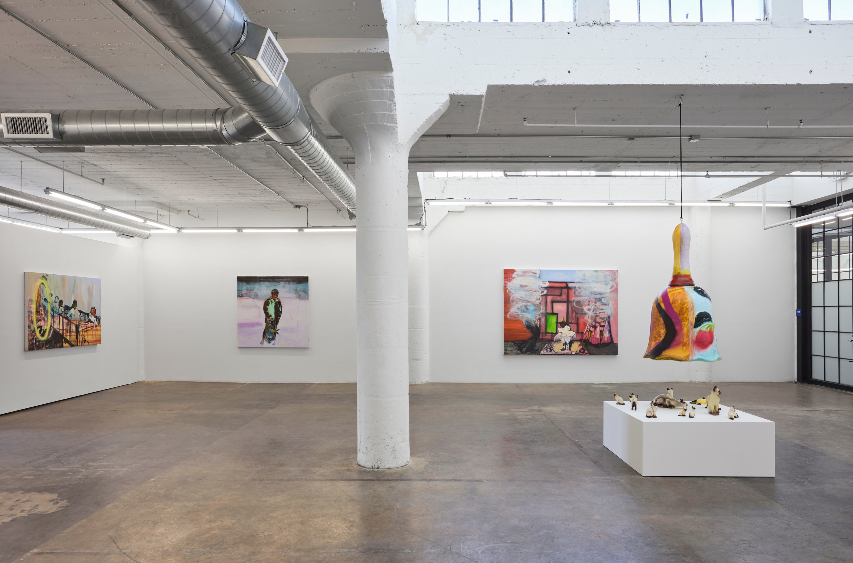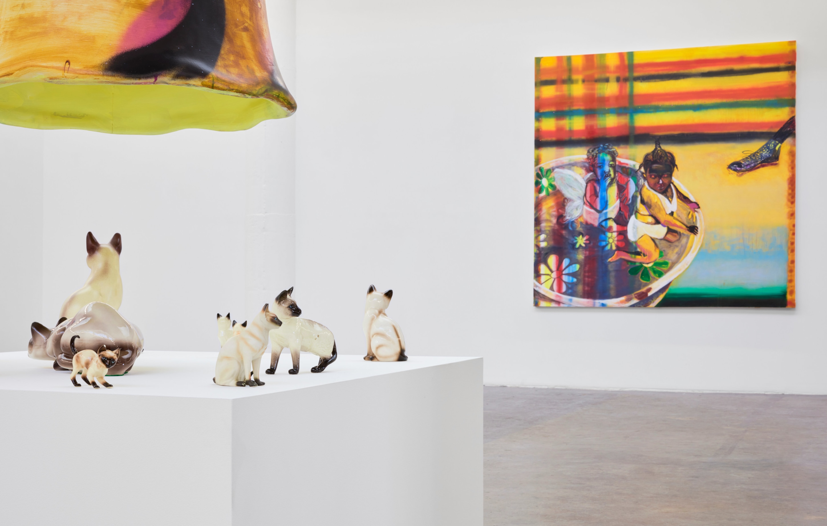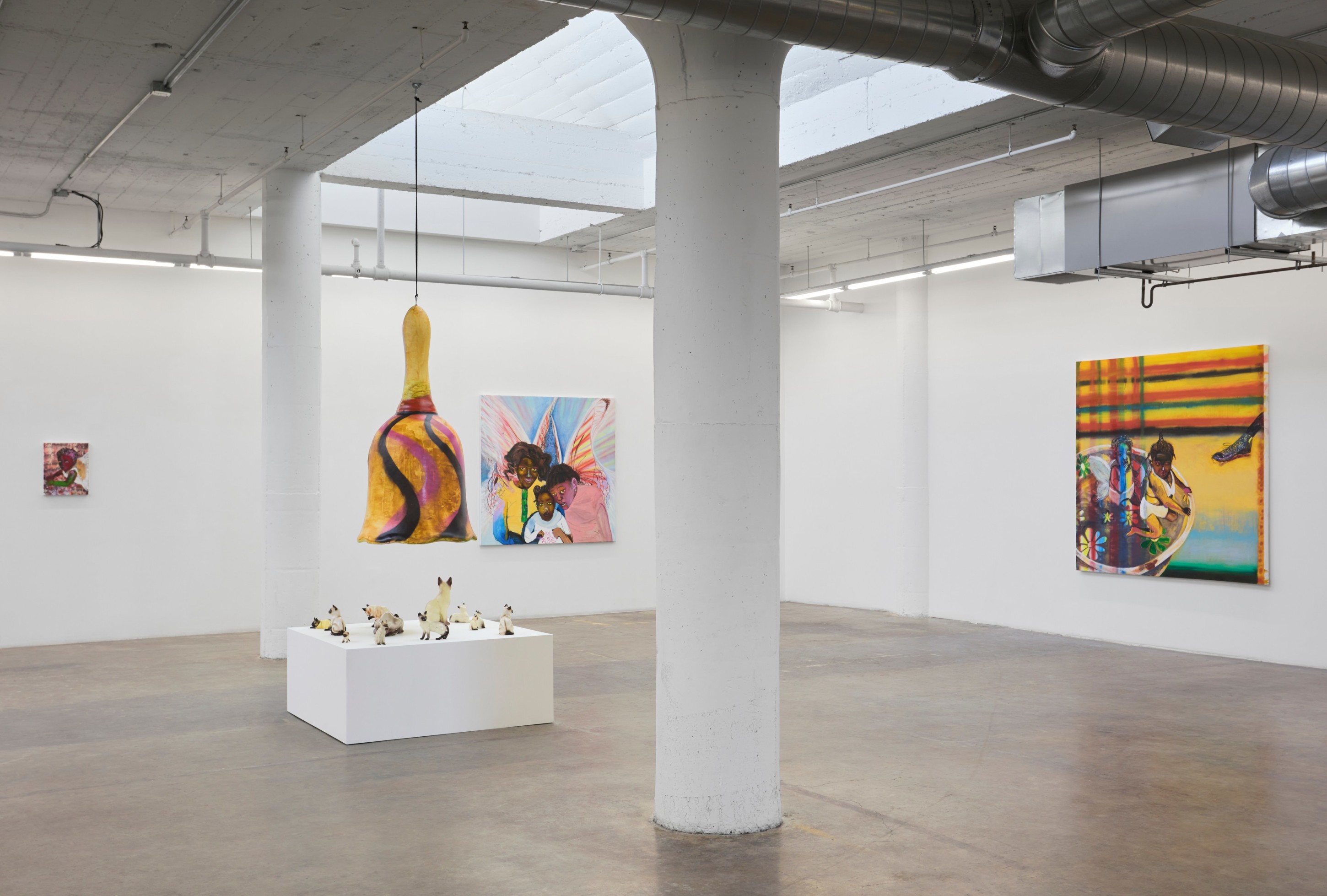 At the center of the exhibition, a replica of a small bell from Romney’s personal collection is enlarged to monumental proportions and suspended from the ceiling with jute rope specific to Shibari. While the bell itself is in bondage, its voice rings free over a small herd of ceramic Siamese cats, and Nina Simone's voice enchants and expels the negative airspace. Romney’s paintings expand the walls outward, like portals into the subconscious. In ‘’The Dance,” 2021, a childlike figure is center stage as two phantasmic elders boogie and shuffle into a glittery oblivion. Gestures of evolution and devolution are highlighted amongst bold brush strokes, spray painted lace, and references to the photographic. With “Wiped Down (nite nite),” 2021, a burst of white paint circled in yellow confuses the layered figures’ relationships to their respective environments.
