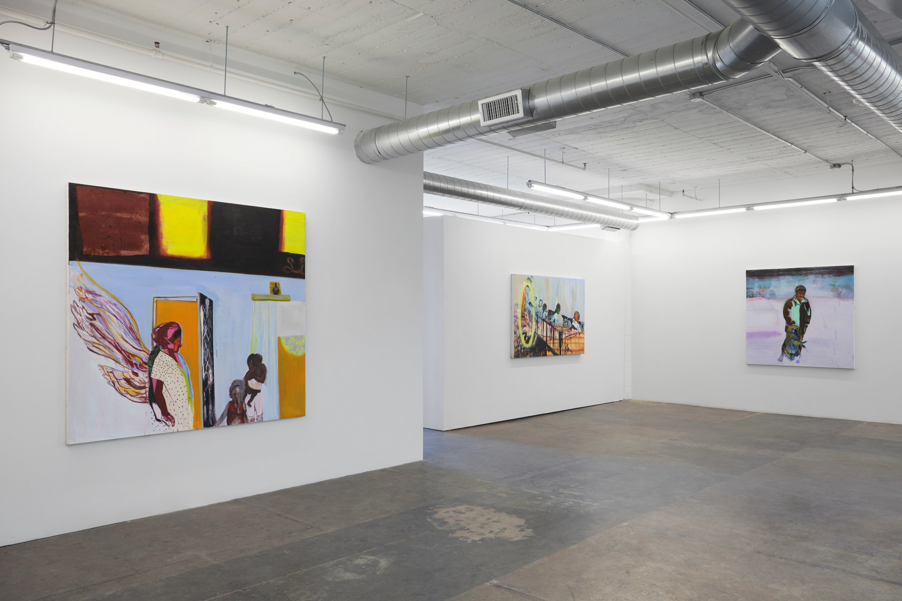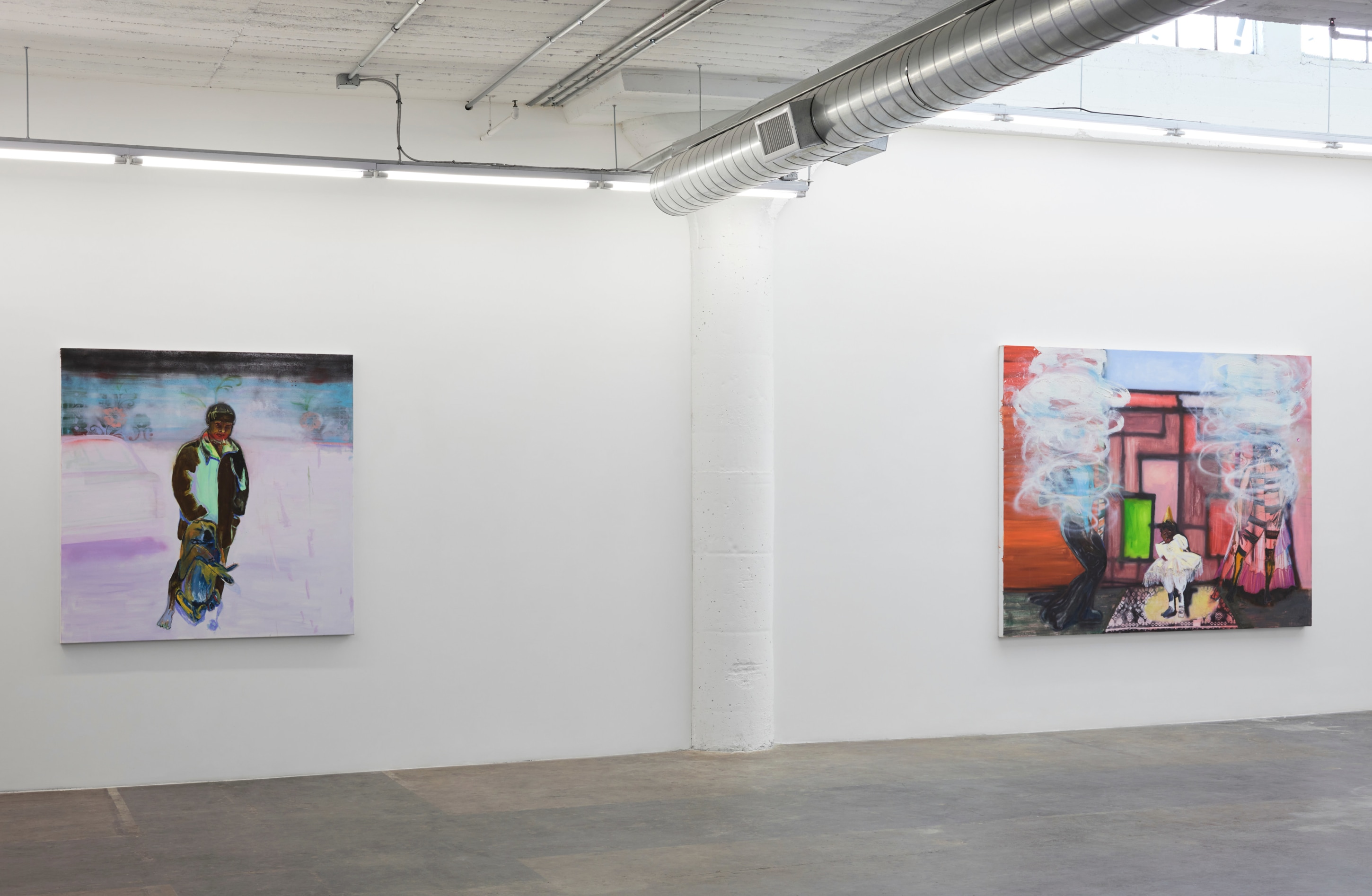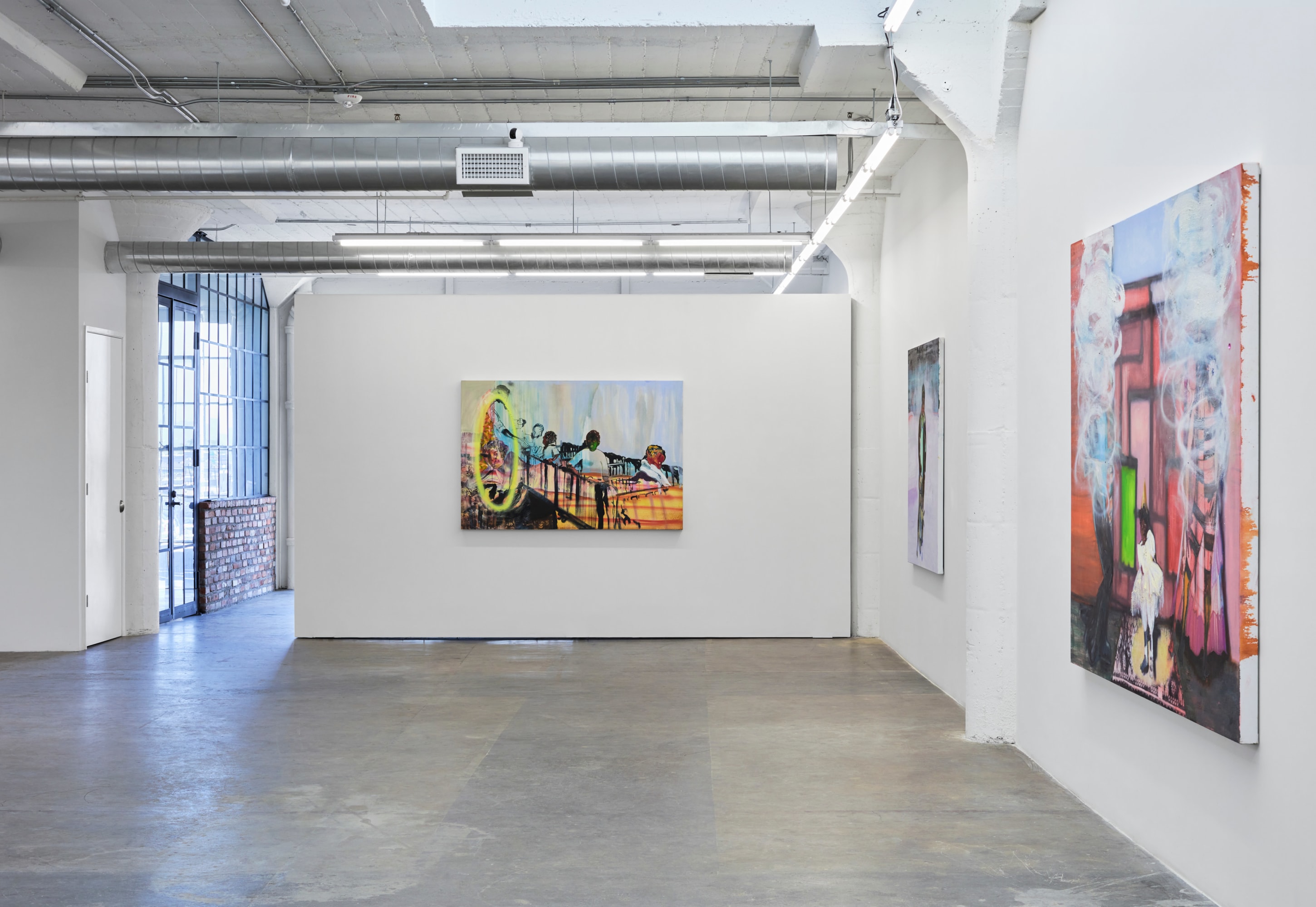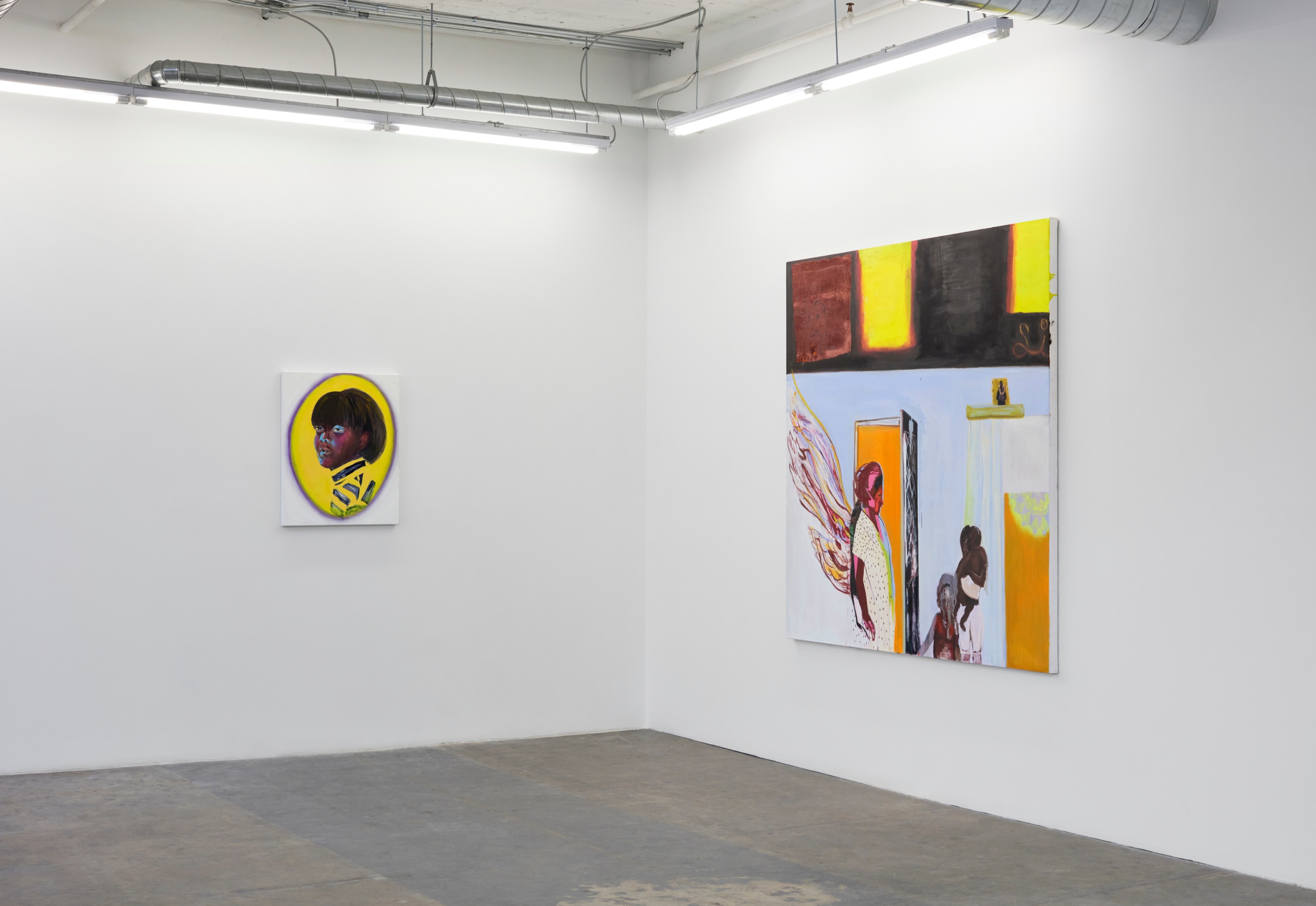 At the center of the exhibition, a replica of a small bell from Romney’s personal collection is enlarged to monumental proportions and suspended from the ceiling with jute rope specific to Shibari. While the bell itself is in bondage, its voice rings free over a small herd of ceramic Siamese cats, and Nina Simone's voice enchants and expels the negative airspace. Romney’s paintings expand the walls outward, like portals into the subconscious. In ‘’The Dance,” 2021, a childlike figure is center stage as two phantasmic elders boogie and shuffle into a glittery oblivion. Gestures of evolution and devolution are highlighted amongst bold brush strokes, spray painted lace, and references to the photographic. With “Wiped Down (nite nite),” 2021, a burst of white paint circled in yellow confuses the layered figures’ relationships to their respective environments.
