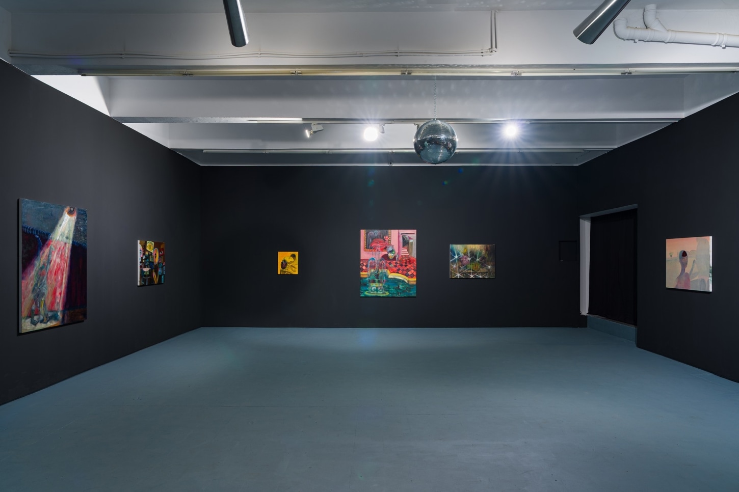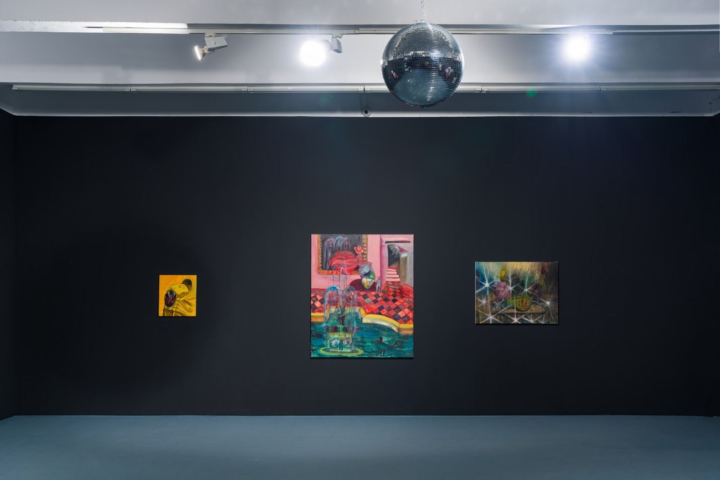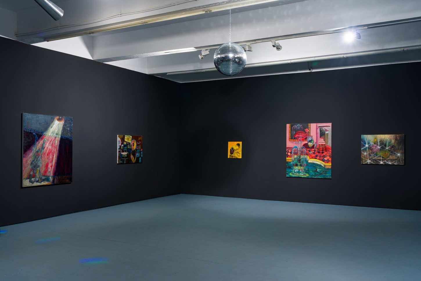 survival research laboratory (2022), the largest and most vibrant work in the show, features two disco balls hanging low in front of a performance stage. The time and place are unknown but somehow feels familiar. The nostalgia is so palpable that even if you know you've never been in a room quite like it, you can imagine it with clarity. It is this ability to bring the viewer in for a closer look where Romney draws on their artistic strength of worldbuilding. In turnturnturnturn, Romney presents their most experimental paintings to date.