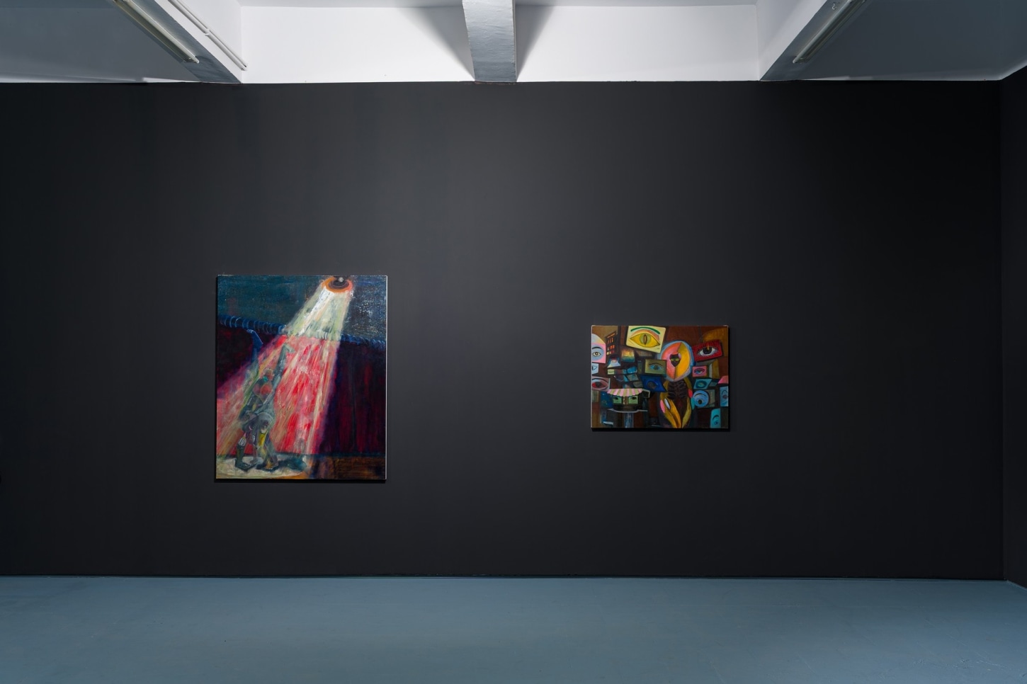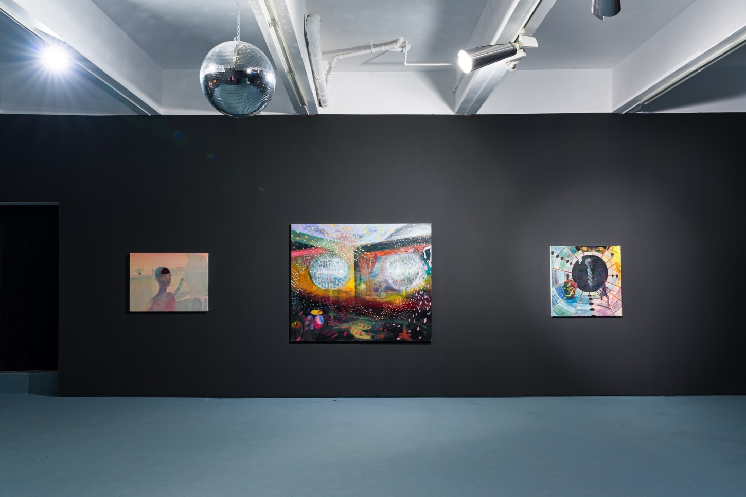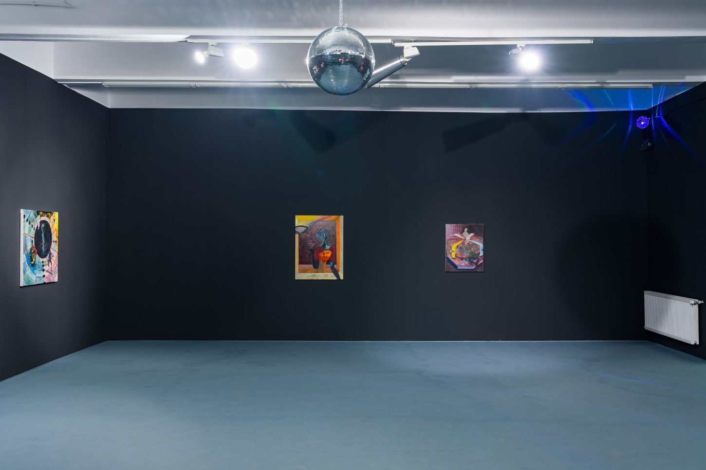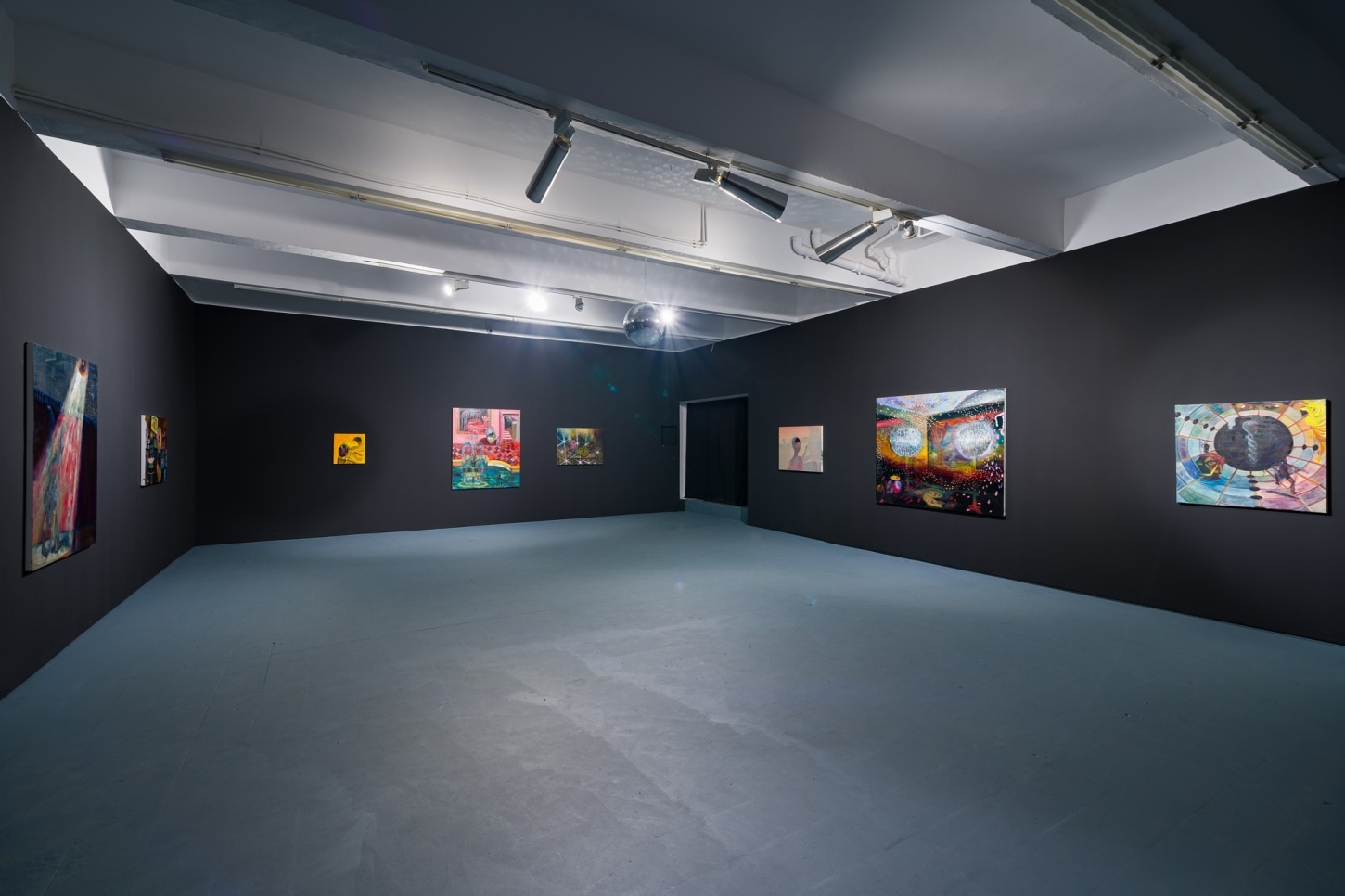 survival research laboratory (2022), the largest and most vibrant work in the show, features two disco balls hanging low in front of a performance stage. The time and place are unknown but somehow feels familiar. The nostalgia is so palpable that even if you know you've never been in a room quite like it, you can imagine it with clarity. It is this ability to bring the viewer in for a closer look where Romney draws on their artistic strength of worldbuilding. In turnturnturnturn, Romney presents their most experimental paintings to date.