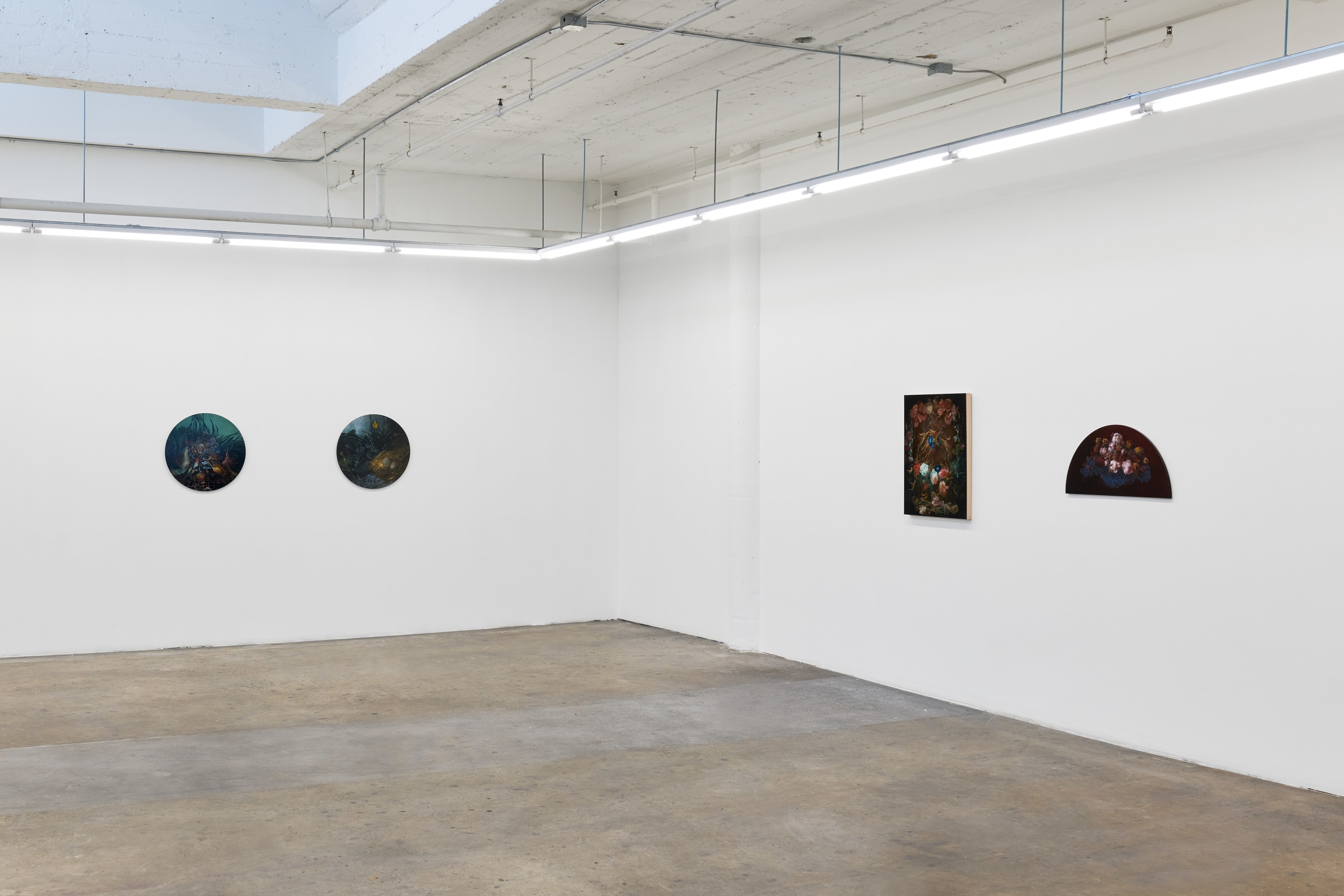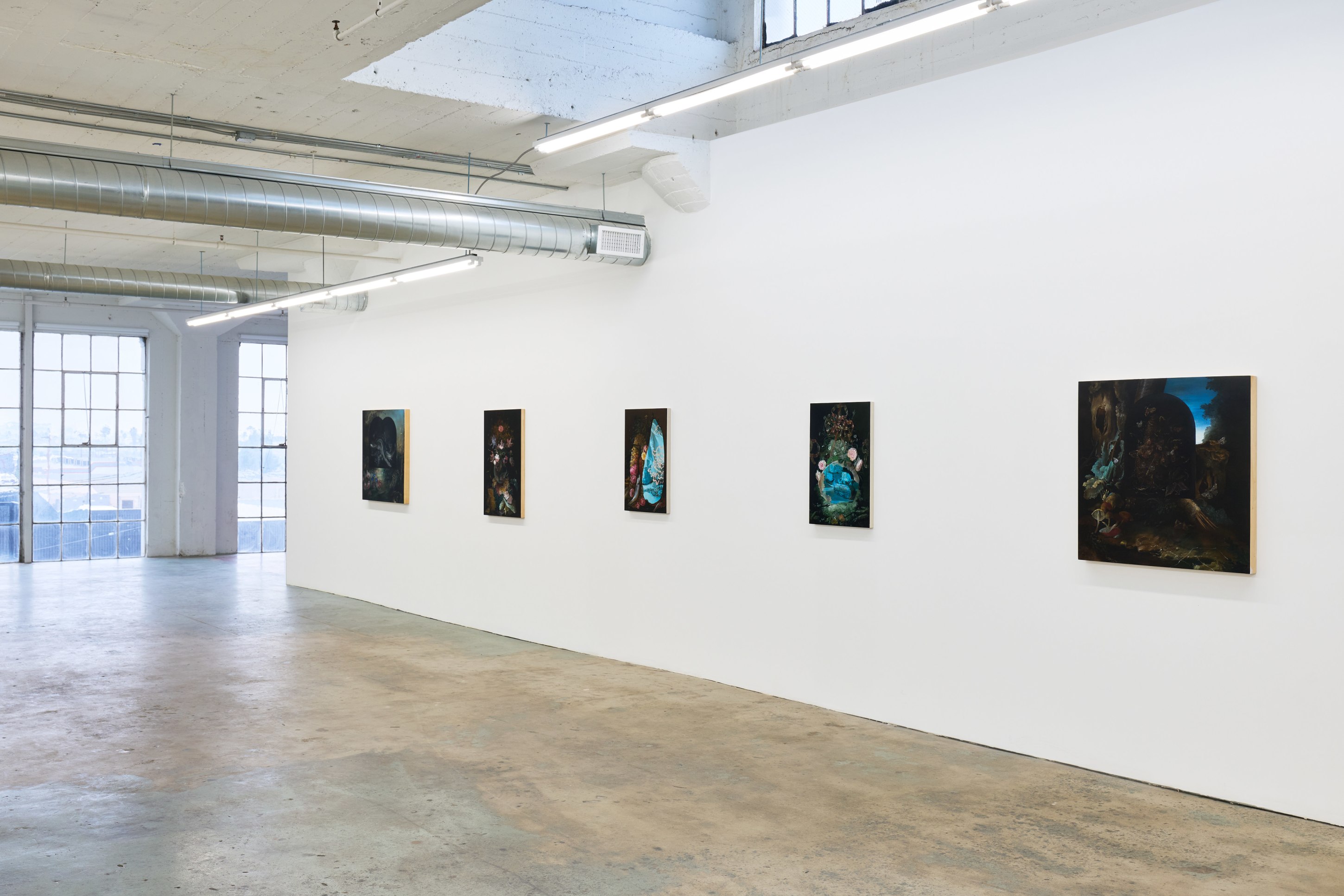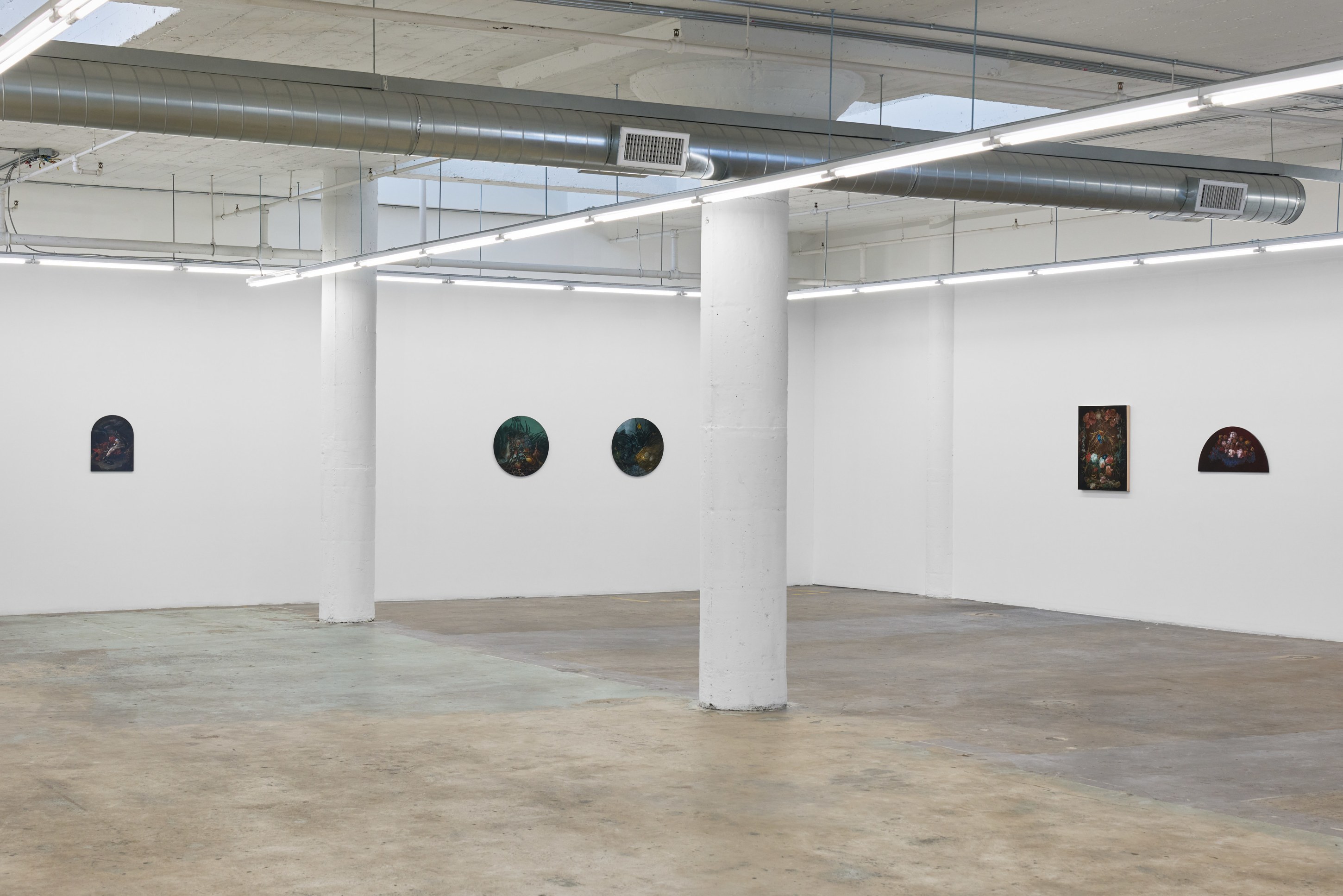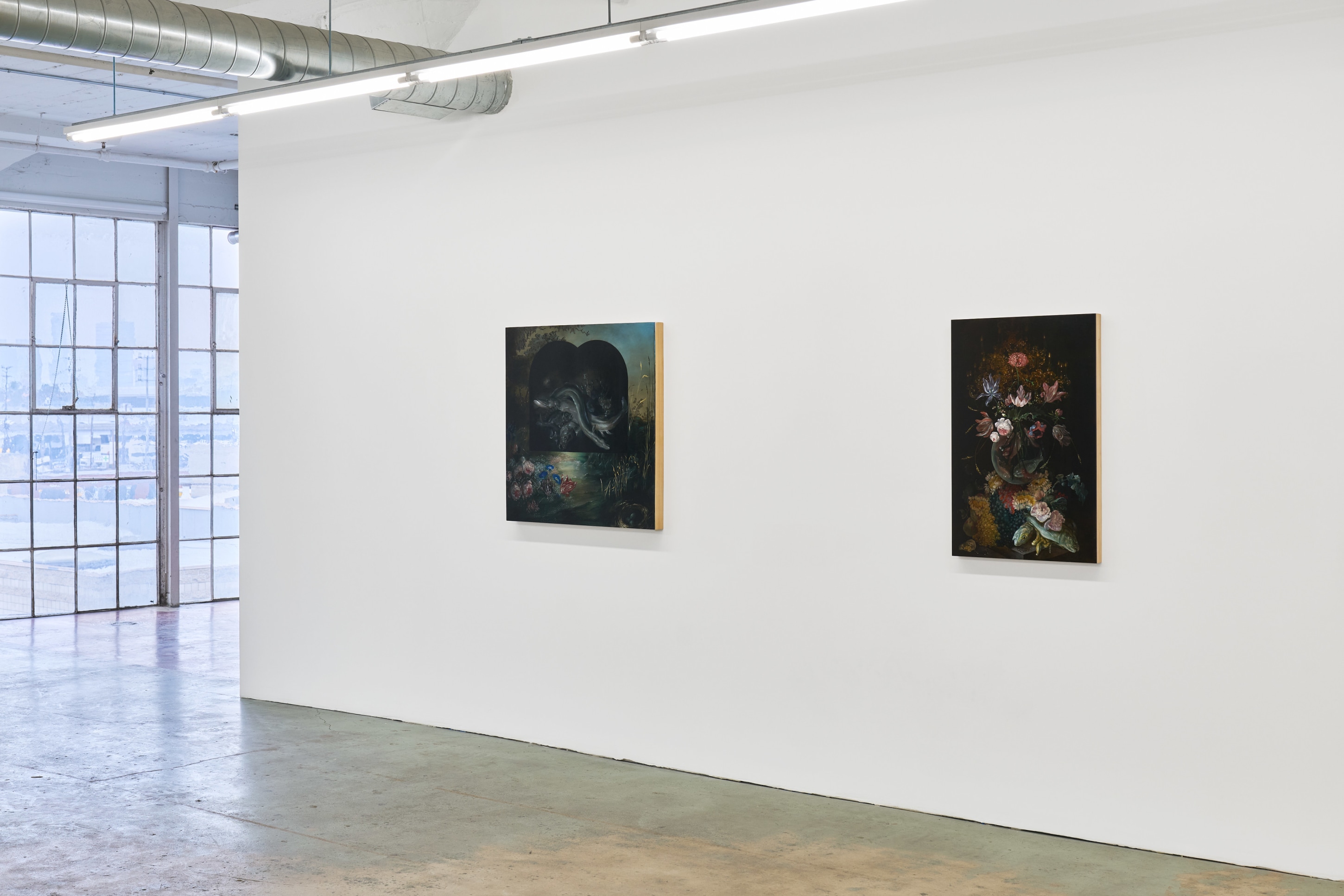 Duennebier’s paintings glimmer out of darkness like hyperreal omens from a dreamlike past. Flowers and decay spill forth in uncanny dioramas that marry the still life traditions of the Dutch Old Masters with personal narratives of dread, change, and encounters with wildlife. Carefully rendered in acrylic and glaze, each work oscillates wildly between the historical and the personal, vitality and ruin, and desire and disgust. Stylistically, Duennebier’s paintings blur the line between observation and ornamentation. In Still Life with Benthic Species and Fish, for example, shellfish sprawl in a glistening heap, at once study and highly ornate spectacle.