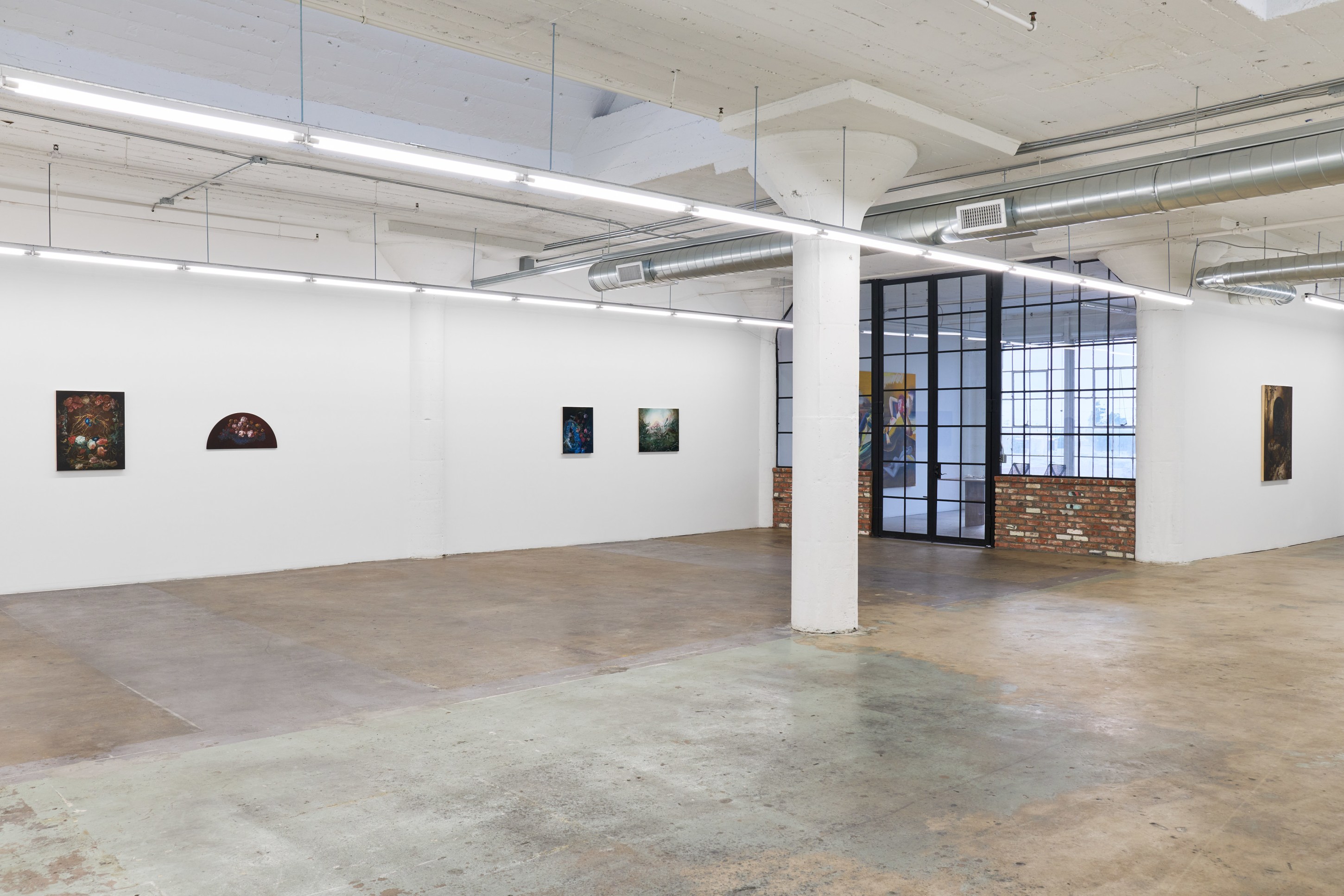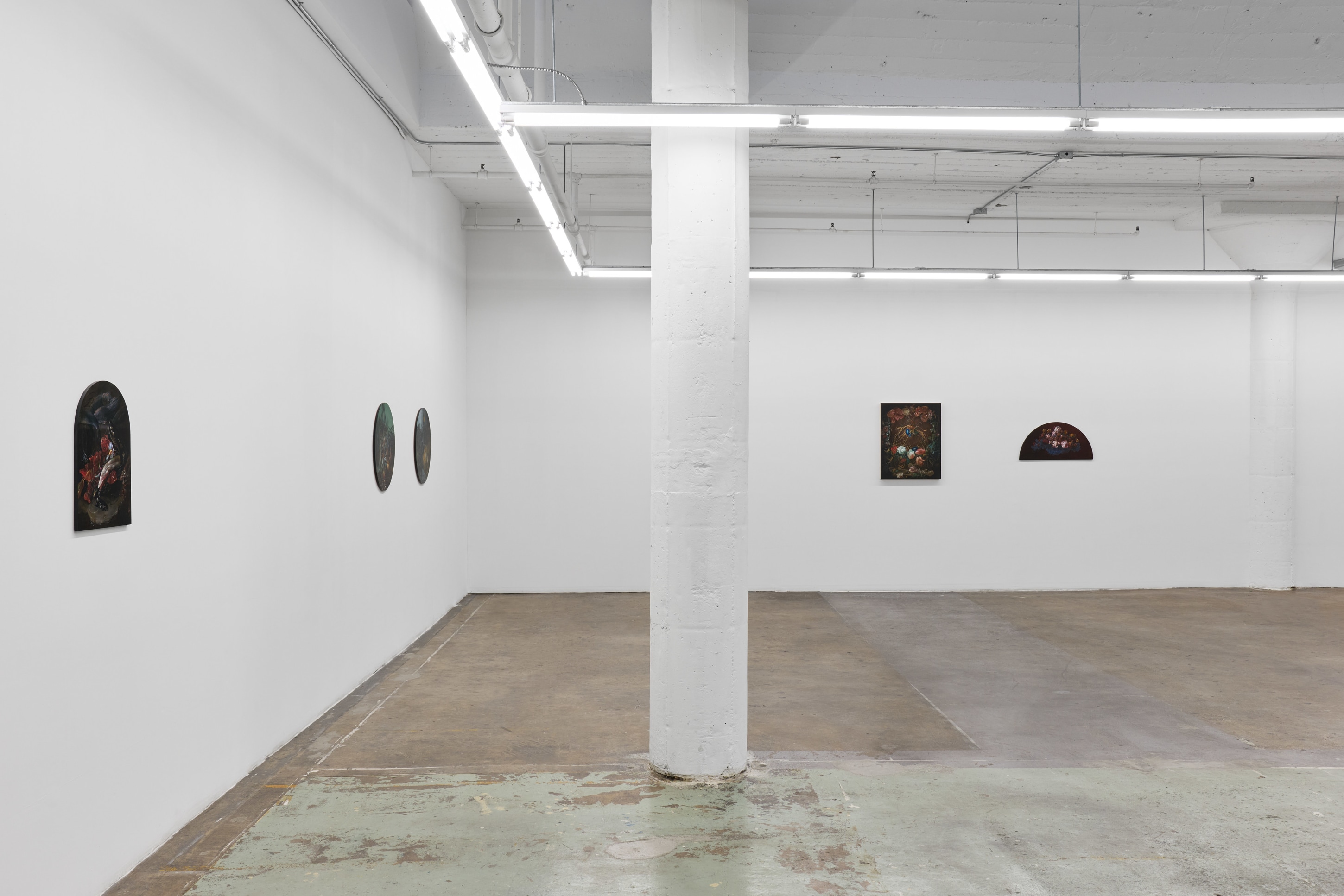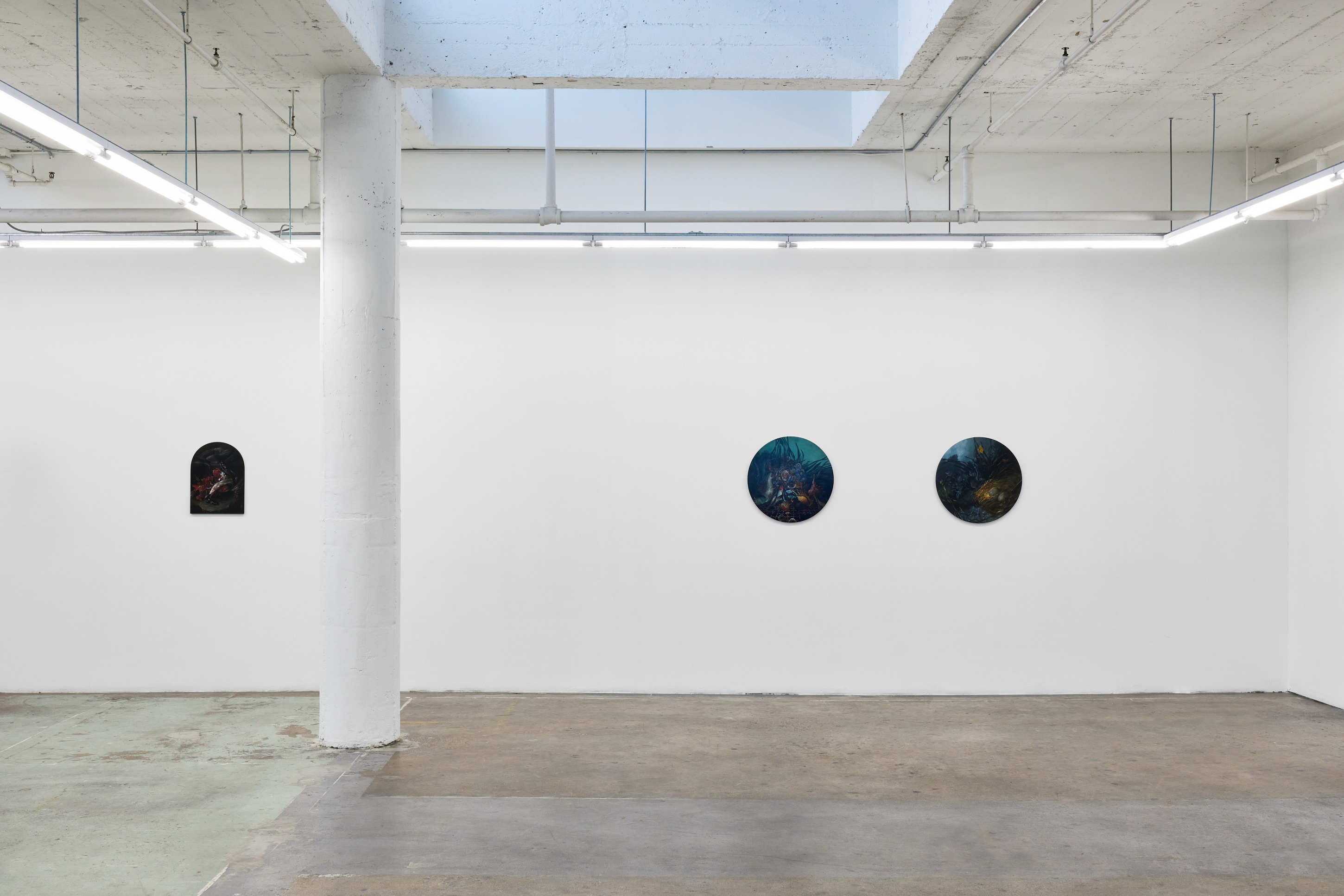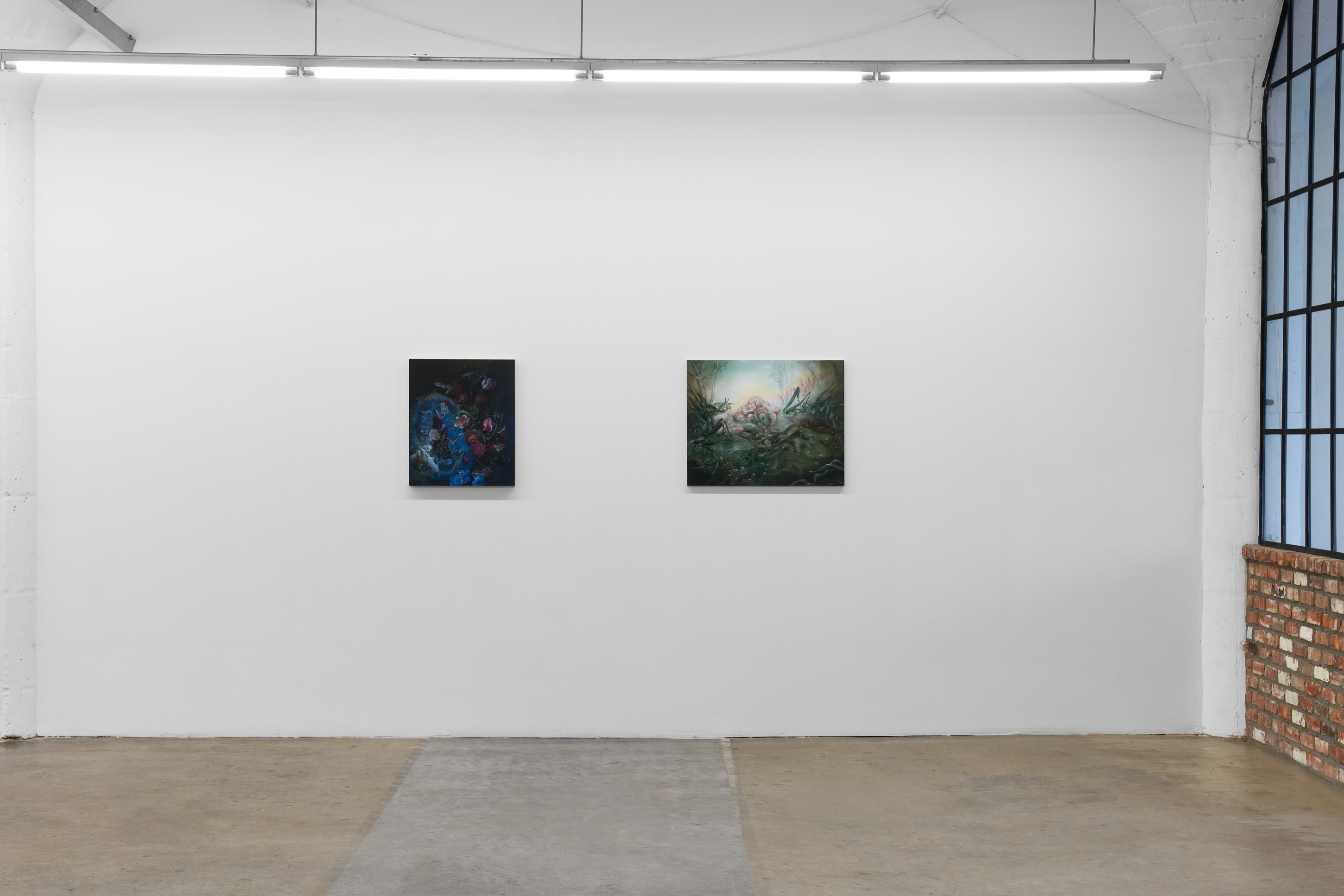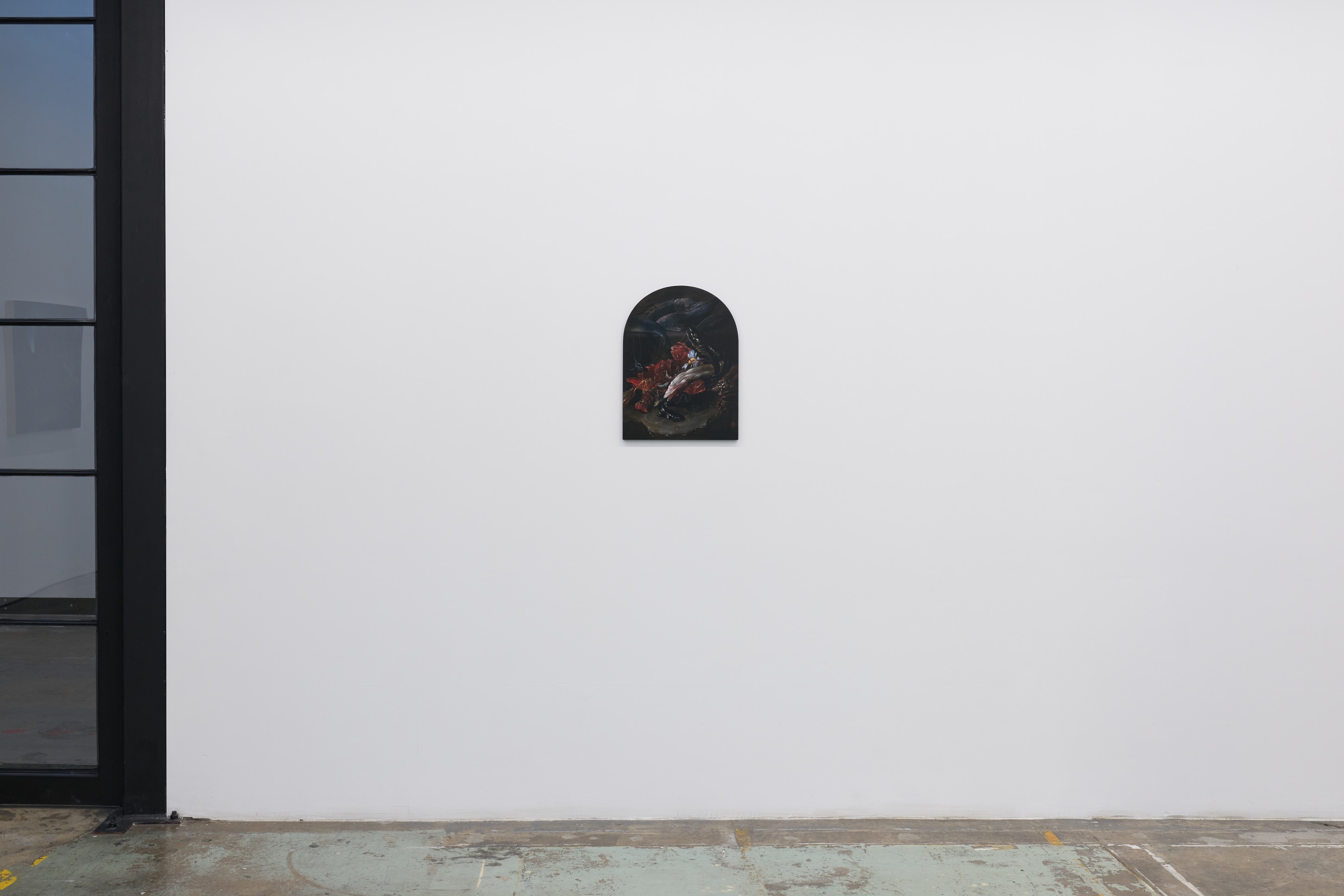 Duennebier’s paintings glimmer out of darkness like hyperreal omens from a dreamlike past. Flowers and decay spill forth in uncanny dioramas that marry the still life traditions of the Dutch Old Masters with personal narratives of dread, change, and encounters with wildlife. Carefully rendered in acrylic and glaze, each work oscillates wildly between the historical and the personal, vitality and ruin, and desire and disgust. Stylistically, Duennebier’s paintings blur the line between observation and ornamentation. In Still Life with Benthic Species and Fish, for example, shellfish sprawl in a glistening heap, at once study and highly ornate spectacle.