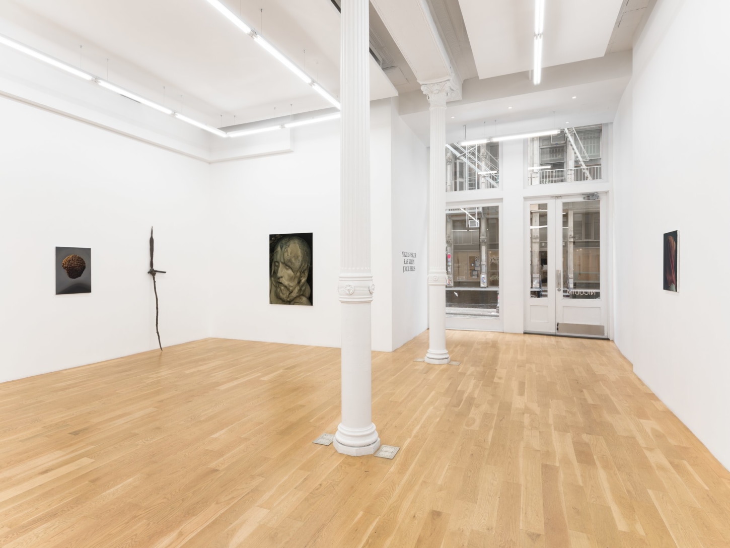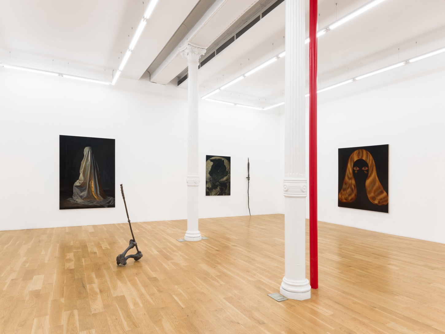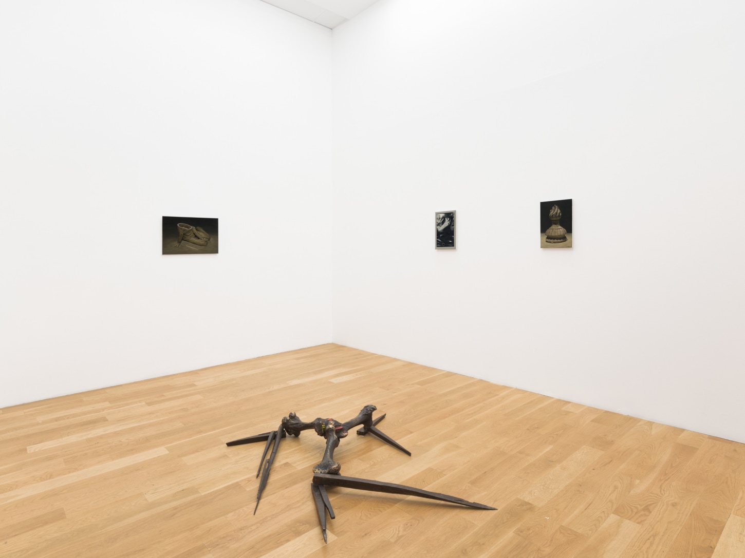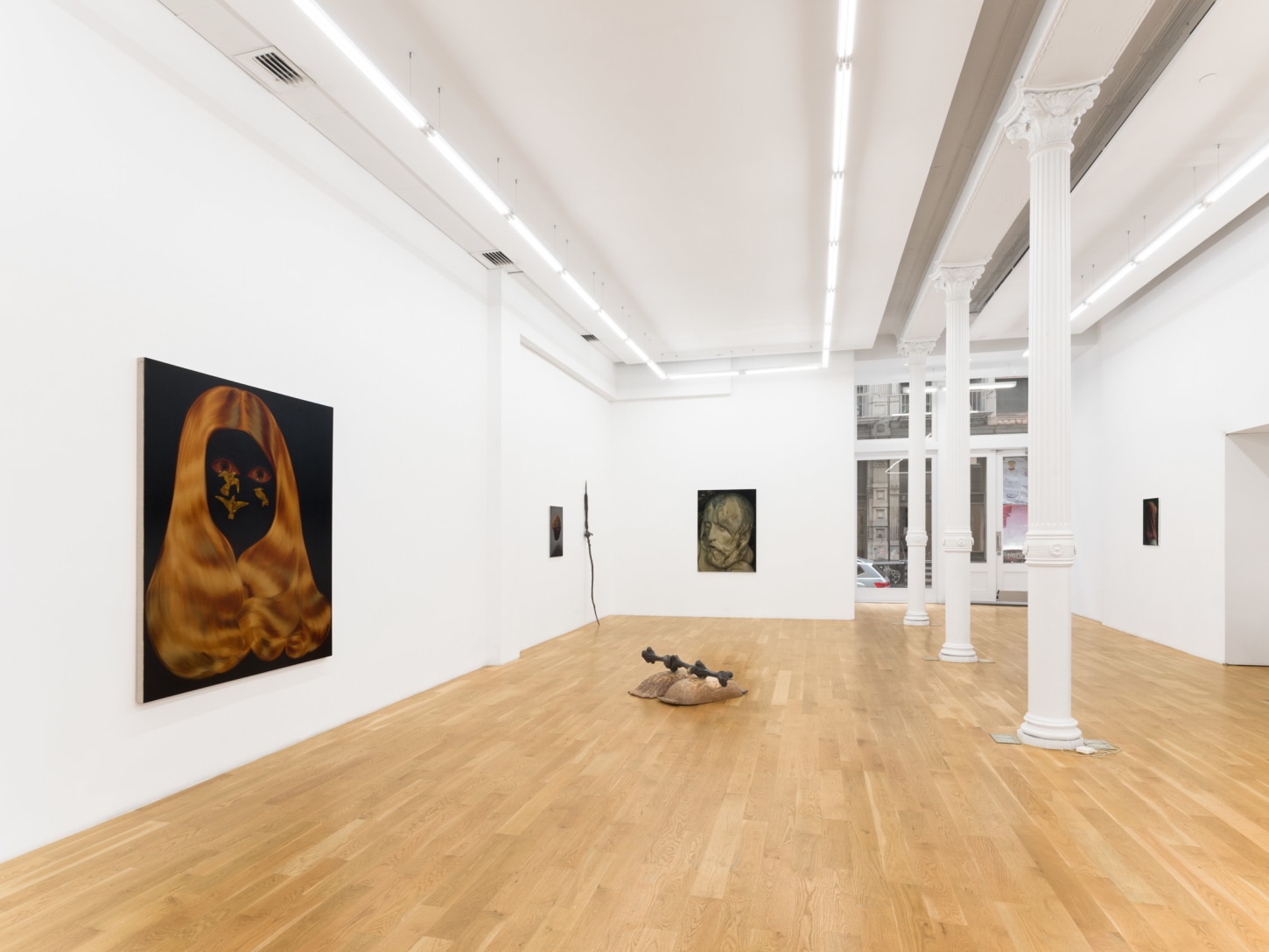 Niklas Asker, Rae Klein, Jorge Peris is an exhibition of artists whose practices filter and funnel the aforementioned informational acid hurricane into consumable portions that foster new understandings. Each artist’s voice and methodology is unique, yet complementary to the others. Niklas Asker applies an even-handed emotional logic to personal triumphs and traumas, focusing a singular, steady spotlight on compositions reckoning with the death of a loved one, his wife’s pregnancy, and the search for meaning and beauty through it all in equal parts allegory and representation. A pearl, a ball of light within a skull, a warm glow shining from within a bedsheet become eternal iterations of the same hopeful mantra. Rae Klein’s visual vocabulary isolates references to mankind’s attempts to assert its mastery over the feral world through fear, power, spirituality, or some combination of the three. A monumentally-scaled Maltese swimming in so much of its own perfectly coiffed fur that its mobility is seriously impeded, if not impossible, is both a lullaby to the feral world, and an acknowledgement of man’s place within the hierarchy of species: look what we did to the wolf! Finally, Jorge Peris’s sculptures comprise a collaboration between his body, the natural world, and the voices inside his head. Cattle femurs cast in bronze become everlasting reminders of the impermanence of flesh and the foundations for new structures and systems of perception.