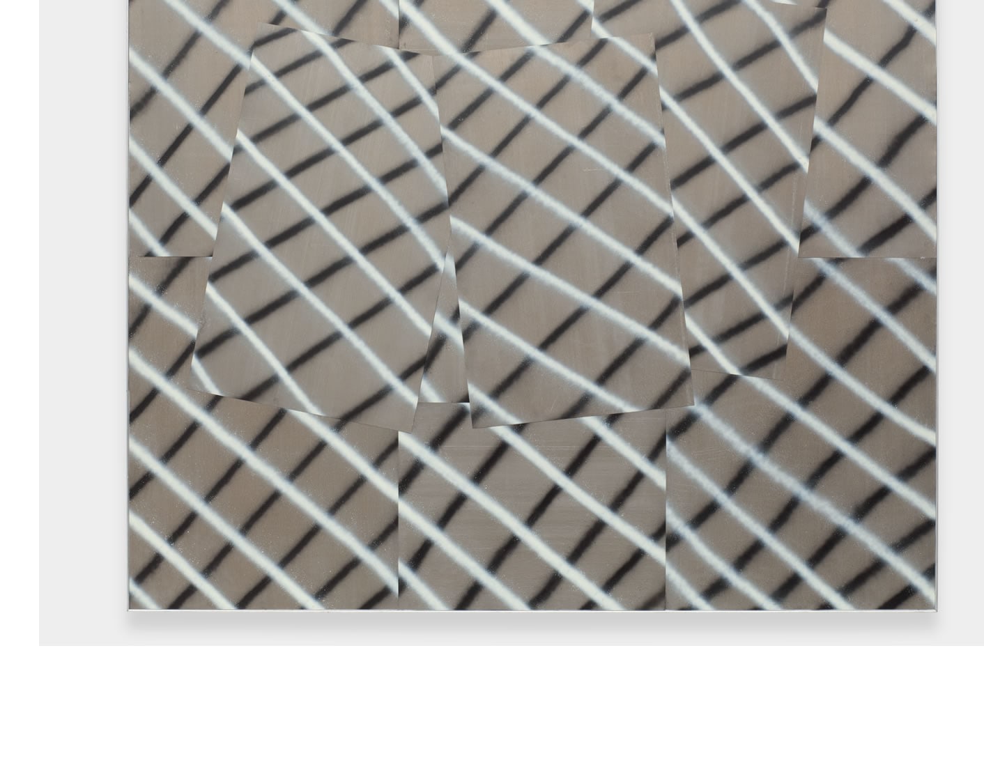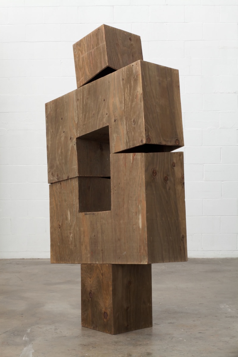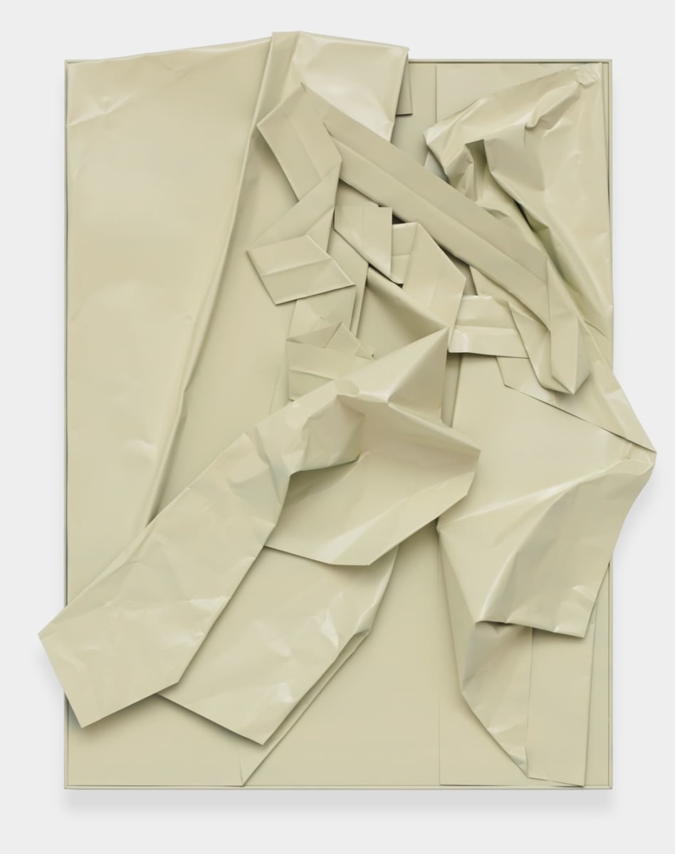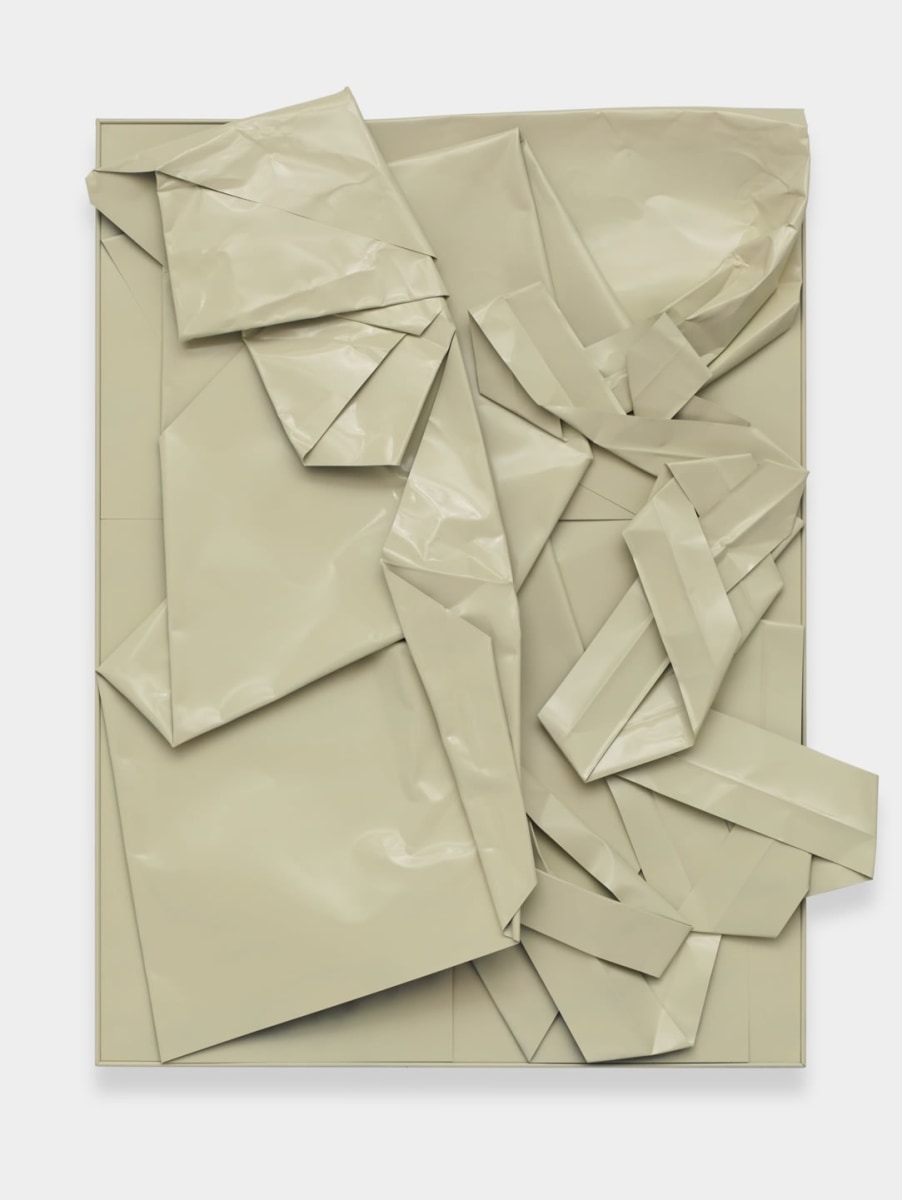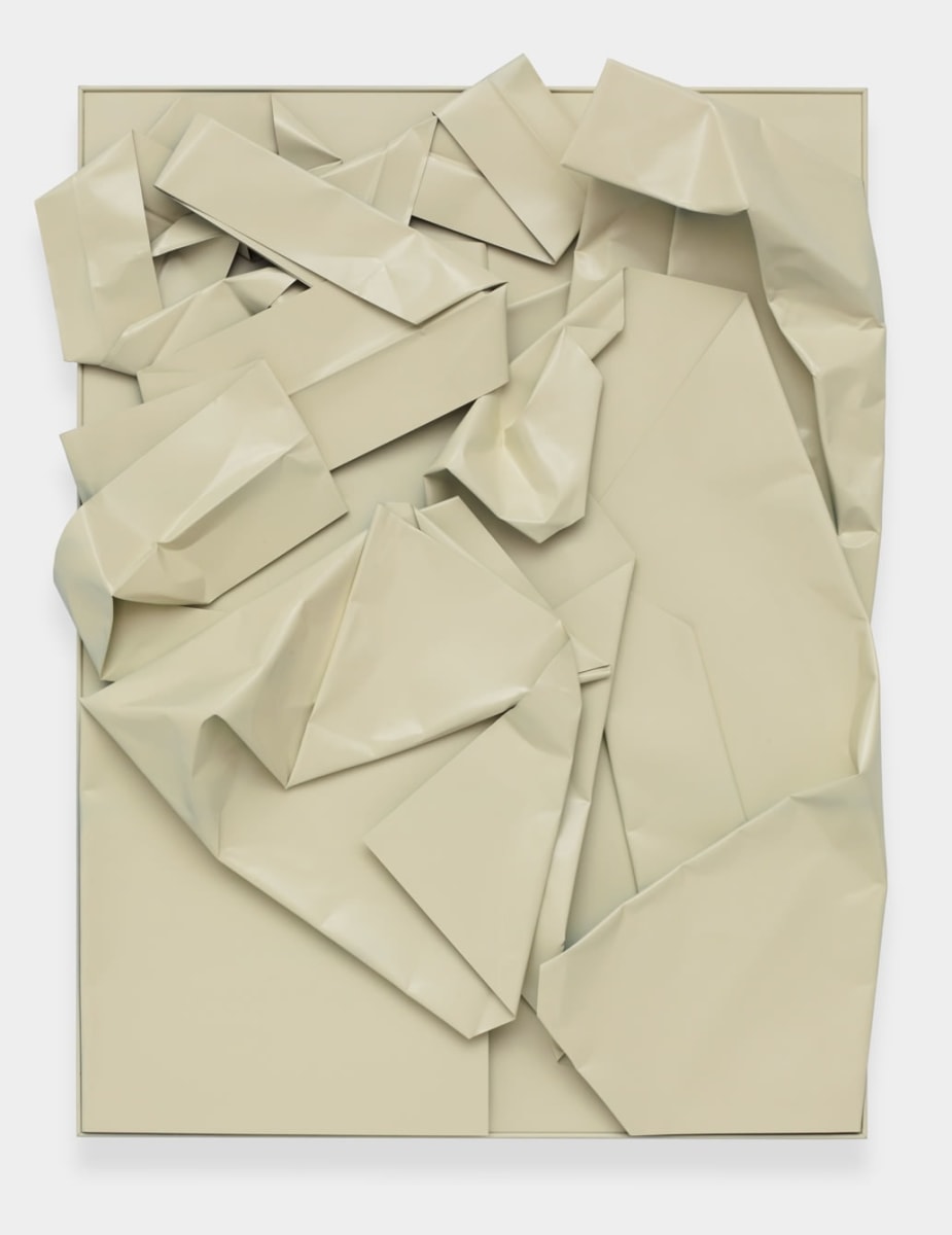 The ‘cut’ has numerous incarnations within Wagner’s new exhibition, the architecture of his surfaces dismantling traditional conceptions of the additive. Wagner’s metal ‘paintings’, collaged cut-outs of spray-painted steel, have a totality and veneer which genuflect more to the act of reconstruction than deconstruction. The formalism of these warped edifices are mimicked in his surrounding sculptures wherein steel-meets-wood democratically. Alongside the hanging metal works, Wagner exhibits six small wooden tables whose faces are decoratively ingrained with a styled optic patterning.