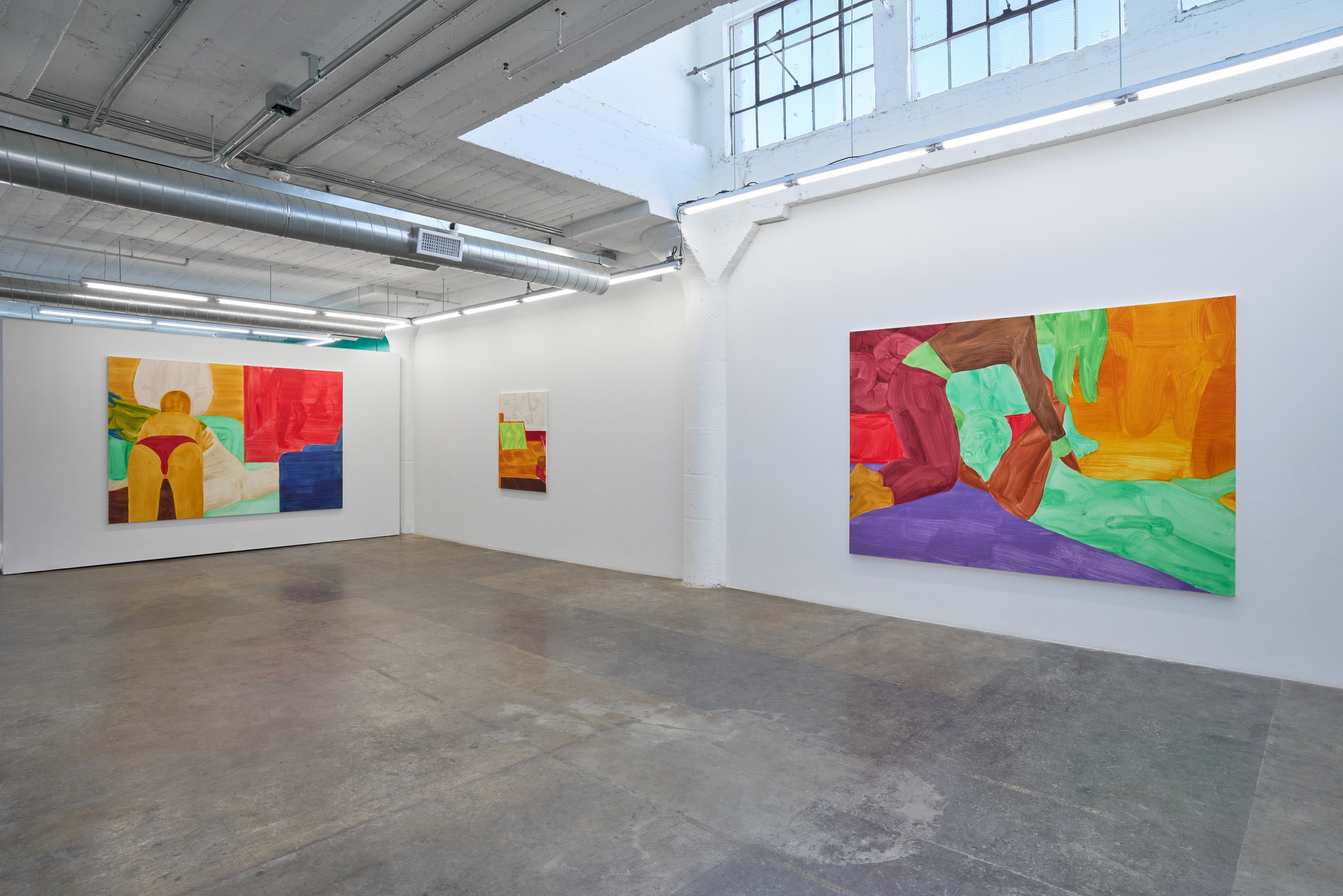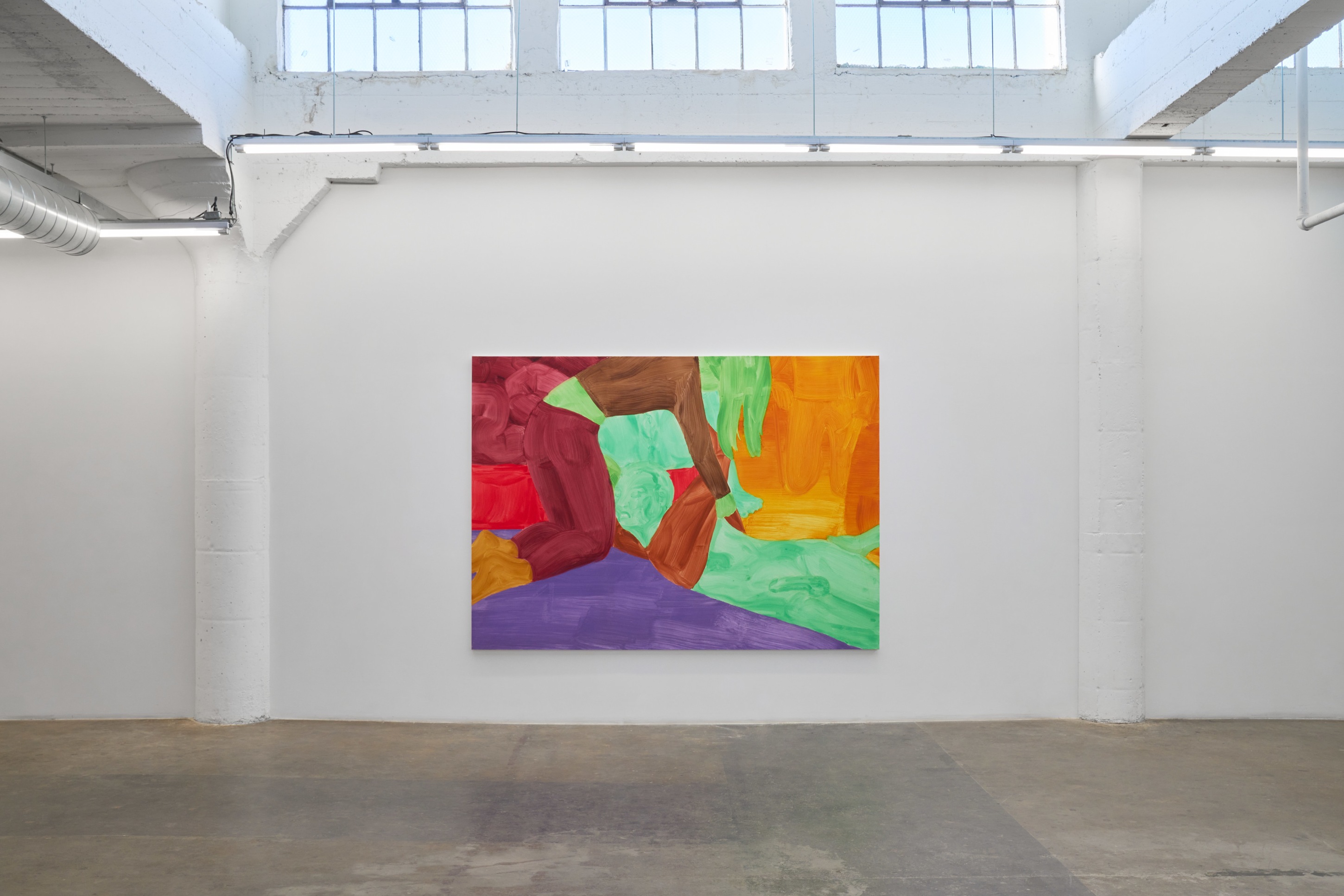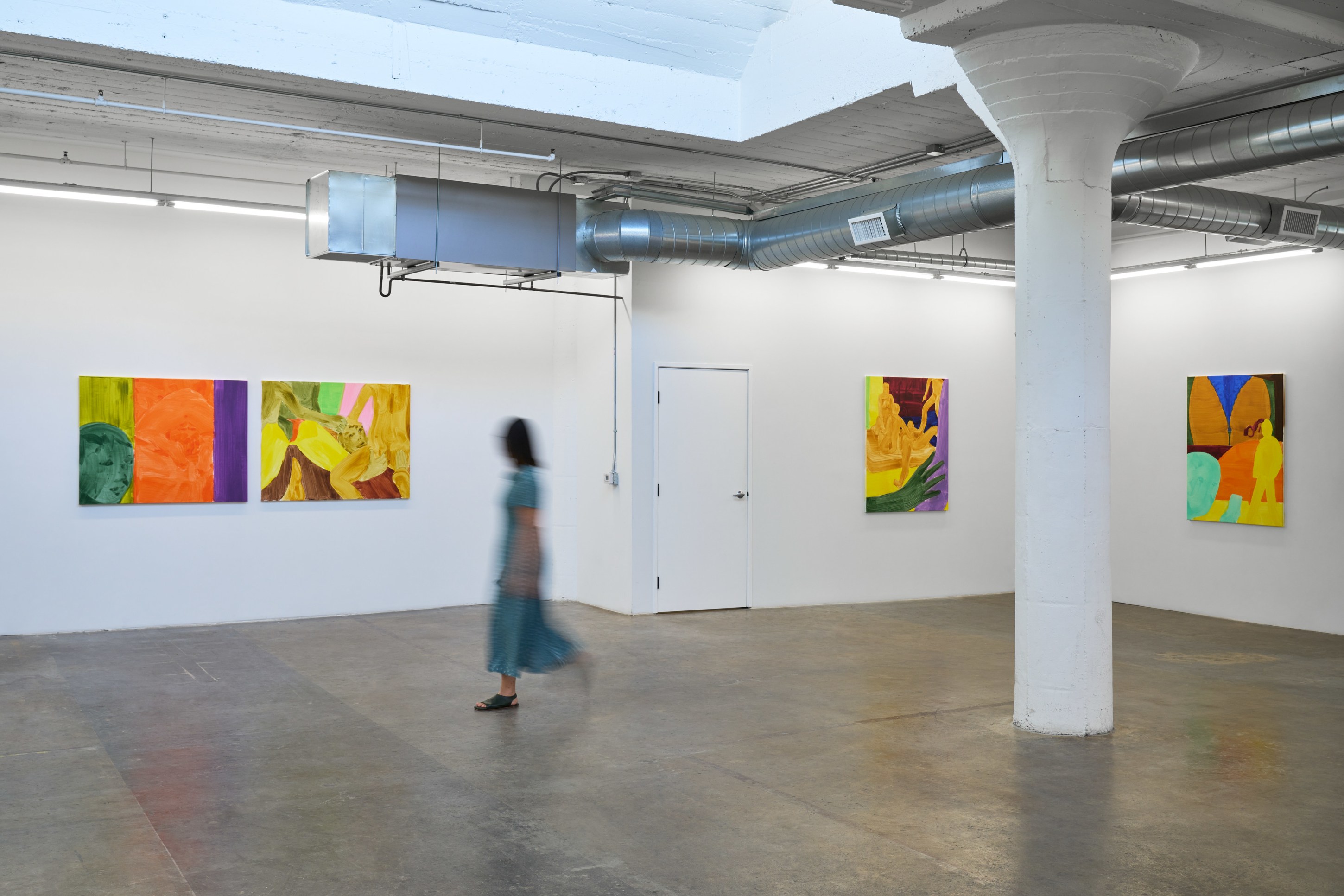 Us, Kremer’s fourth solo exhibition with Nicodim, implicitly binds the viewer to the communities on his canvases. In “Gathering (XXIII),” 2021, our gaze is fixed from around the corner. We are voyeurs, first upon a partitioning of eight individual colors, then a partially disrobed foursome, then another individual, watching us watching them. The setting of “Gathering (XXXIII),” 2021, is foregrounded by a disembodied hand—it could be our hand—pulling back the curtain on four figures rendered in a single shade as they piece themselves together in carnal delight, each appendage and embrace delineated by the weight of Kremer’s brushstrokes. He strokes us all onto the same plane, the same existence. It’s a bit uncomfortable, and not without a sense of mischief, but his approach is sincere and considered. In this body of work, every body is a part of the action, communally. All of us.