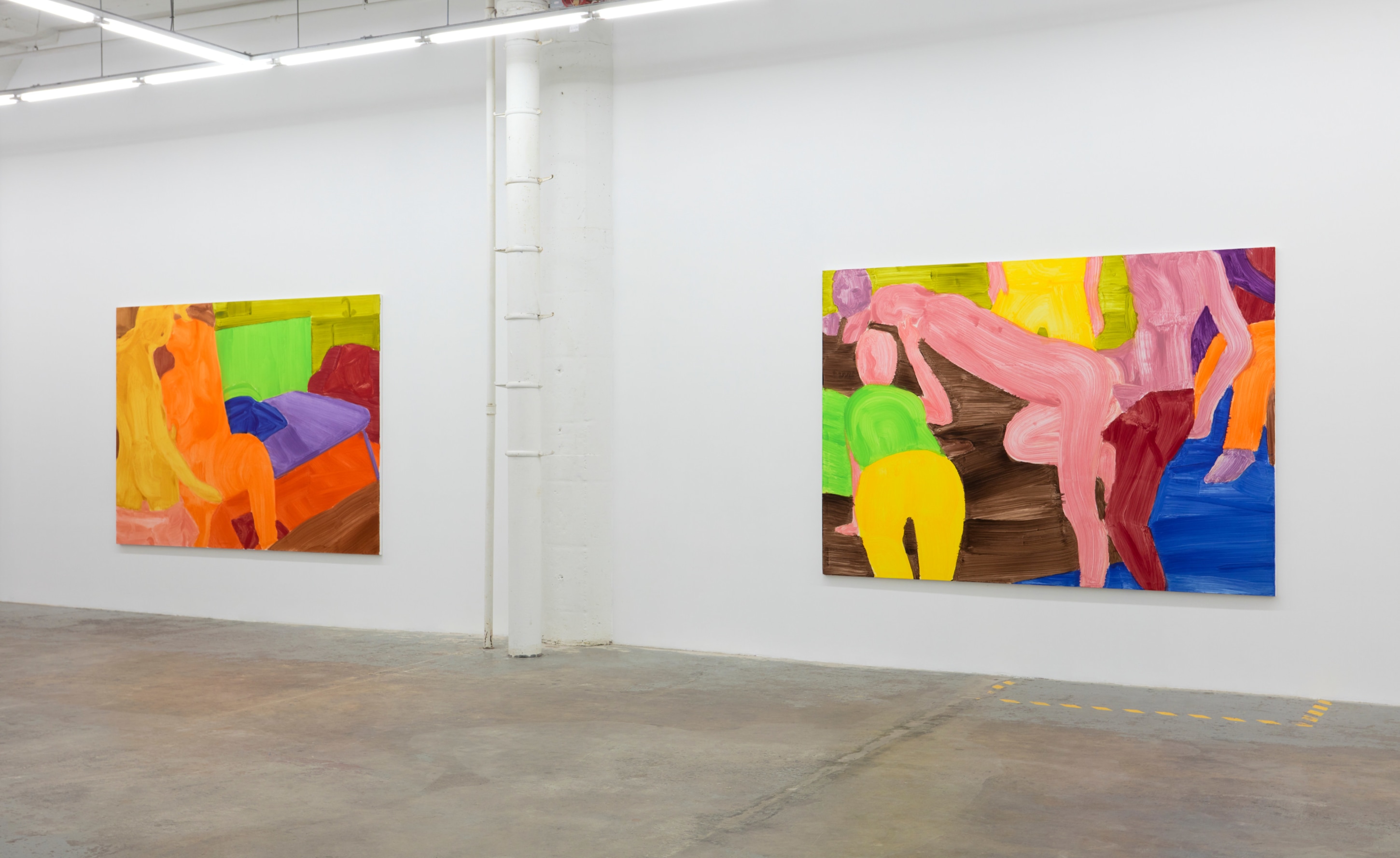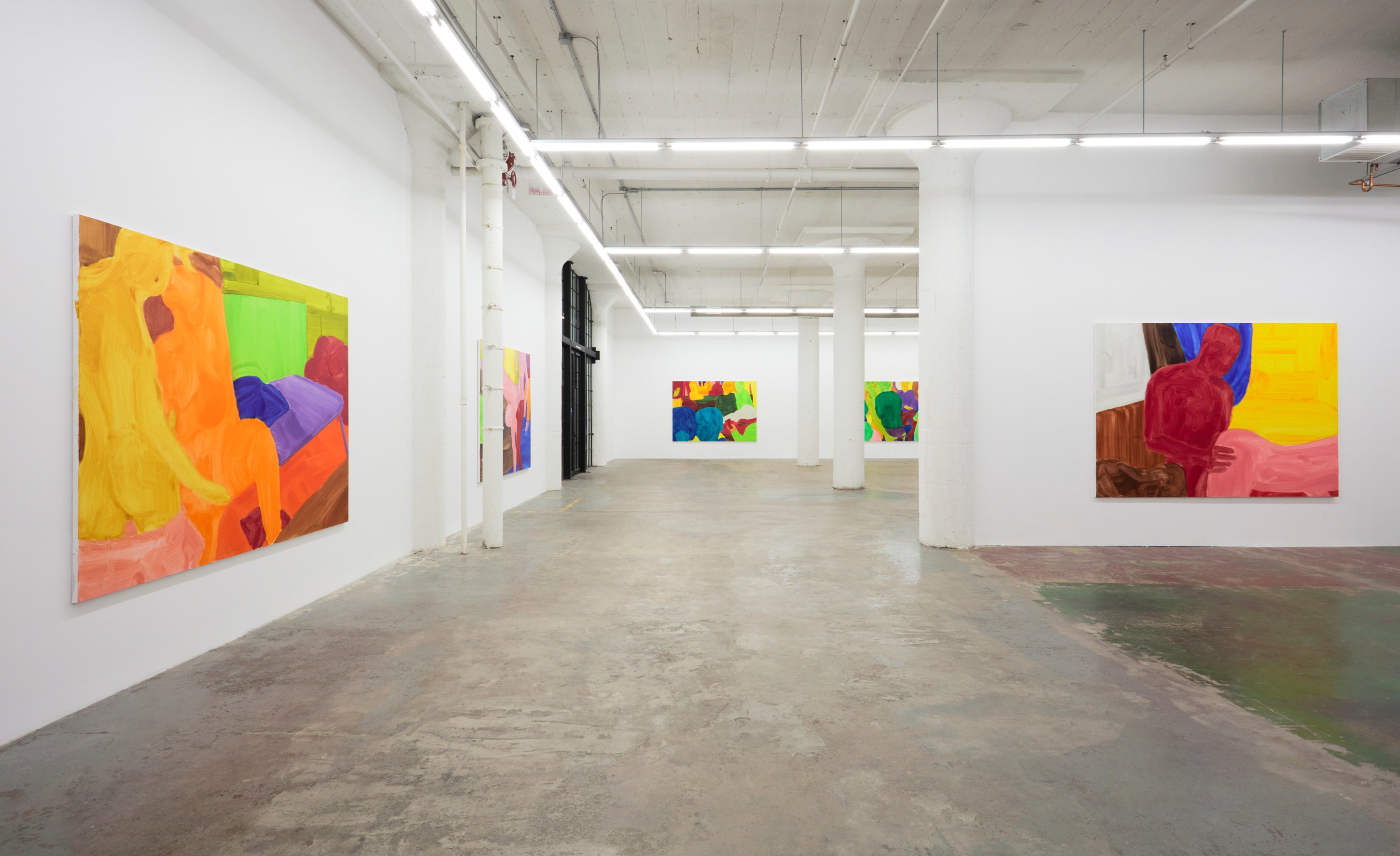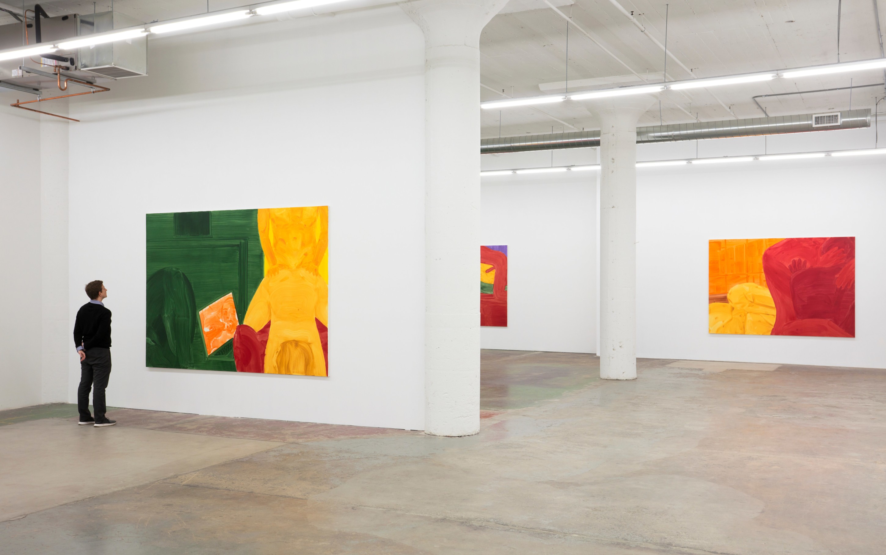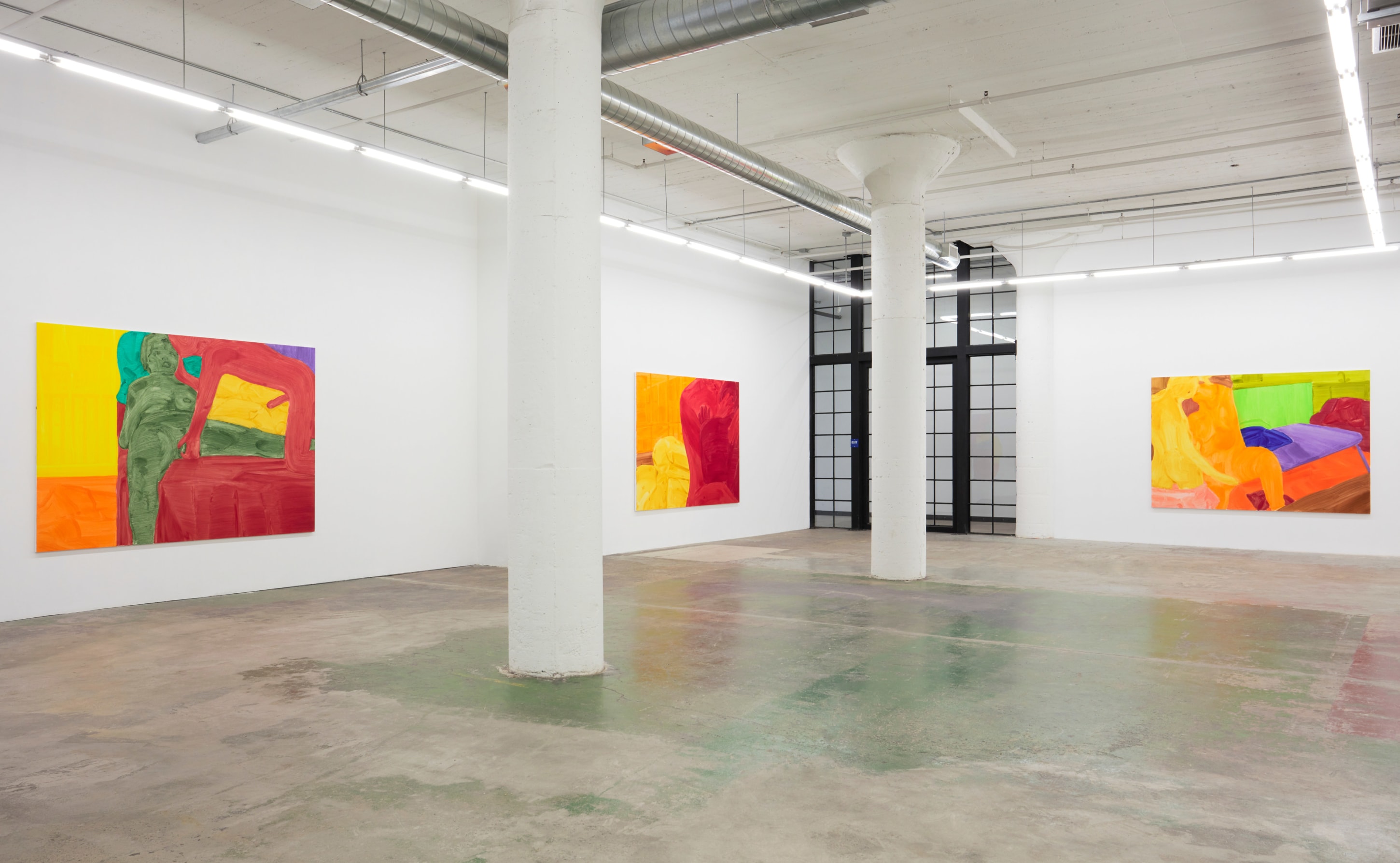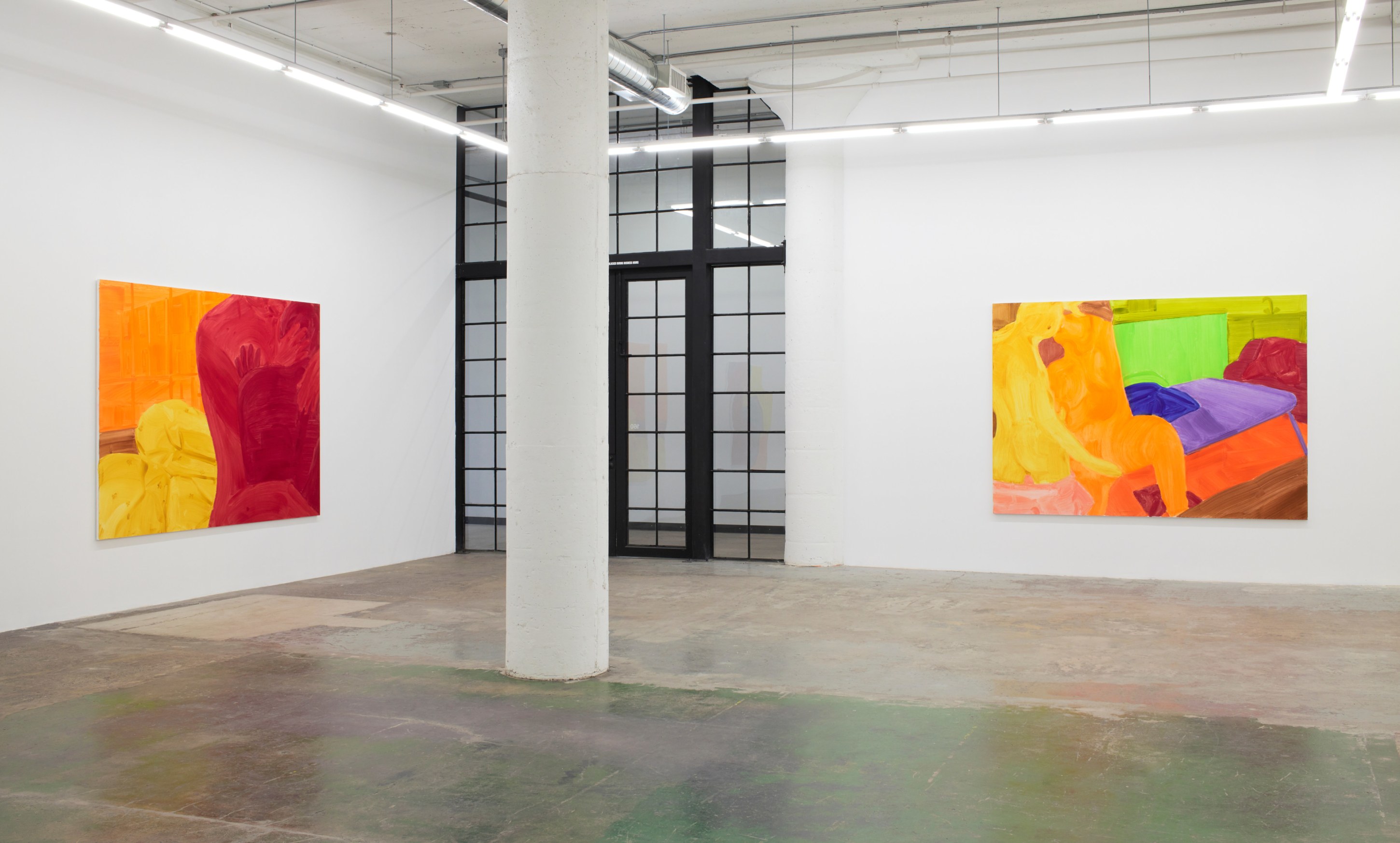 Offset, shifted colors meet, but never mix within Philipp Kremer’s elephantine canvases. They present themselves as abstractions at first. The brushstrokes are bold and purposeful in their execution, but no color-filled expanse amounts to negative space; there is a place and a reason for every erect flourish, every neon finger of color penetrating another field. Kremer creates a decisive ambiguity, an awkward, yet familiar relationship between his clearly delineated shapes. They’re connecting, touching, much as lovers do. It’s pleasing to look at, maybe even a little horny. Wait, is that a dick?