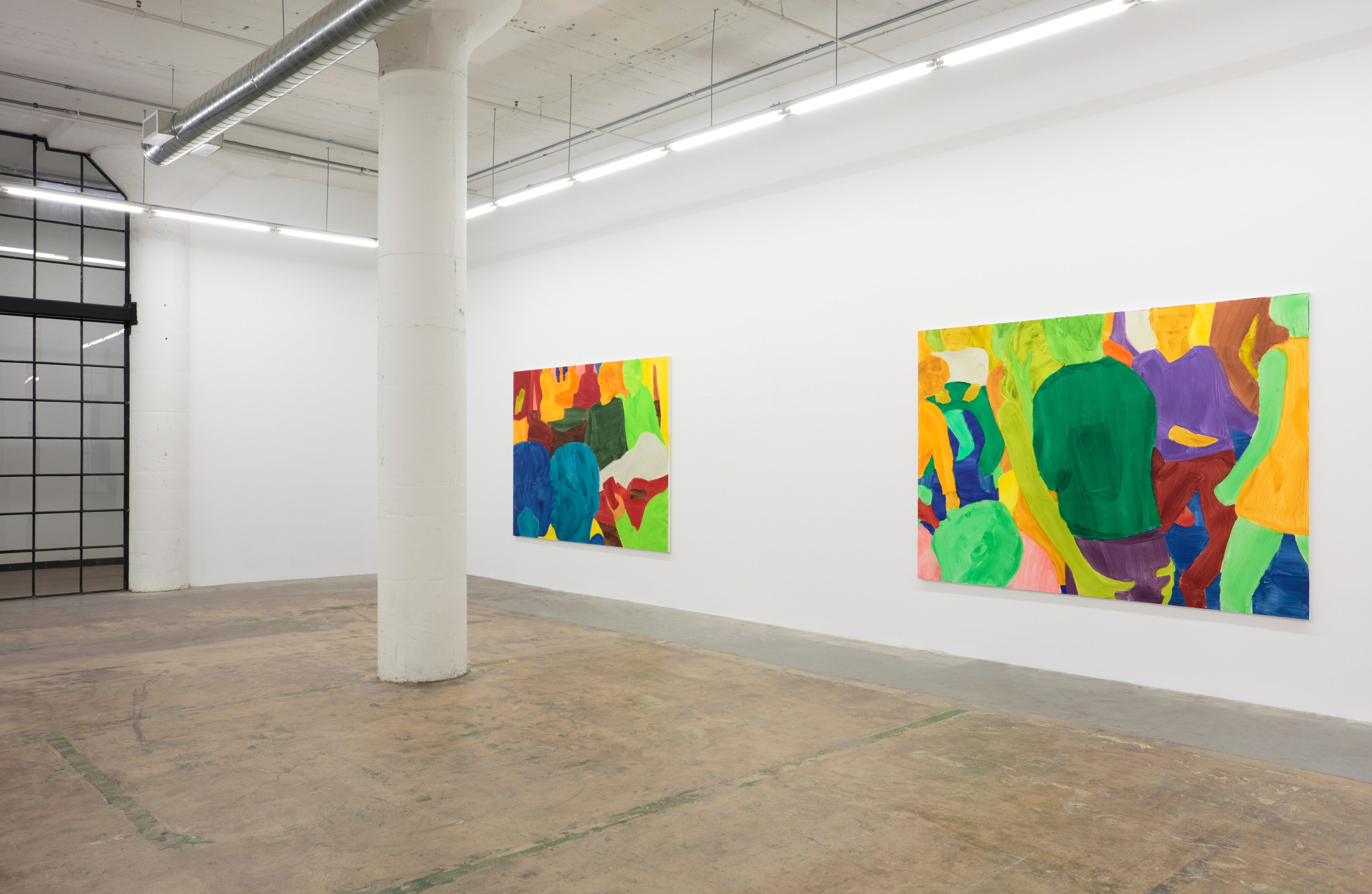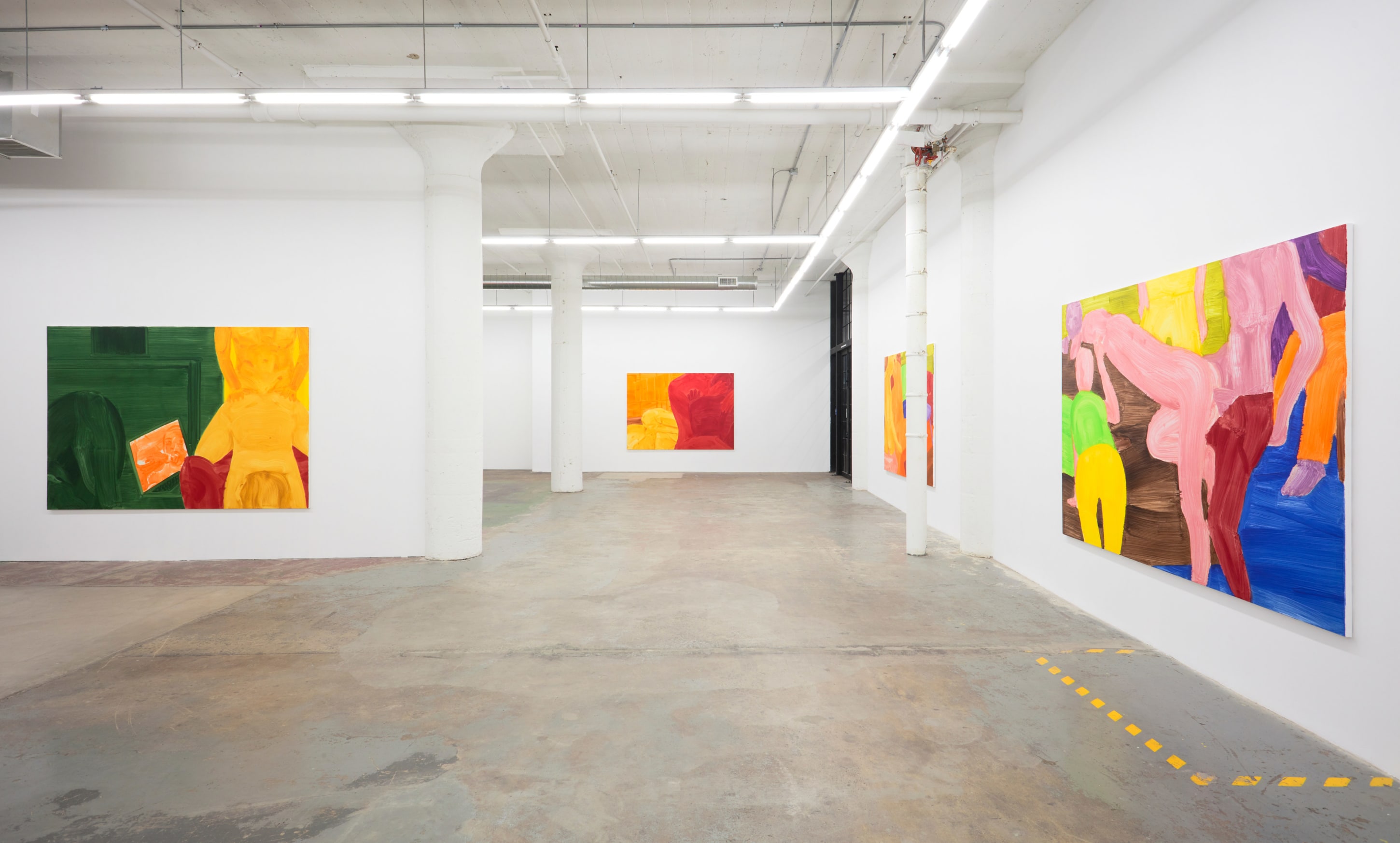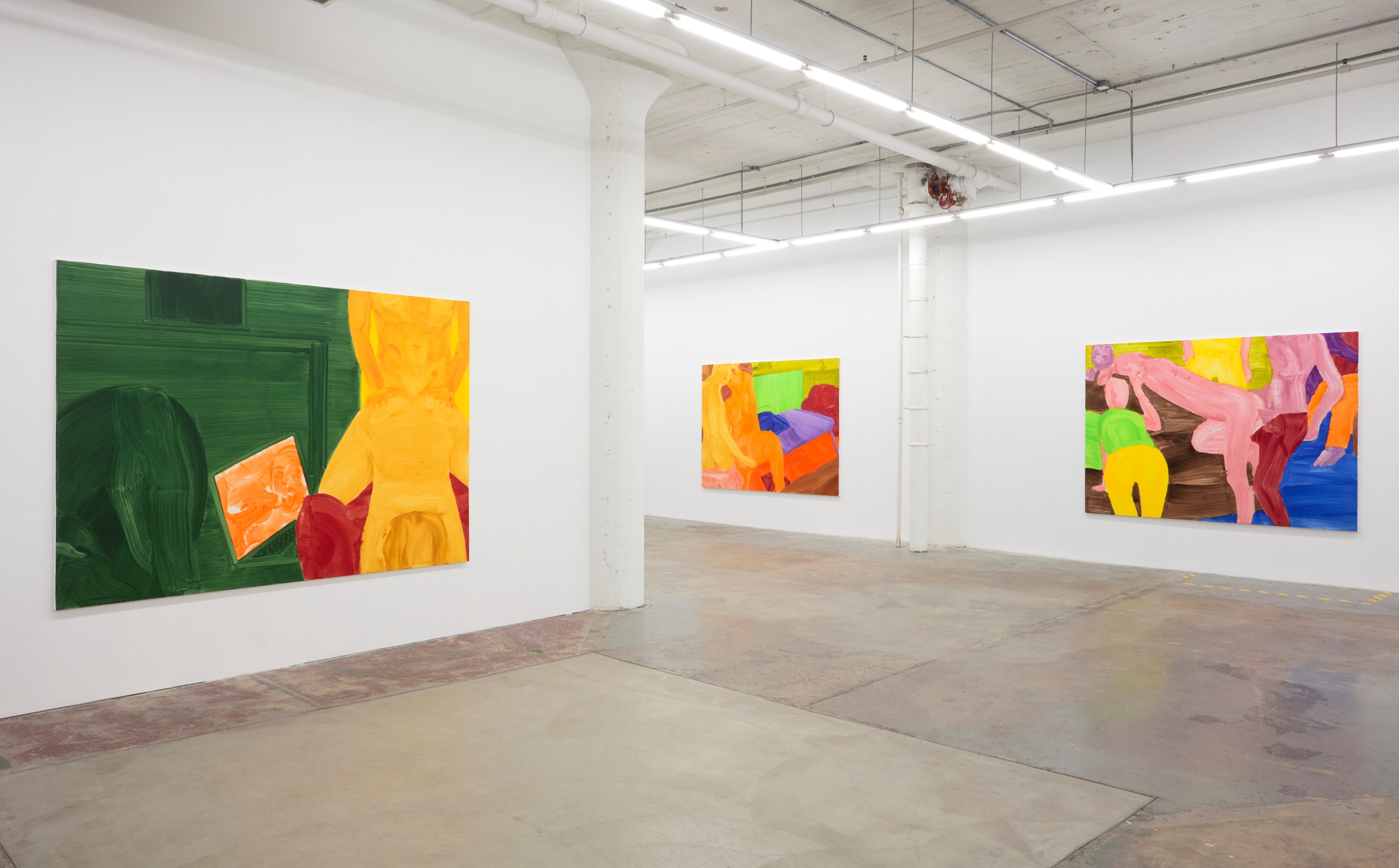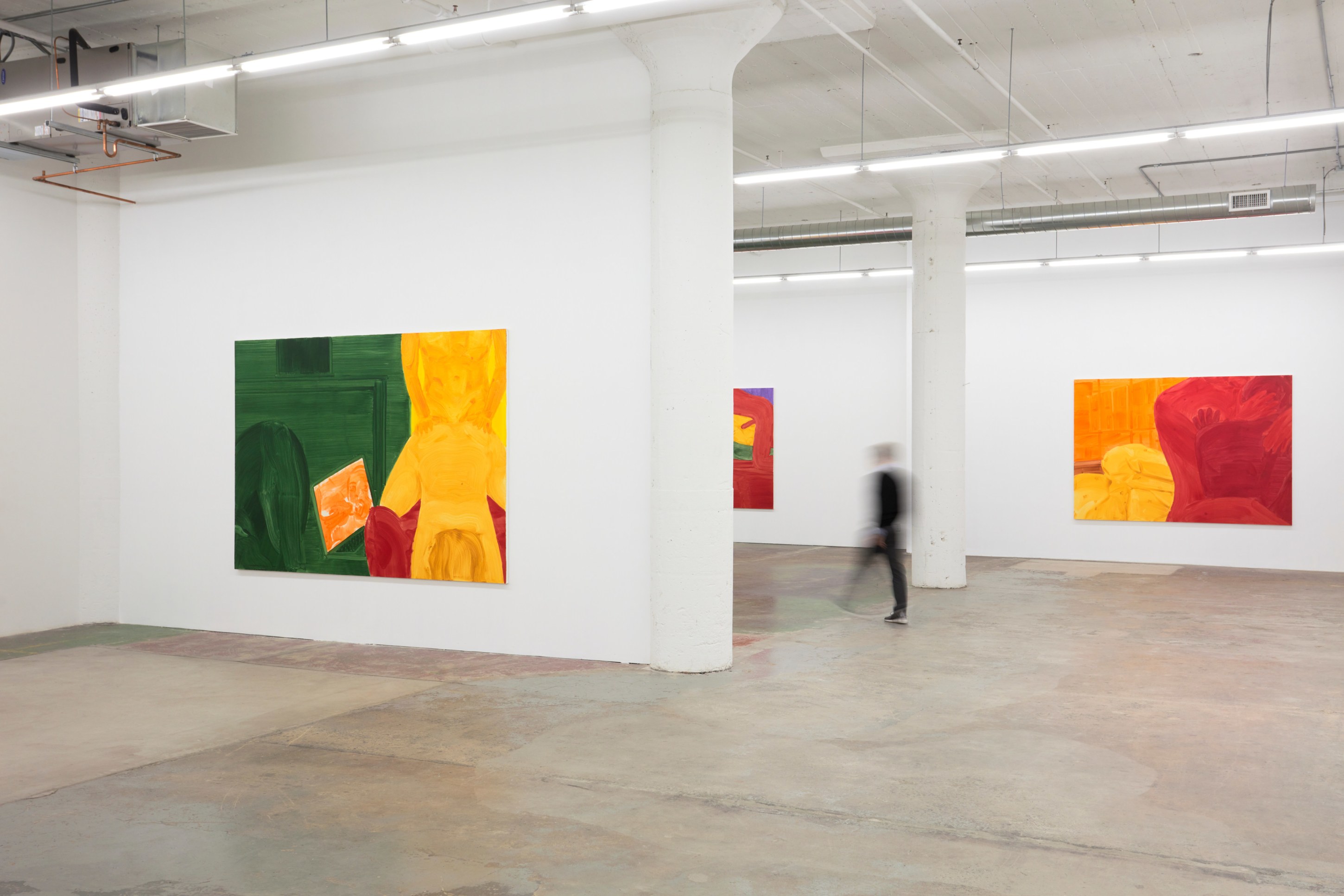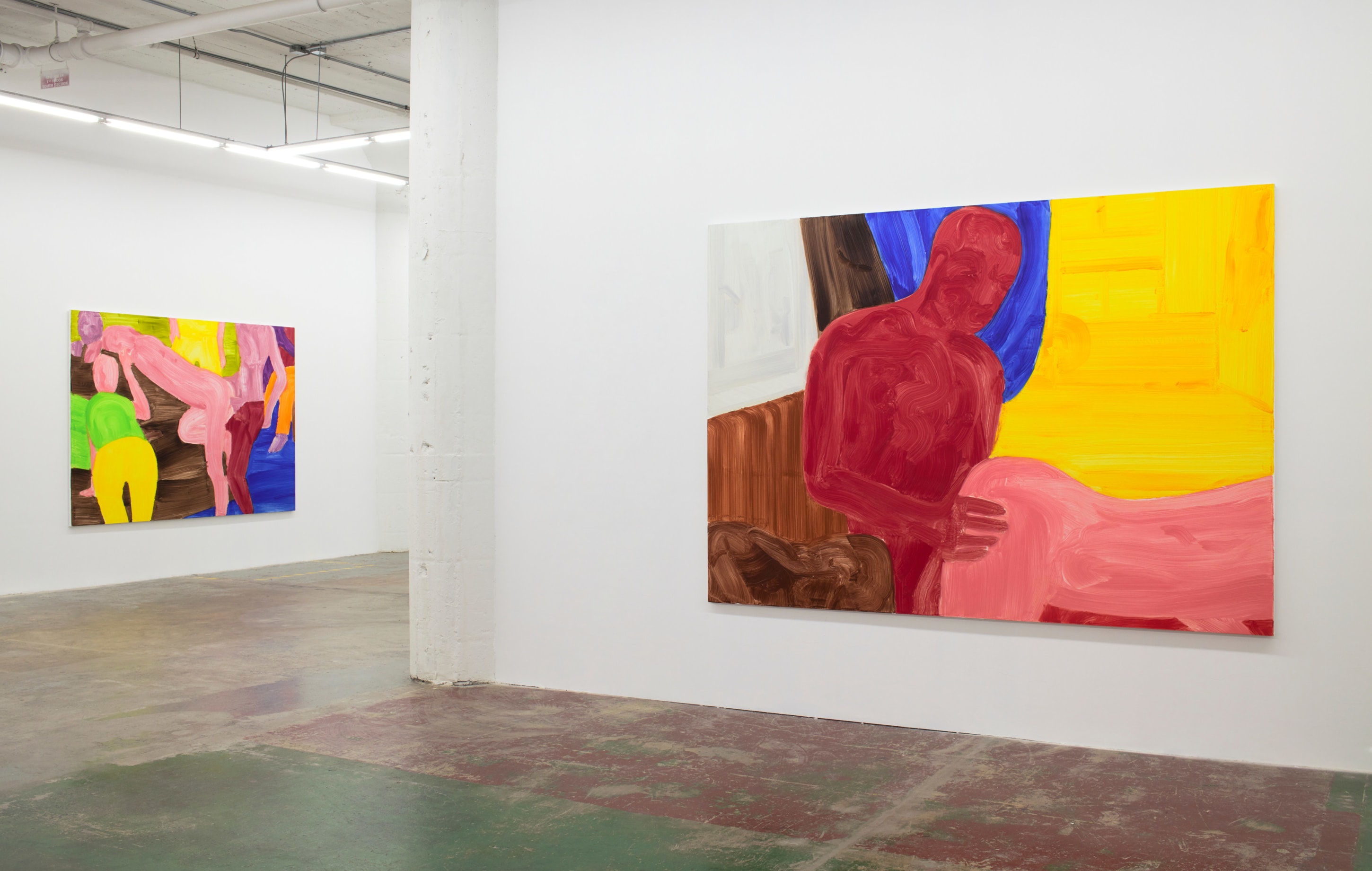 Offset, shifted colors meet, but never mix within Philipp Kremer’s elephantine canvases. They present themselves as abstractions at first. The brushstrokes are bold and purposeful in their execution, but no color-filled expanse amounts to negative space; there is a place and a reason for every erect flourish, every neon finger of color penetrating another field. Kremer creates a decisive ambiguity, an awkward, yet familiar relationship between his clearly delineated shapes. They’re connecting, touching, much as lovers do. It’s pleasing to look at, maybe even a little horny. Wait, is that a dick?