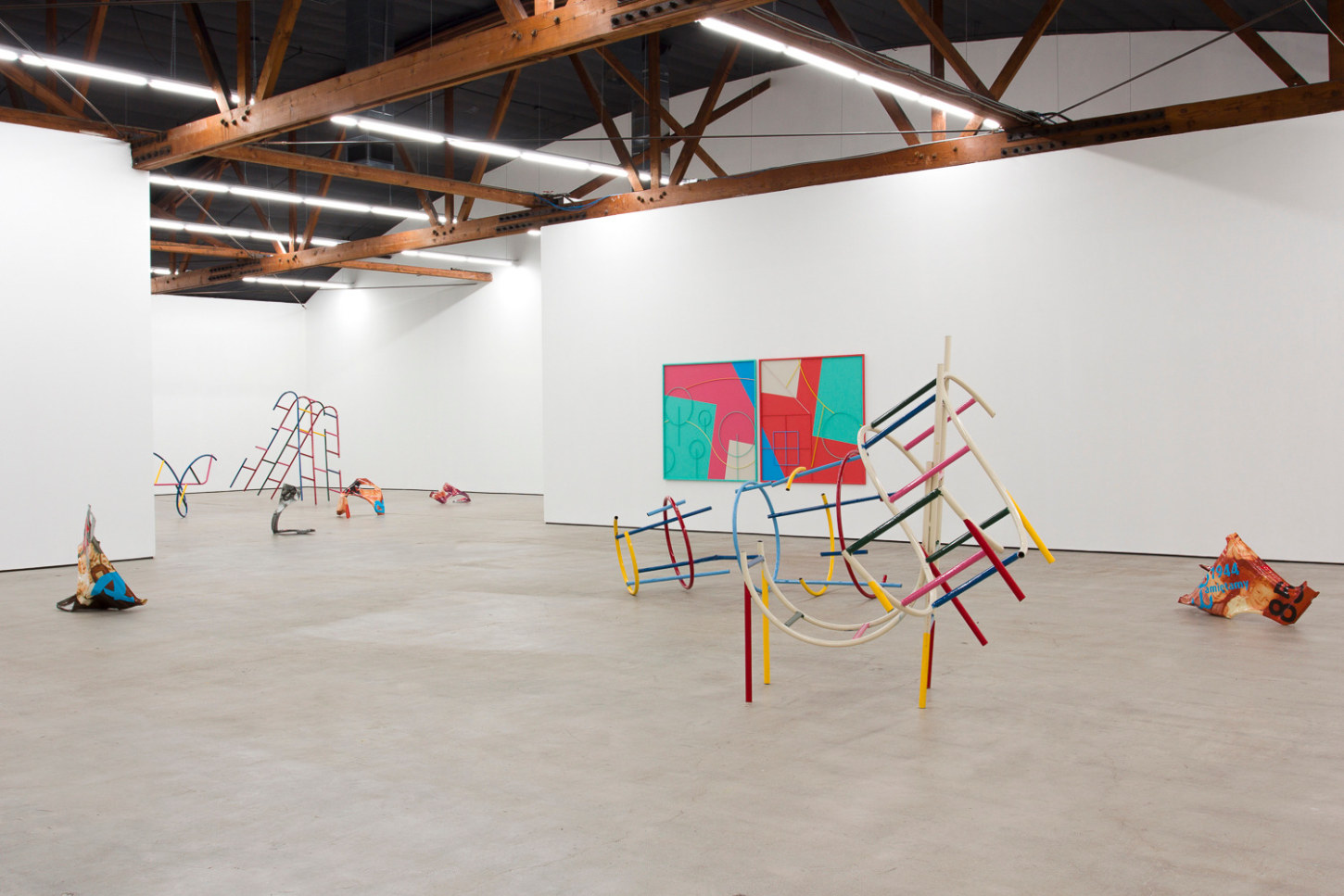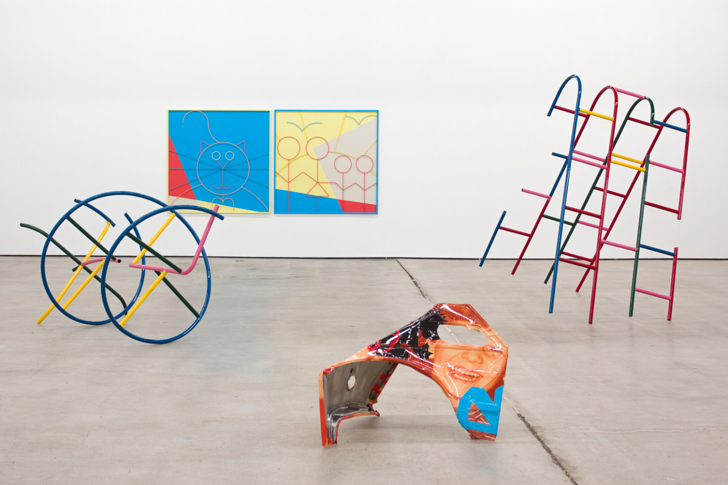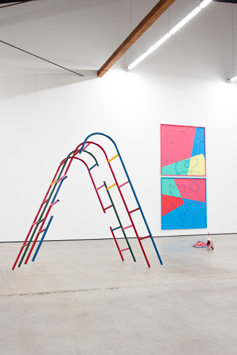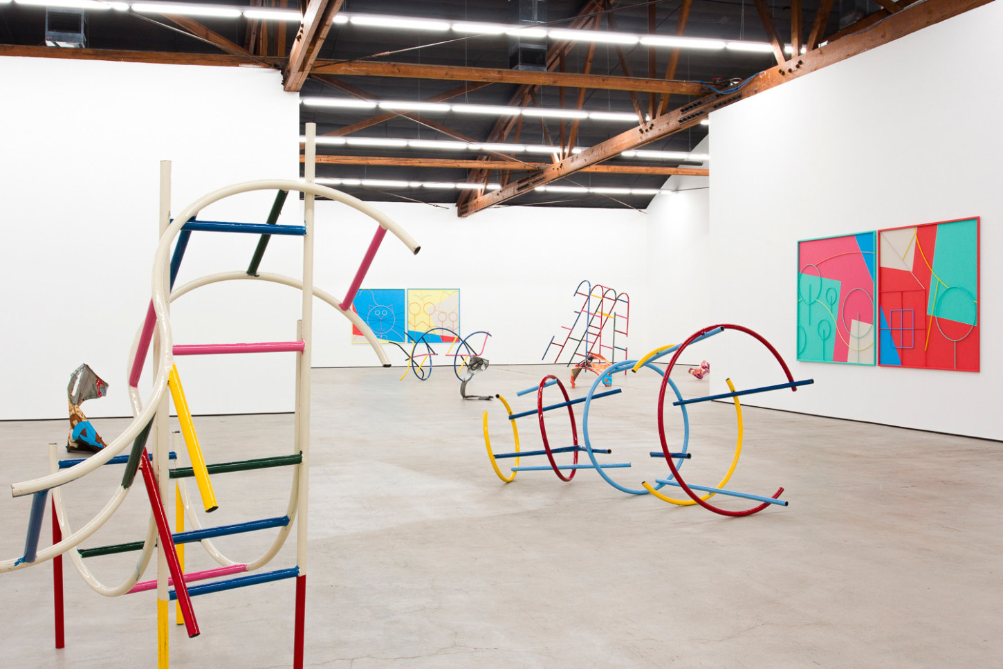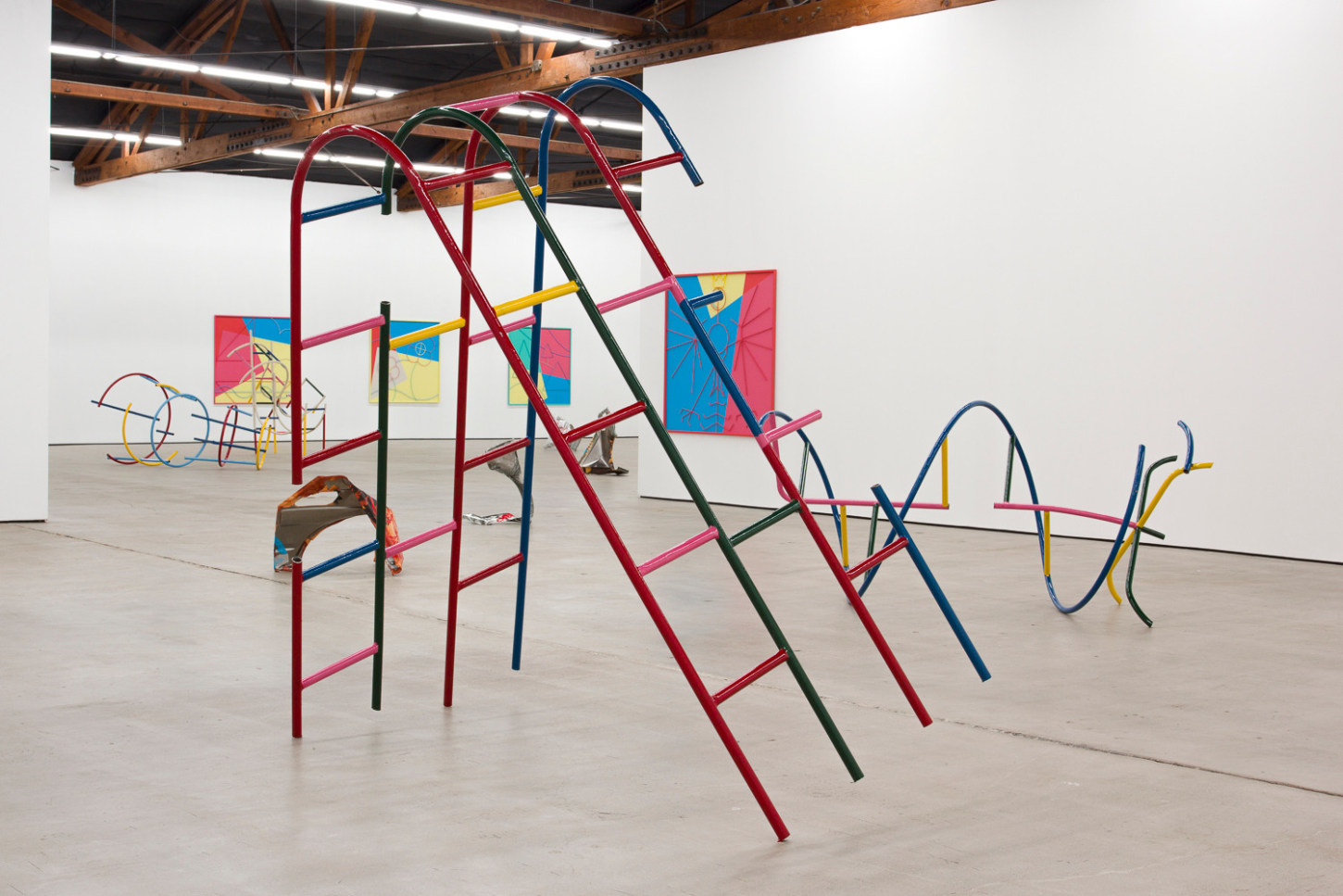 The Playground Structure series similarly explores objects that are both personal and universal. In his travels around Poland, Pyszczek documents these objects as they are found today, and then works with metalworkers to re-create these objects from photos, allowing their memories to come through in these structures. He then paints and deconstructs them as a way of mediating the past.