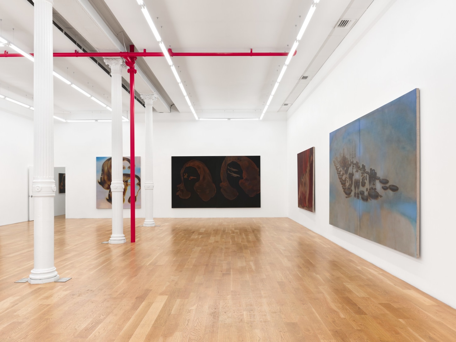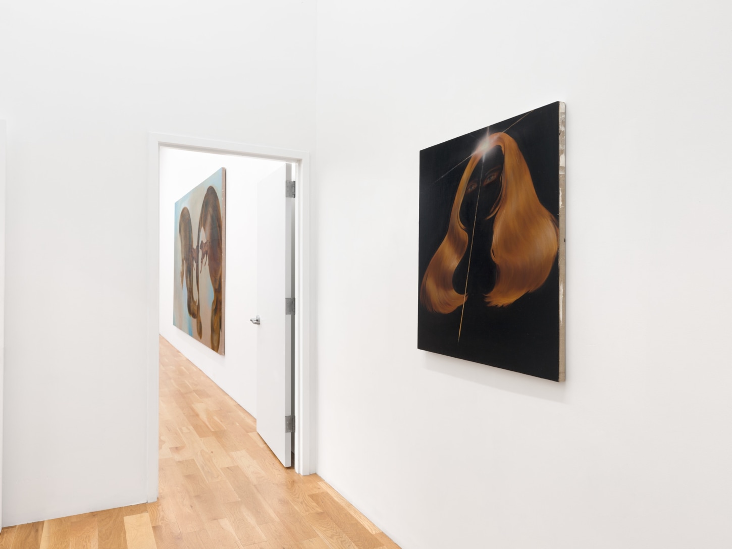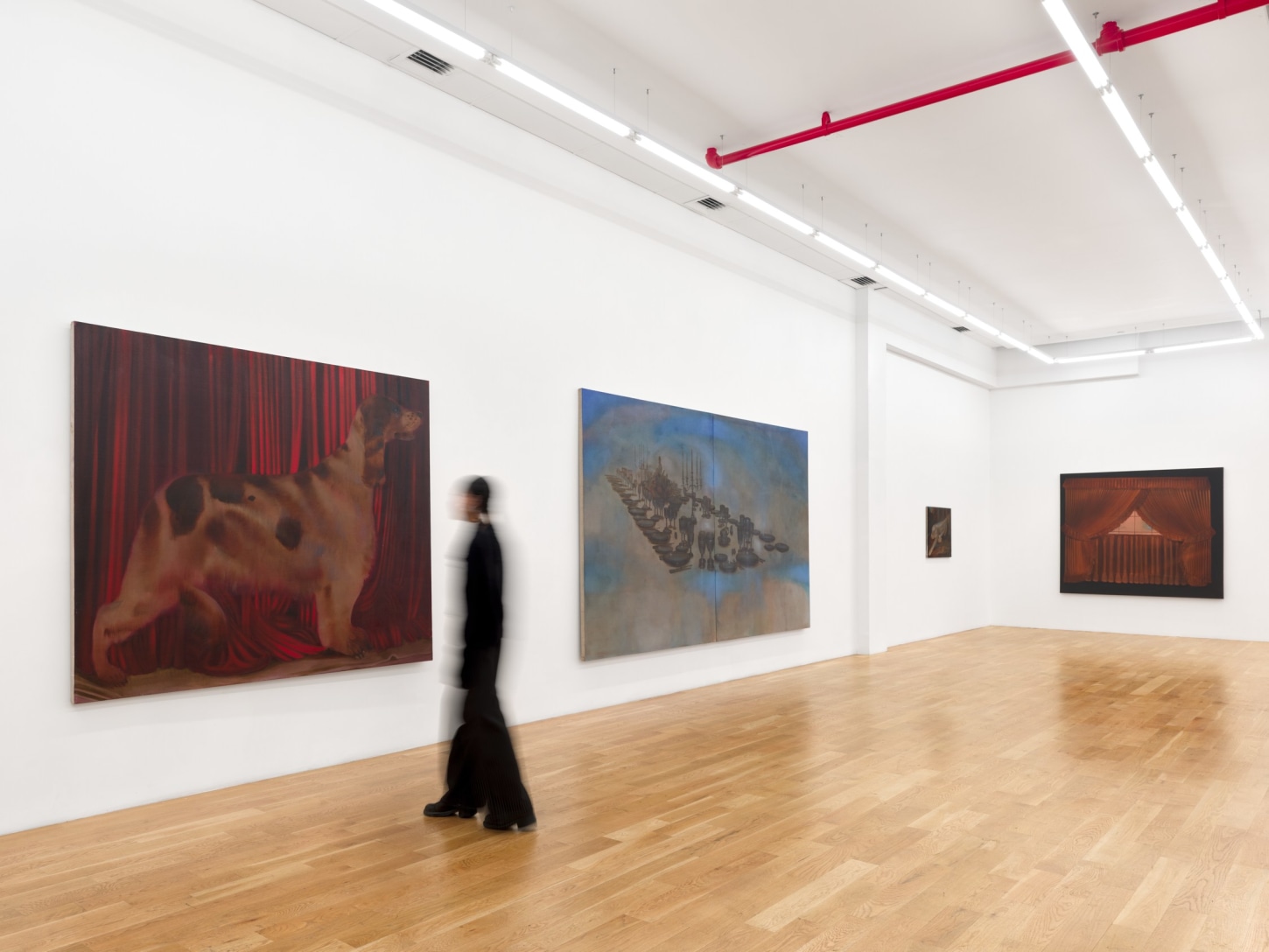 Three gargantuan diptychs centerpiece the exhibition. In Power Play, 2023, two disembodied female hairdos hover within a black void, while a revolver, two dogs, and two commercial jetliners float where the faces should be. Women and Dogs, 2023, continues this motif, only this time the hairpieces are suspended in a skyscape with two English Pointers pointing at one another in the foreground, perhaps to pass blame for their current purgatory. Little Scheme, 2023, is a banquet in the clouds without a table, its glasses empty, the feast yet to arrive. Each piece serves as a stage set of sorts, the objects within them akin to Chekhov’s gun, loaded with some impending, yet-to-be-defined action or chaos.Their monumental scale inherently implies that whatever is to come, if it ever comes, it will be consequential.