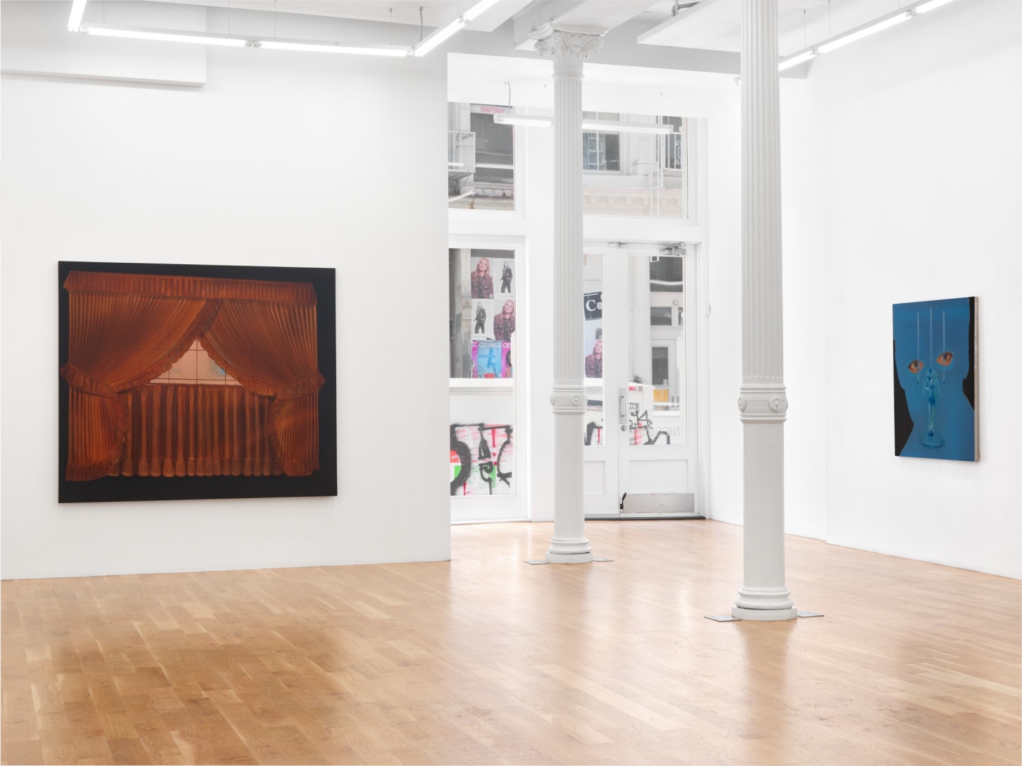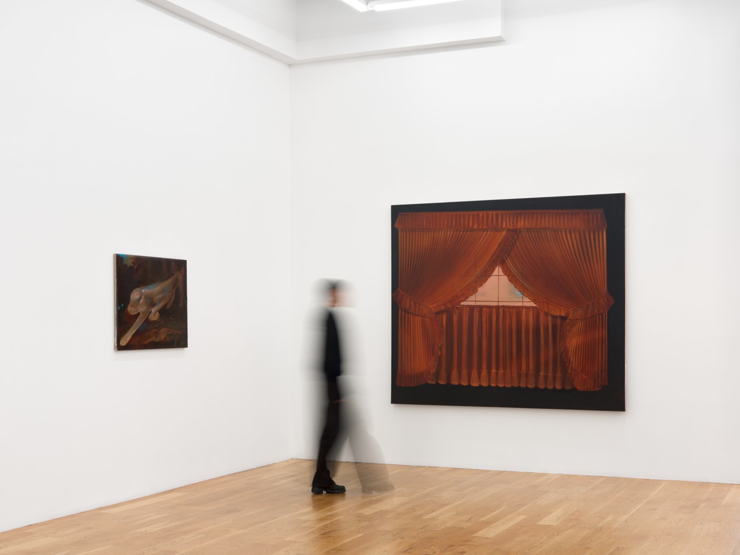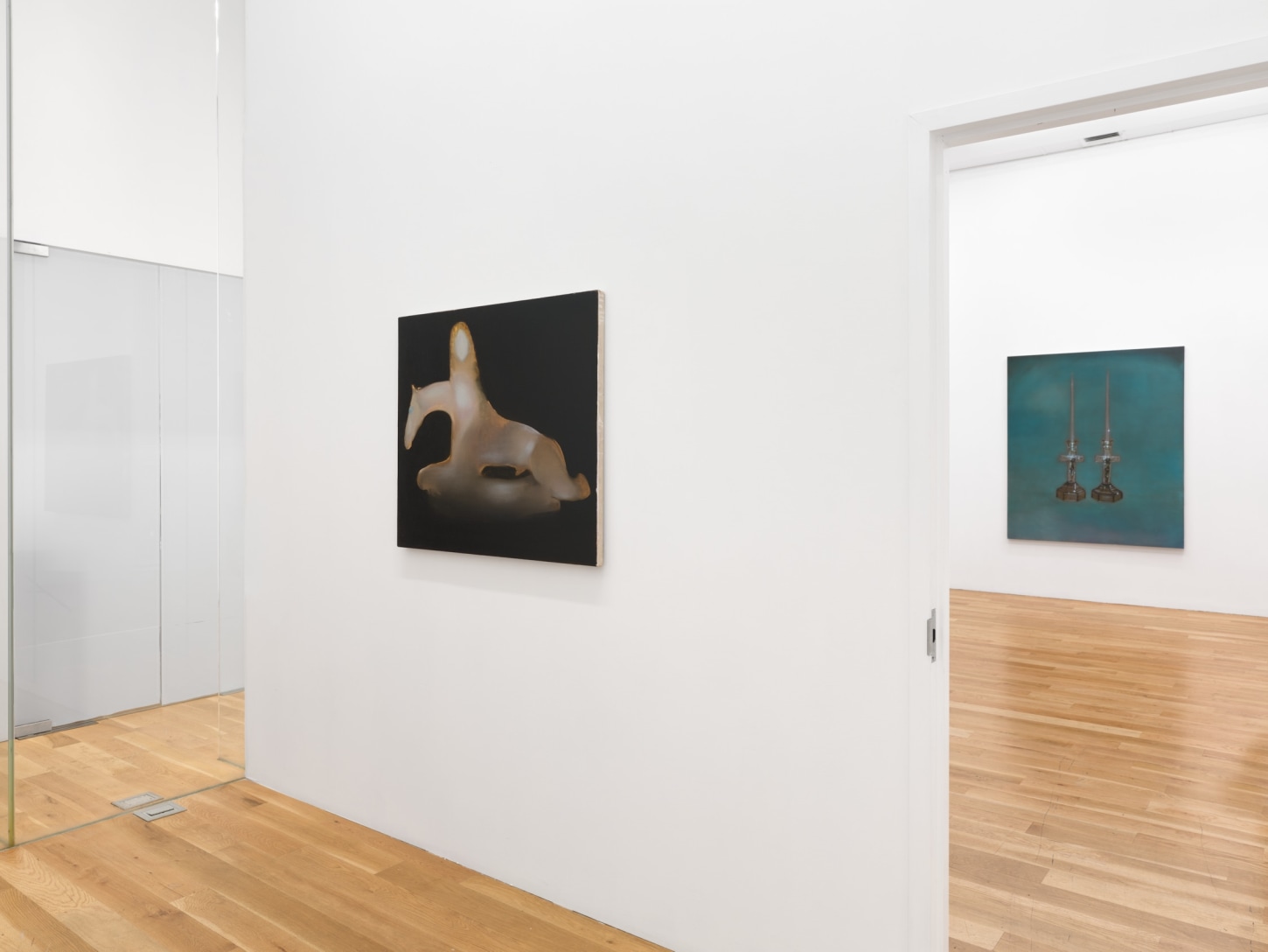 Three gargantuan diptychs centerpiece the exhibition. In Power Play, 2023, two disembodied female hairdos hover within a black void, while a revolver, two dogs, and two commercial jetliners float where the faces should be. Women and Dogs, 2023, continues this motif, only this time the hairpieces are suspended in a skyscape with two English Pointers pointing at one another in the foreground, perhaps to pass blame for their current purgatory. Little Scheme, 2023, is a banquet in the clouds without a table, its glasses empty, the feast yet to arrive. Each piece serves as a stage set of sorts, the objects within them akin to Chekhov’s gun, loaded with some impending, yet-to-be-defined action or chaos.Their monumental scale inherently implies that whatever is to come, if it ever comes, it will be consequential.