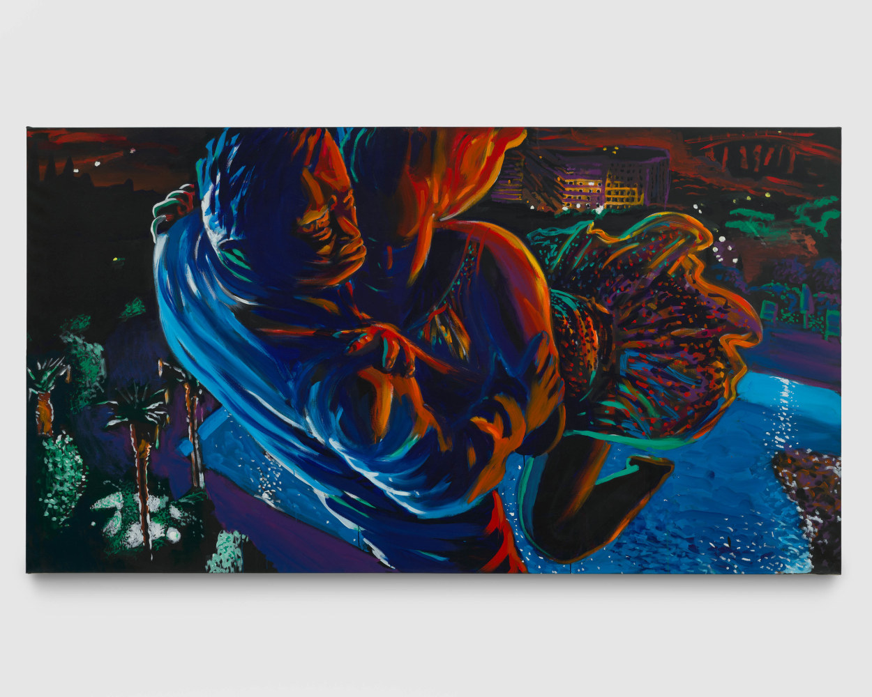 First, the paintings. His epic, past-the-witching-hour cityscapes feature bodies, often falling or flying, reflecting artificial neon and fluorescent light from the topography that envelopes them. The collective luminescence of the figures in combination with the synthetic landscape is not so much saccharine as it is serene; most viewers of these works were born into similarly manmade environments and nurtured to consciousness while swaddled by the unnatural.