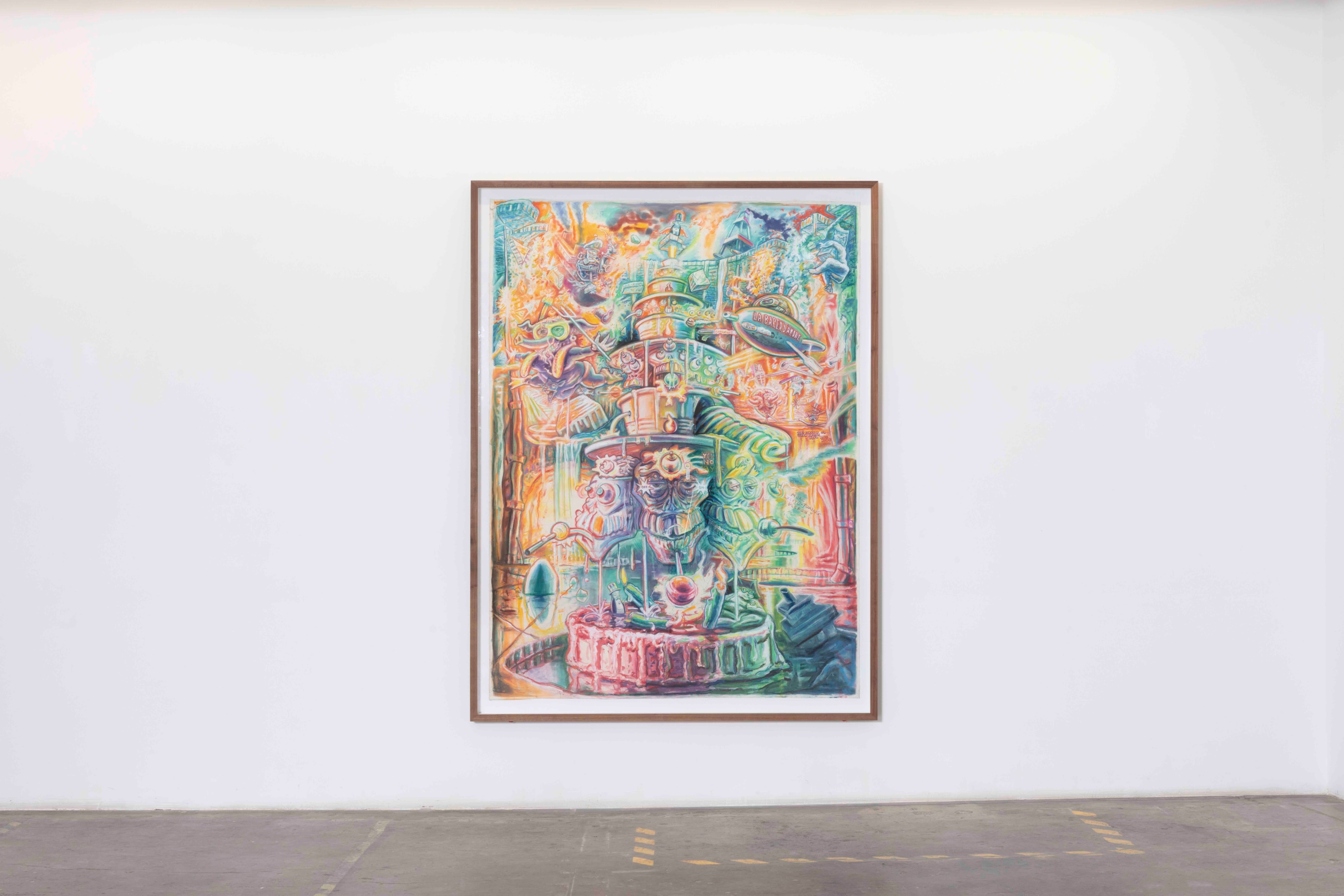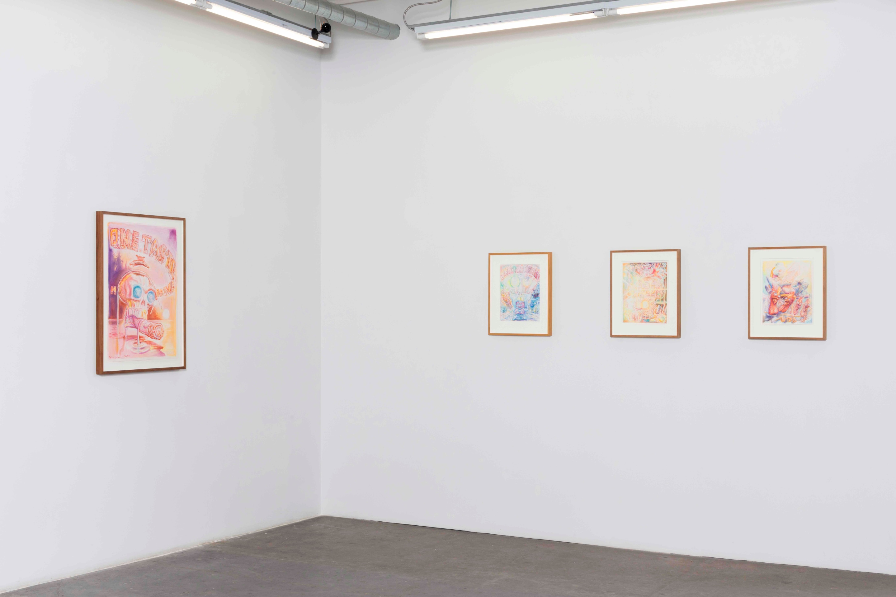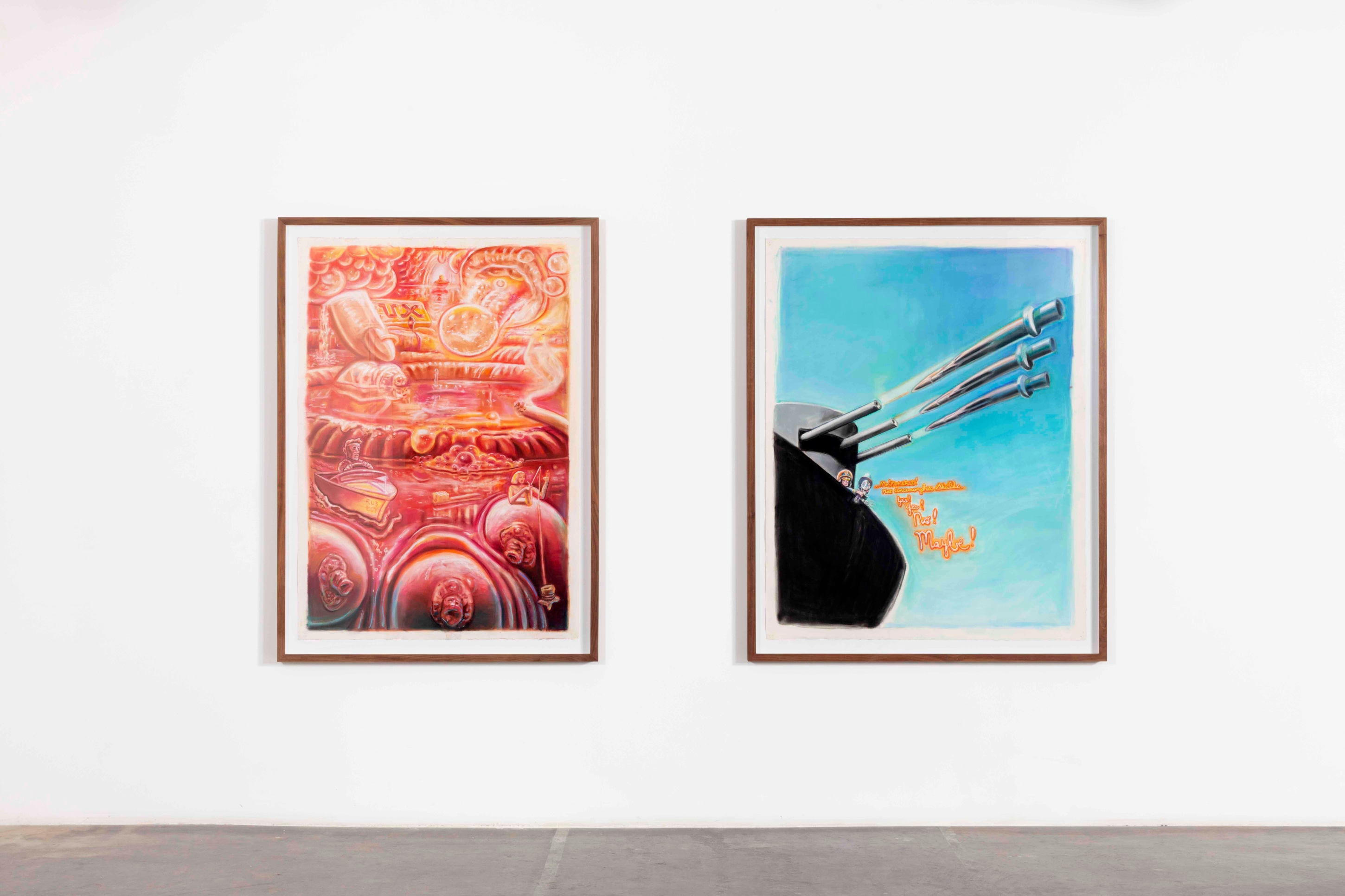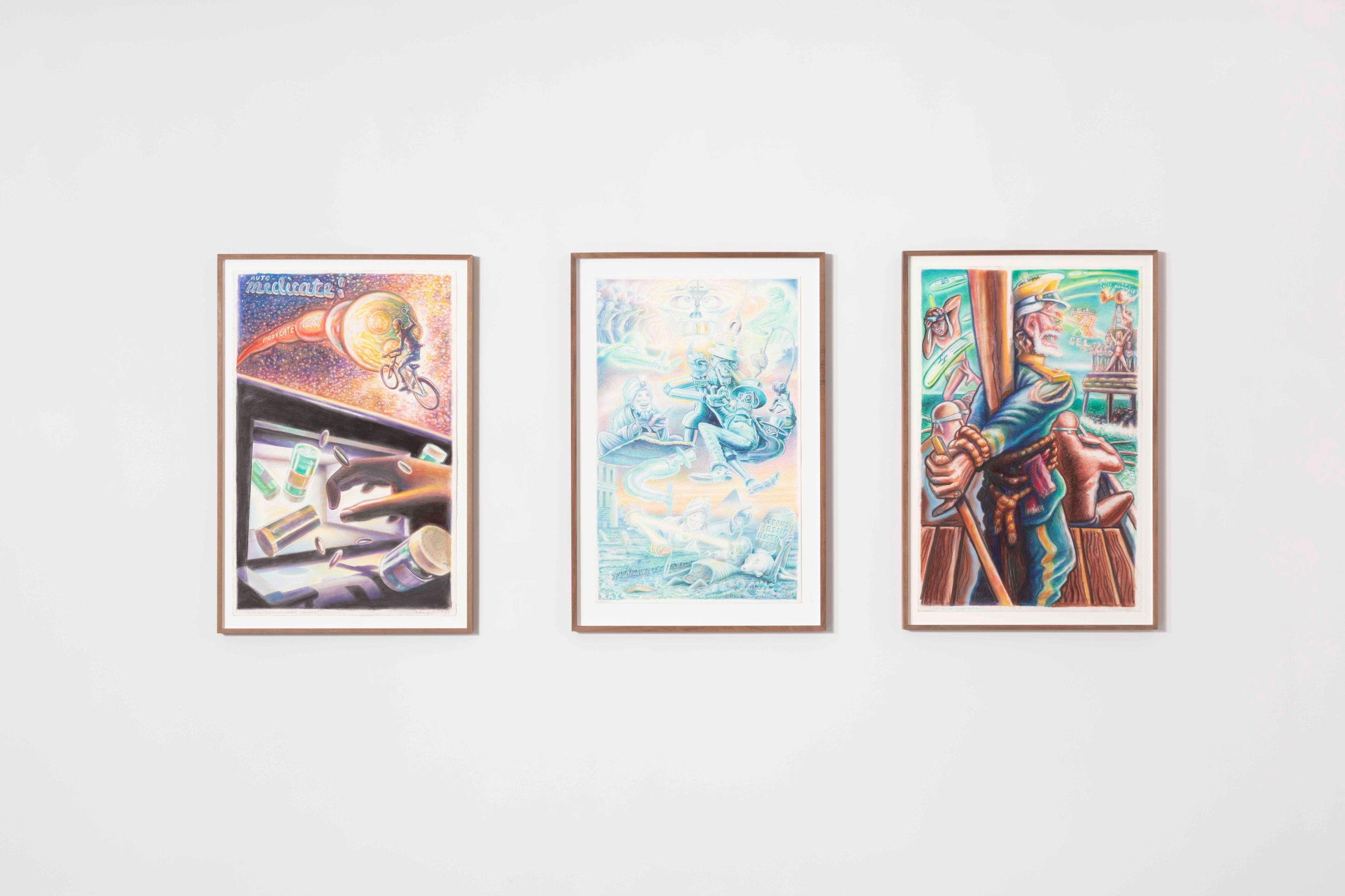 From his new home in Nepal, his Ayahuasca visions melded with the Hindu and Buddhist artworks, totems, and relics he saw in the temples and streets of his surrounding neighborhoods and became, for his practice, a cohesive whole. The high-contrast neons-on-black from his earlier work gave way to pastels on white cotton-rag paper—the better not to see the skin, but to see through it to the shamanic aliens, Gods and deities, sea captains, and massive (yet somehow effeminate) dongs that populate the universes within our bodies. These are The Ayahuasca Drawings.
