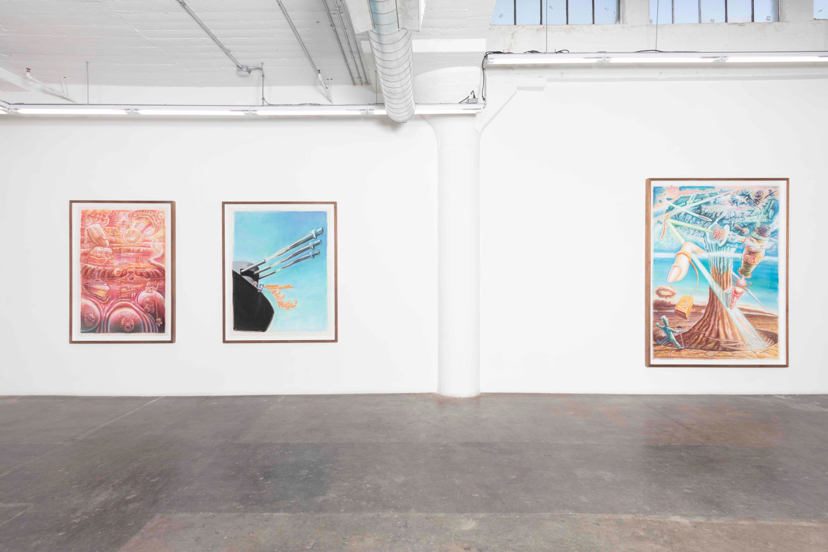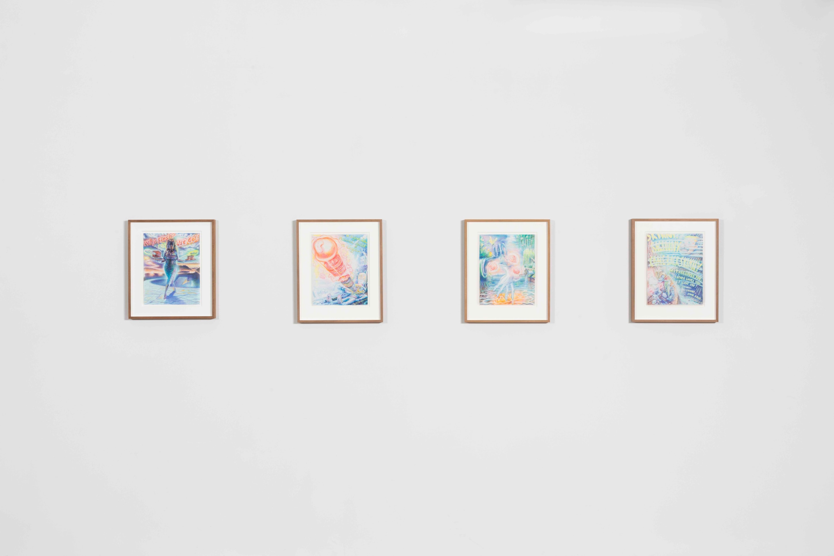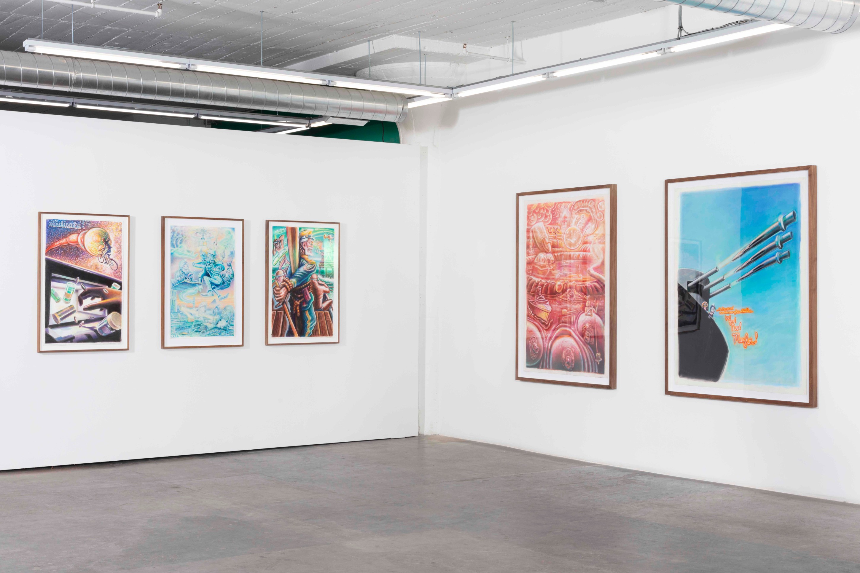 From his new home in Nepal, his Ayahuasca visions melded with the Hindu and Buddhist artworks, totems, and relics he saw in the temples and streets of his surrounding neighborhoods and became, for his practice, a cohesive whole. The high-contrast neons-on-black from his earlier work gave way to pastels on white cotton-rag paper—the better not to see the skin, but to see through it to the shamanic aliens, Gods and deities, sea captains, and massive (yet somehow effeminate) dongs that populate the universes within our bodies. These are The Ayahuasca Drawings.