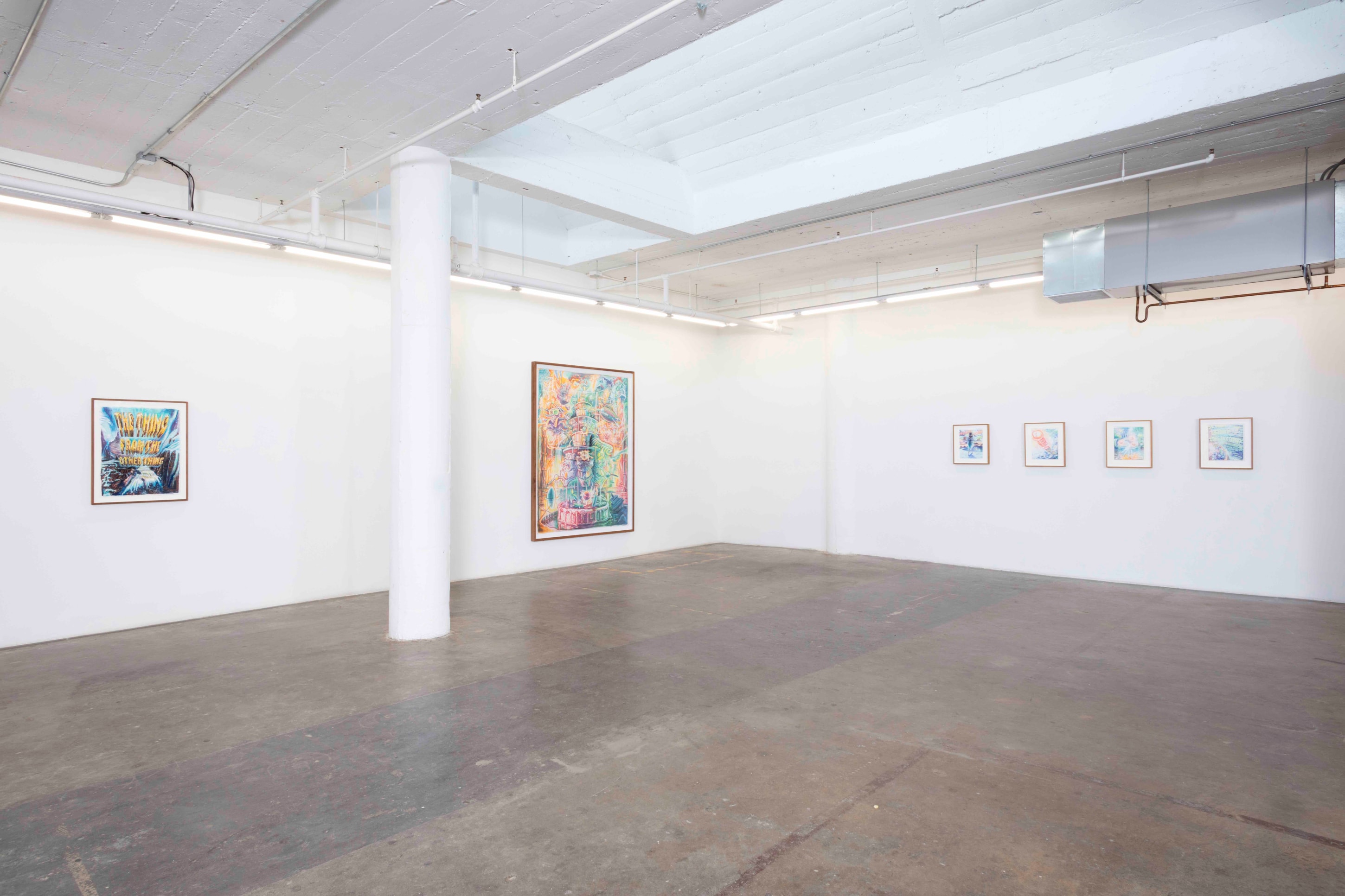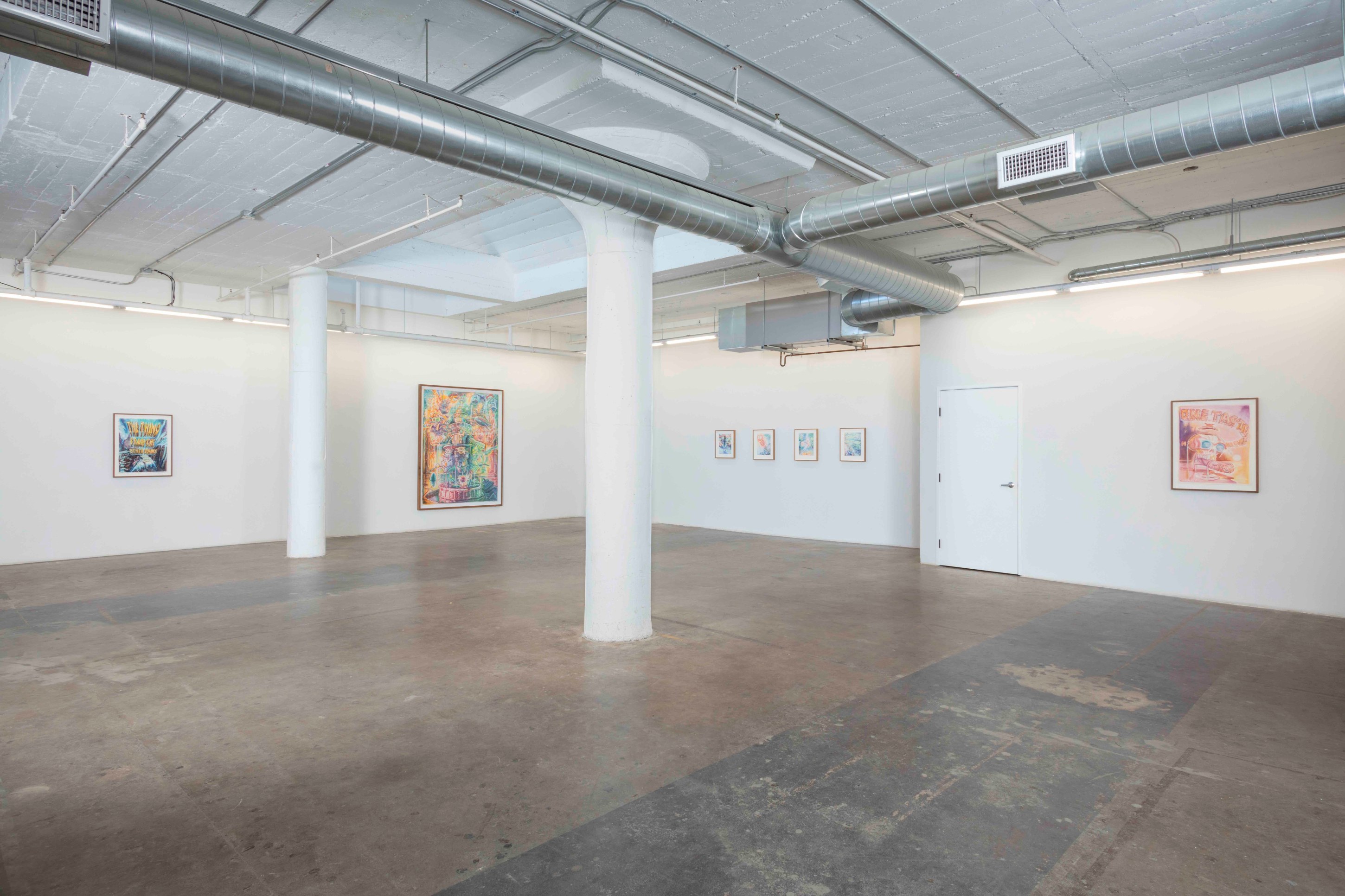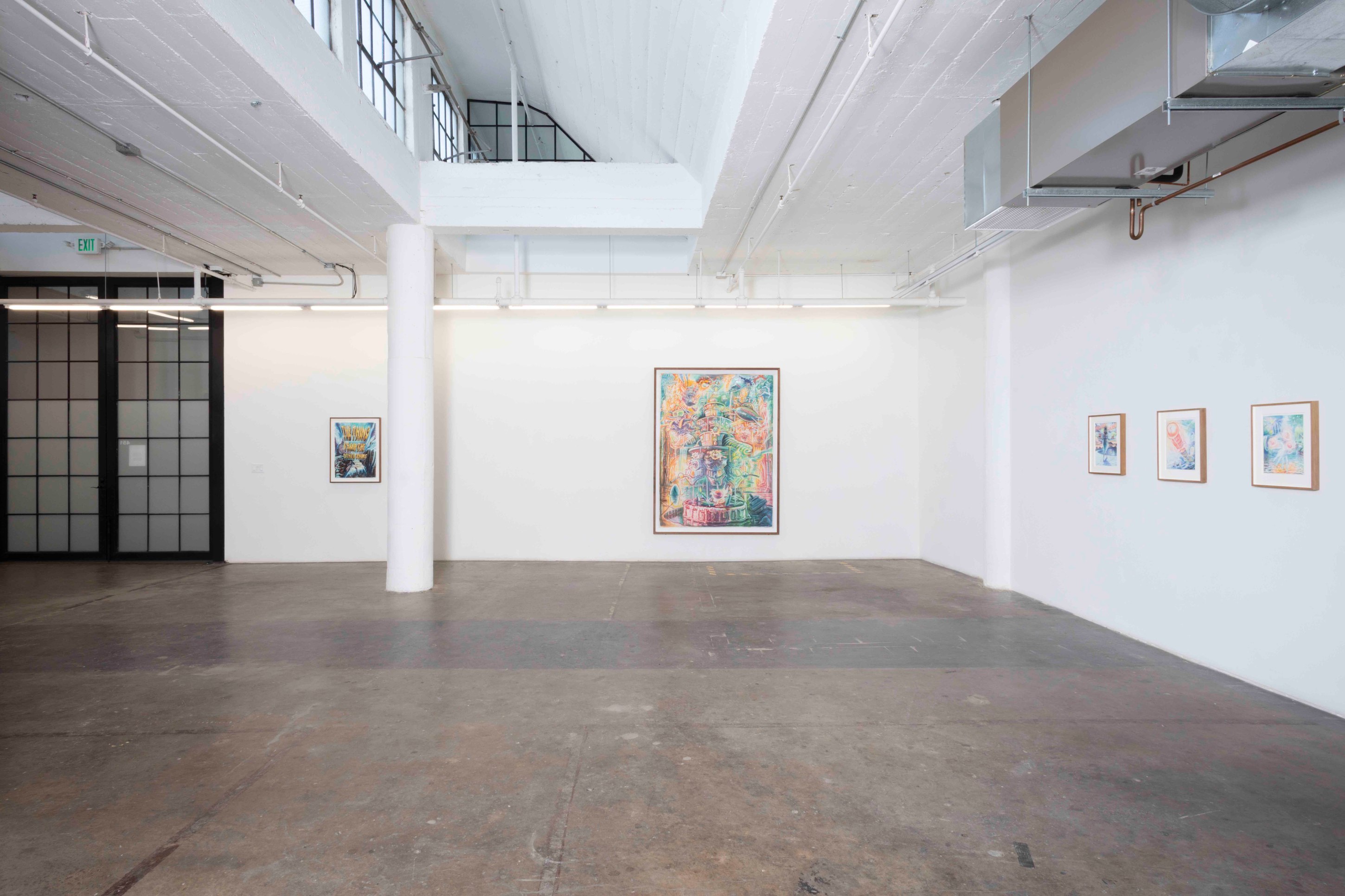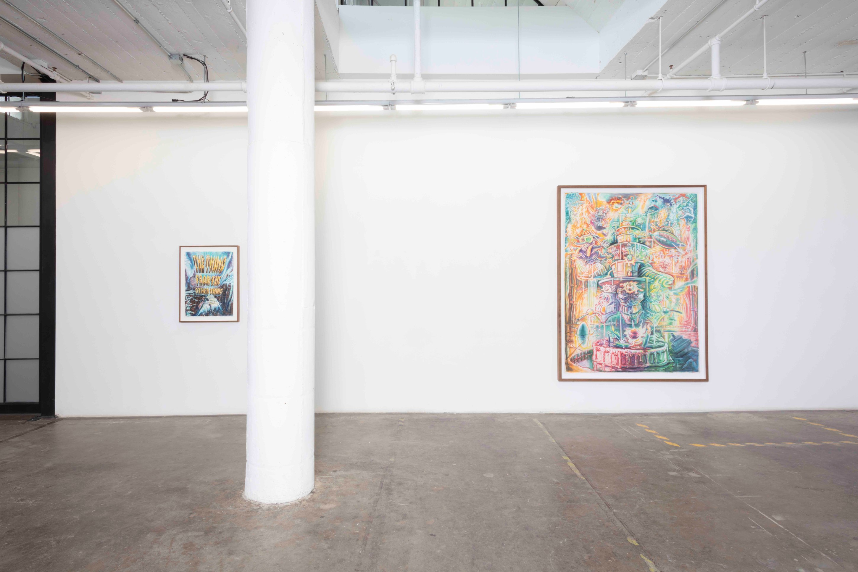 From his new home in Nepal, his Ayahuasca visions melded with the Hindu and Buddhist artworks, totems, and relics he saw in the temples and streets of his surrounding neighborhoods and became, for his practice, a cohesive whole. The high-contrast neons-on-black from his earlier work gave way to pastels on white cotton-rag paper—the better not to see the skin, but to see through it to the shamanic aliens, Gods and deities, sea captains, and massive (yet somehow effeminate) dongs that populate the universes within our bodies. These are The Ayahuasca Drawings.