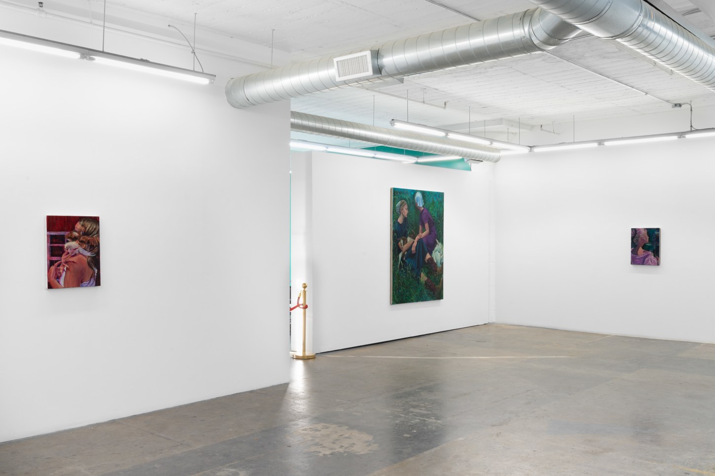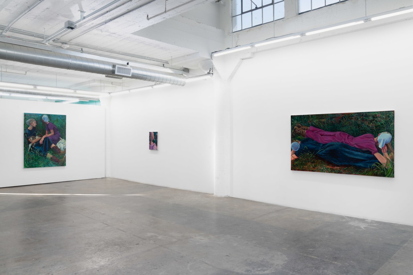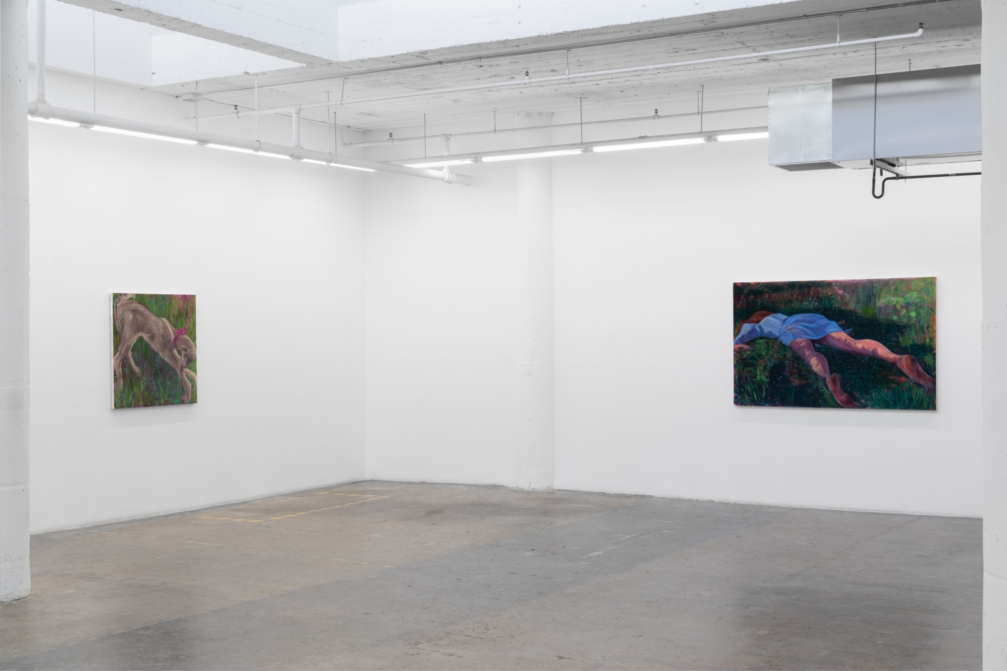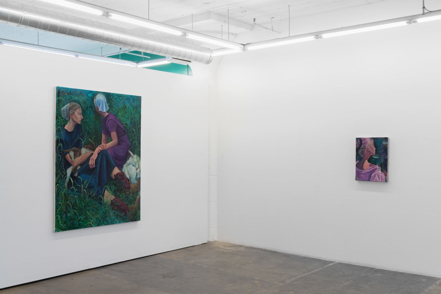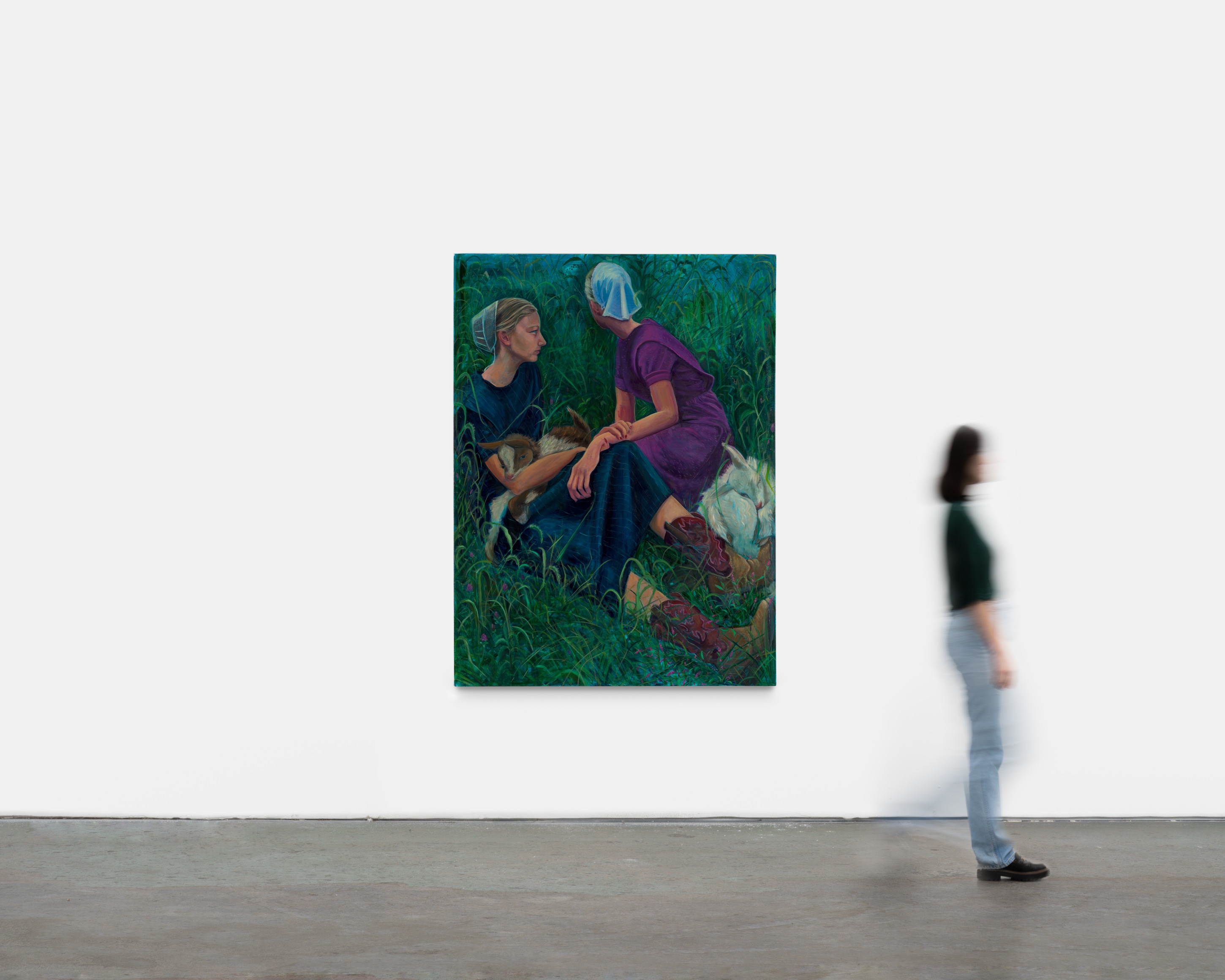 Raised in a small Pennsylvania Dutch community surrounded by farms and the Mennonite faith, Samantha Joy Groff’s work features animals, plants, and female subjects enmeshed in a knot of competing desires. Her practice pits the conservative values of the Pennsylvania Dutch against contemporary ideals of wealth, family, and desire through the female experience. Drawing on the history of rural painters like Andrew Wyeth and Grant Wood, her paintings resist their austere color palettes, stoic figures, and ubiquitous pastoral landscape compositions. Instead, the work indulges in extreme emotional affect, off-kilter colors, and sensual body/land entanglements.