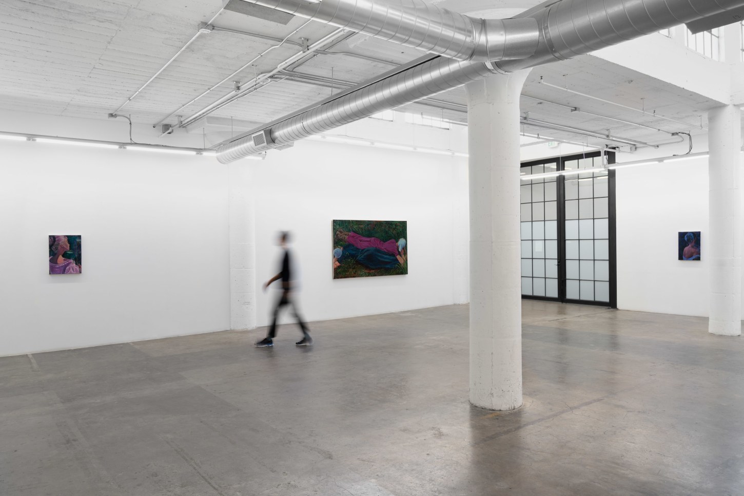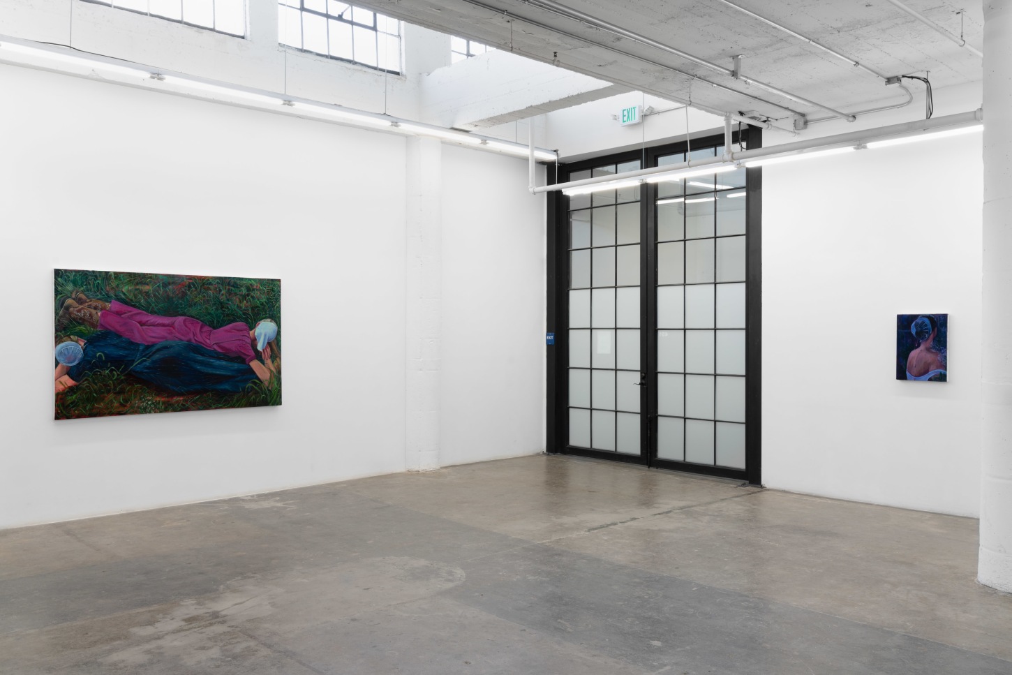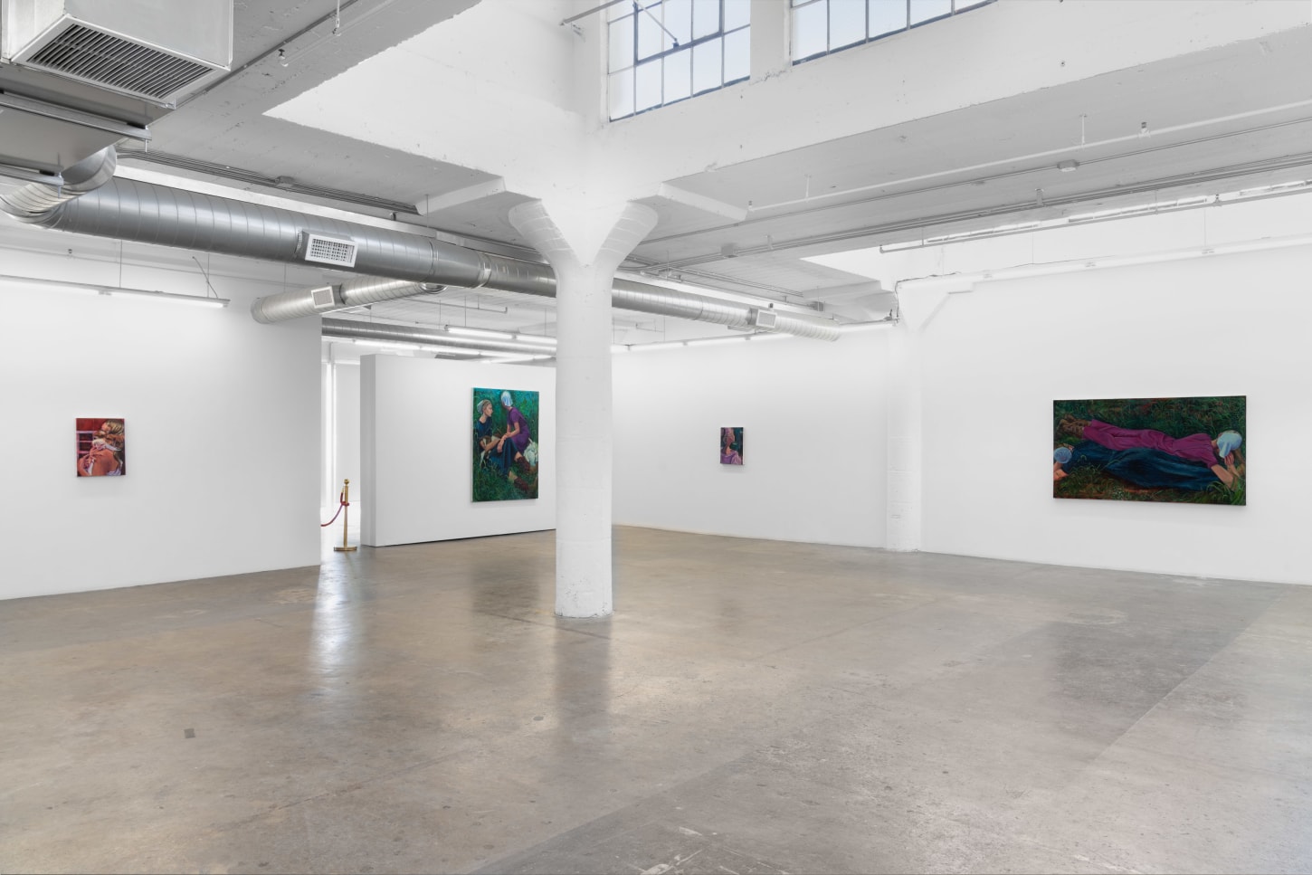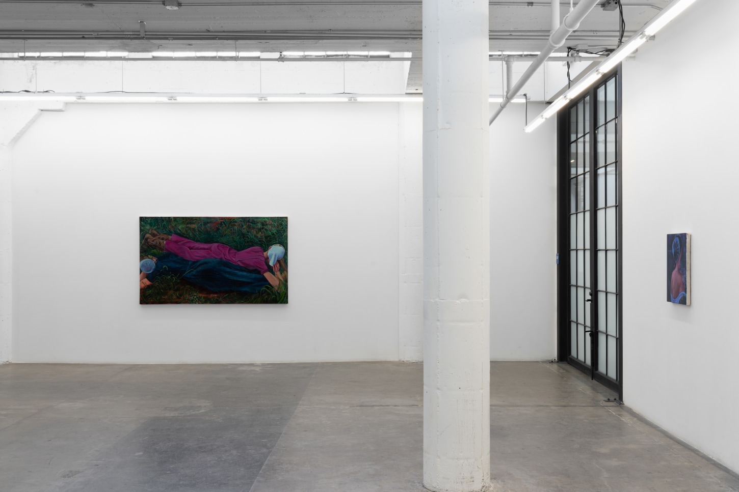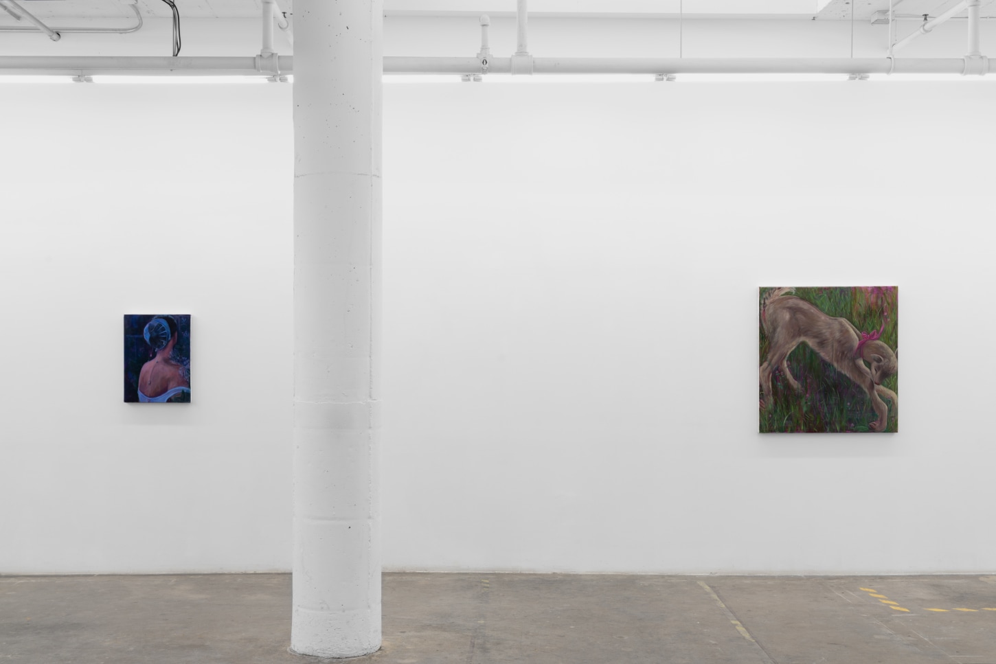 Raised in a small Pennsylvania Dutch community surrounded by farms and the Mennonite faith, Samantha Joy Groff’s work features animals, plants, and female subjects enmeshed in a knot of competing desires. Her practice pits the conservative values of the Pennsylvania Dutch against contemporary ideals of wealth, family, and desire through the female experience. Drawing on the history of rural painters like Andrew Wyeth and Grant Wood, her paintings resist their austere color palettes, stoic figures, and ubiquitous pastoral landscape compositions. Instead, the work indulges in extreme emotional affect, off-kilter colors, and sensual body/land entanglements.
