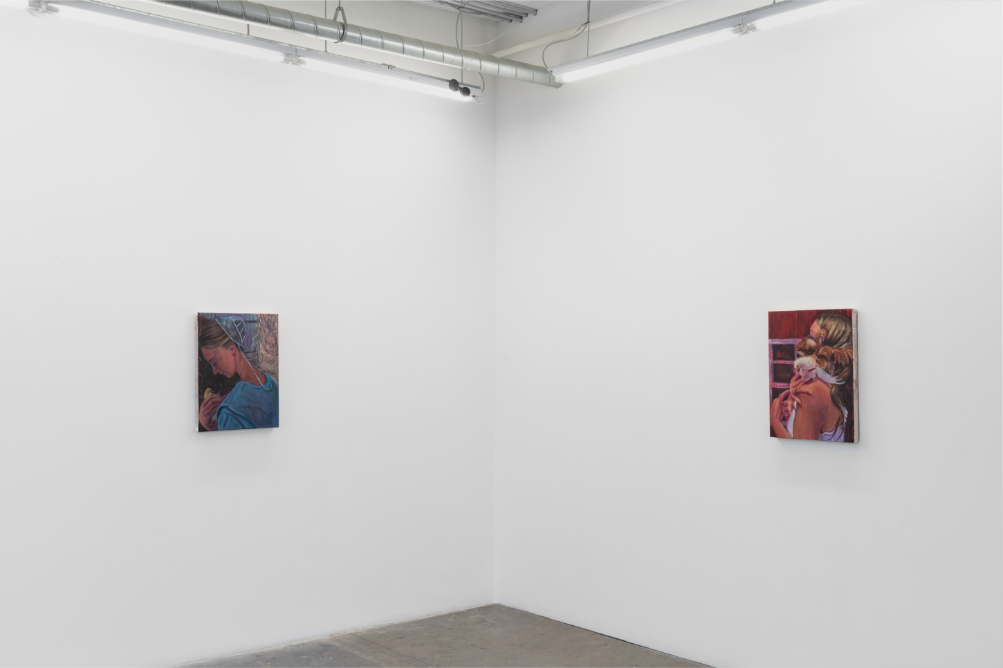Inspired by Mannerist figuration, Groff’s subjects’ elongated limbs and brittle-thin necks indulge in an ambiguity between who these young women are, where they come from, and what they want for their futures. Their downcast stares, coquettish sideways gazes, and subtle sexuality bump up against the modesty of their community and a notion of working-class survivalism, where the body is used to make a living through manual labor. For Groff, the neck becomes an invitation into indulgence, even though her figures do not meet viewers' eyes. The rubbery limbs and false nails indicate a fantasy set in opposition to the realism of the figures portrayed, to symbolize the desire for certain feminine qualities that are negated by the physical labor required in an agriculture industry. Even the animals depicted have an elastic quality that would make them unfit to keep on a working farm.