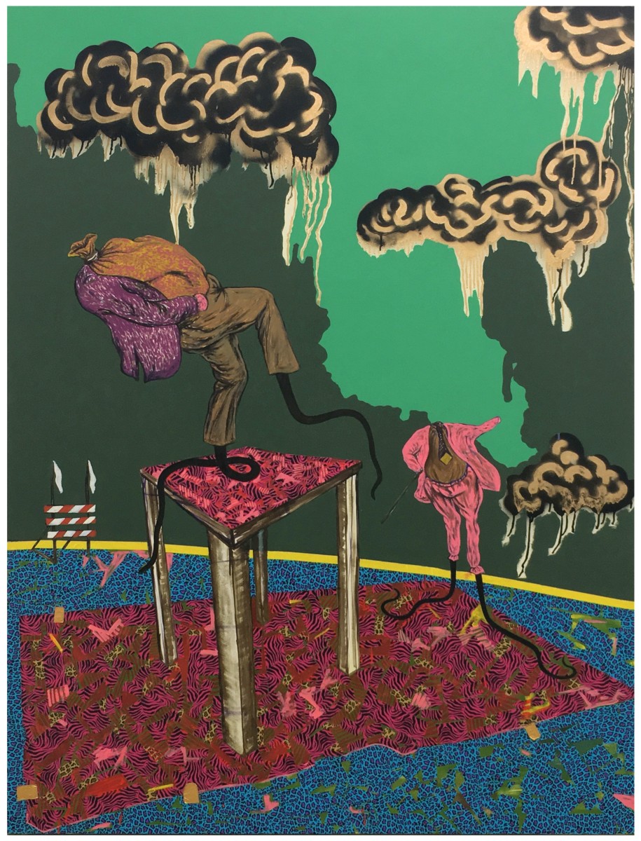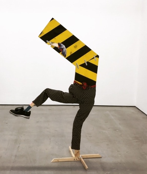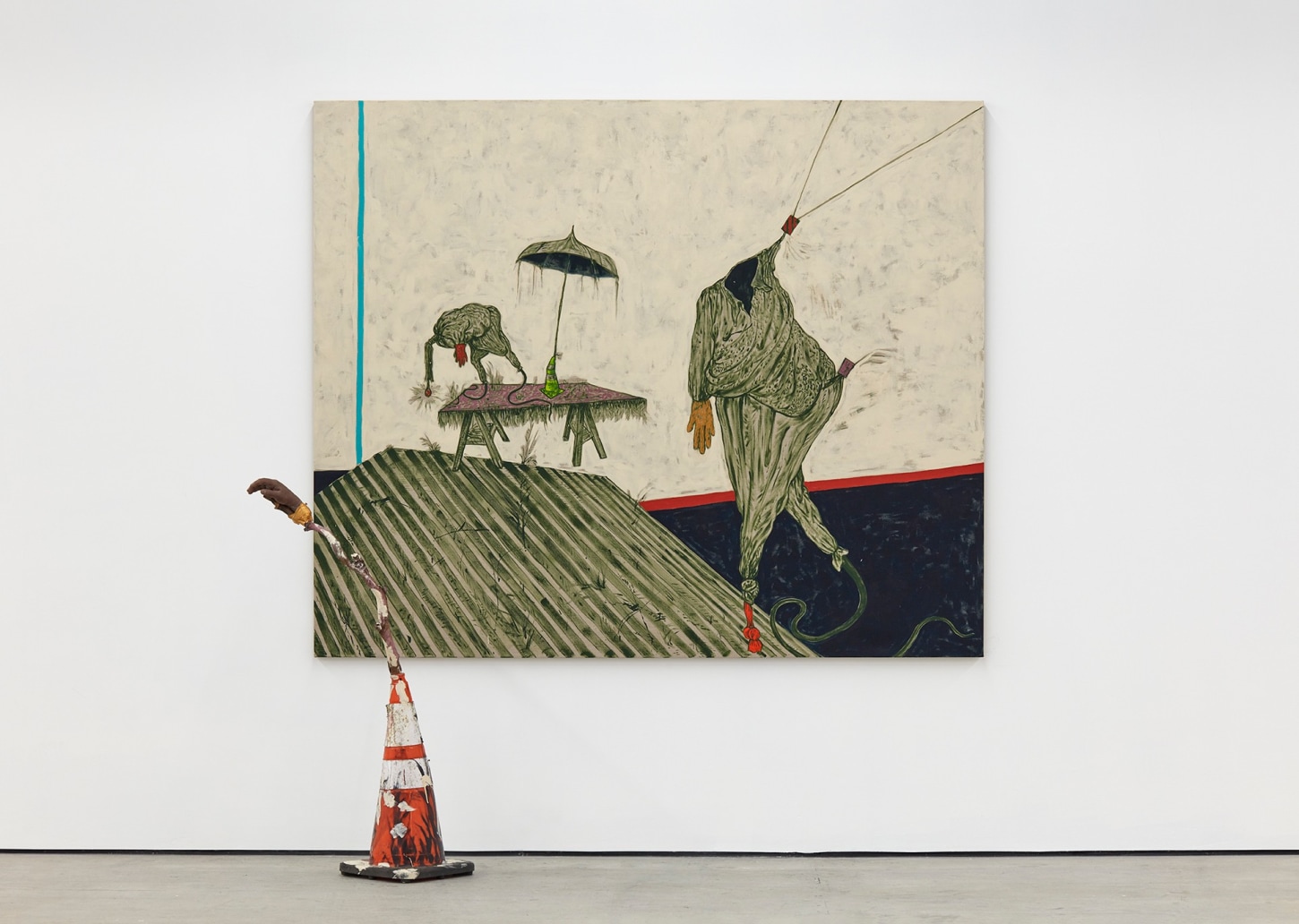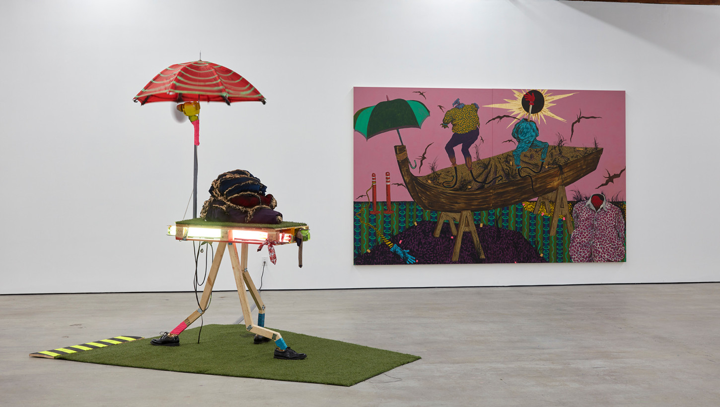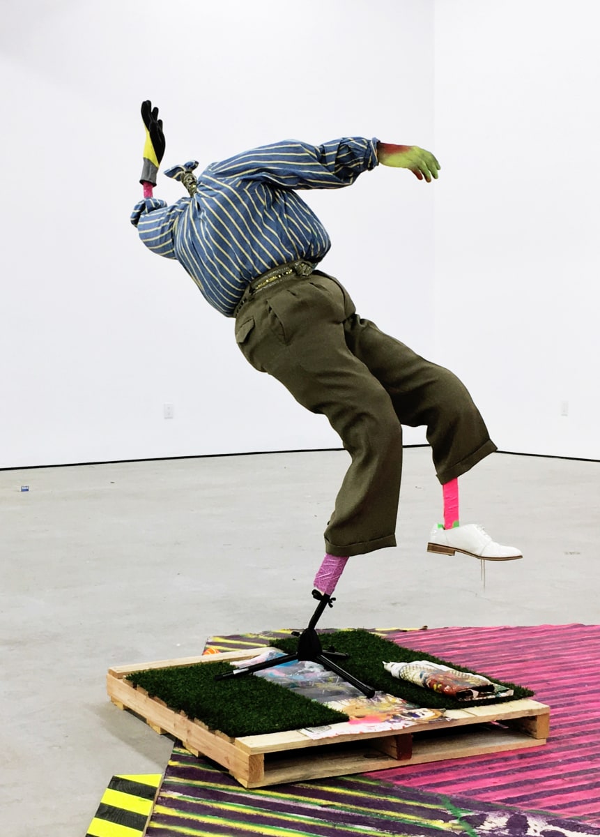 Bhabharosi is an invented term given to the protagonist in this current body of paintings and sculpture. It stems from the words “Barbarous” and “Rose,” combined and pronounced in isiXhosa, my home language. A Bhabharosi is one who embodies elements of beauty and hardship, one who has been rejected, disjointed, disfigured, and discarded after being used for his labour. He finds refuge and diversion by defiantly embodying sartorial elements of the Swenkas, the working-class Zulu men who participate in amateur competitions that are part fashion show and part choreography, the purpose of which is to display one's style and sense of attitude. He has elements of the hero in Amos Tutuola’s The Palm-Wine Drinkard, as well as the fat-bellied Pozzo and his slave, Lucky, from Samuel Beckett’s  Waiting for Godot. In Bhabharosi, the fantastical figure emerges, walking precariously on a surreal journey of recovery, finding his voice and feet, moving through patched open landscapes with transitory barricades or signs monitoring where and how far he can go.
