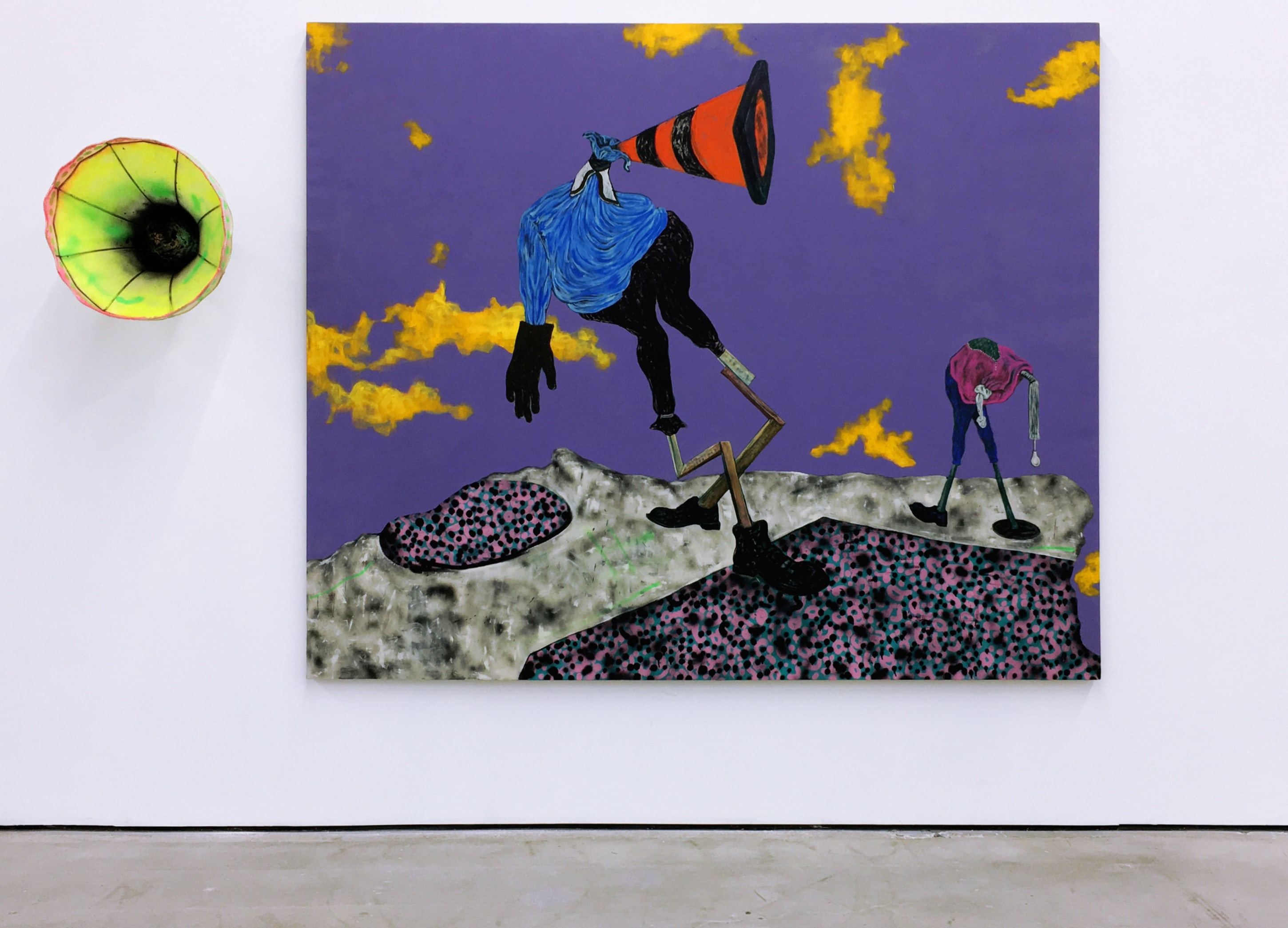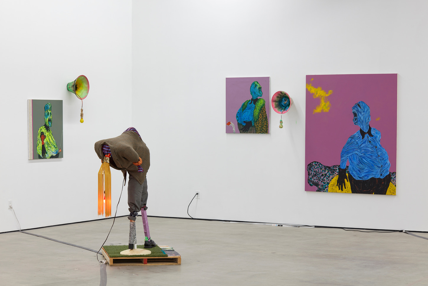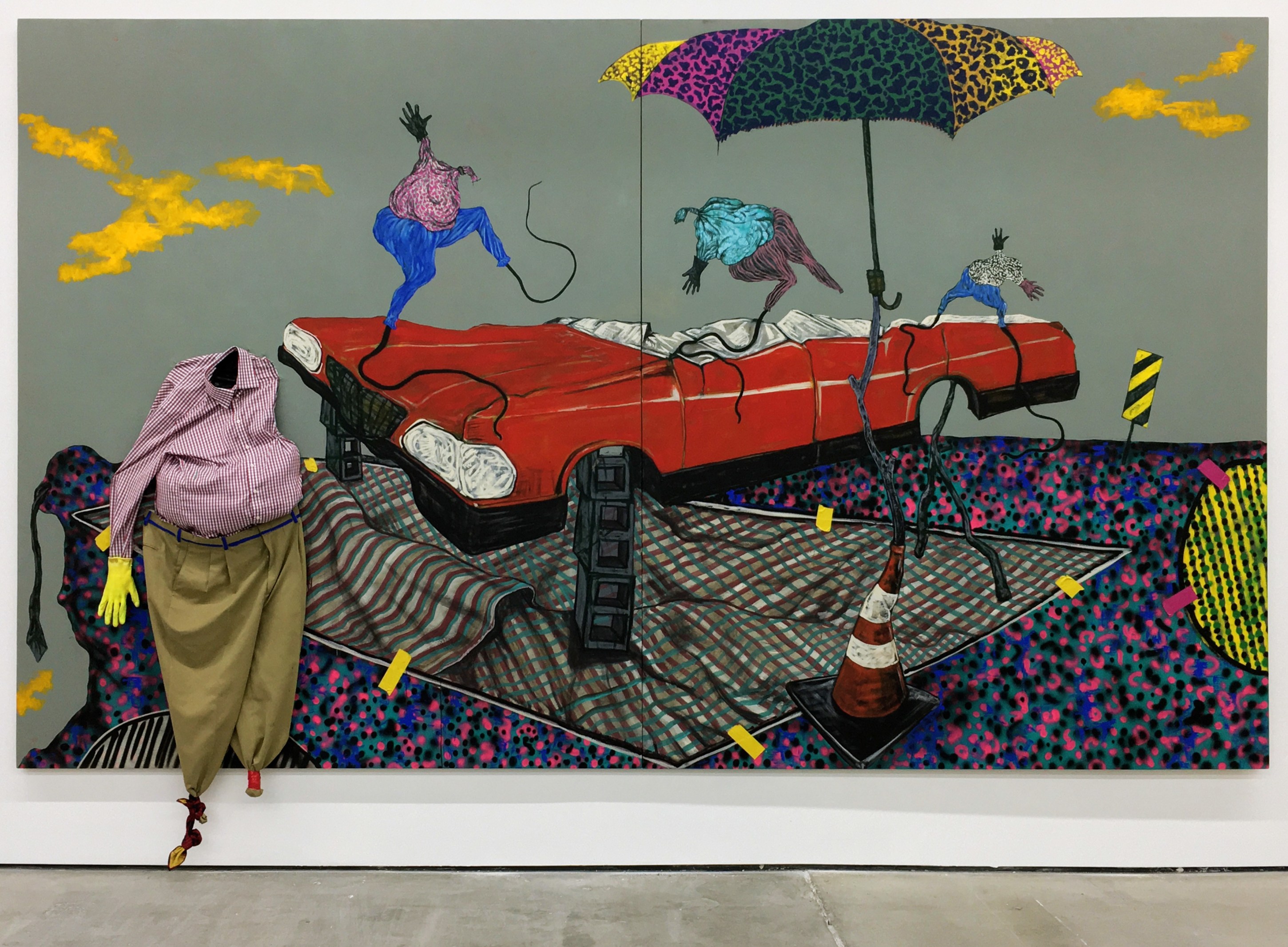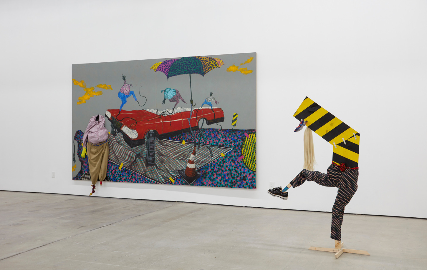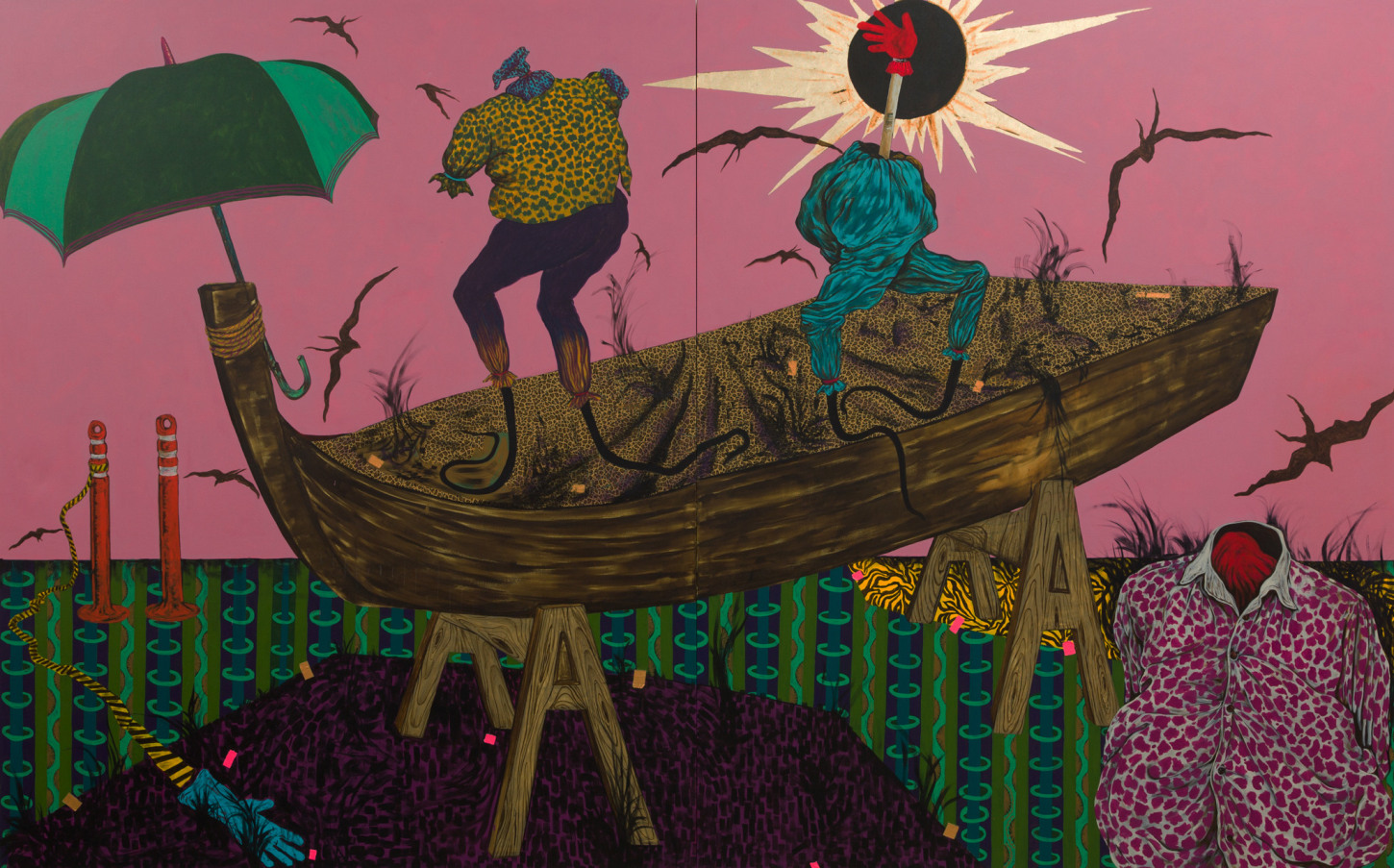 Bhabharosi is an invented term given to the protagonist in this current body of paintings and sculpture. It stems from the words “Barbarous” and “Rose,” combined and pronounced in isiXhosa, my home language. A Bhabharosi is one who embodies elements of beauty and hardship, one who has been rejected, disjointed, disfigured, and discarded after being used for his labour. He finds refuge and diversion by defiantly embodying sartorial elements of the Swenkas, the working-class Zulu men who participate in amateur competitions that are part fashion show and part choreography, the purpose of which is to display one's style and sense of attitude. He has elements of the hero in Amos Tutuola’s The Palm-Wine Drinkard, as well as the fat-bellied Pozzo and his slave, Lucky, from Samuel Beckett’s  Waiting for Godot. In Bhabharosi, the fantastical figure emerges, walking precariously on a surreal journey of recovery, finding his voice and feet, moving through patched open landscapes with transitory barricades or signs monitoring where and how far he can go.