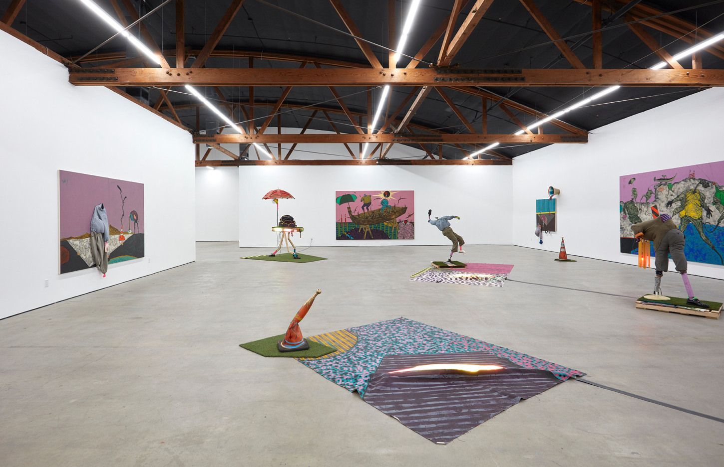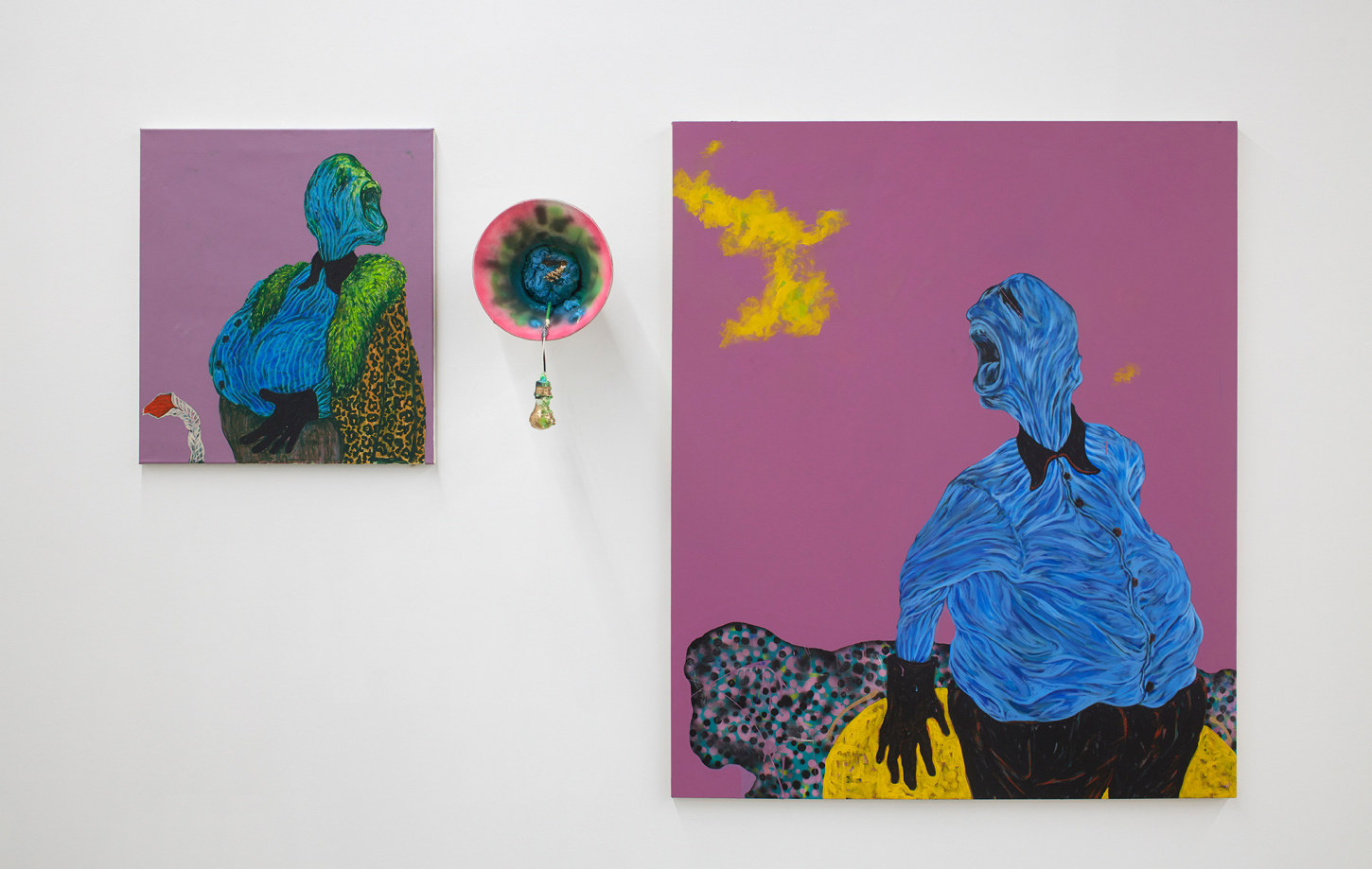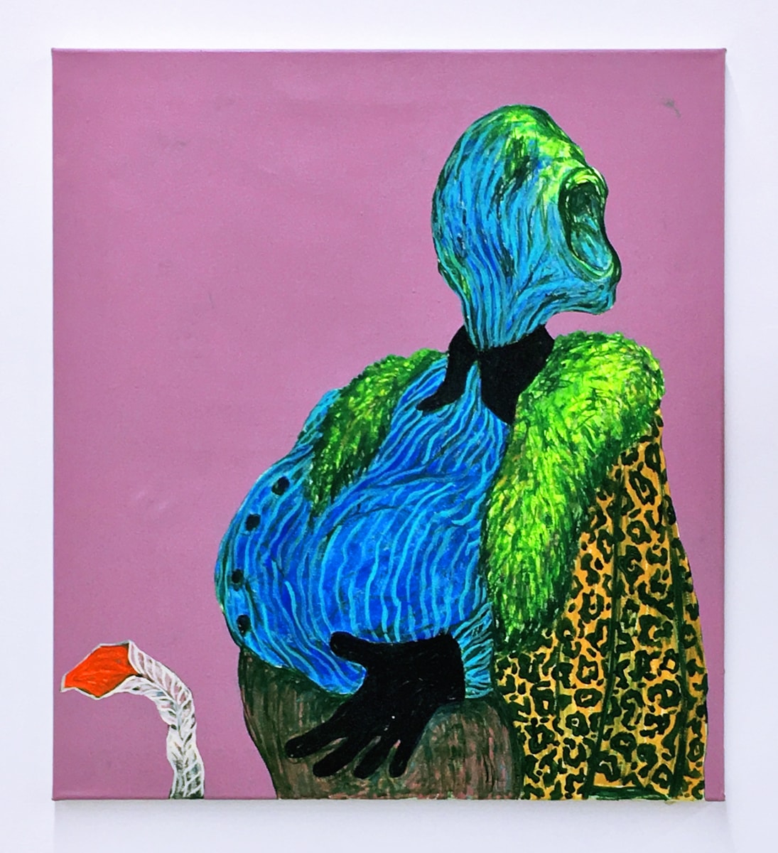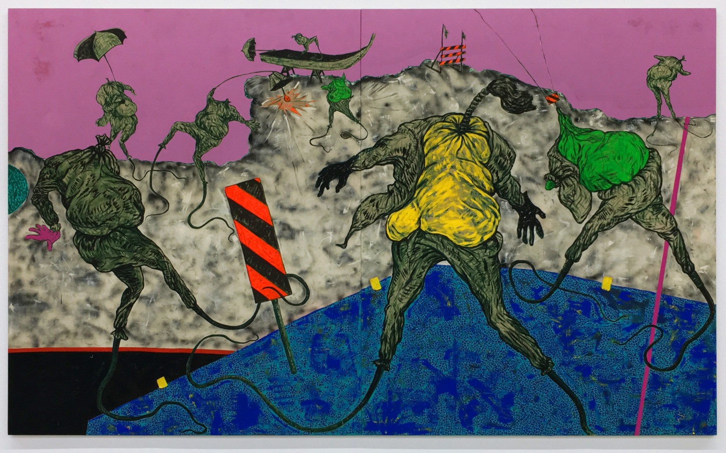 Bhabharosi is an invented term given to the protagonist in this current body of paintings and sculpture. It stems from the words “Barbarous” and “Rose,” combined and pronounced in isiXhosa, my home language. A Bhabharosi is one who embodies elements of beauty and hardship, one who has been rejected, disjointed, disfigured, and discarded after being used for his labour. He finds refuge and diversion by defiantly embodying sartorial elements of the Swenkas, the working-class Zulu men who participate in amateur competitions that are part fashion show and part choreography, the purpose of which is to display one's style and sense of attitude. He has elements of the hero in Amos Tutuola’s The Palm-Wine Drinkard, as well as the fat-bellied Pozzo and his slave, Lucky, from Samuel Beckett’s  Waiting for Godot. In Bhabharosi, the fantastical figure emerges, walking precariously on a surreal journey of recovery, finding his voice and feet, moving through patched open landscapes with transitory barricades or signs monitoring where and how far he can go.