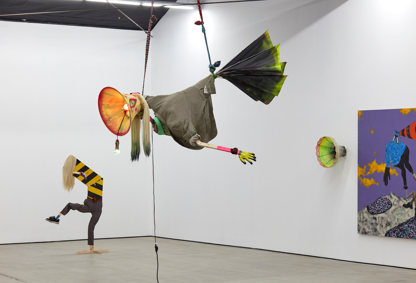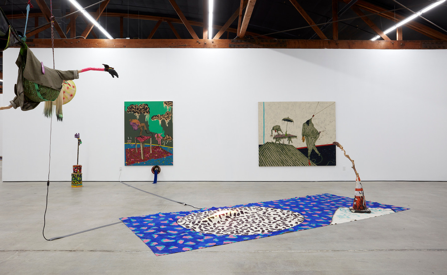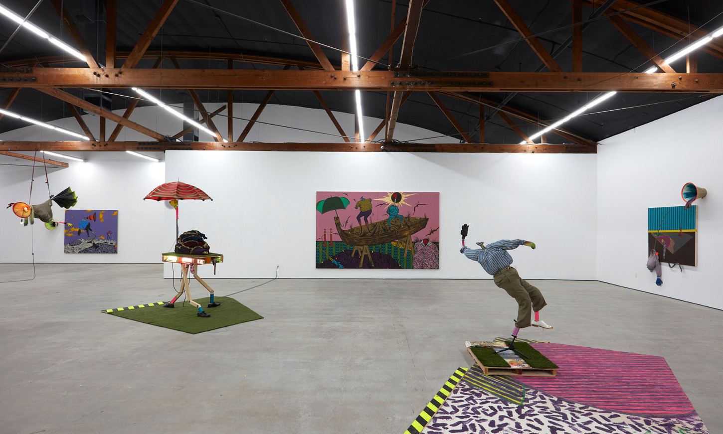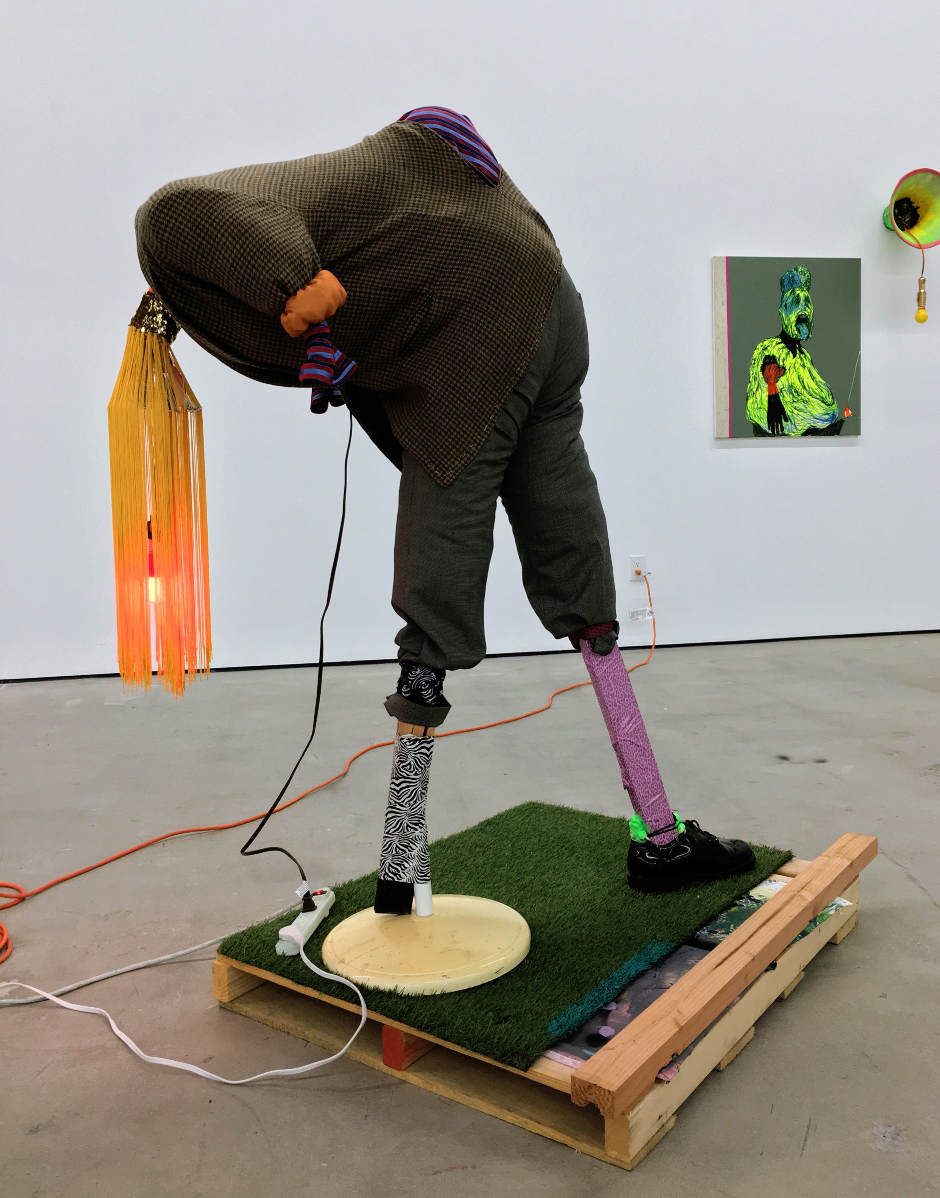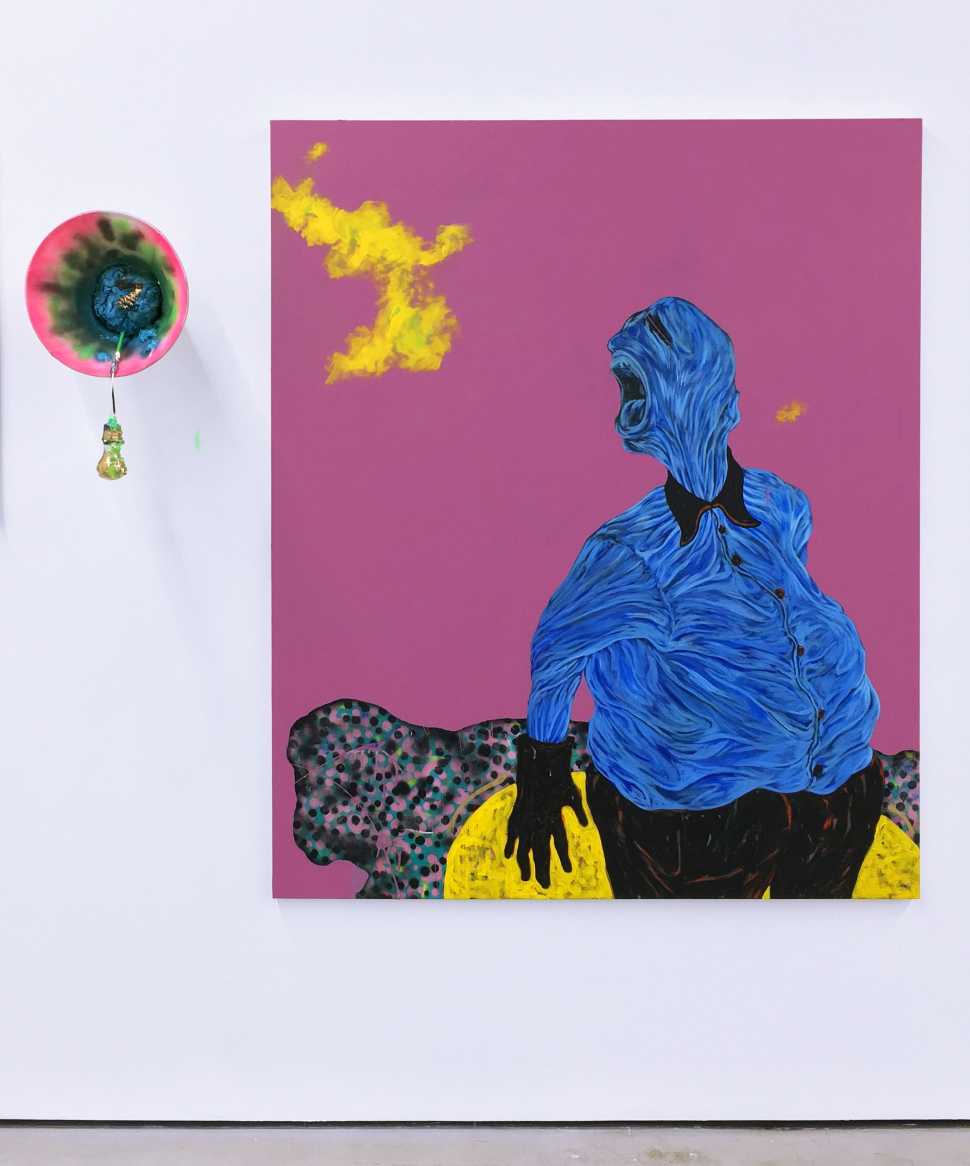 Bhabharosi is an invented term given to the protagonist in this current body of paintings and sculpture. It stems from the words “Barbarous” and “Rose,” combined and pronounced in isiXhosa, my home language. A Bhabharosi is one who embodies elements of beauty and hardship, one who has been rejected, disjointed, disfigured, and discarded after being used for his labour. He finds refuge and diversion by defiantly embodying sartorial elements of the Swenkas, the working-class Zulu men who participate in amateur competitions that are part fashion show and part choreography, the purpose of which is to display one's style and sense of attitude. He has elements of the hero in Amos Tutuola’s The Palm-Wine Drinkard, as well as the fat-bellied Pozzo and his slave, Lucky, from Samuel Beckett’s  Waiting for Godot. In Bhabharosi, the fantastical figure emerges, walking precariously on a surreal journey of recovery, finding his voice and feet, moving through patched open landscapes with transitory barricades or signs monitoring where and how far he can go.