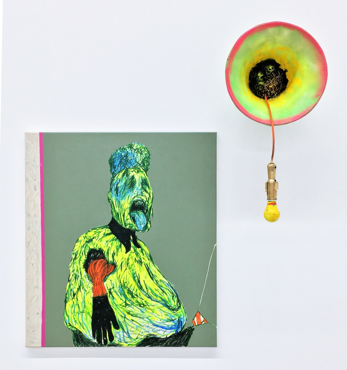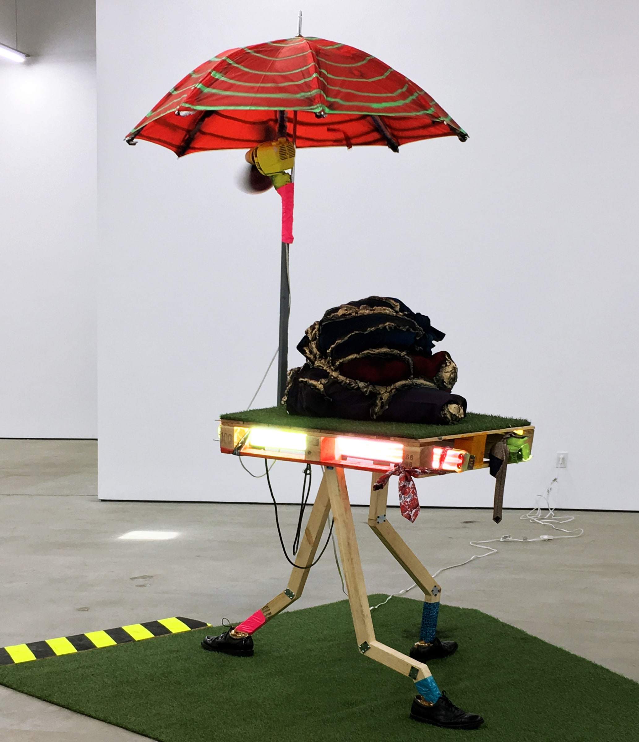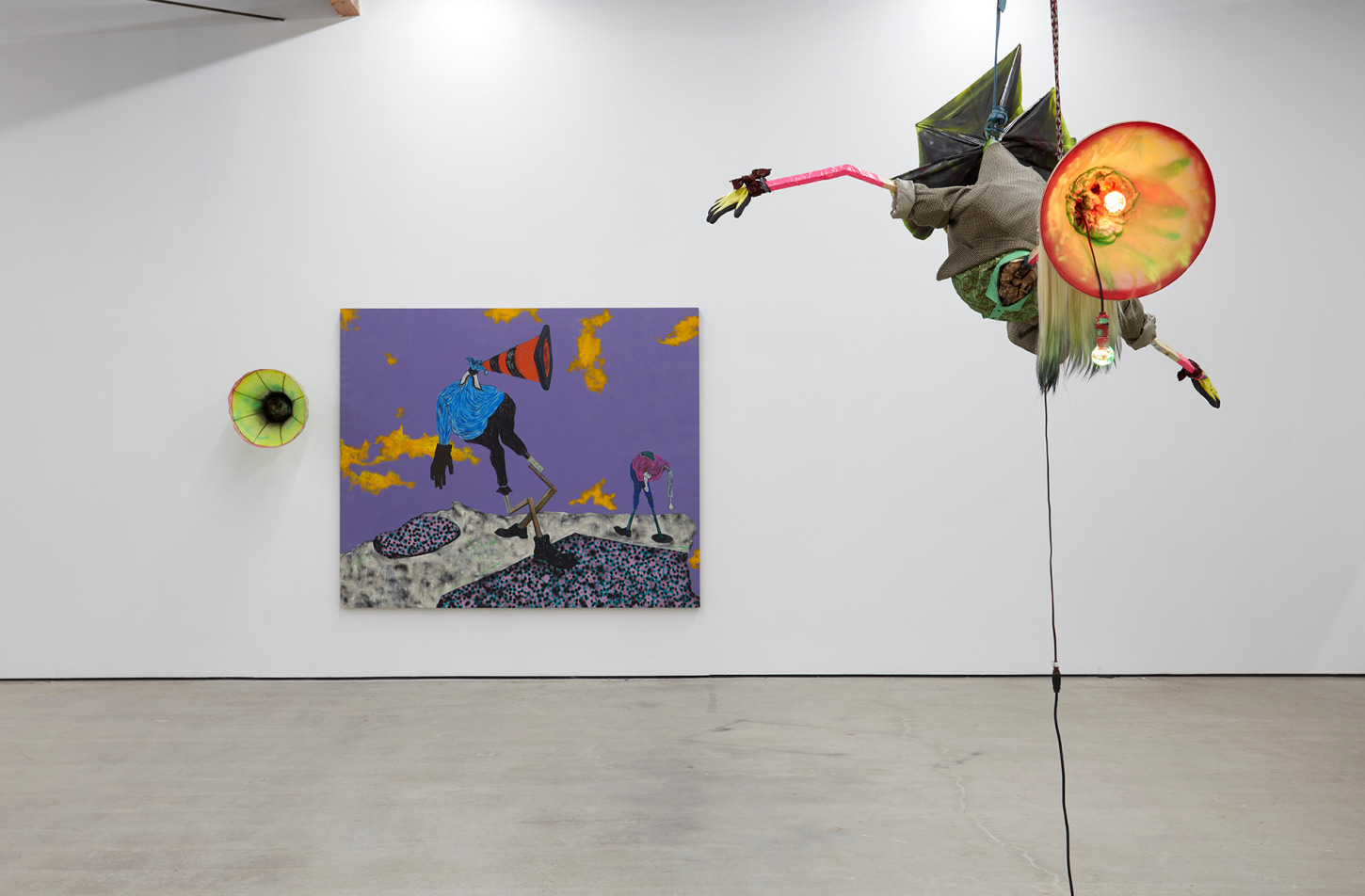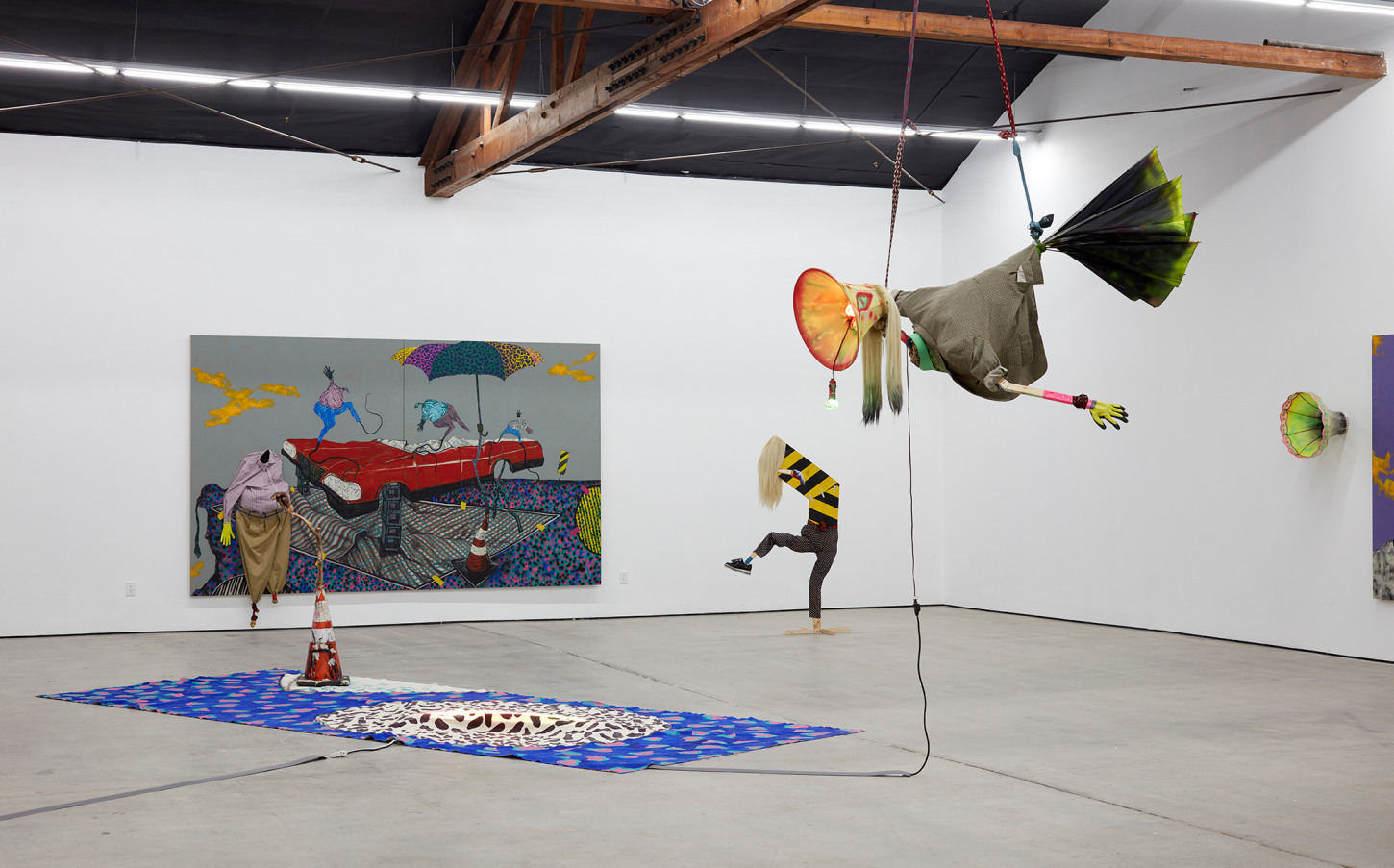 Bhabharosi is an invented term given to the protagonist in this current body of paintings and sculpture. It stems from the words “Barbarous” and “Rose,” combined and pronounced in isiXhosa, my home language. A Bhabharosi is one who embodies elements of beauty and hardship, one who has been rejected, disjointed, disfigured, and discarded after being used for his labour. He finds refuge and diversion by defiantly embodying sartorial elements of the Swenkas, the working-class Zulu men who participate in amateur competitions that are part fashion show and part choreography, the purpose of which is to display one's style and sense of attitude. He has elements of the hero in Amos Tutuola’s The Palm-Wine Drinkard, as well as the fat-bellied Pozzo and his slave, Lucky, from Samuel Beckett’s  Waiting for Godot. In Bhabharosi, the fantastical figure emerges, walking precariously on a surreal journey of recovery, finding his voice and feet, moving through patched open landscapes with transitory barricades or signs monitoring where and how far he can go.