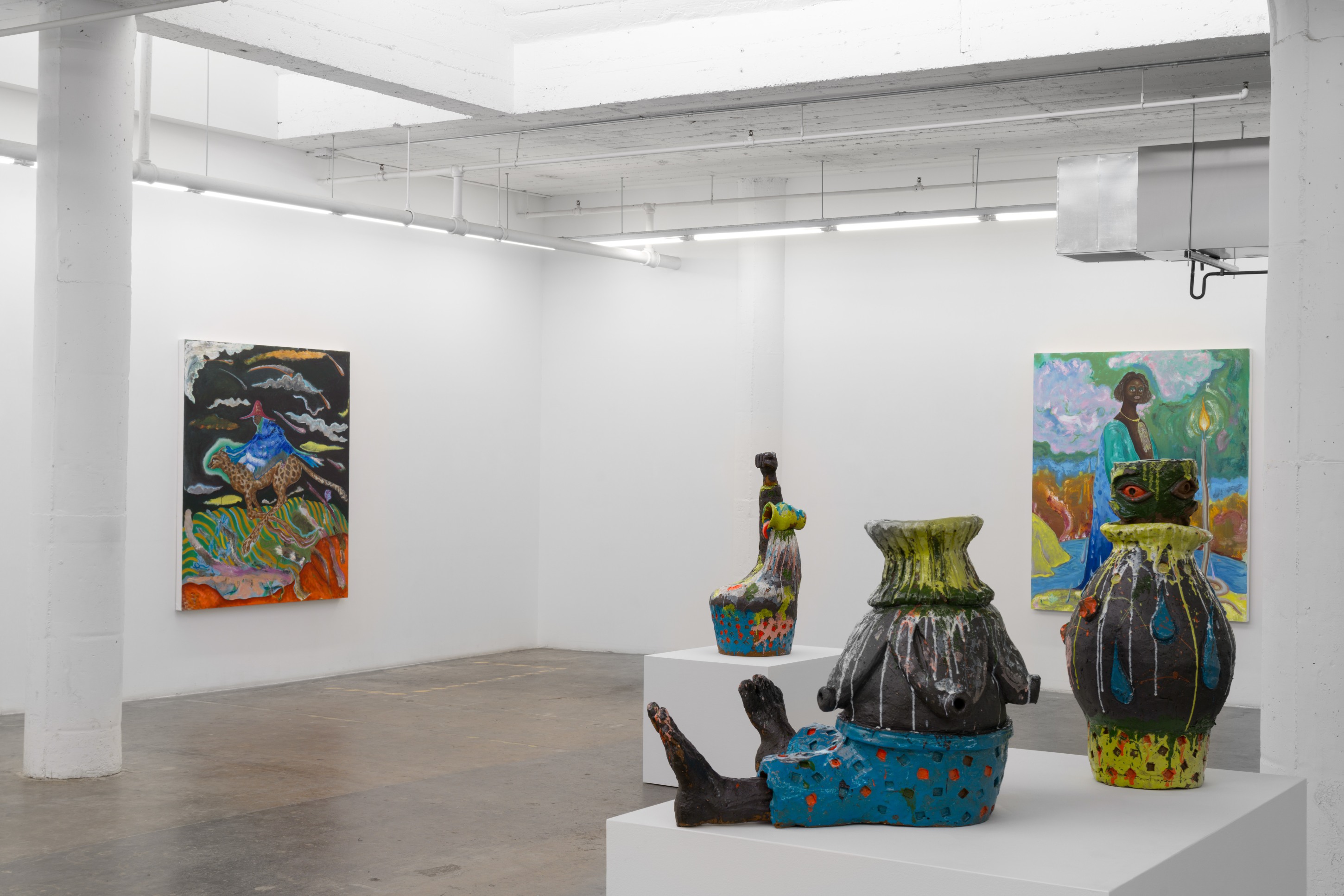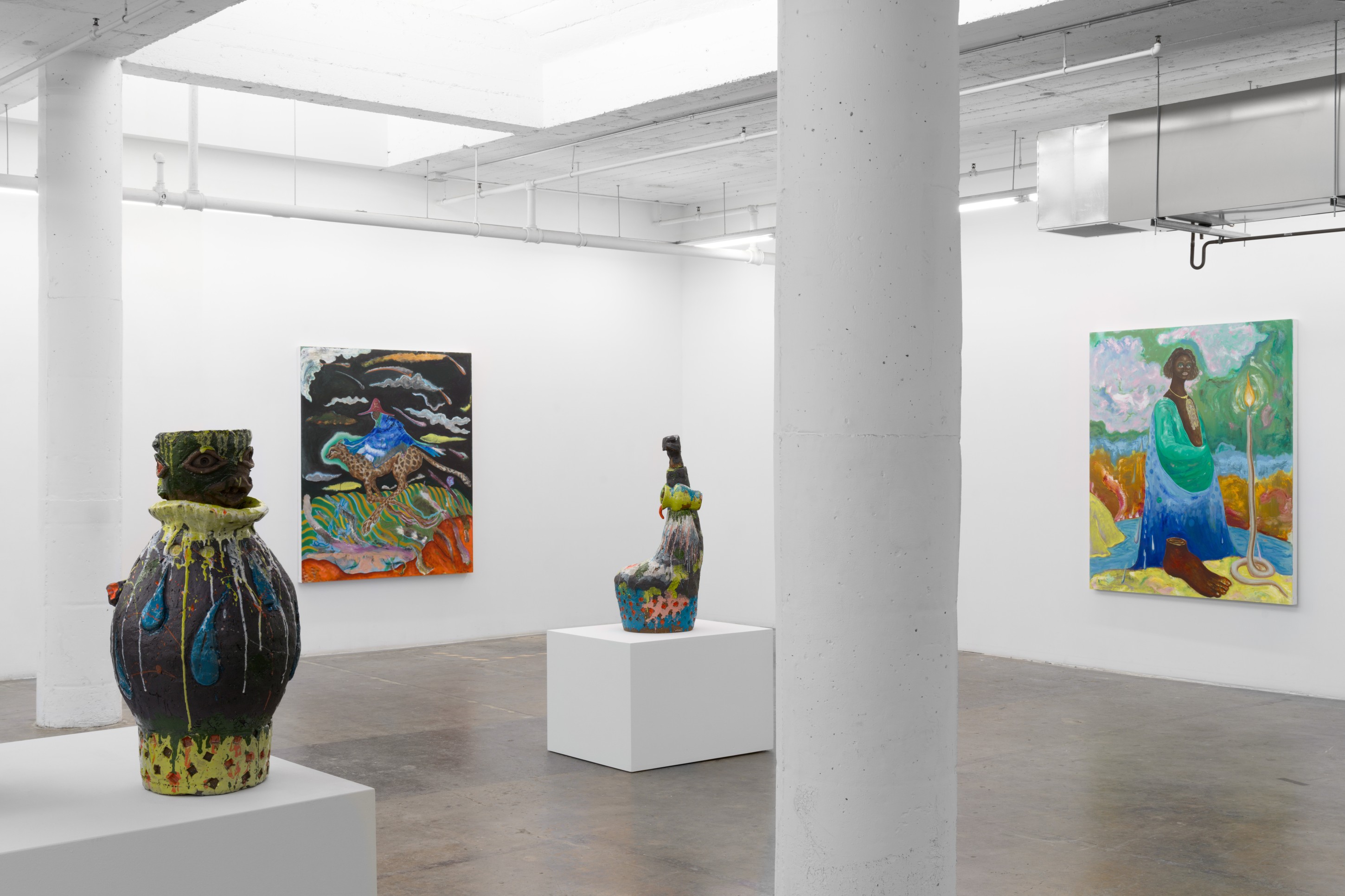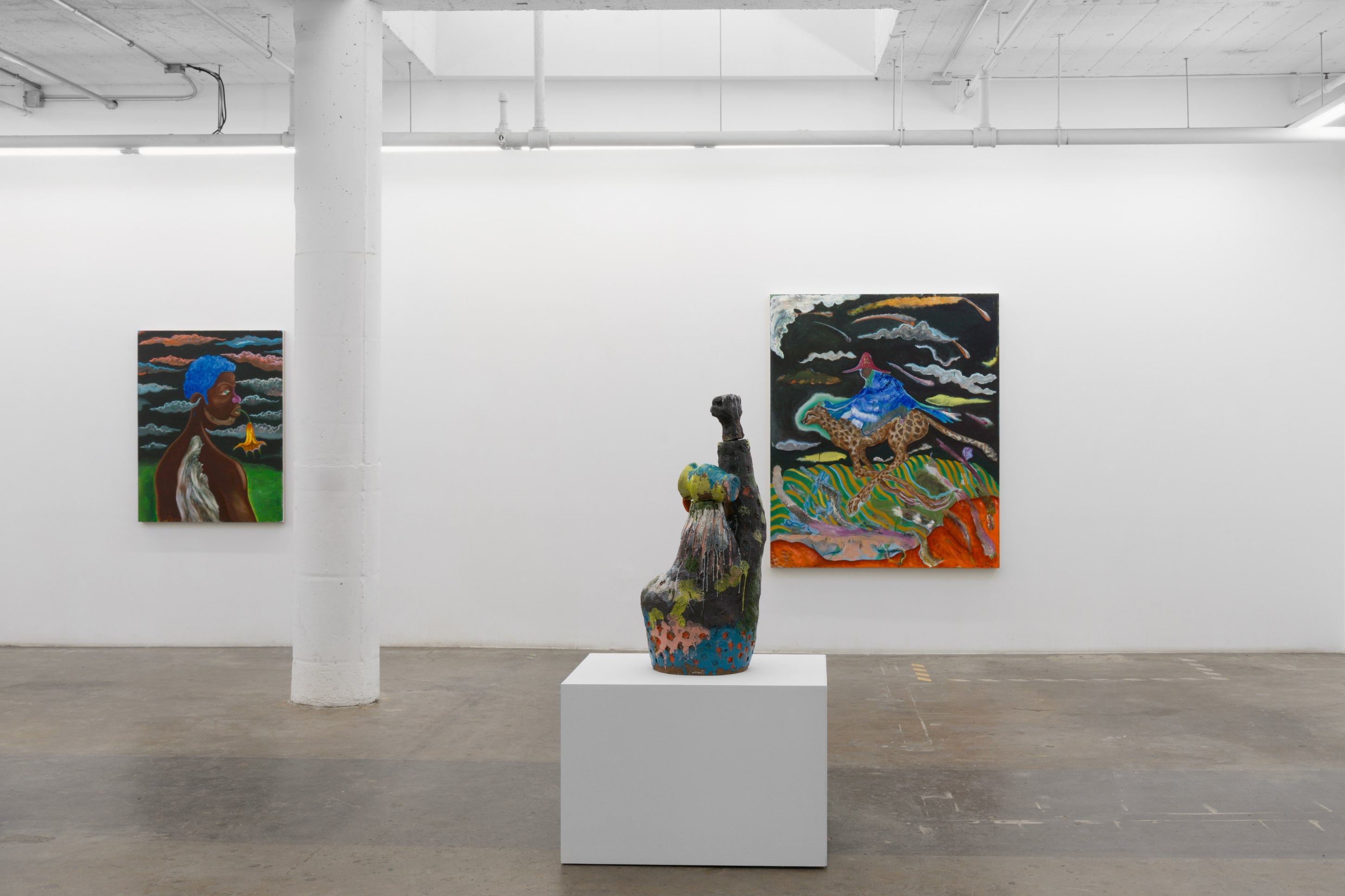 Ndzube’s personal Isithunywa have led his practice in new directions as well. While the bodies that populate his canvases and sculpture are clearly related to those from prior series, their flesh and blood are divined from oil paints and ceramics, both firsts for the artist. The new mediums are mediums themselves, bringing a vivid ruddiness to the artist’s unique methods of transposing narrative and allegory.