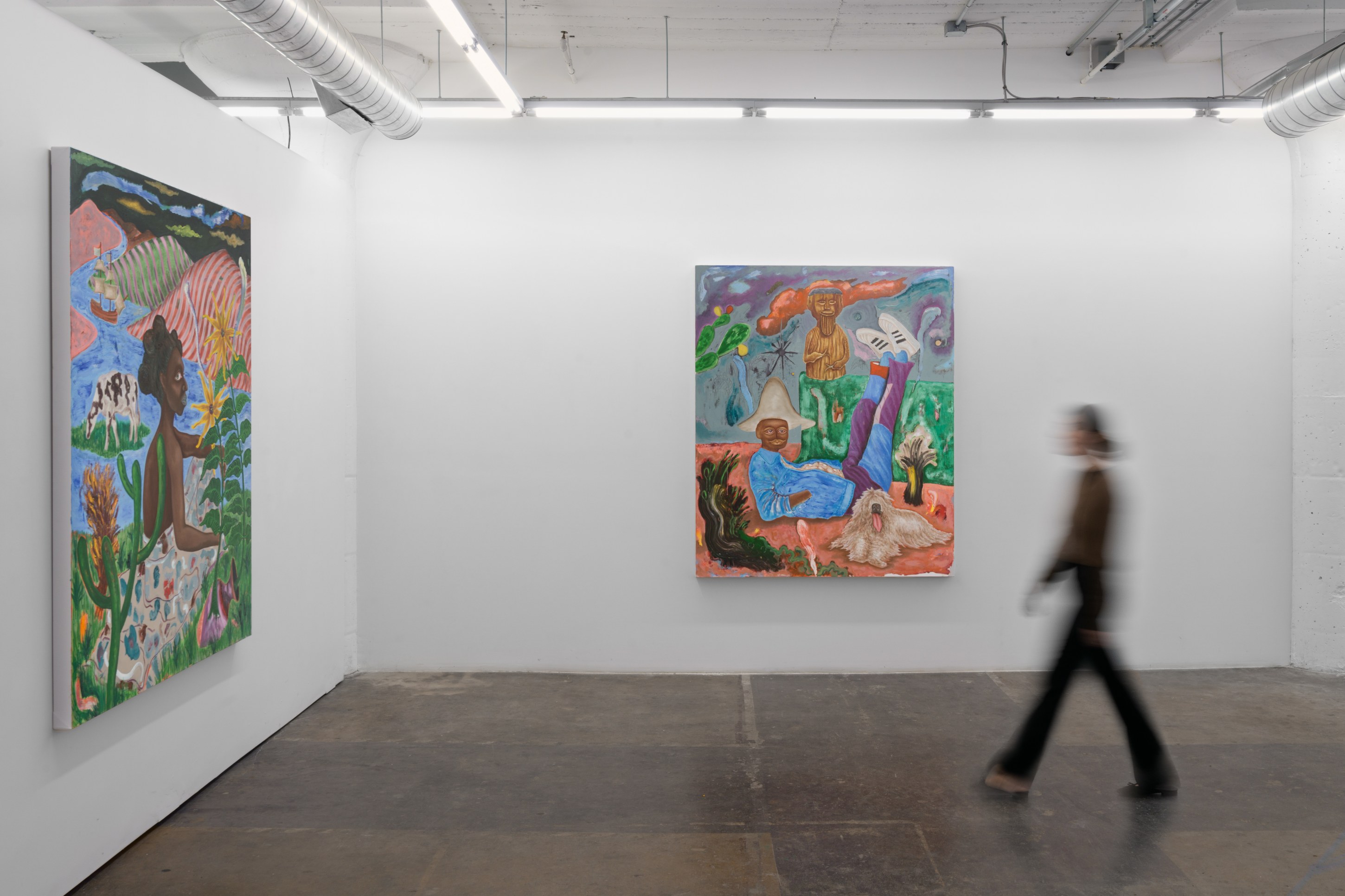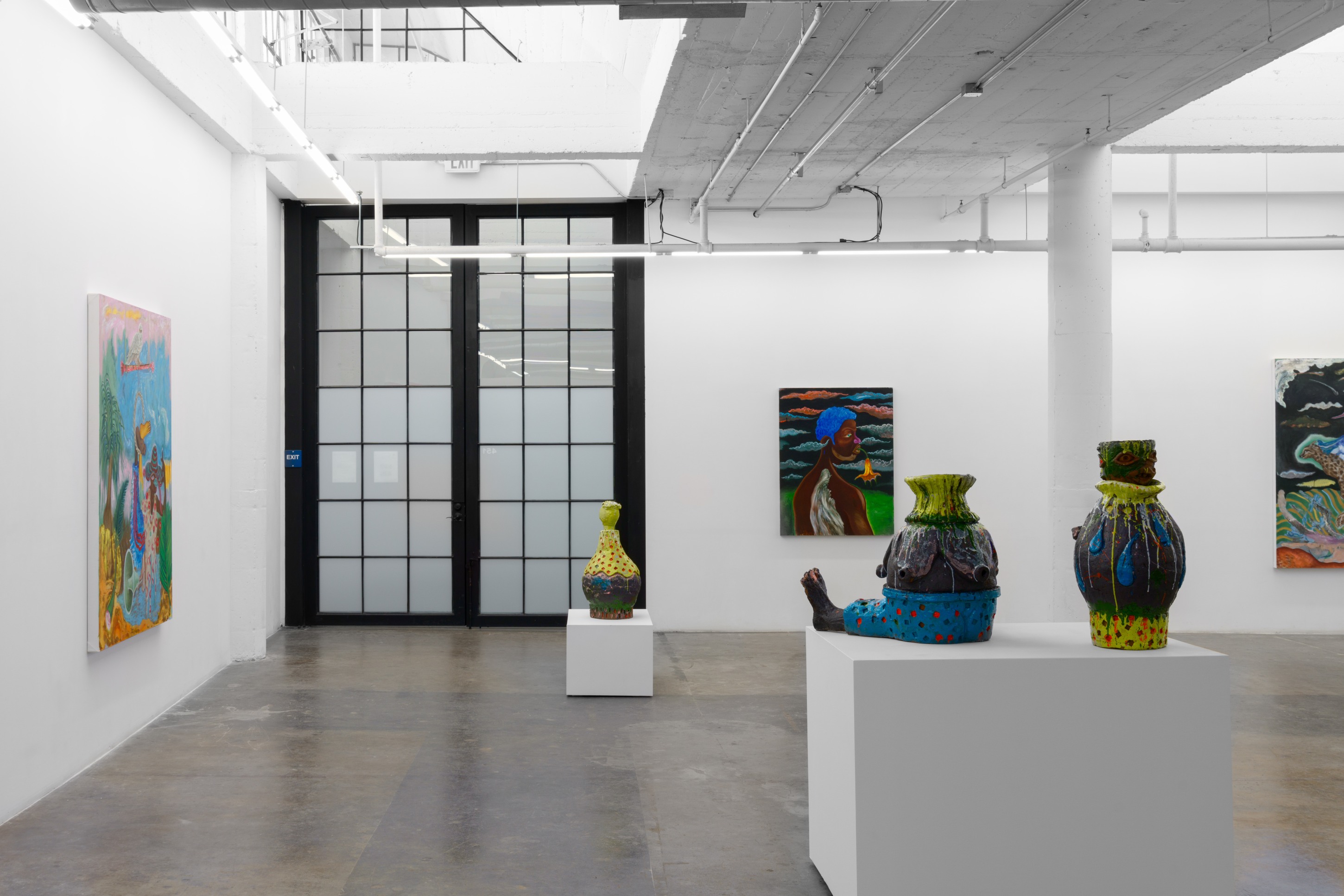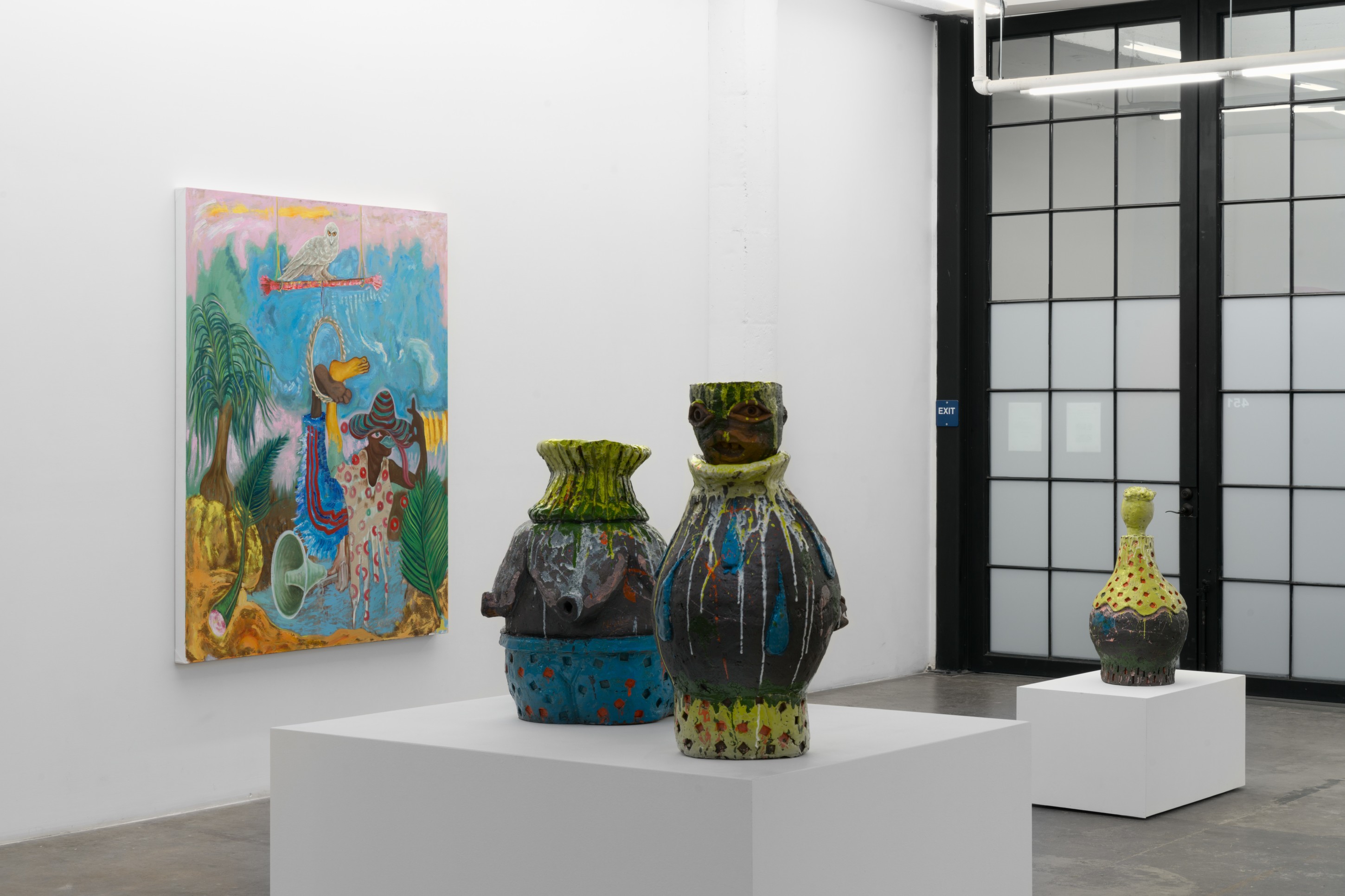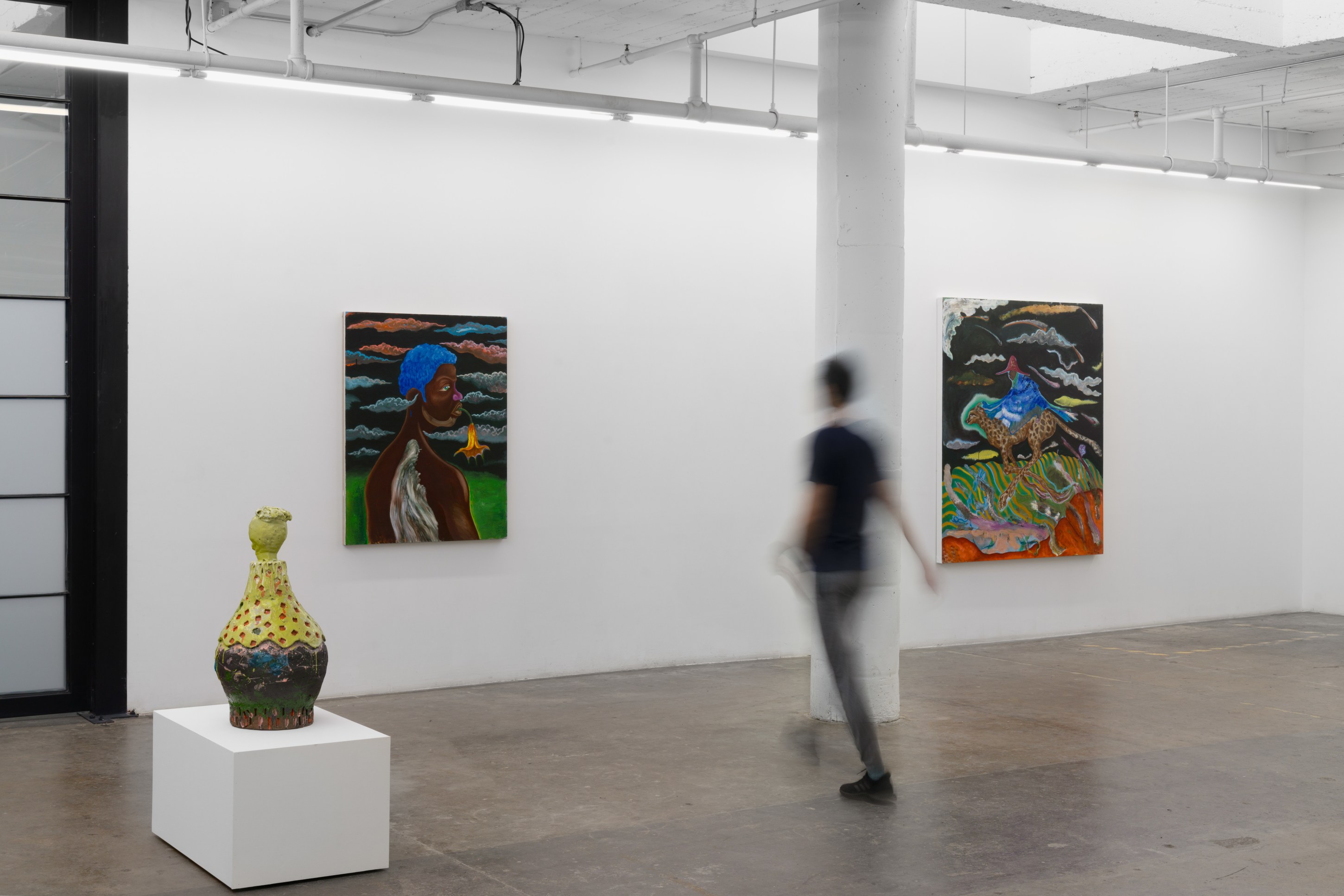 Ndzube’s personal Isithunywa have led his practice in new directions as well. While the bodies that populate his canvases and sculpture are clearly related to those from prior series, their flesh and blood are divined from oil paints and ceramics, both firsts for the artist. The new mediums are mediums themselves, bringing a vivid ruddiness to the artist’s unique methods of transposing narrative and allegory.