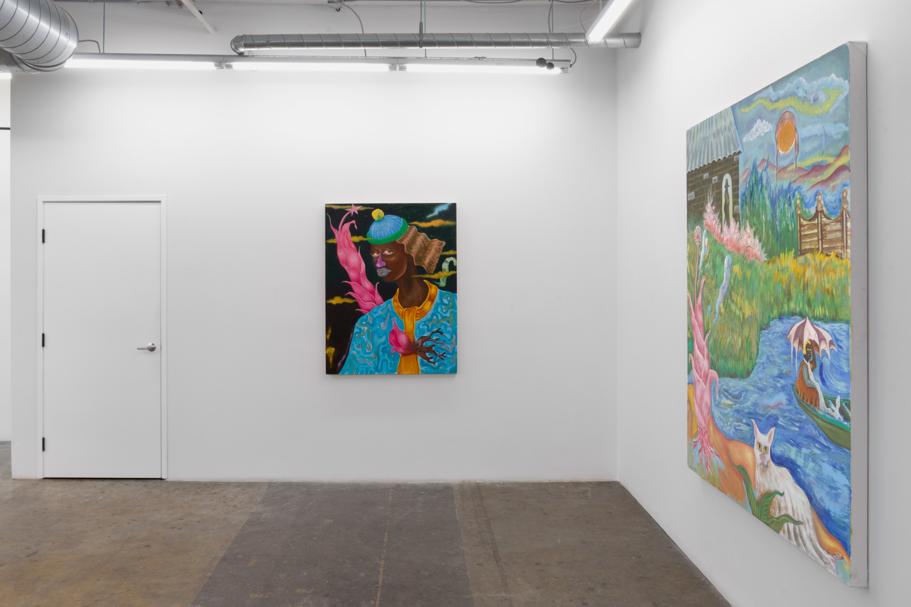 In Isithunywa so Moya, Simphiwe Ndzube’s fifth solo exhibition with Nicodim, Isithunywa are mystical beings that serve as messengers and mediators between the physical and spiritual realms. This body of work casts the artist’s inspiration as Isithunywa, forces he harnesses to pull his practice to new frontiers with his hands, eyes, and heart as vessels. The characters he channels find themselves in varying states of transition: in Gxarha River – 1856, 2022, a faulty Xhosa prophetess has a vision that she believes will lead her people to freedom, but instead brings famine and death; in The Swing, 2022, an owl rocks a clownish figure from a trapeze, dangling him above a body of water either in good humor or as torturee for some crime committed; The Great Mother, 2022, lights a candle, chasing the night away.
