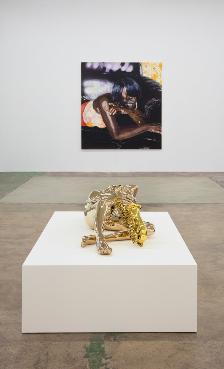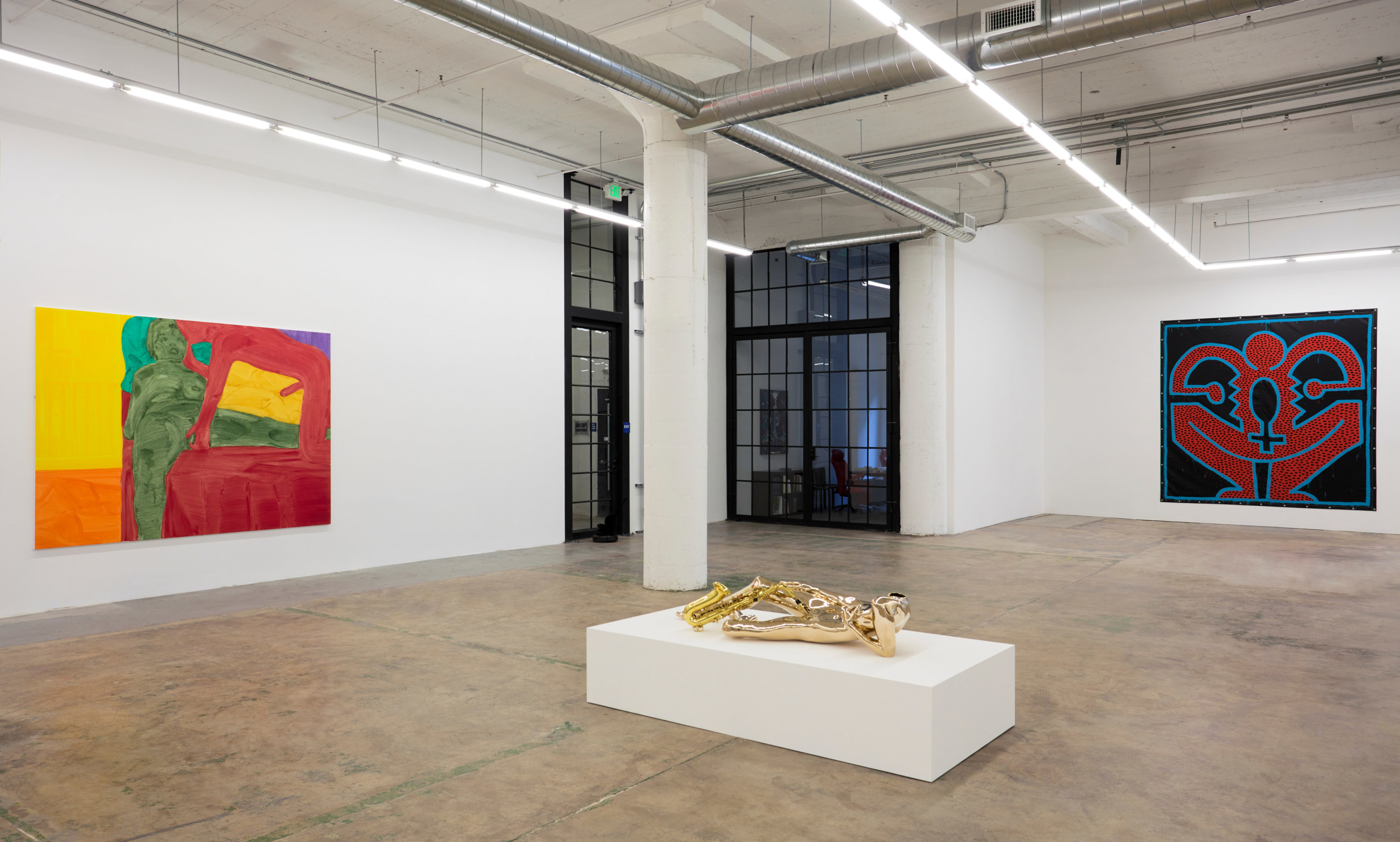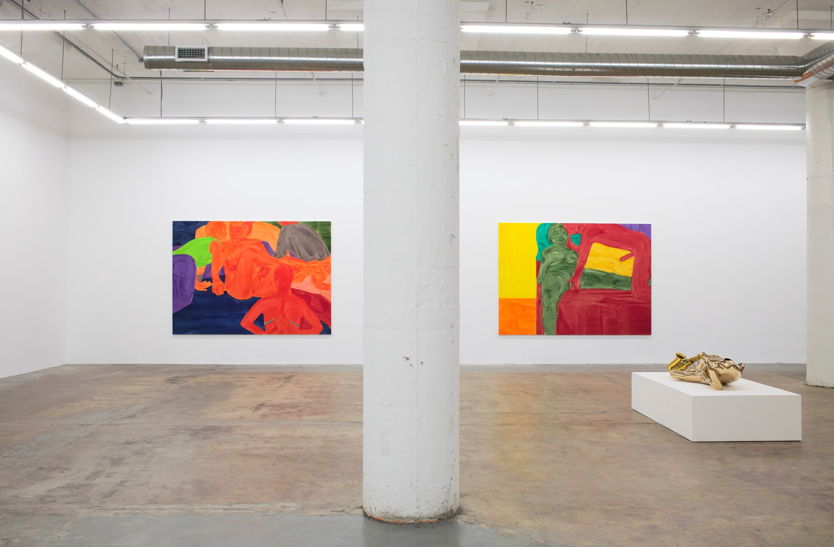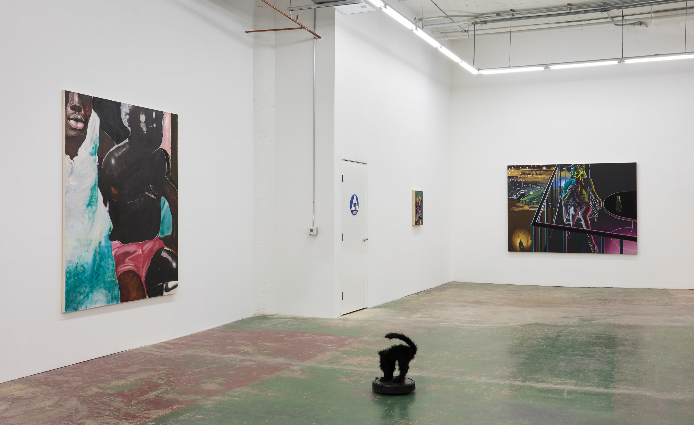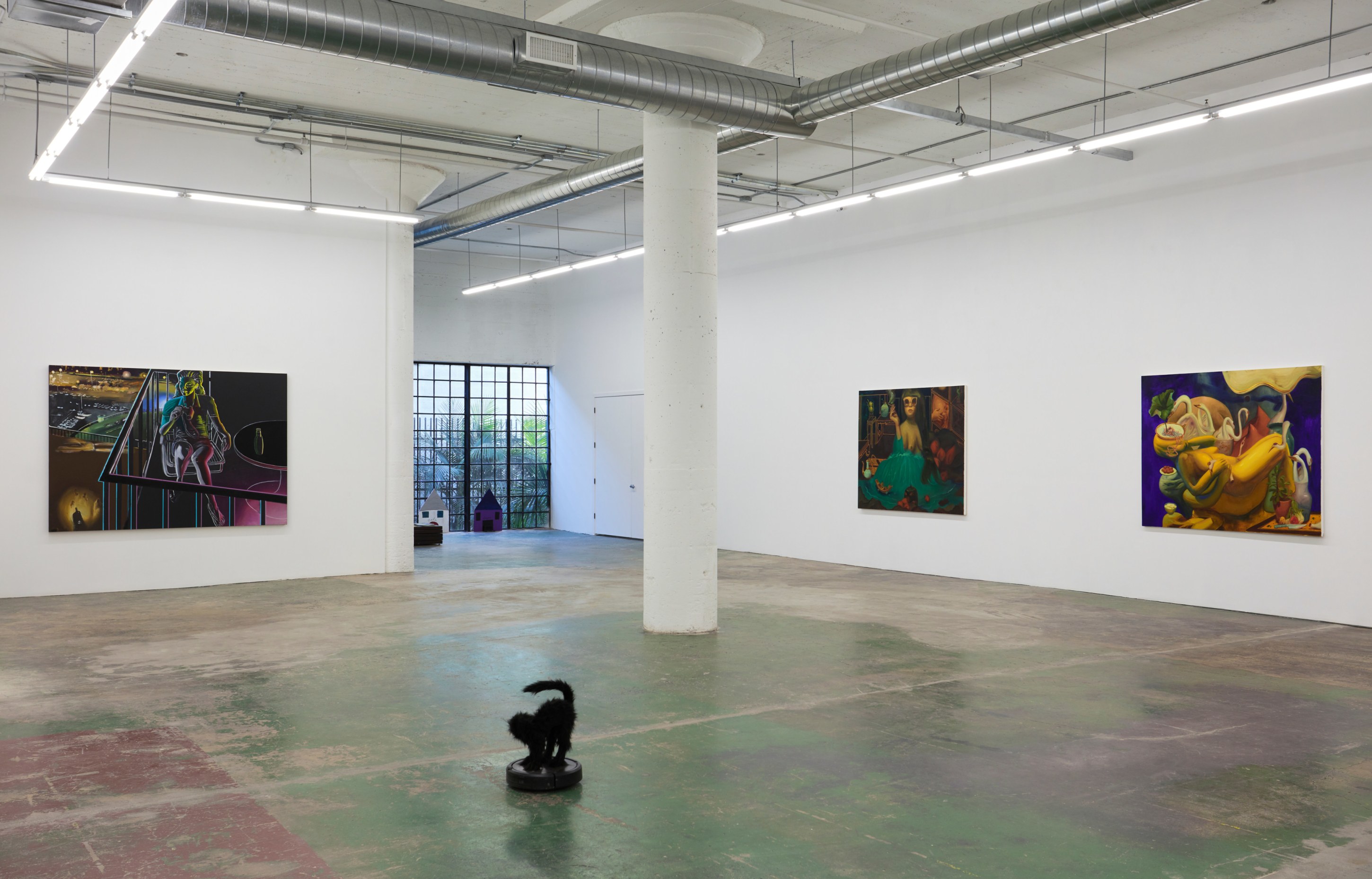 SKIN STEALERS is an exhibition of figurative artists who inhabit the bodies of others, documenting, bearing witness to, and forcing themselves into their subjects’ more intimate and occasionally dangerous behaviors. The exhibition emerges from the respective wombs of two large paintings: Keith Haring’s massive, pregnant female form, and Hugo Wilson’s Boschian (or perhaps Rube Goldbergian) machination of an organic, sexless conception and birth. Isabelle Albuquerque casts her own skin in bronze in the role of Leda from “Leda and the Swan”—in her telling, Zeus assumes the shape of a violating saxophone—while Dominique Fung’s similarly headless, nude figure grasps, strangles, and beheads a bevy of ill-intentioned fowl. Devin B. Johnson inhabits the body of a mother turning a blind-eye to her chubby, sock and diaper-clad child as he wanders into Philipp Kremer’s orgy of primary and secondary colors, and Georgina Gratrix’s textured, playfully layered portraits look-on in amusement. Mattia Biagi’s animated black cats scurry throughout the proceedings, simultaneously picking up scraps with the roombas that carry them and altering the luck of all who enter. Watching it all from a safe distance is Robert Yarber’s naughty voyeur, emerging from her black underpainting with a cocktail and a pair of binoculars.