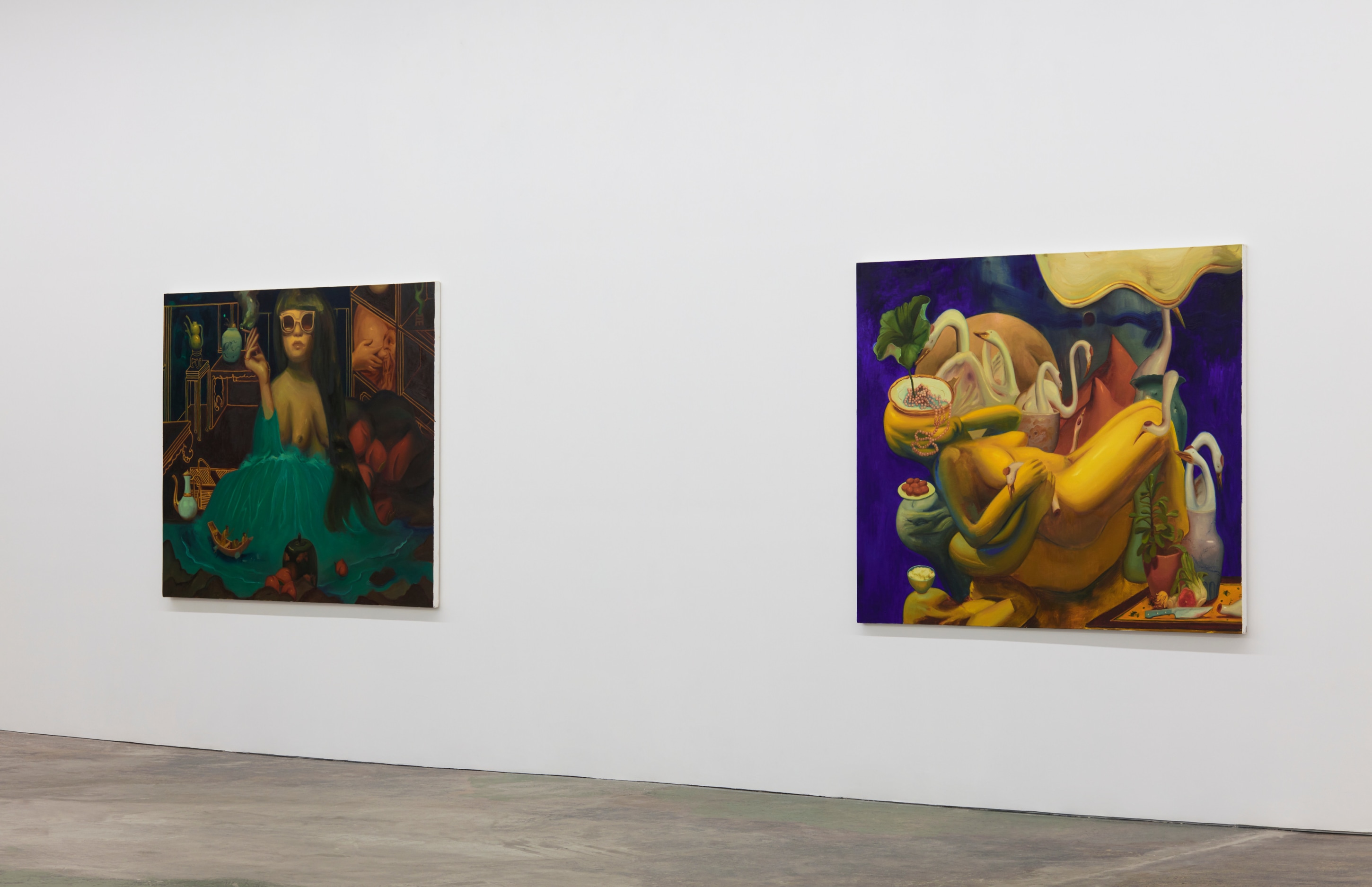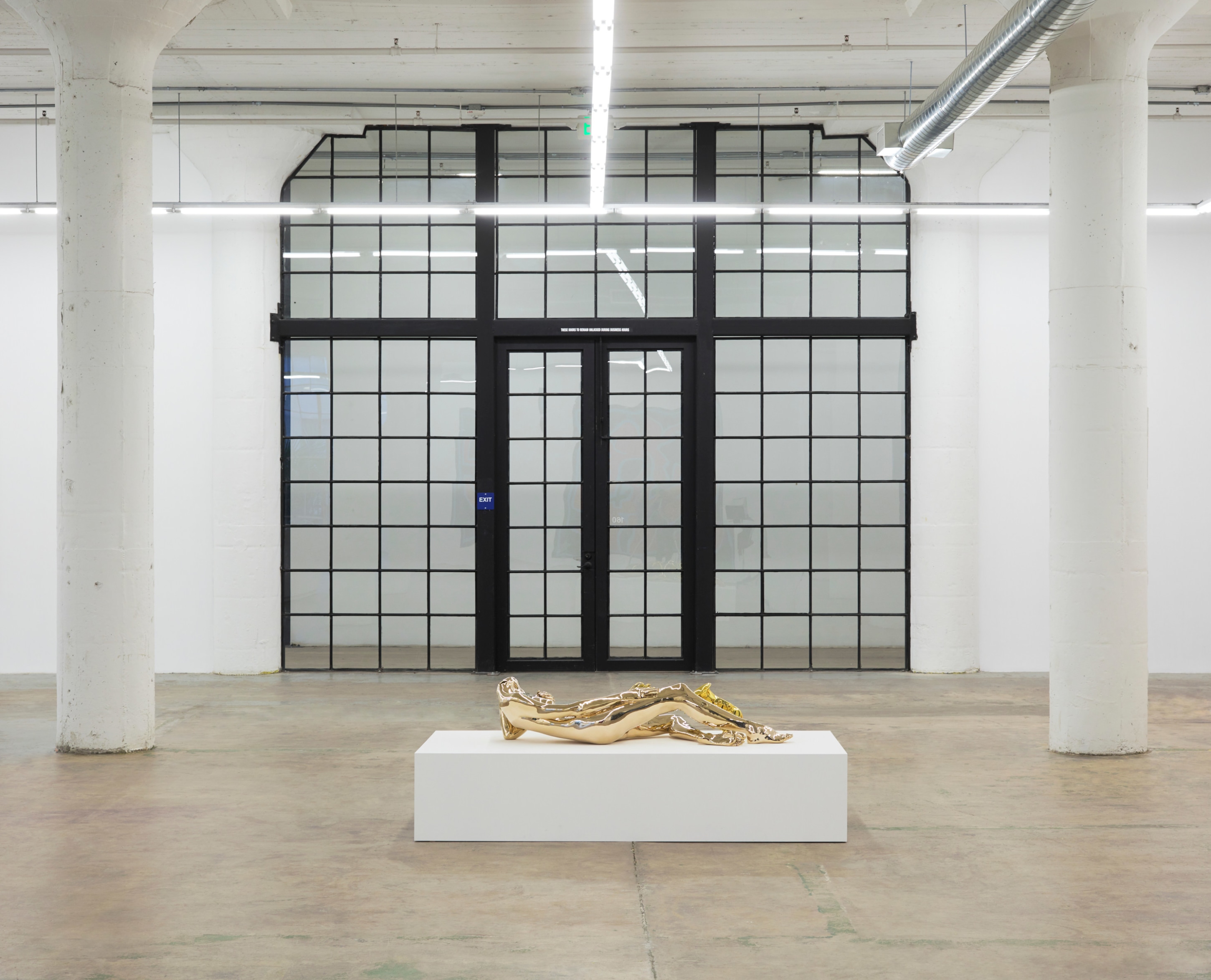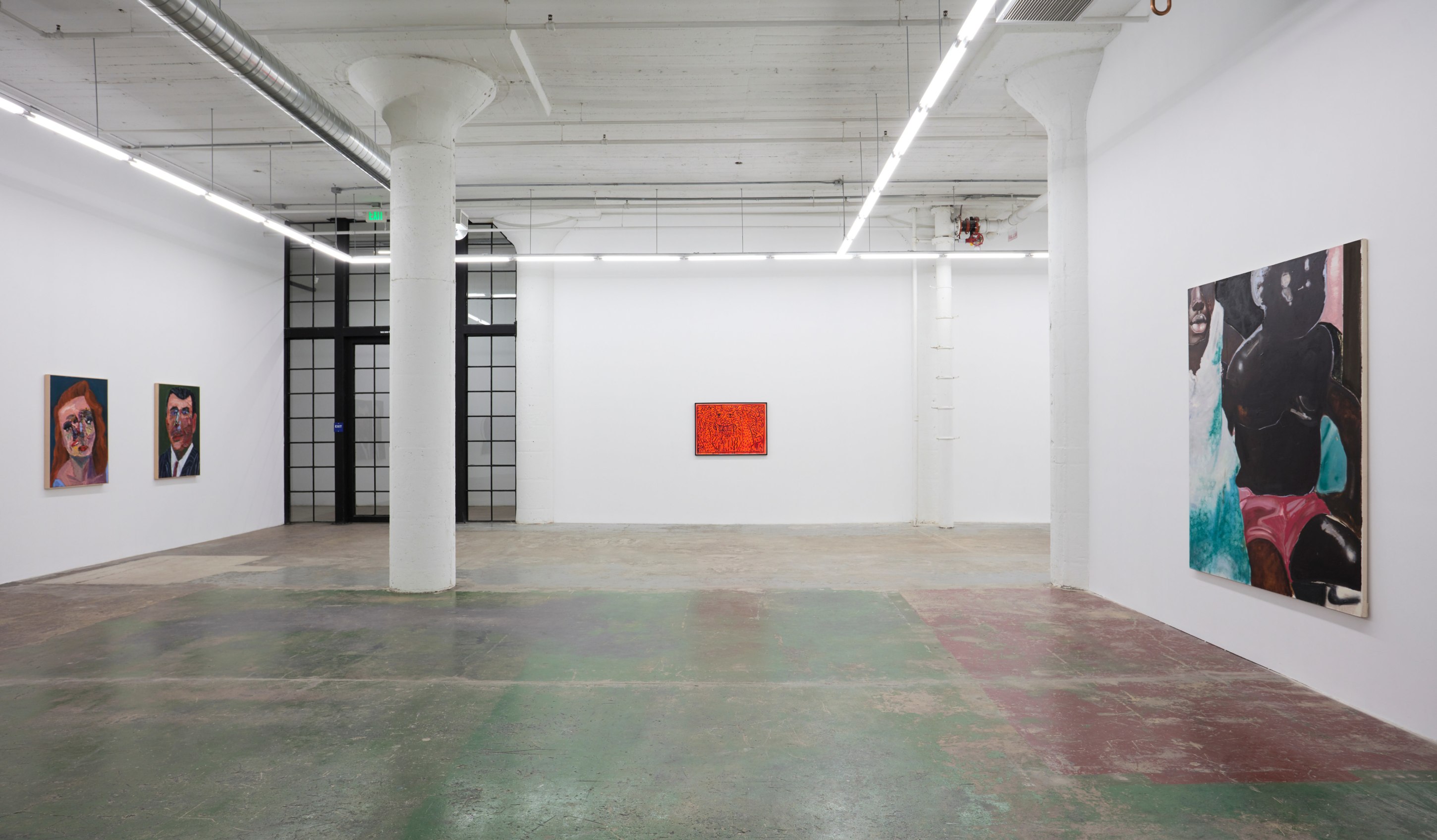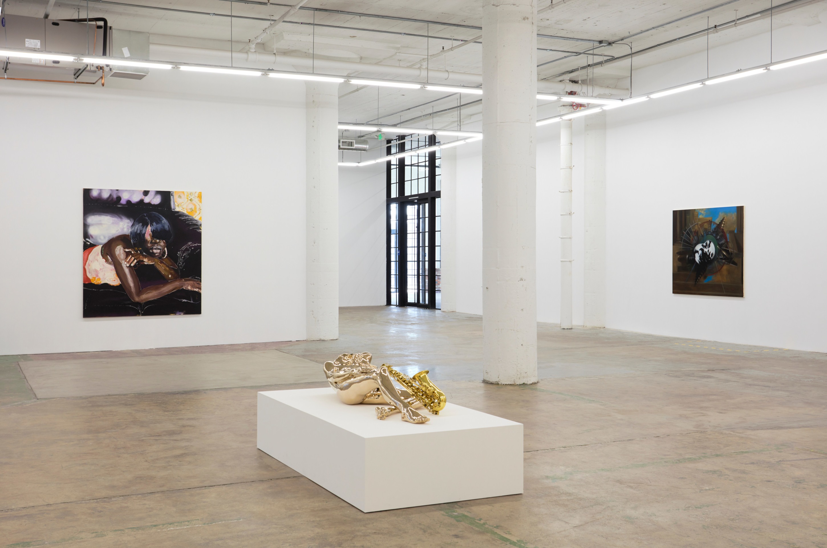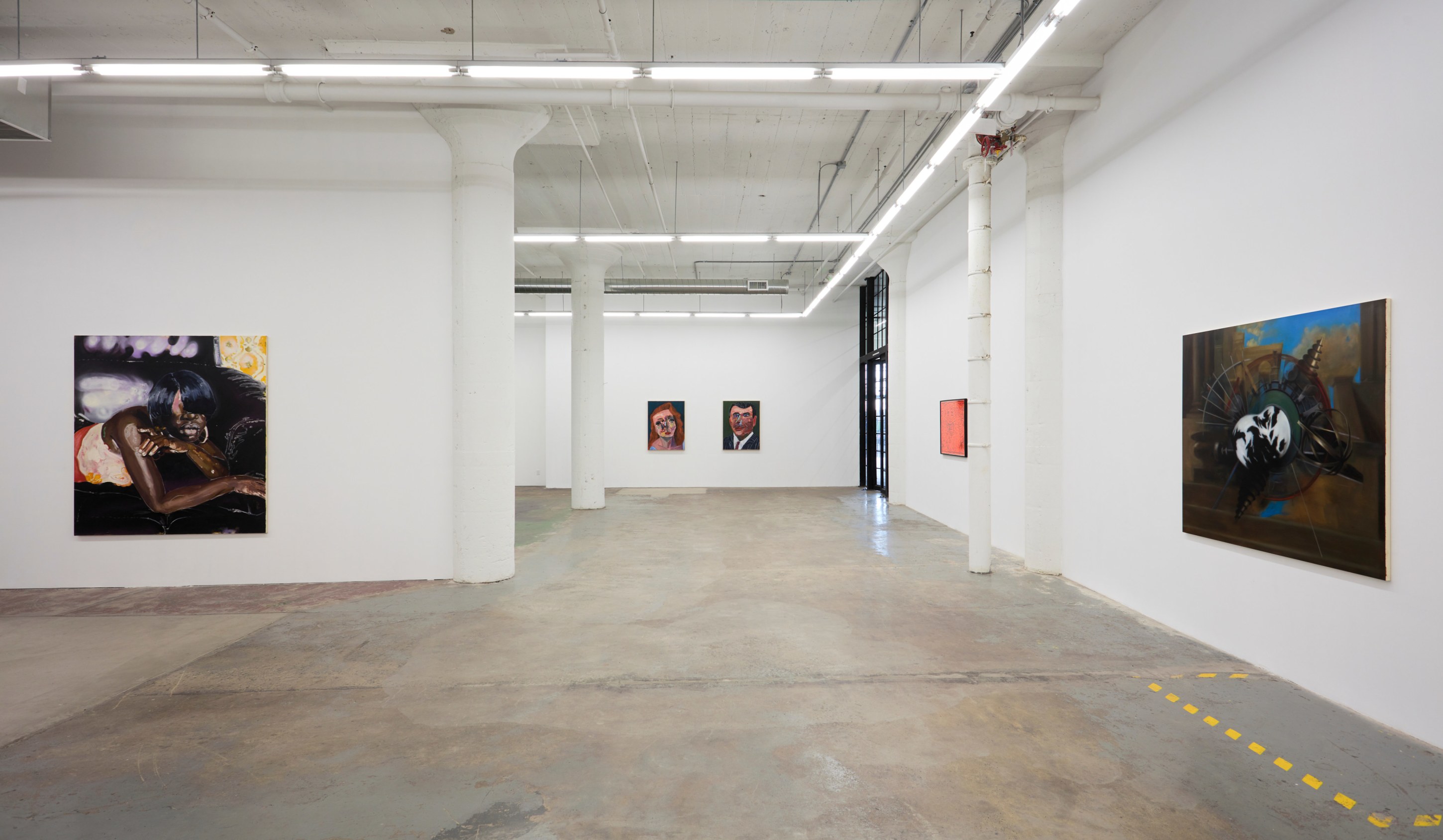 SKIN STEALERS is an exhibition of figurative artists who inhabit the bodies of others, documenting, bearing witness to, and forcing themselves into their subjects’ more intimate and occasionally dangerous behaviors. The exhibition emerges from the respective wombs of two large paintings: Keith Haring’s massive, pregnant female form, and Hugo Wilson’s Boschian (or perhaps Rube Goldbergian) machination of an organic, sexless conception and birth. Isabelle Albuquerque casts her own skin in bronze in the role of Leda from “Leda and the Swan”—in her telling, Zeus assumes the shape of a violating saxophone—while Dominique Fung’s similarly headless, nude figure grasps, strangles, and beheads a bevy of ill-intentioned fowl. Devin B. Johnson inhabits the body of a mother turning a blind-eye to her chubby, sock and diaper-clad child as he wanders into Philipp Kremer’s orgy of primary and secondary colors, and Georgina Gratrix’s textured, playfully layered portraits look-on in amusement. Mattia Biagi’s animated black cats scurry throughout the proceedings, simultaneously picking up scraps with the roombas that carry them and altering the luck of all who enter. Watching it all from a safe distance is Robert Yarber’s naughty voyeur, emerging from her black underpainting with a cocktail and a pair of binoculars.