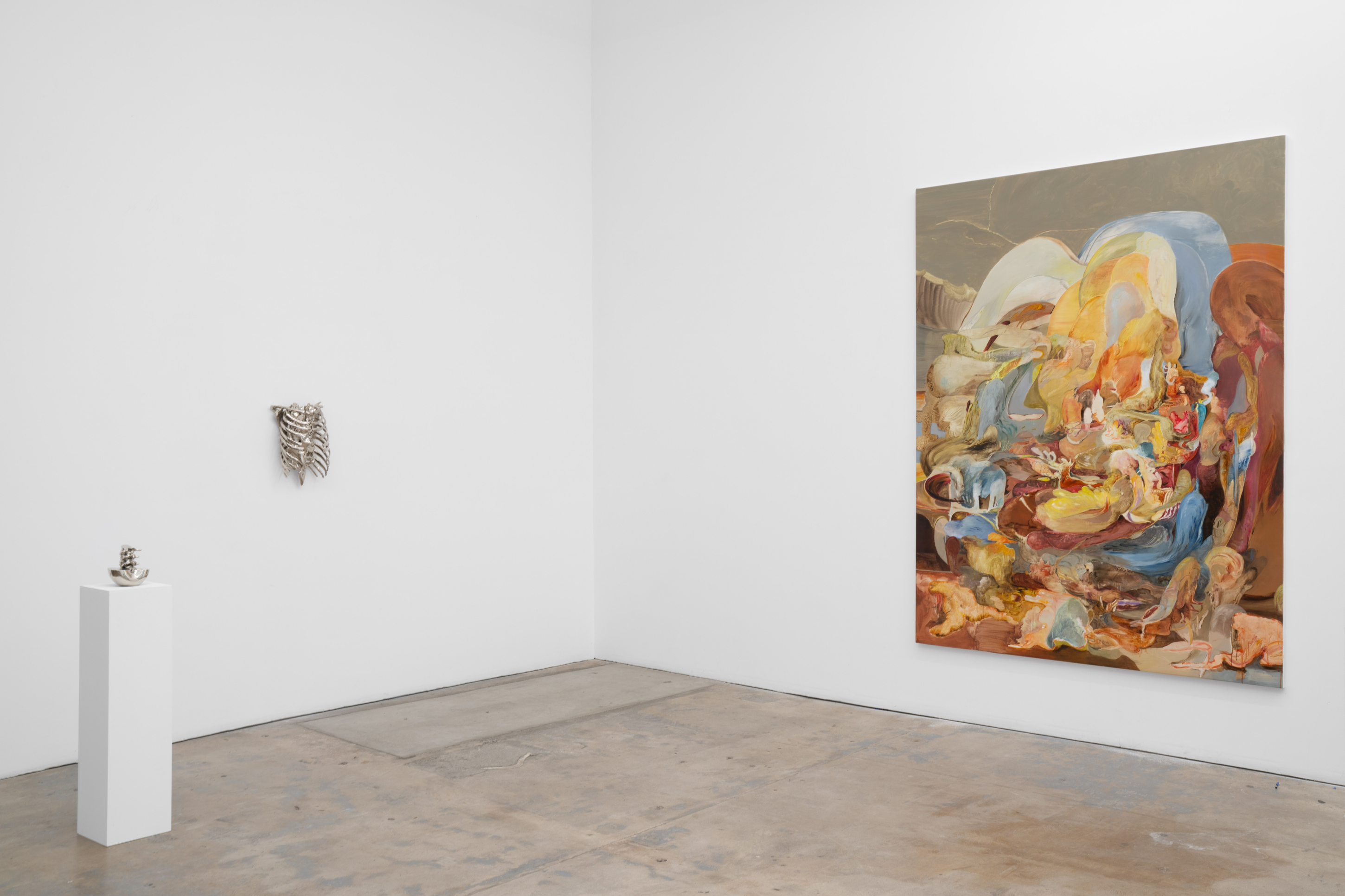 Paint accumulates like sediment. Limbs repeat or disappear. Surfaces bruise, scrape, polish, and erode. The body becomes a site where time leaves fingerprints — where emotion alters structure and perception rearranges proportion. There is no single narrative binding the works together. Instead, the exhibition moves through tonal shifts: intimacy gives way to spectacle; devotion slips into grotesque; tenderness edges toward unease. Classical references surface only to be destabilized. Beauty appears briefly, then fractures.