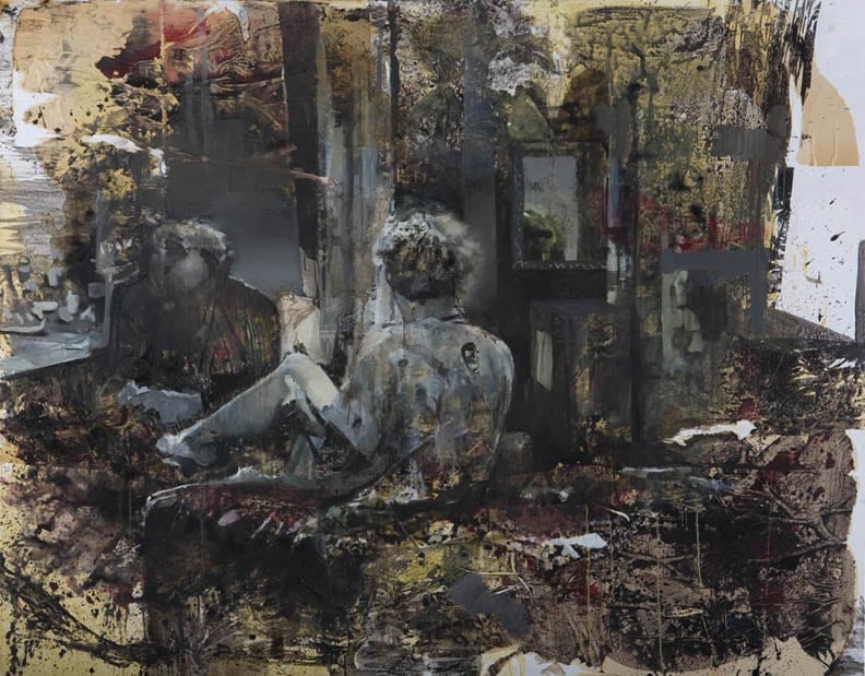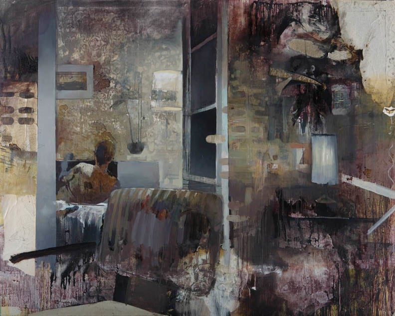 Daniel Pitin remembers “Through a Glass Darkly” as a film where the characters are trying to face something hidden and potentially dark. As he says, “the struggle of the actors in the film is one we all have at times. Everyone is confronted with unpleasant or unhappy feelings or situations. In the film itself there is kind of melancholy. All the actors have to spend time on the island, and this could be interpreted as a metaphor for artists closed in their studios and facing their memories and life experiences. Something hidden that wants to be discovered and seen, publicly recovered.” Yet Pitin is wary of interpreting art solely through psychology, finding it boring when art is explained away in a narrative manner as a kind of Freudian theory. For Pitin, art more closely resembles a theatre play where the viewer can participate in the experience; knowing it to be an illusion but one that can fully engage the emotions, summoning fascination, disappointment and the reflection on personal experience. He likes his work to be open to interpretation, close to his and others' memories, yet mixed up with crime films and documentaries; mise en scenes that draw together the fictional, the virtual and the real. Pitin is particularly interested in crime films because of the role of the detective. For Pitin, the detective is someone who has access to all levels of society while not belonging to any of them. He has the power to subvert the social strata and to unearth secrets, guilt and longings. Of late Pitin has come to realize that when he incorporates imagery from film he is actively seeking to break down and through the “still” in order to deconstruct the space or the image itself. He does this in various ways: sometimes by ripping or burning paper and canvas, sometimes by adding to the surface in order to disrupt it. In Pitin's words: “it is a strange process”. The image is destroyed and forgotten then it re-emerges on the canvas, transformed - with all the marks and history of the journey. It is, says Pitin : “As if the motion picture is trying to defend its fixed position on the canvas and so fights with the painter. Once the painter starts the break down the image it is as if it wants to disappear, leaving only a trace of its original essence behind like a clue in a crime scene”. This tantalizing glimpse of 'evidence' is enough to enroll the “audience” in the game of playing detective, prompting them to question what is happening in the work and what has taken place. The situation is heightened by Pitin's attraction to situations where, he says: “you are neither here nor there”. Like the desert, the stage or a boat it is somewhere in the between, in common with Foucault's heterotopia of the mirror, a strange land beyond knowable boundaries. Recently Pitin has begun to work in film, producing experimental narratives such as “Dinner with Malevich” which obliquely references the creeping influence of dark matter as it infiltrates the heart of a family and spreads beyond into society. A vein of brooding trouble pulses through much of Pitin's new work with paintings such as “Blue Angel” (inspired by Joseph von Sternberg's film that charts the demise of a school teacher after he falls for a dancer) capturing an overwhelming sense of the inevitability of fate.