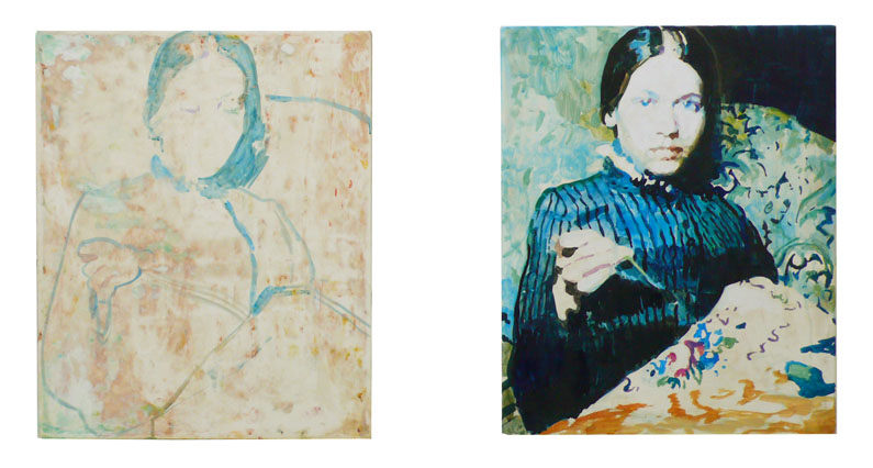 Tim Braden has always interpreted the phrase "through a glass darkly" as referring to both the fog of memory and the haze of experience. For him it is closer to the notion illustrated by the analogy of Plato's cave (where shadows seem more real than the people). What Baudrillard would later call the simulacra; where objects become more real than their referents. In cinematic terms this is interesting in the case of actors playing famous real life people (as opposed to fictional characters), whose identities they sometimes take over. Braden had been looking at director Peter Watkins' epic film of the life of Edvard Munch (which coincidentally happened to be one of Bergman's favourite films). Braden made a portrait of the actress playing Lara, Munch's sister. The painting is one of a number of works made by Braden where actors stand in for artists (or their friends or family), based on their physical similarity to their painted portrait “doppelganger”. Braden “borrowed” Lara Munch to illustrate and act as Karin in Bergman's film (which Braden himself has not actually seen, though he has experienced a stage version of the film at the Almeida theatre in London). As he explains, 'After a while it all starts to become a little “foggy''. Yet the layers of representation involved in the depiction of someone playing the role of a person known only from paintings, become more intriguing through these complexities.