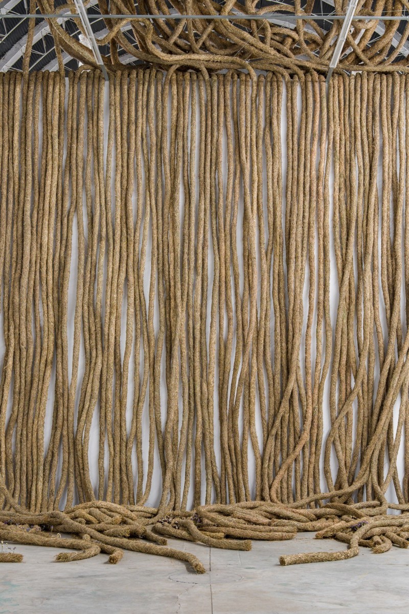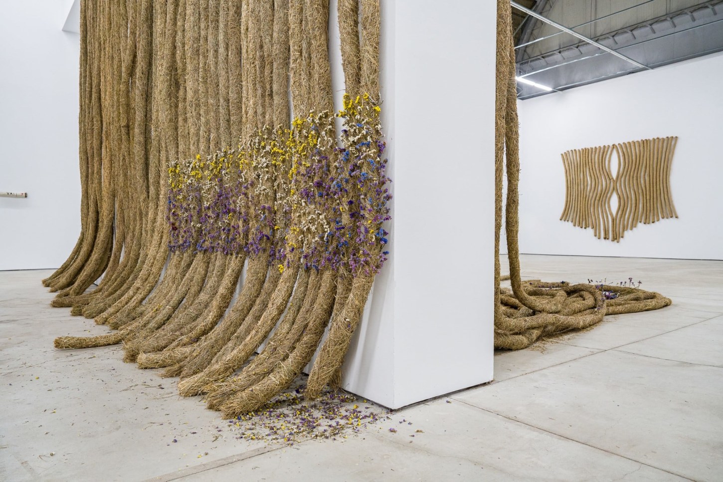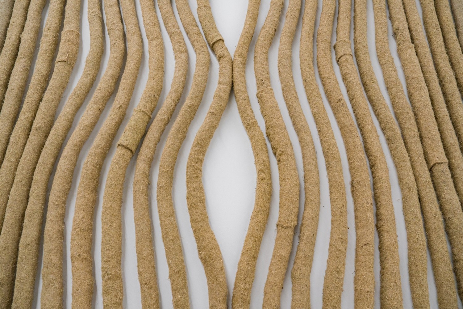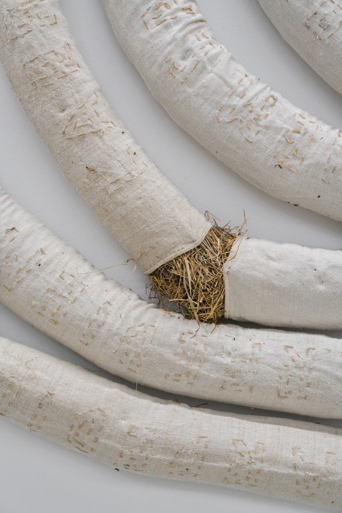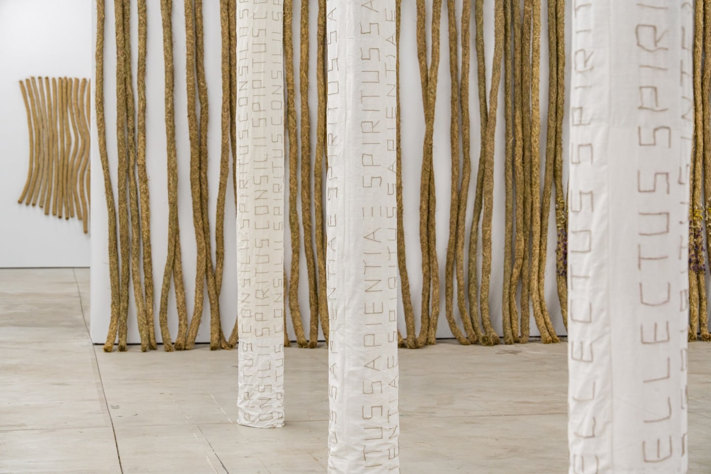 The installation unfolds as a living organism. Towering columns of hay—some over seven meters—rise through the space, acting as conduits of energy, while others are braided into sculptural forms. Herbs release delicate scents; inscribed words echo like mantras. The contrast between the white of handwoven cloth and the darker tones of hay underscores the visual and haptic power of juxtaposed textures and varying thicknesses of weave. Structure, weight, and rhythm emerge from meticulous control of materials, producing a poise and archetypal beauty that govern the space.
