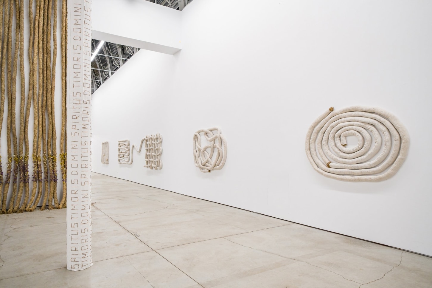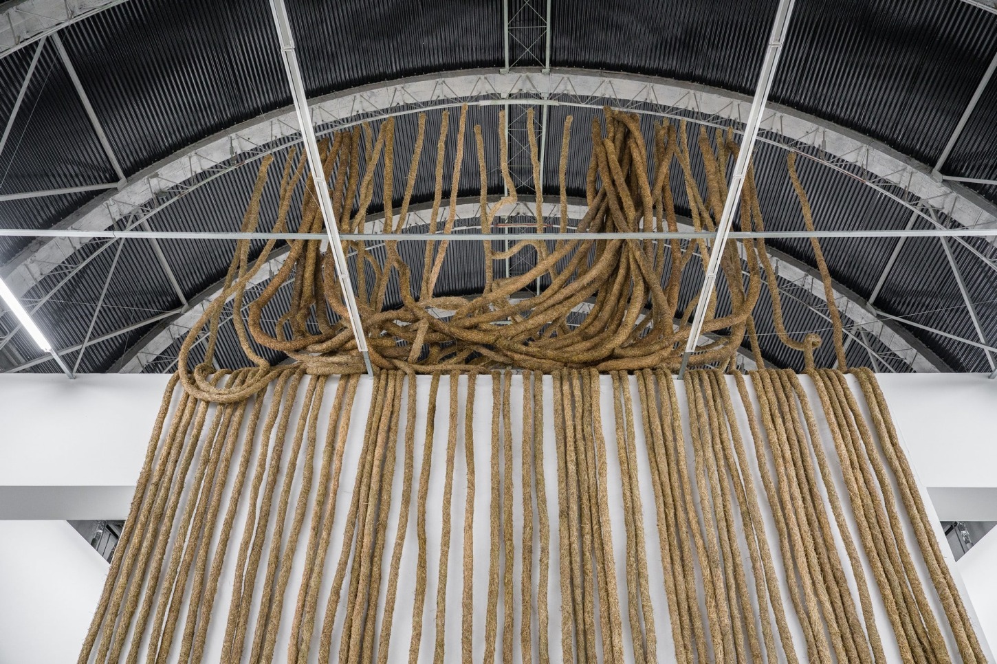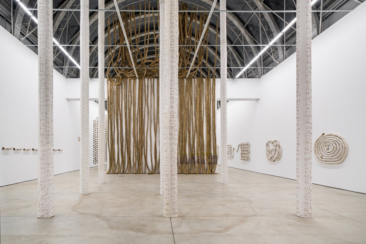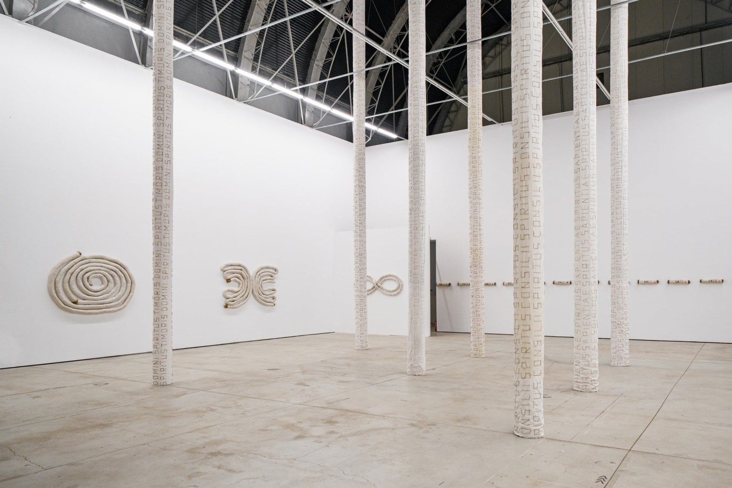 The installation unfolds as a living organism. Towering columns of hay—some over seven meters—rise through the space, acting as conduits of energy, while others are braided into sculptural forms. Herbs release delicate scents; inscribed words echo like mantras. The contrast between the white of handwoven cloth and the darker tones of hay underscores the visual and haptic power of juxtaposed textures and varying thicknesses of weave. Structure, weight, and rhythm emerge from meticulous control of materials, producing a poise and archetypal beauty that govern the space.