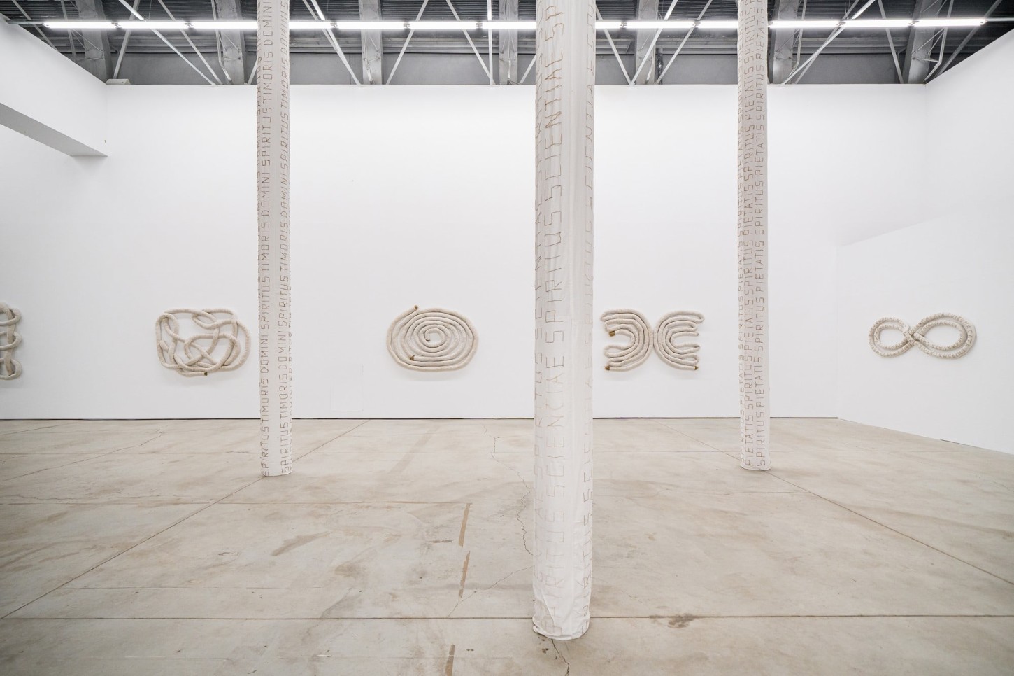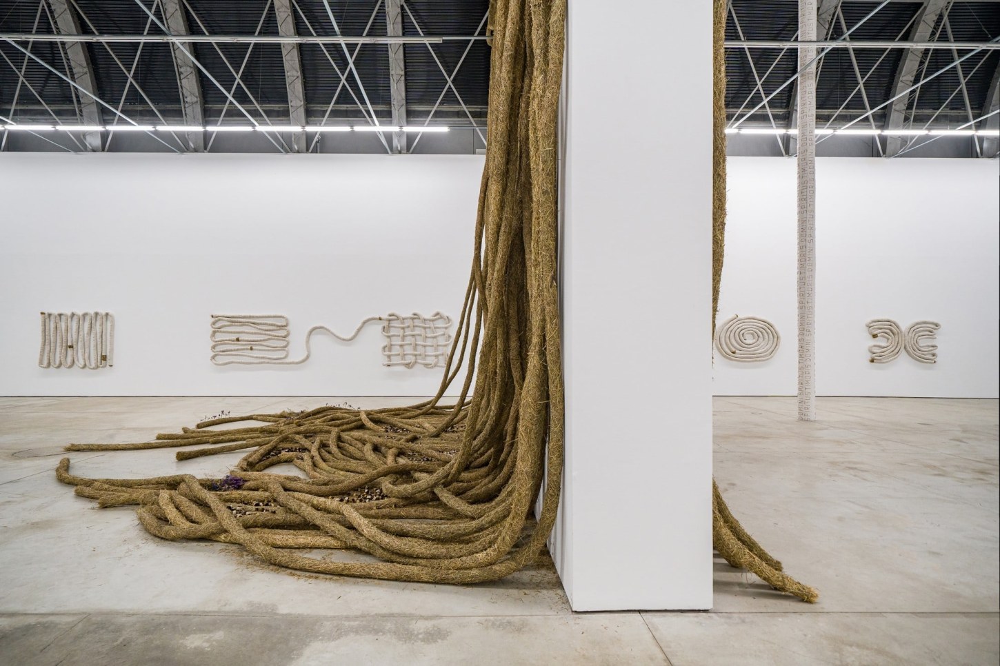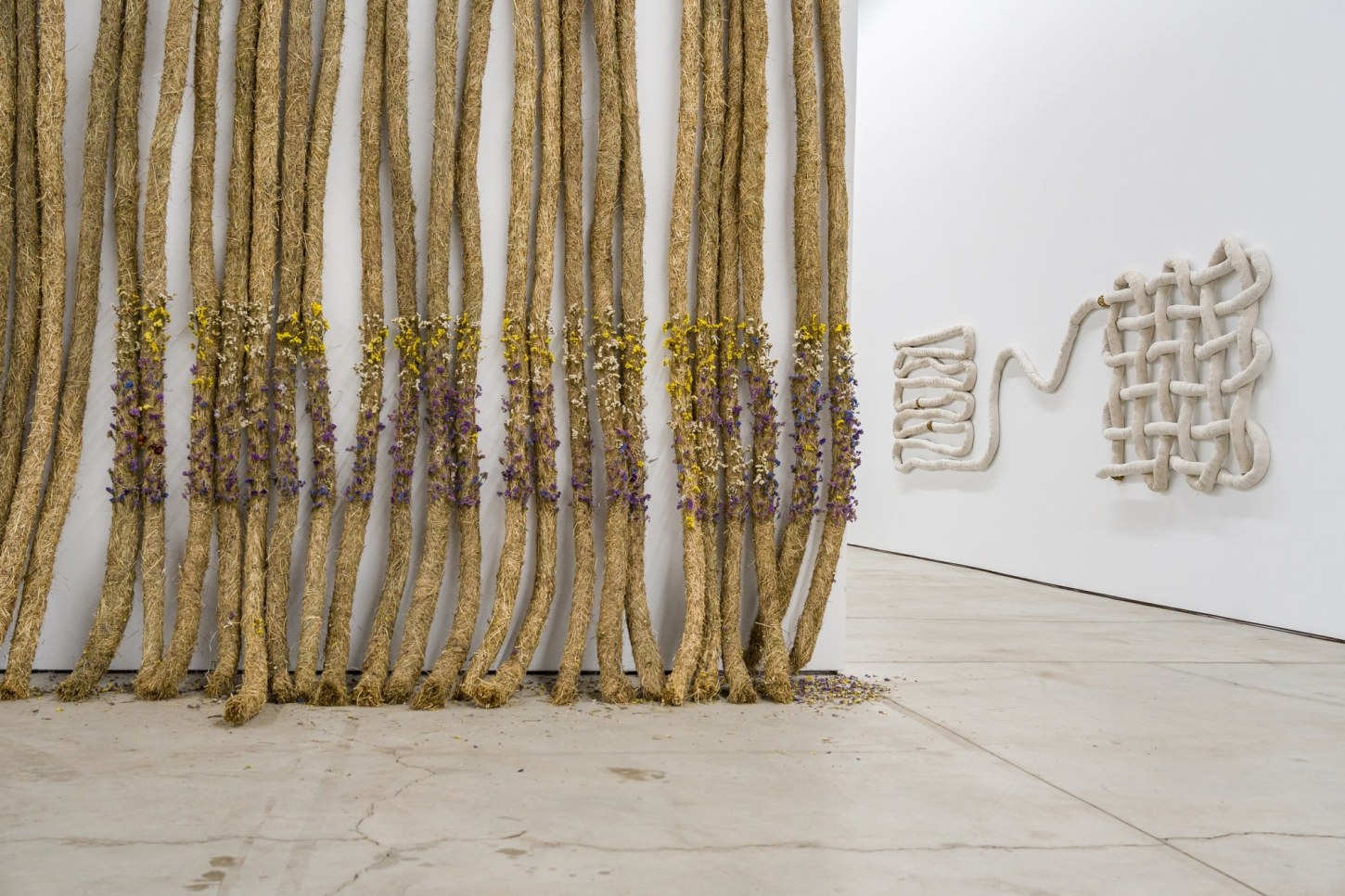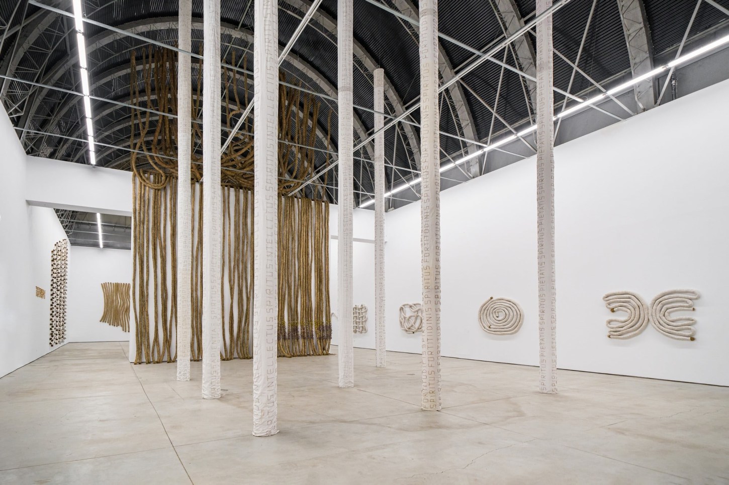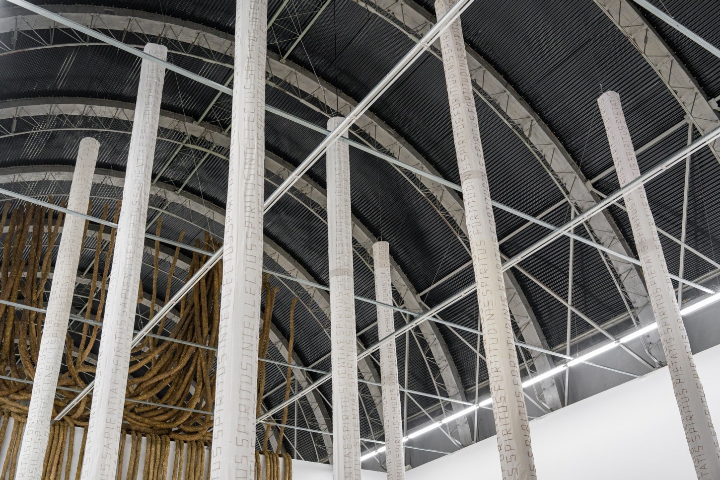 The installation unfolds as a living organism. Towering columns of hay—some over seven meters—rise through the space, acting as conduits of energy, while others are braided into sculptural forms. Herbs release delicate scents; inscribed words echo like mantras. The contrast between the white of handwoven cloth and the darker tones of hay underscores the visual and haptic power of juxtaposed textures and varying thicknesses of weave. Structure, weight, and rhythm emerge from meticulous control of materials, producing a poise and archetypal beauty that govern the space.