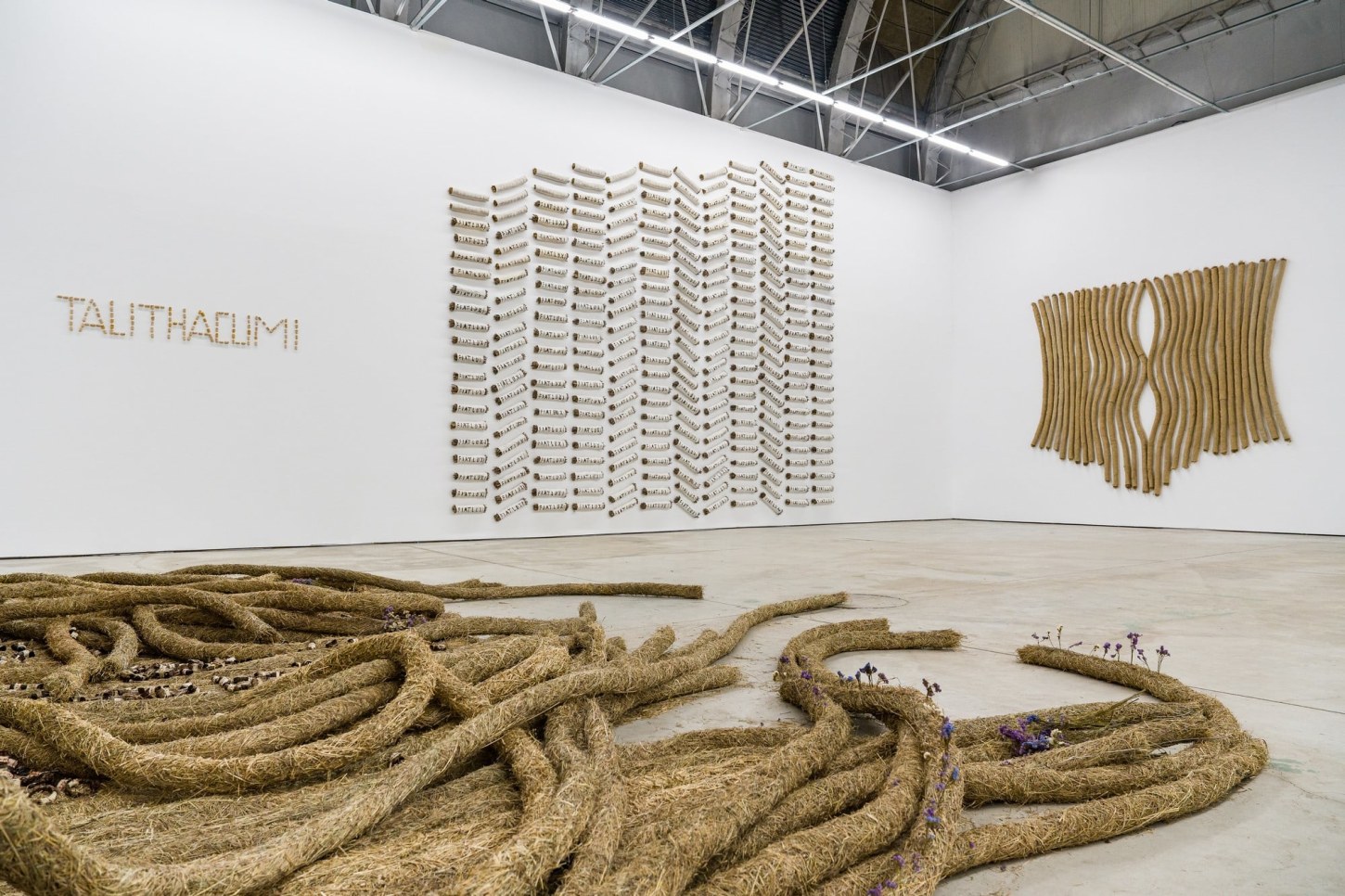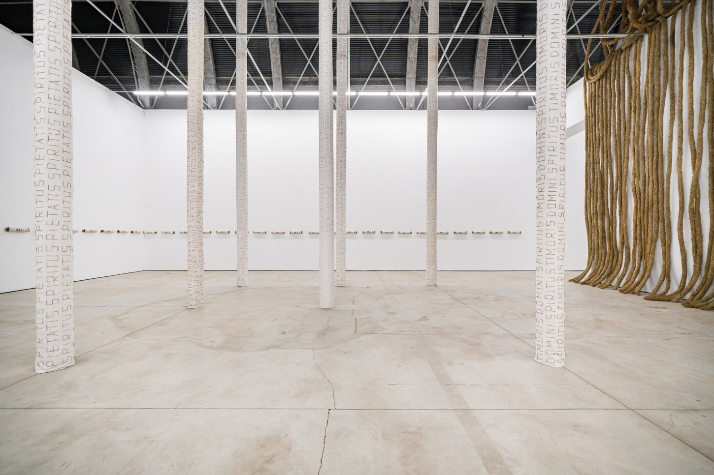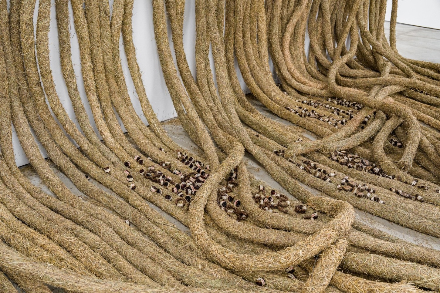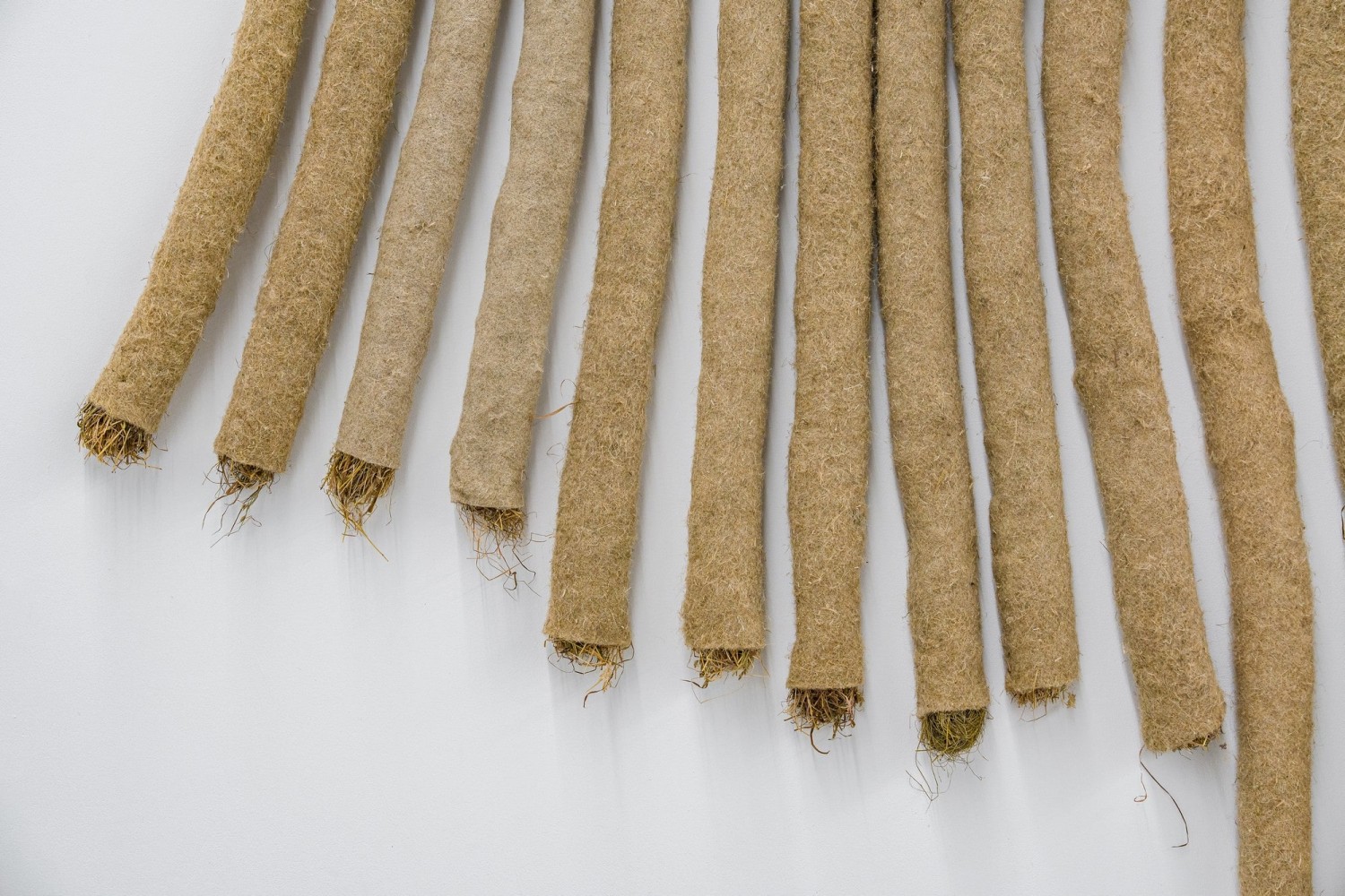 The installation unfolds as a living organism. Towering columns of hay—some over seven meters—rise through the space, acting as conduits of energy, while others are braided into sculptural forms. Herbs release delicate scents; inscribed words echo like mantras. The contrast between the white of handwoven cloth and the darker tones of hay underscores the visual and haptic power of juxtaposed textures and varying thicknesses of weave. Structure, weight, and rhythm emerge from meticulous control of materials, producing a poise and archetypal beauty that govern the space.